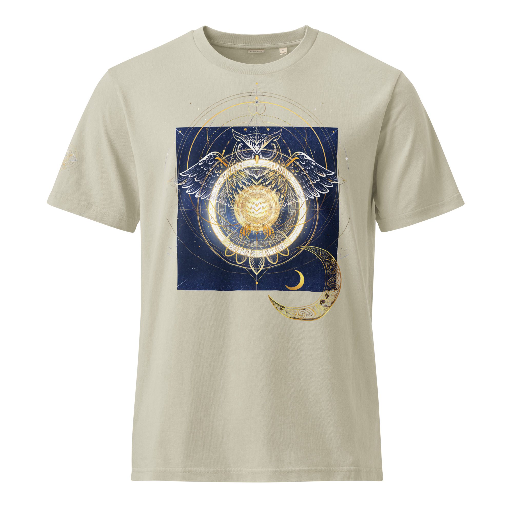 Pair this celestial owl design with Stone Gray vintage denim, layered neutrals, minimalist sneakers, or relaxed streetwear for a modern cosmic aesthetic. It works beautifully for festivals, creative events, meditation spaces, art studios, or everyday wear when you want your style to reflect wisdom and cosmic inspiration.
