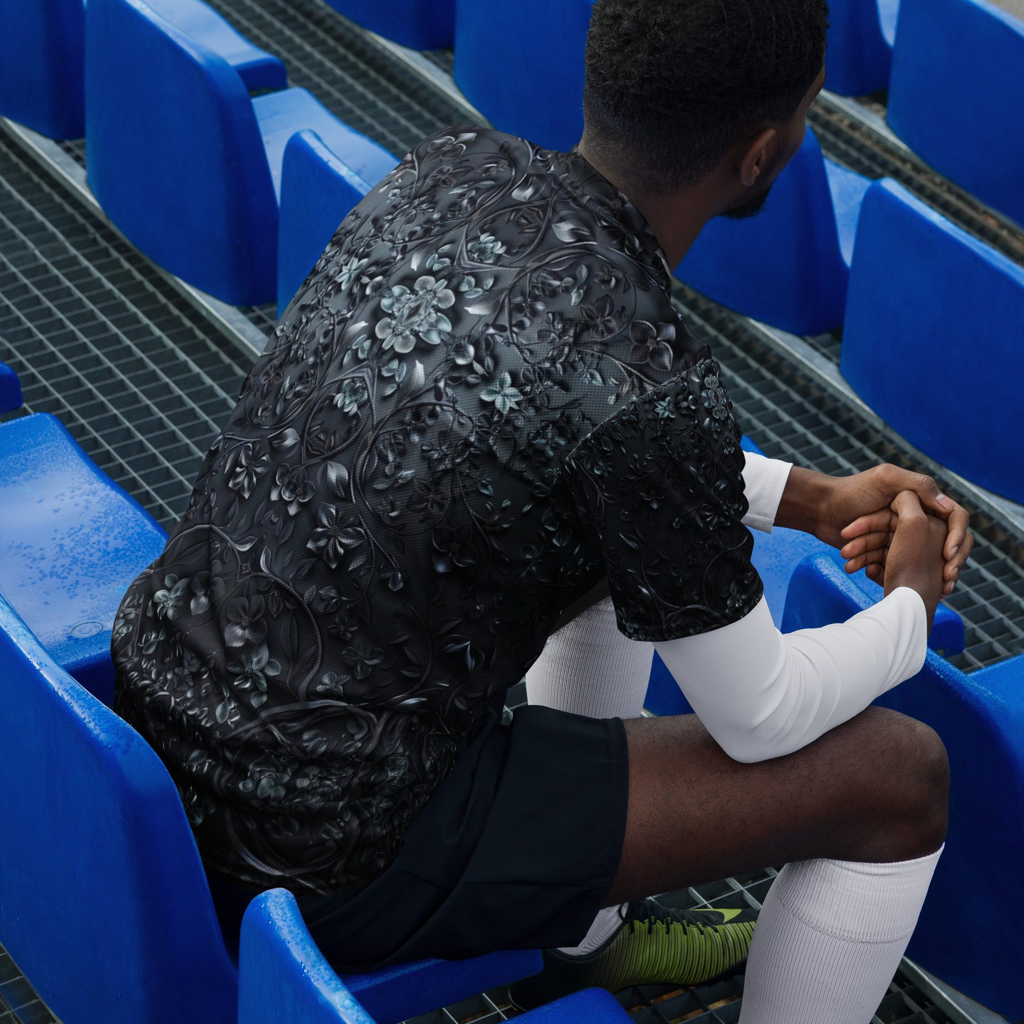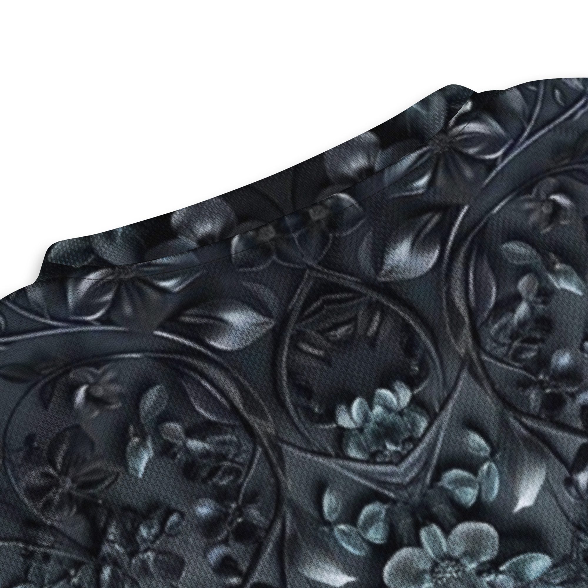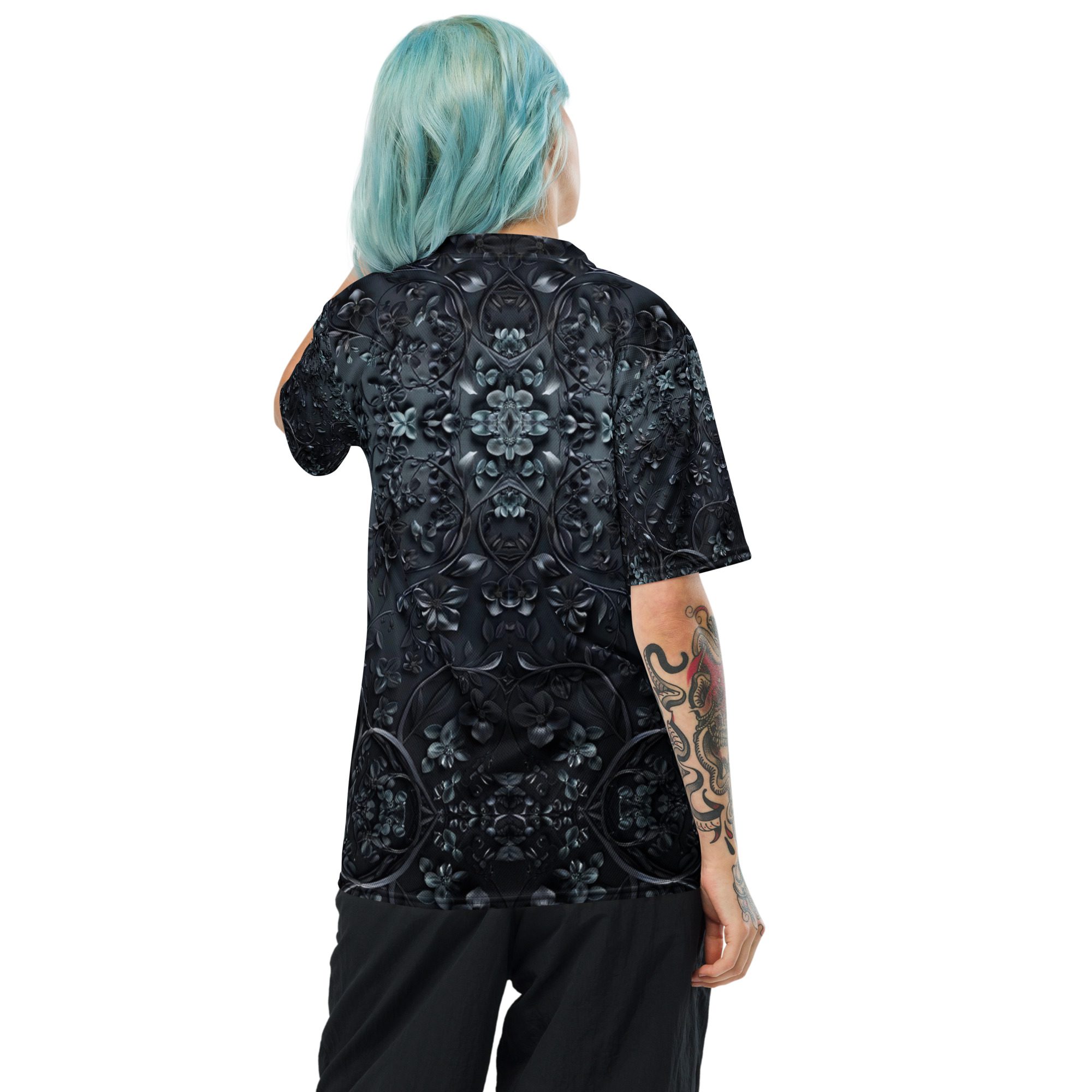 Designed with layered gothic florals, embossed ironwork motifs, and a deep charcoal-black palette, this Gothcore and Dark Academia jersey carries the atmosphere of medieval courtyards, baroque architecture, and antique manuscripts bound in shadow. The pattern feels carved rather than printed, as if the design itself was forged and preserved through time.