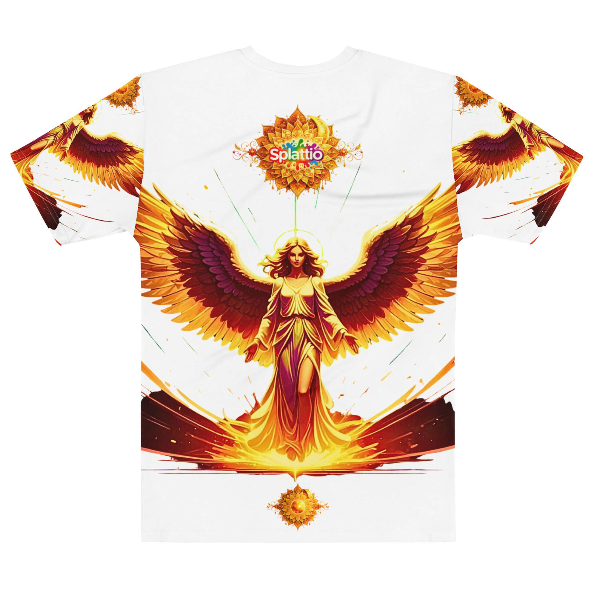 It feels radiant and protective — like carrying a presence that walks with you. The guardian angel figure, extended wings, and glowing solar sigil create a design that blends sacred energy with modern streetwear, forming a look that feels both elevated and grounded in power.