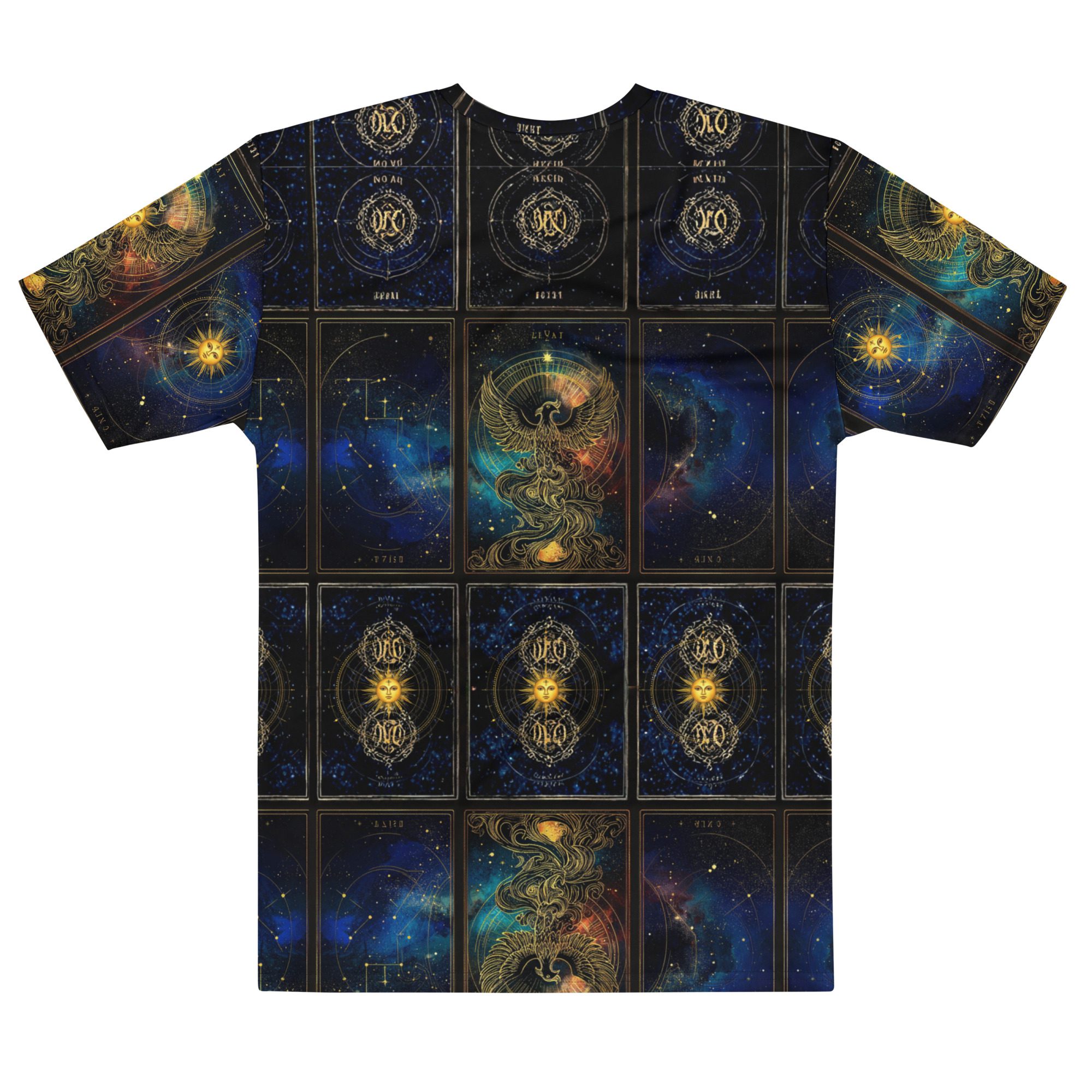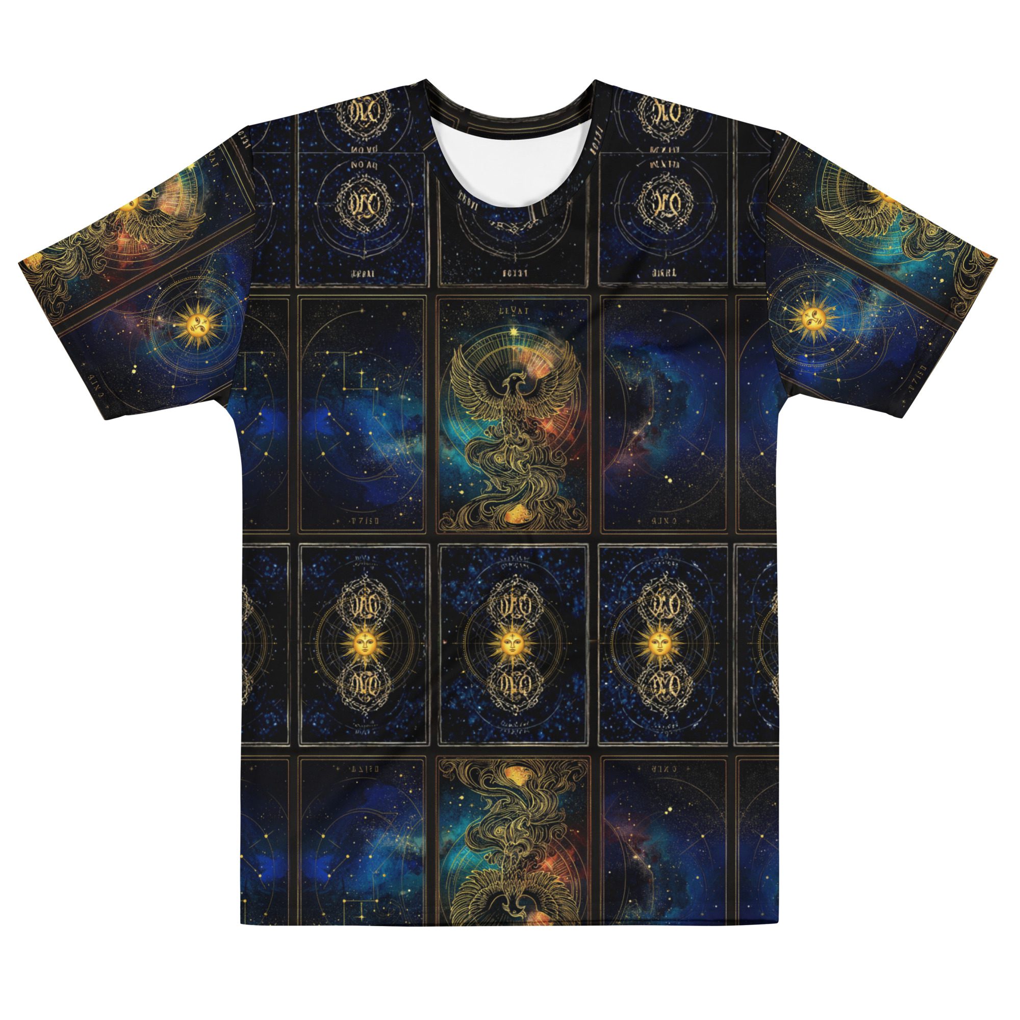 The repeating tarot-style cosmic panels create a structured celestial grid across the shirt, echoing the feeling of ancient star maps, zodiac charts, and universal alignment diagrams. Rich galaxy blues, glowing starlight, and golden mystical details give the design a sense of depth and wonder, reflecting the timeless fascination humanity has with astrology, cosmic energy, and the hidden architecture of the universe.