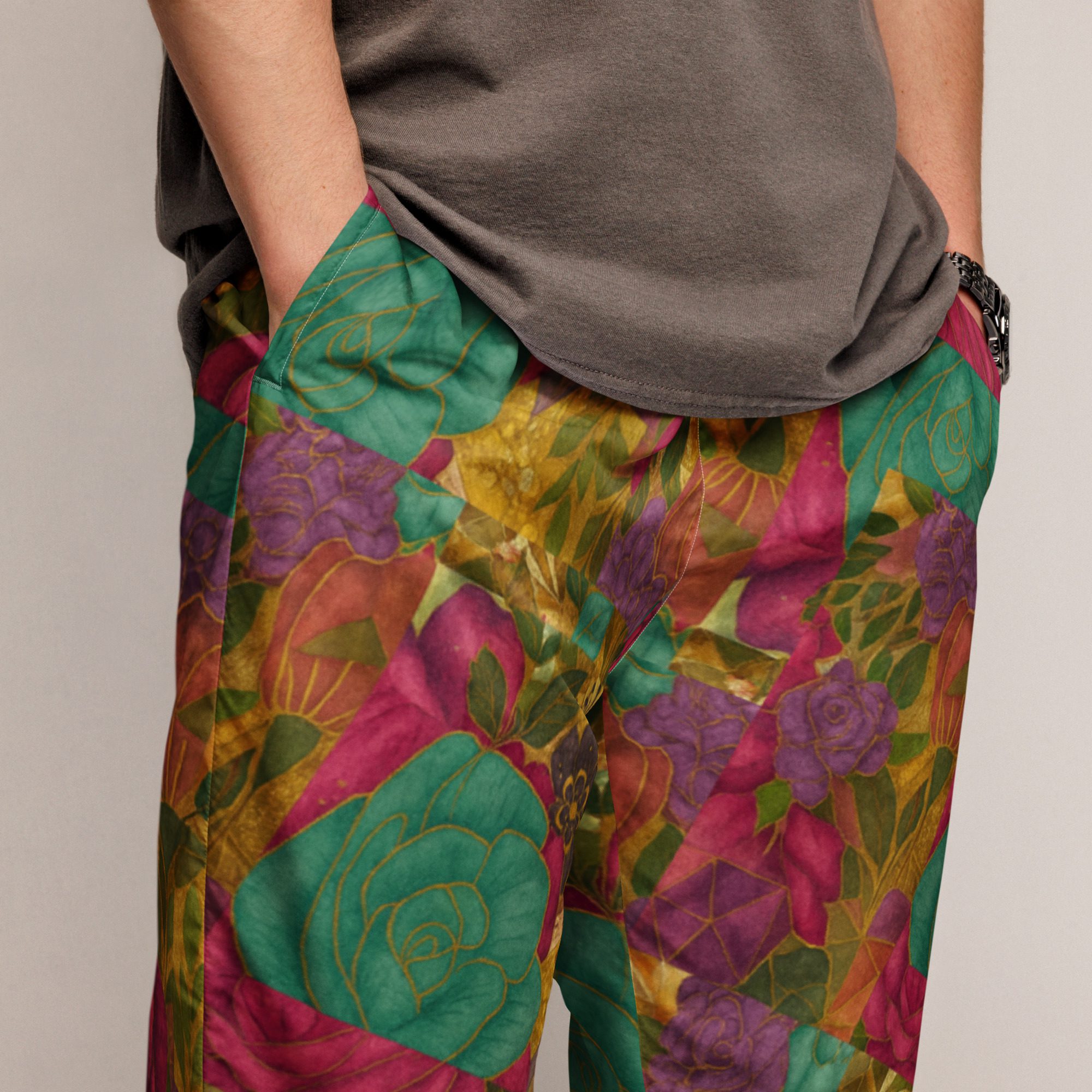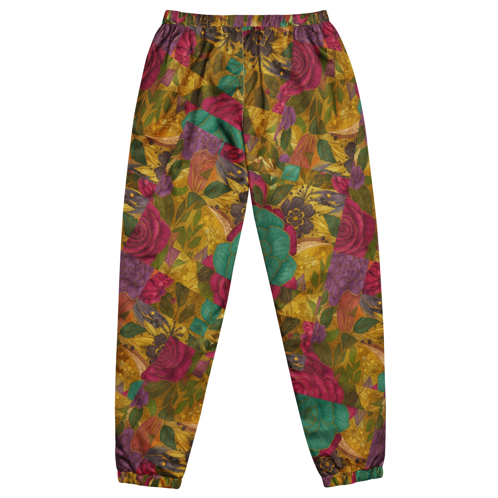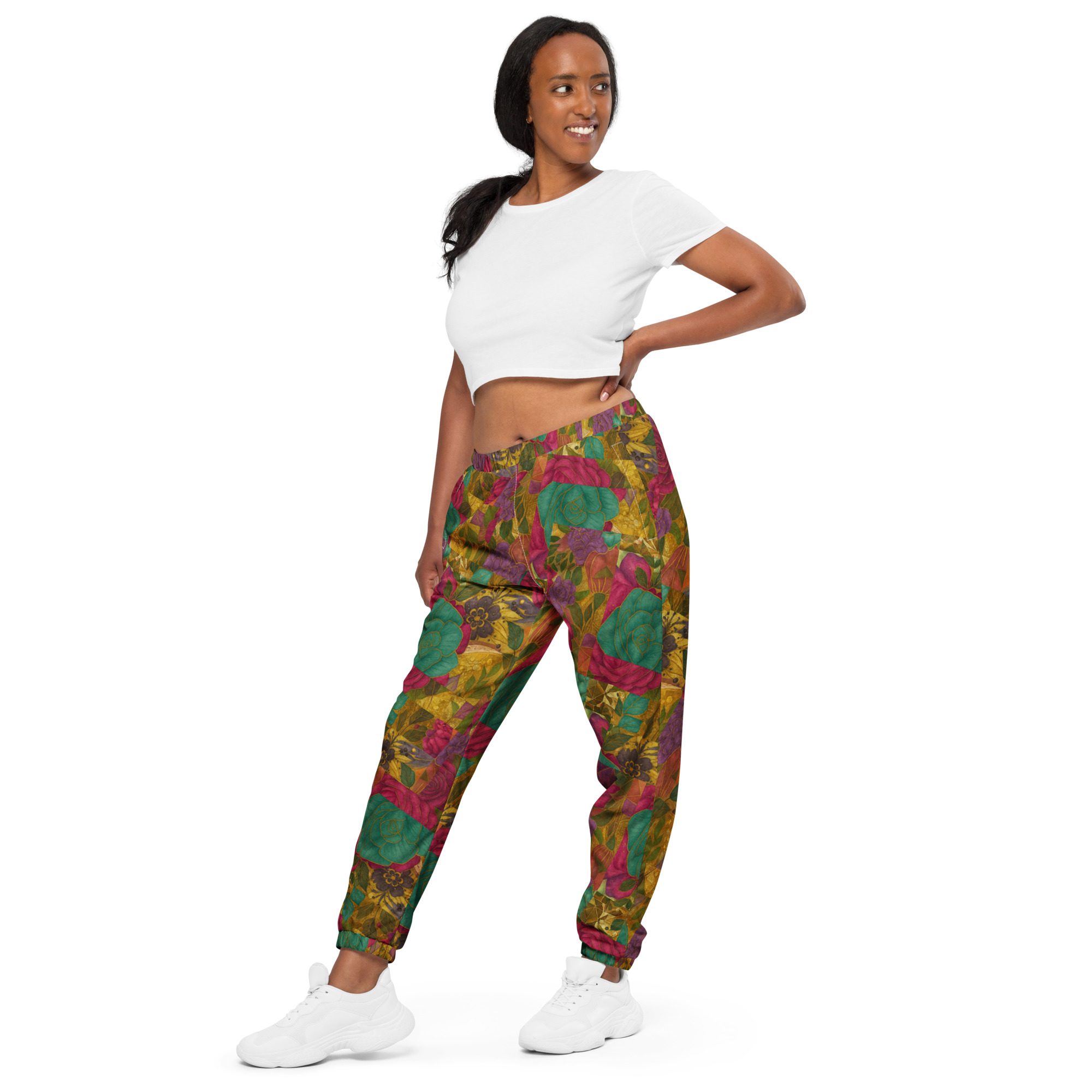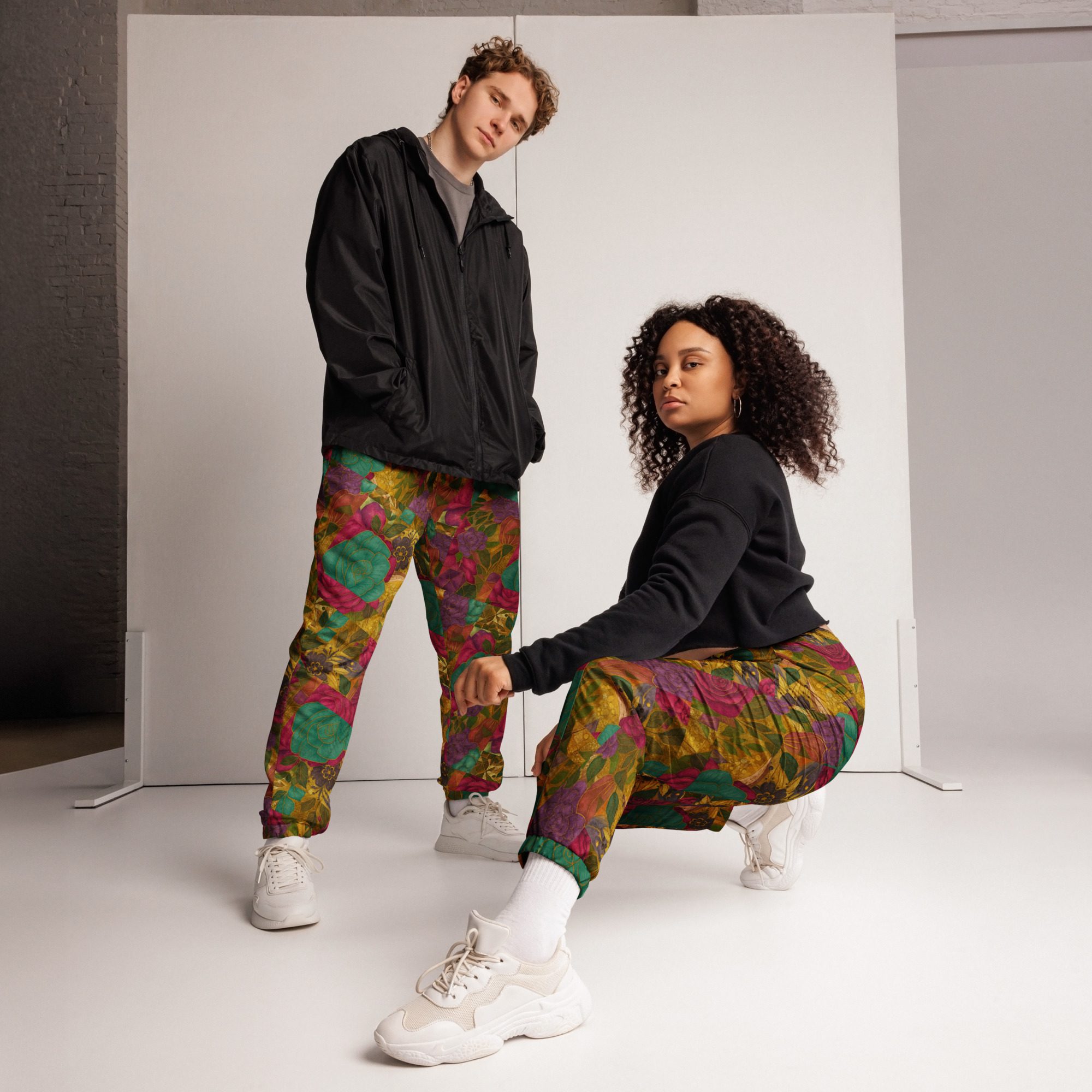 This all-over print unisex track pant design captures the living heartbeat of nature through vibrant crimson, mossy green, and golden undertones that intertwine like roots in motion. The pattern flows with an organic rhythm — raw, radiant, and full of quiet strength — embodying both earth’s grounding energy and the passion of a rose in bloom.