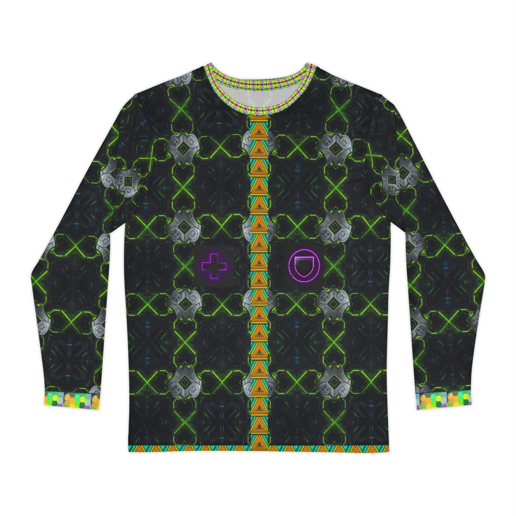 This all-over print long sleeve blends luxury gamer fashion, neon tactical symmetry, cyber-core grid design, esports-inspired streetwear, modern competitive styling, RGB influence, and executive-level gamer confidence. Ideal for FPS players, streamers, ranked competitors, and gamers who move with strategy — not noise.