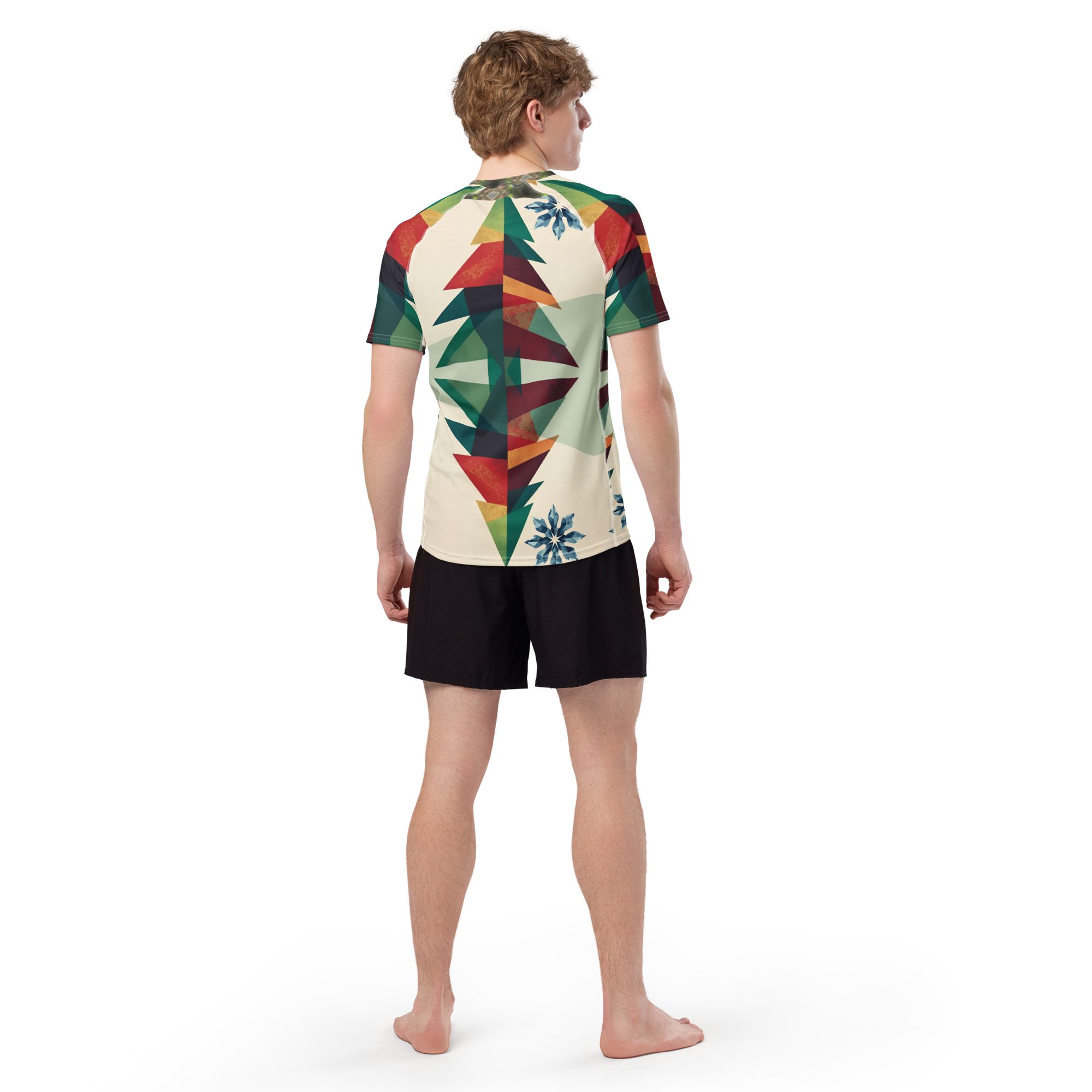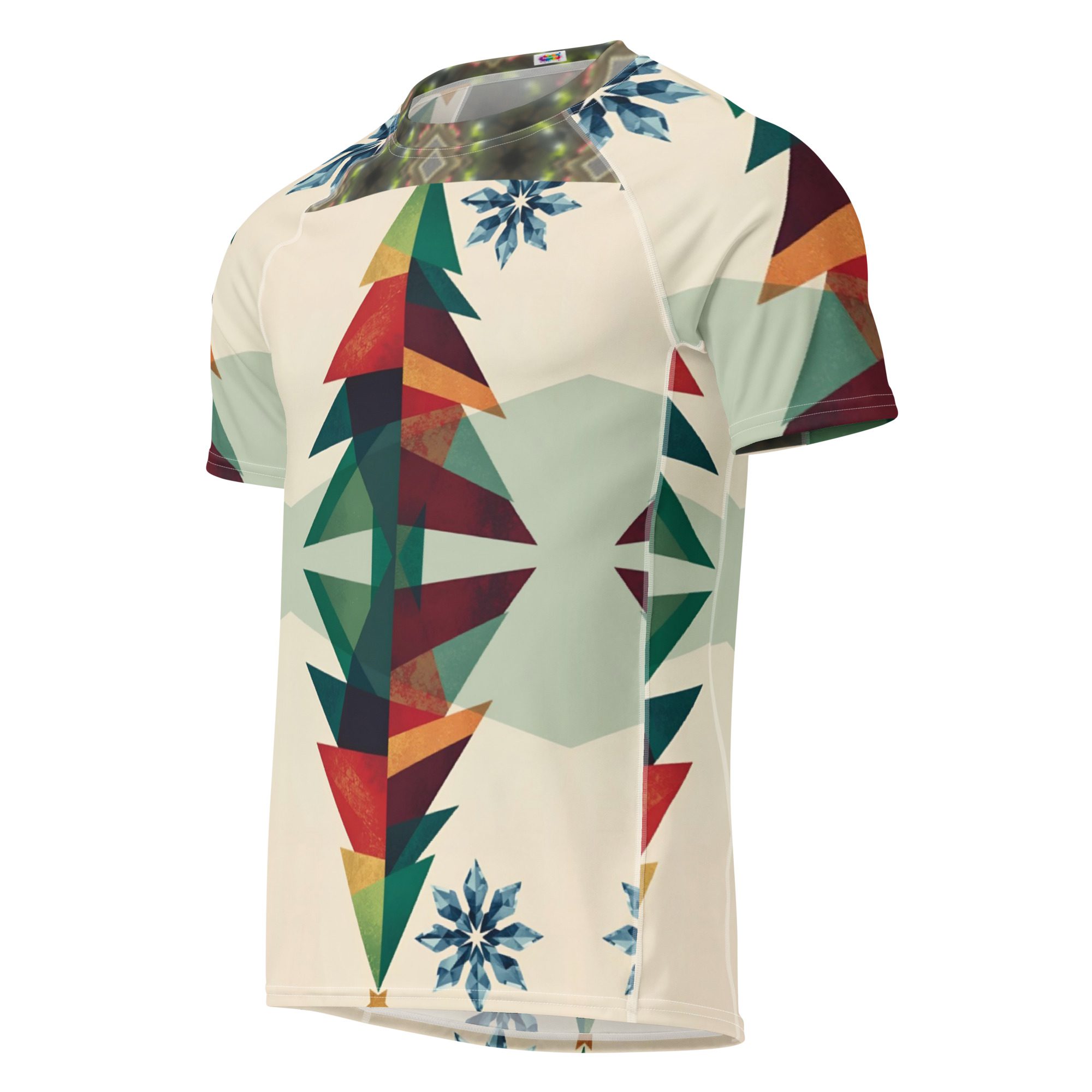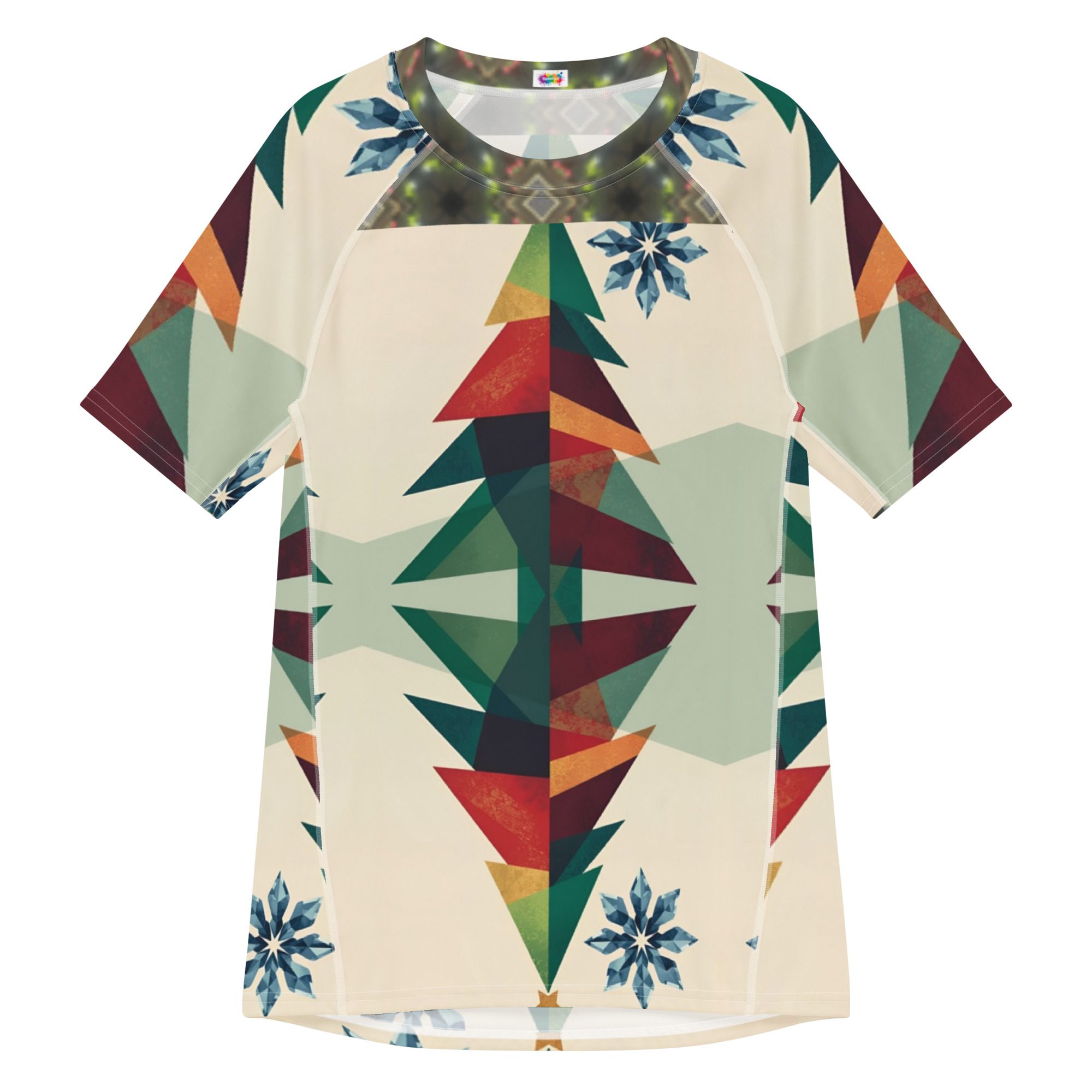 This striking all-over print rash guard combines the energy of winter with a modern, geometric twist. Featuring layered triangular tree shapes in deep greens, warm reds, and golden ambers—balanced by soft cream tones and cool snowflake accents—it’s a wearable blend of art, motion, and style.