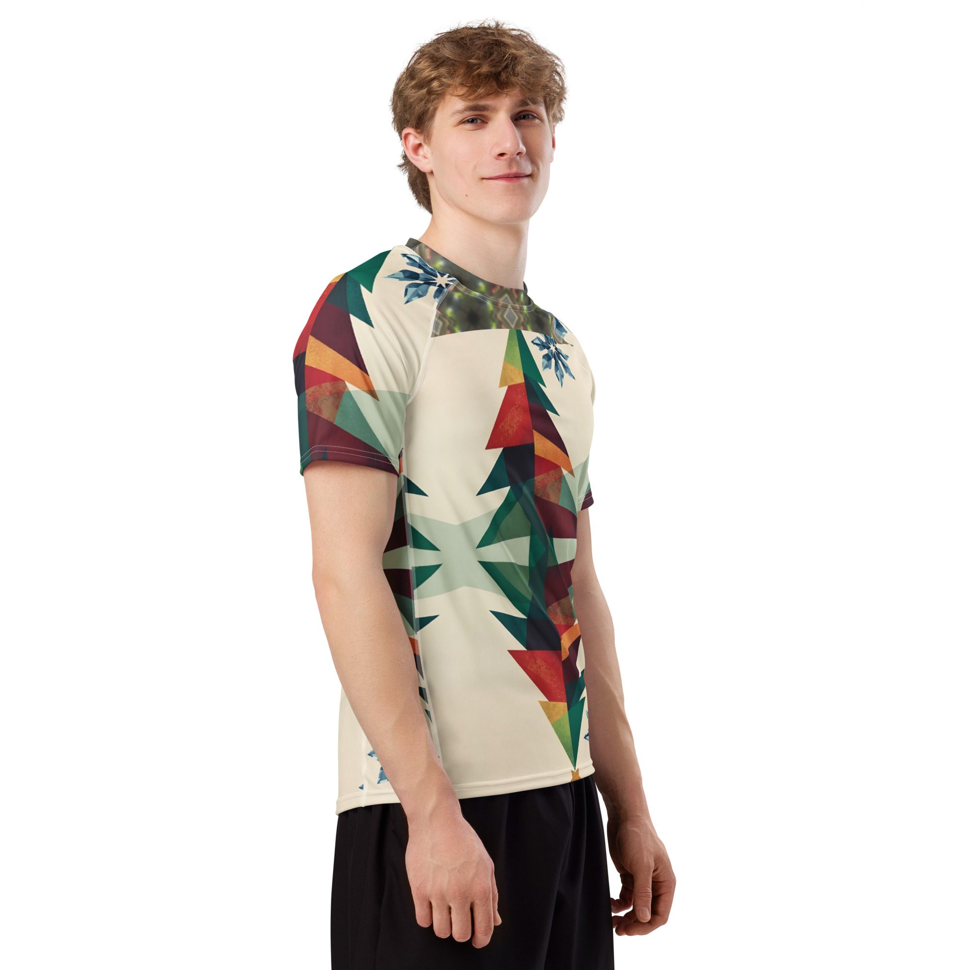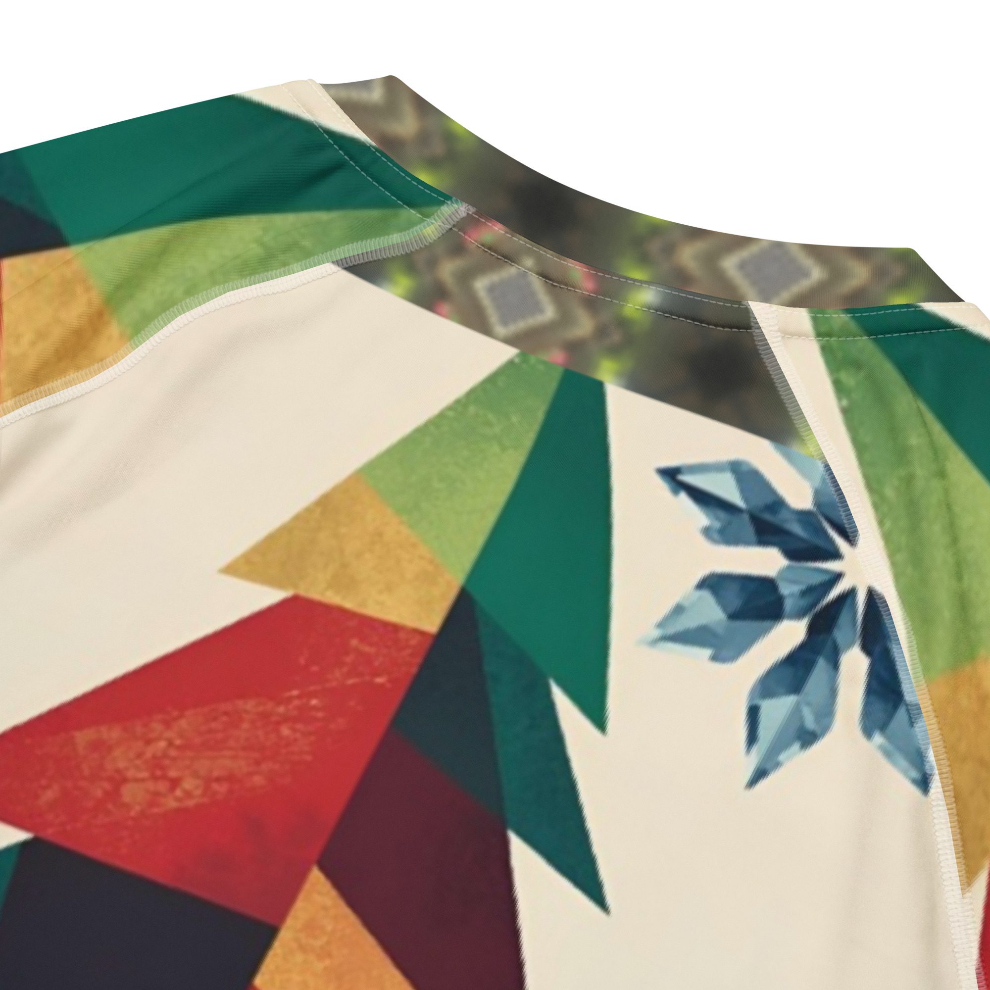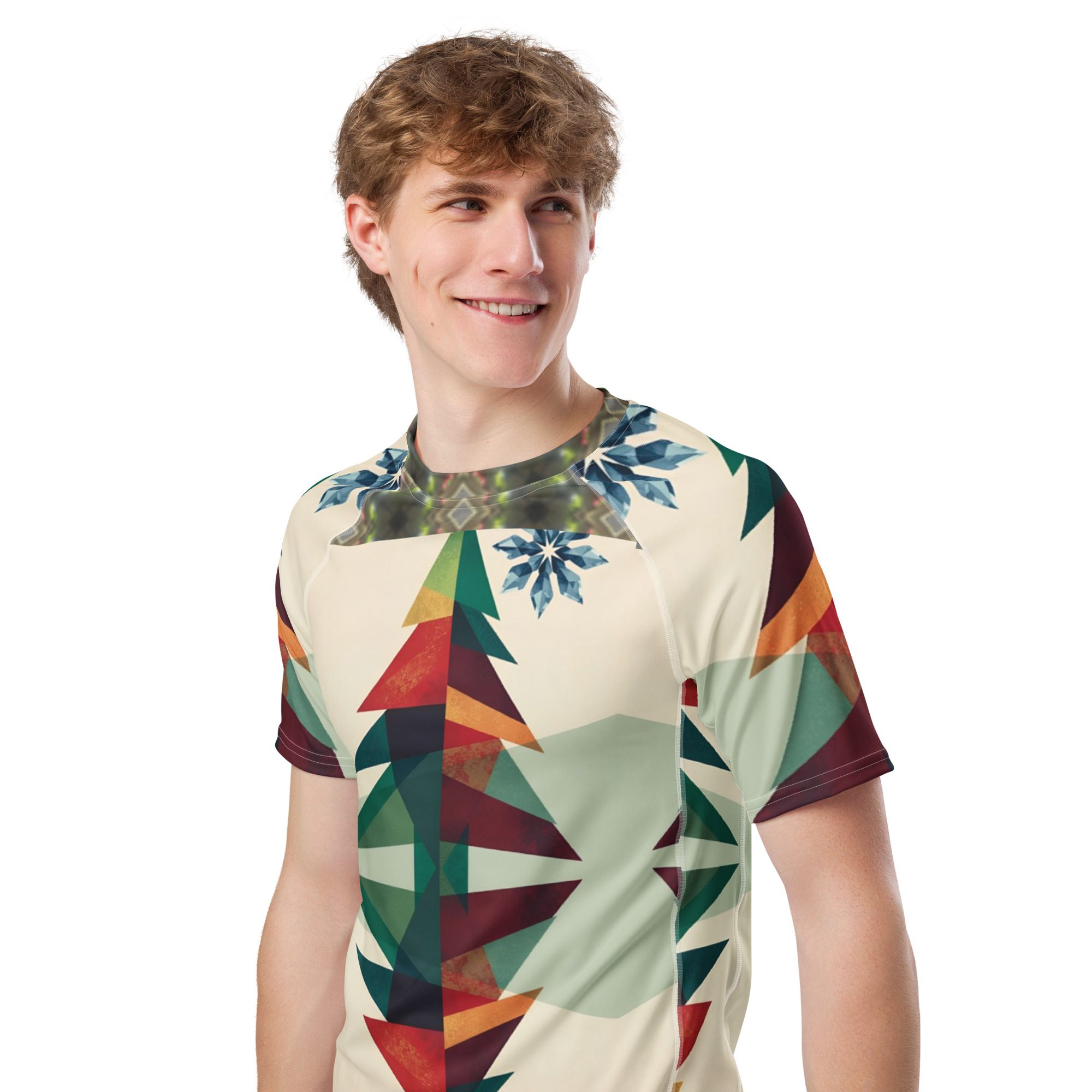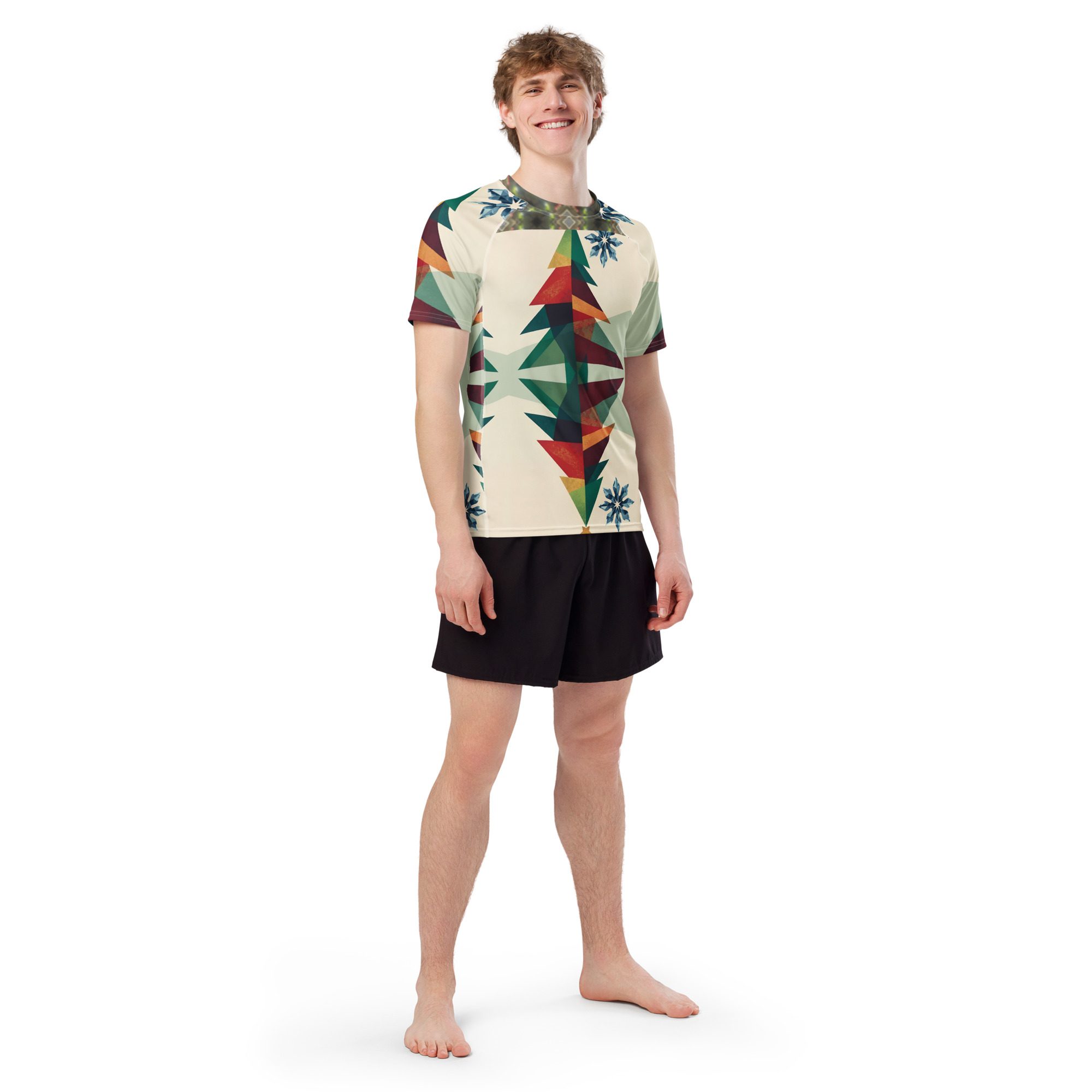 This striking all-over print rash guard combines the energy of winter with a modern, geometric twist. Featuring layered triangular tree shapes in deep greens, warm reds, and golden ambers—balanced by soft cream tones and cool snowflake accents—it’s a wearable blend of art, motion, and style.