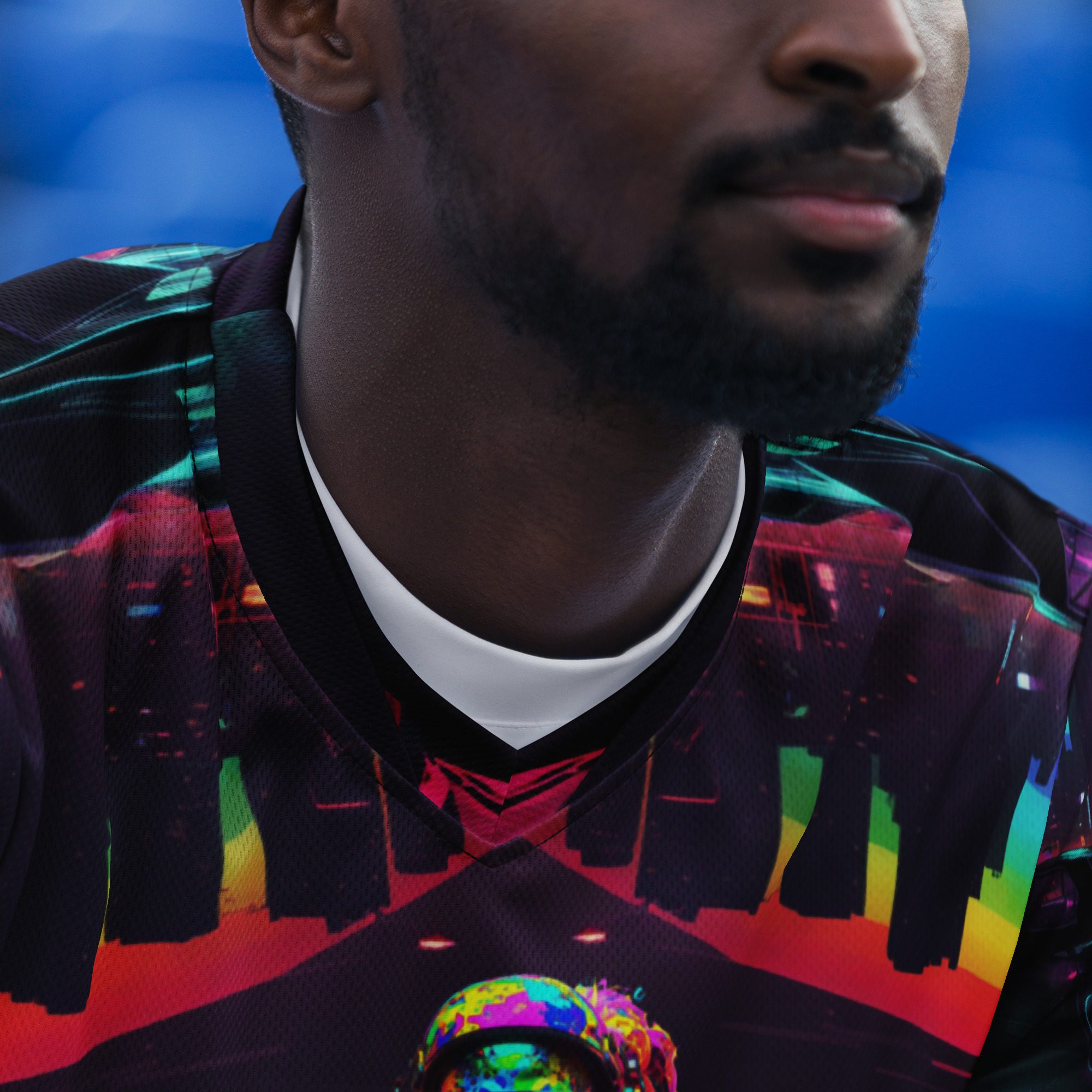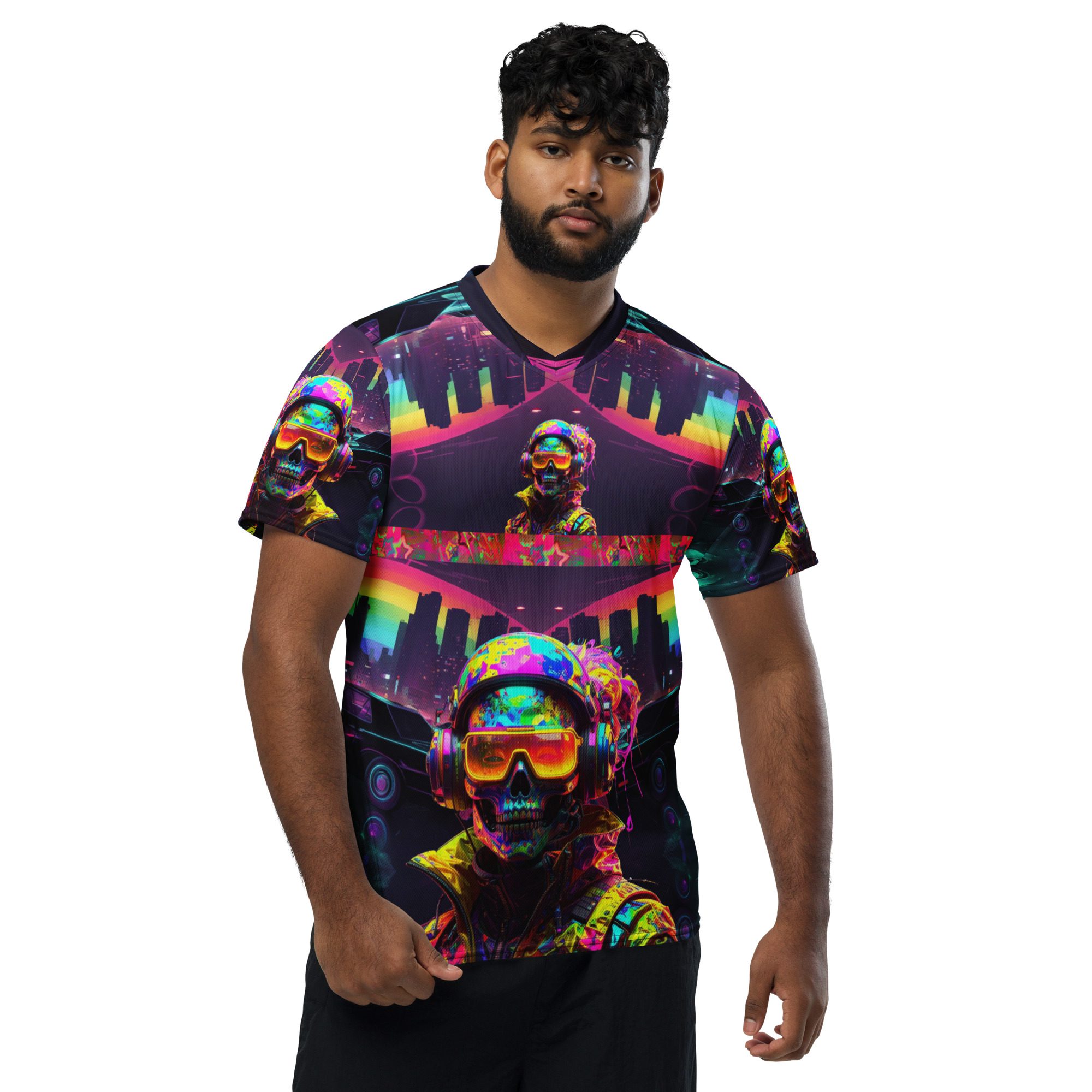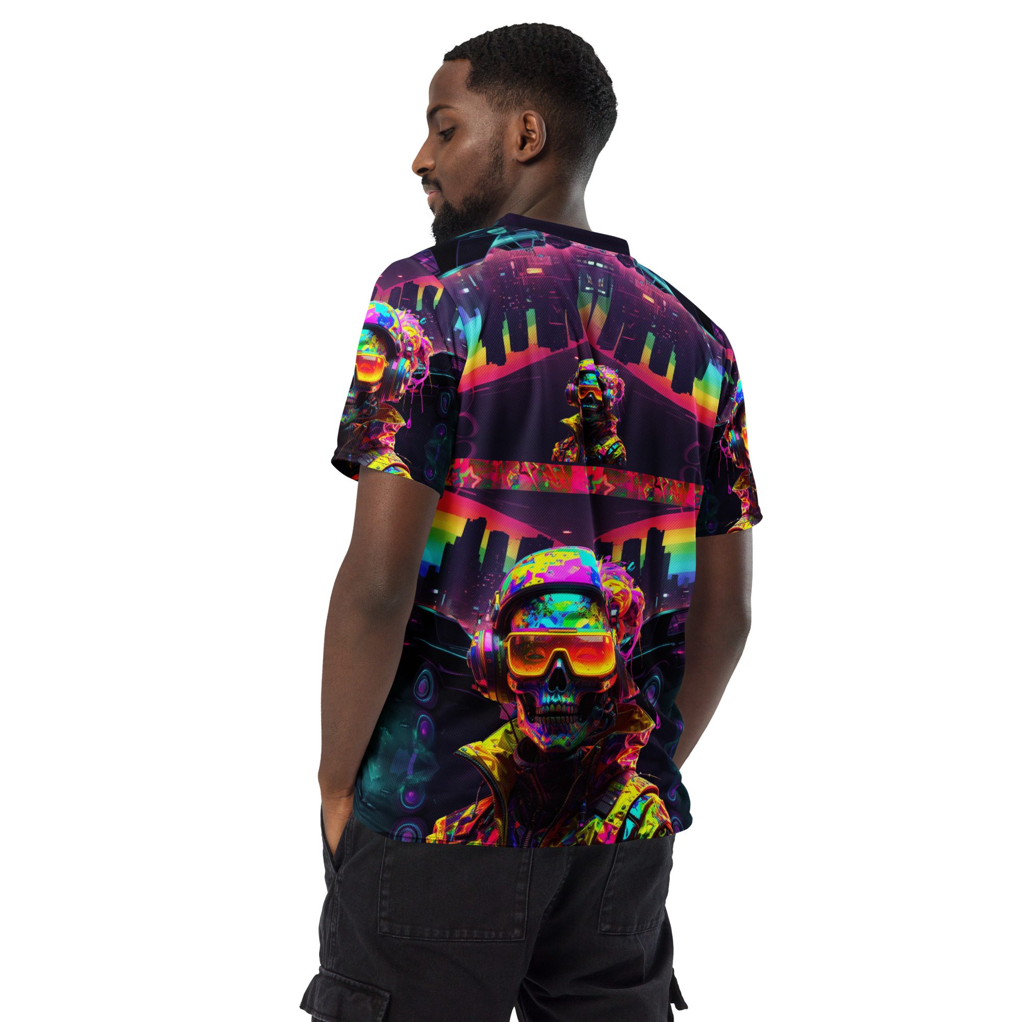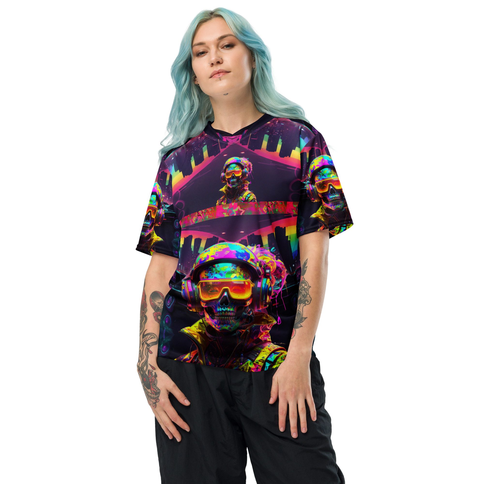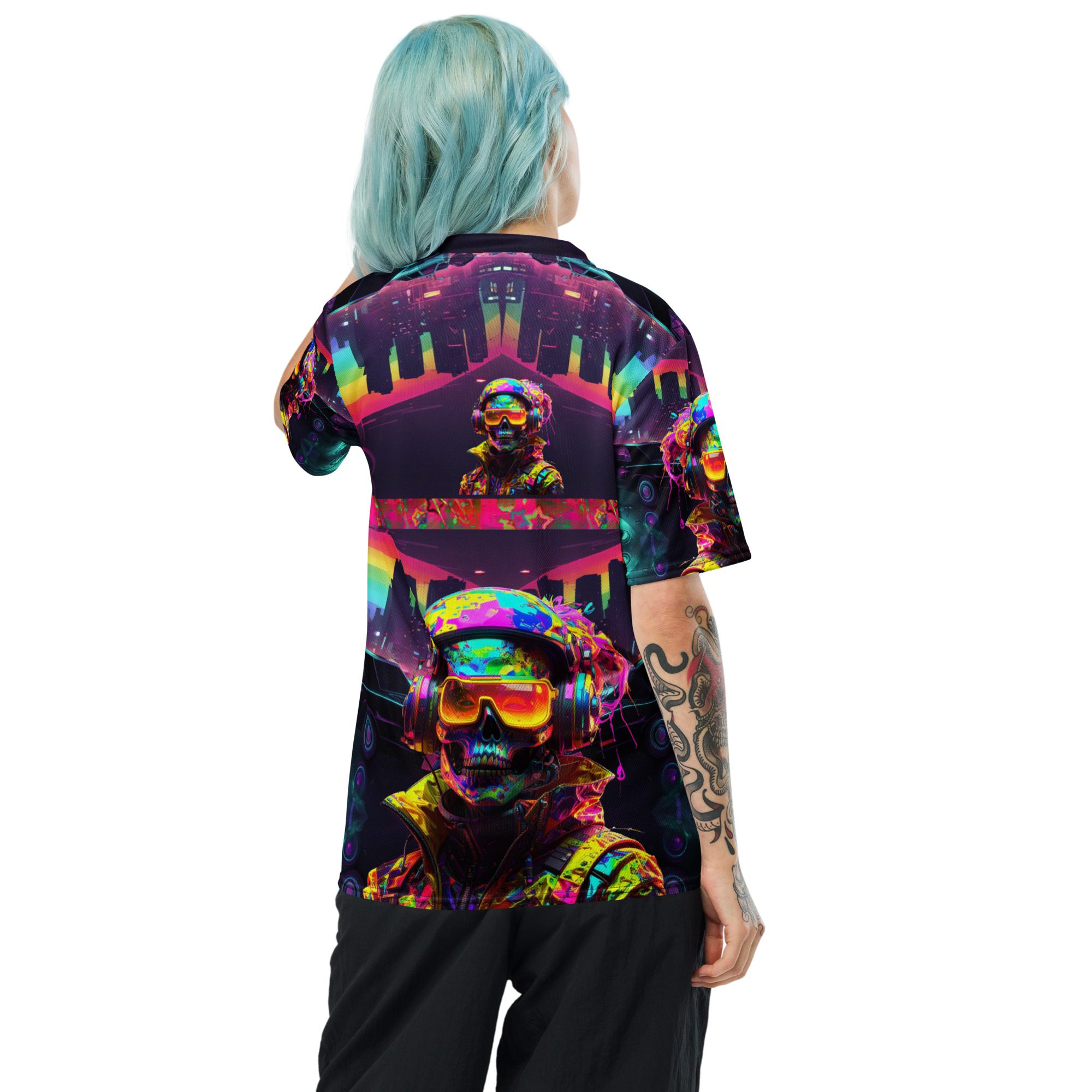 It feels electric, chaotic, nostalgic, and dangerous — like a lost rave flyer burned into a corrupted hard drive. This jersey carries late-night warehouse energy, underground club culture, cyberpunk streetwear attitude, and Y2K rave fashion all in one wearable artifact.