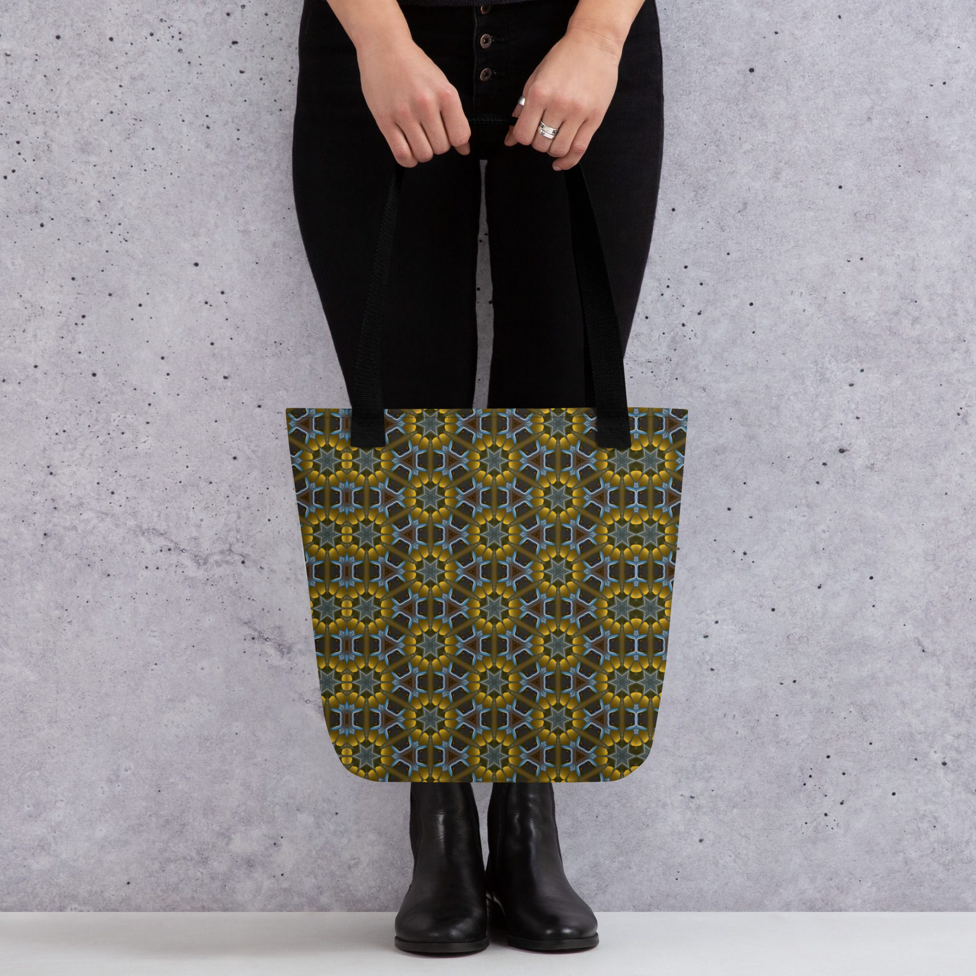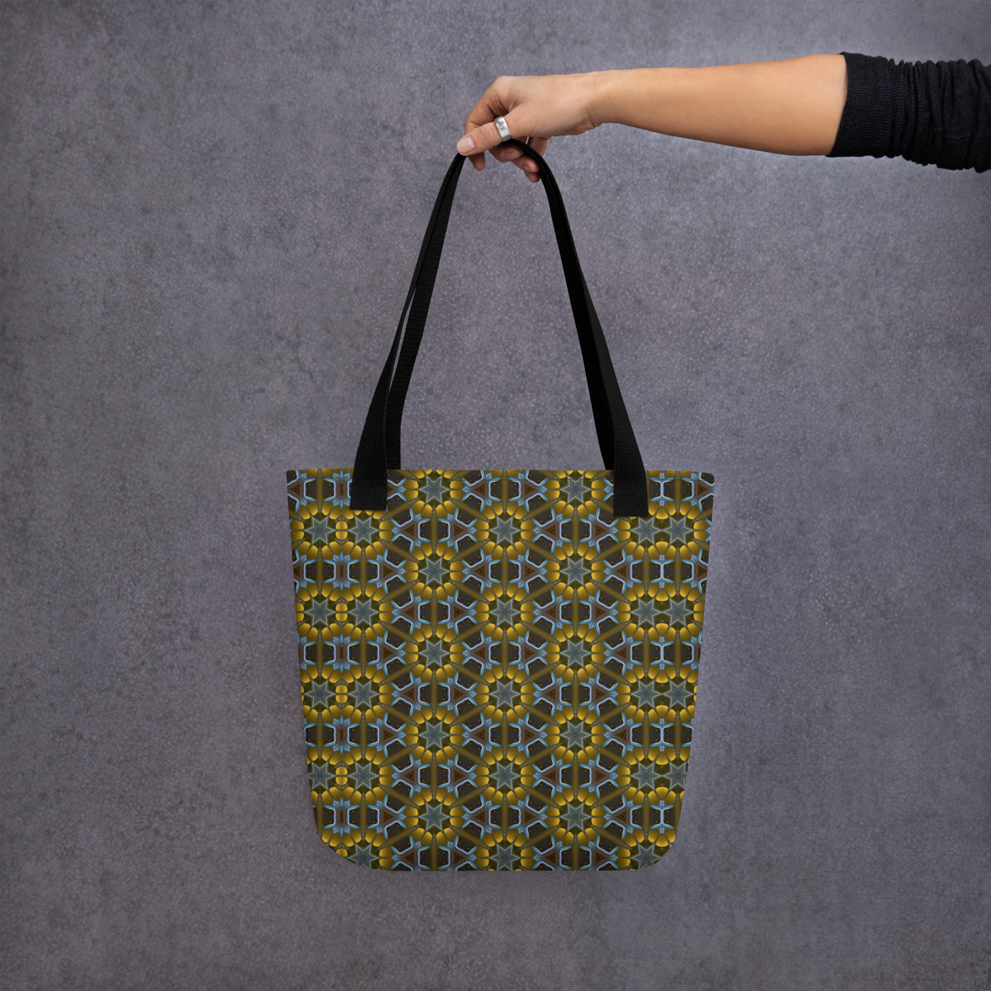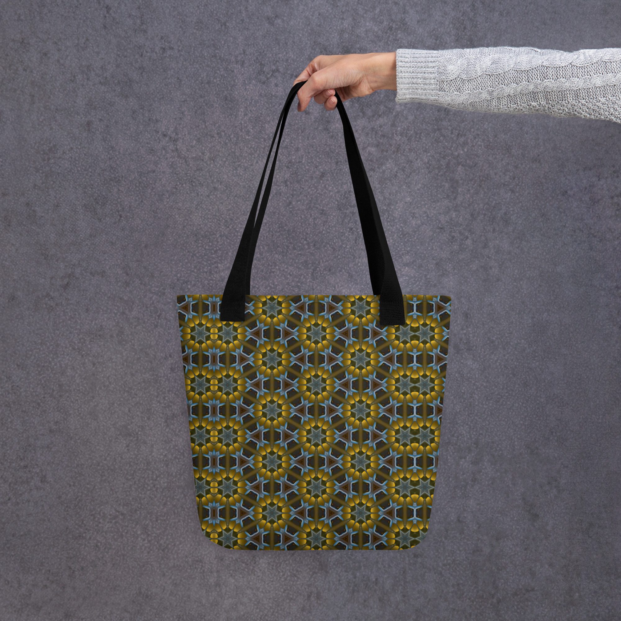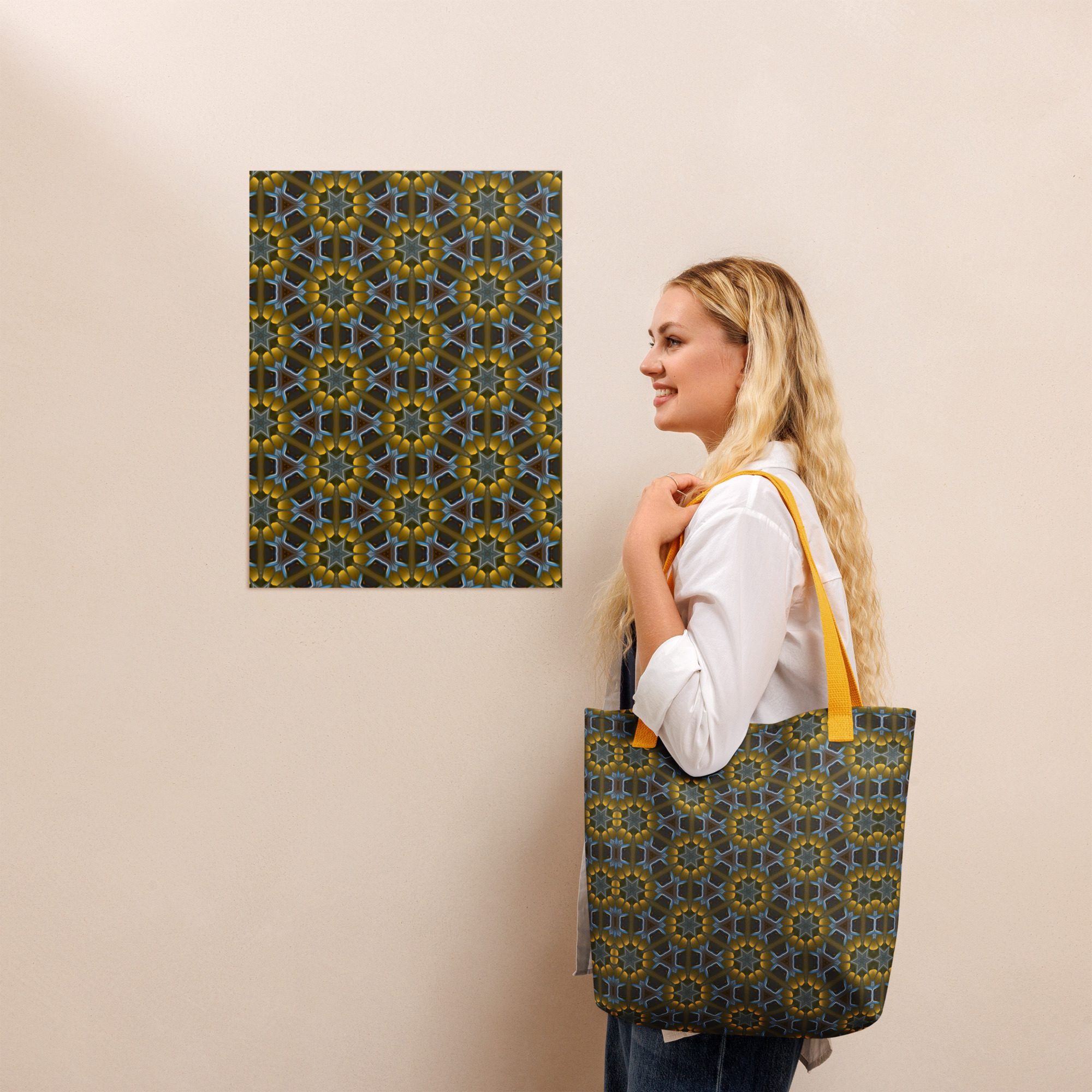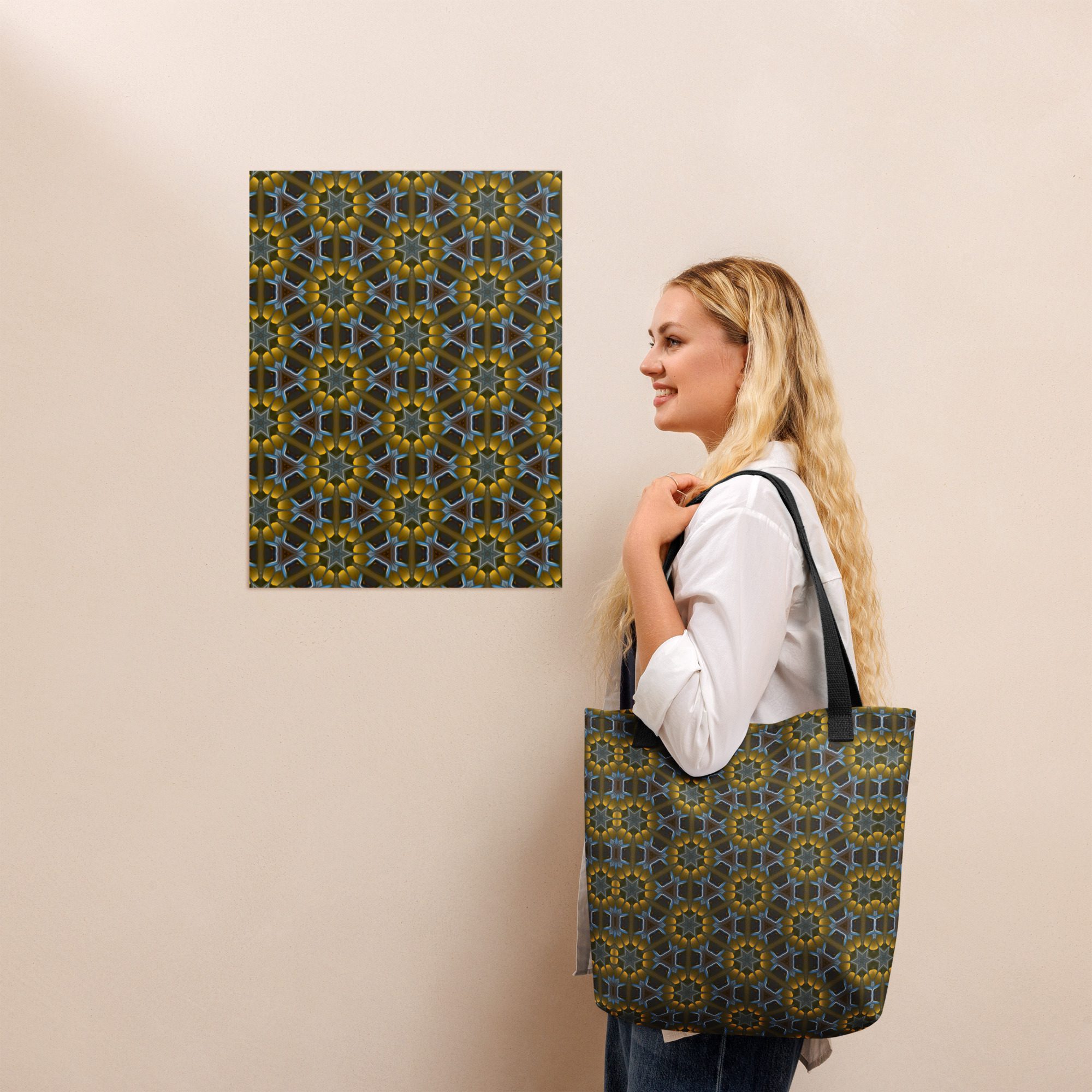 The Golden Lattice Glow – Artistic Tote Bag, featuring original pattern work by Jaysen Mansfield, transforms a daily essential into a bold style statement. This bag showcases a radiant geometric design with glowing gold accents, cool blue details, and a repeating lattice motif that creates a modern, eye-catching visual effect.