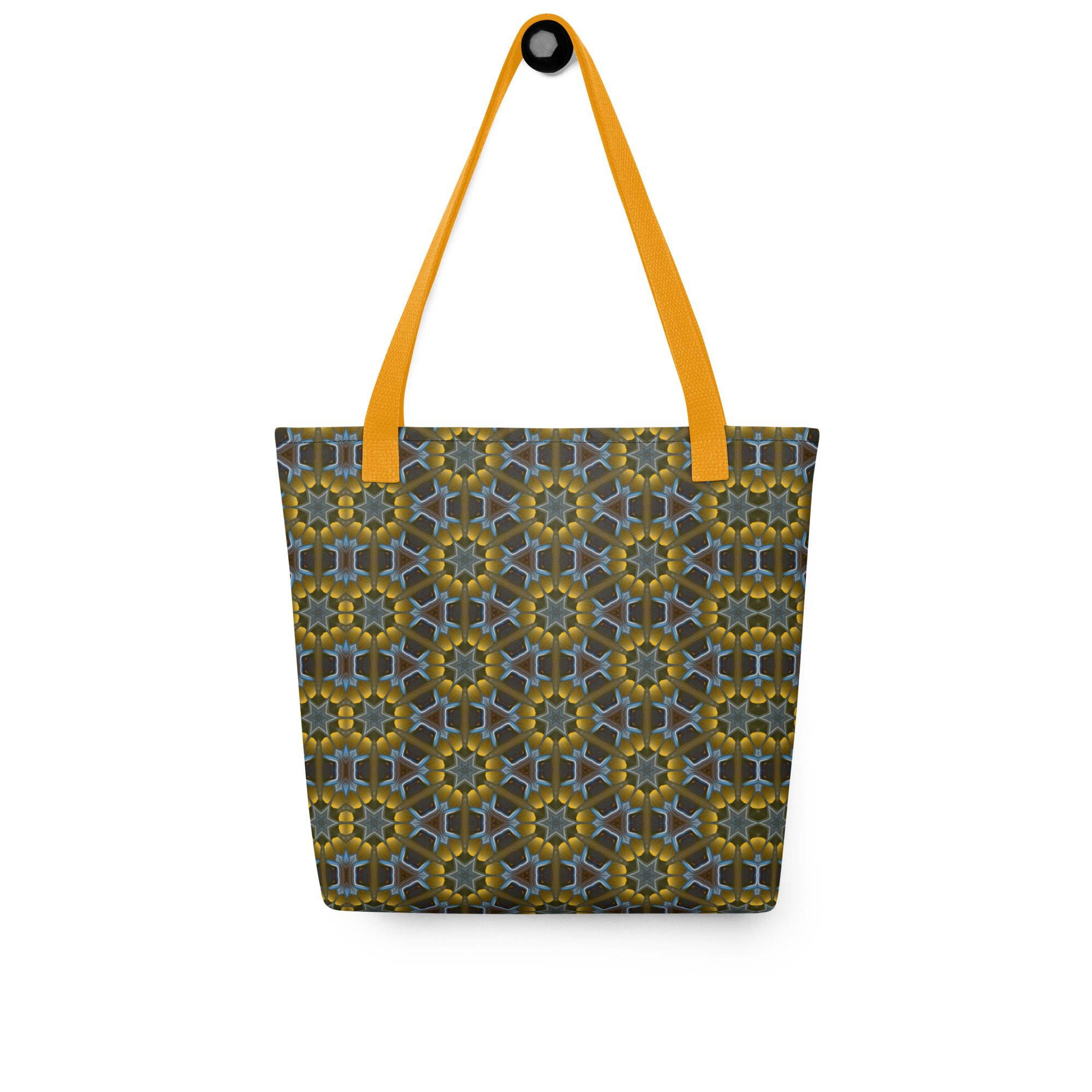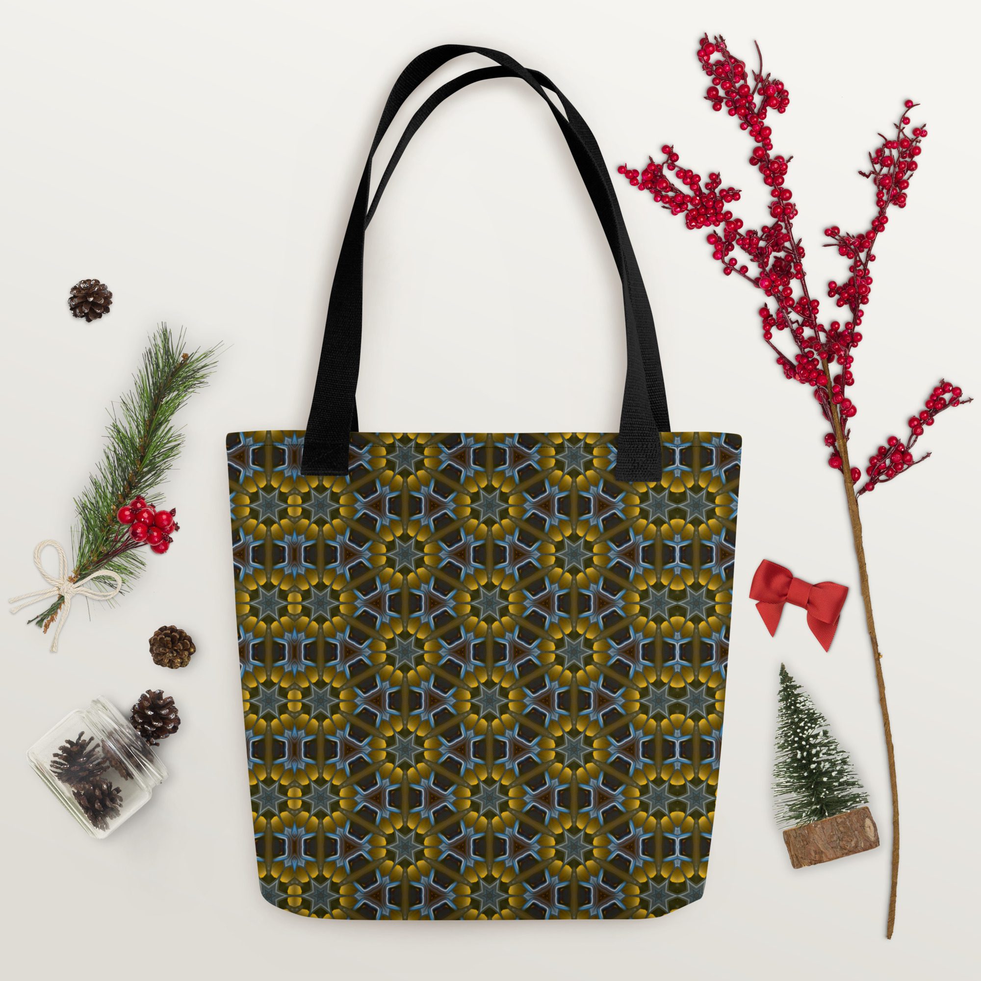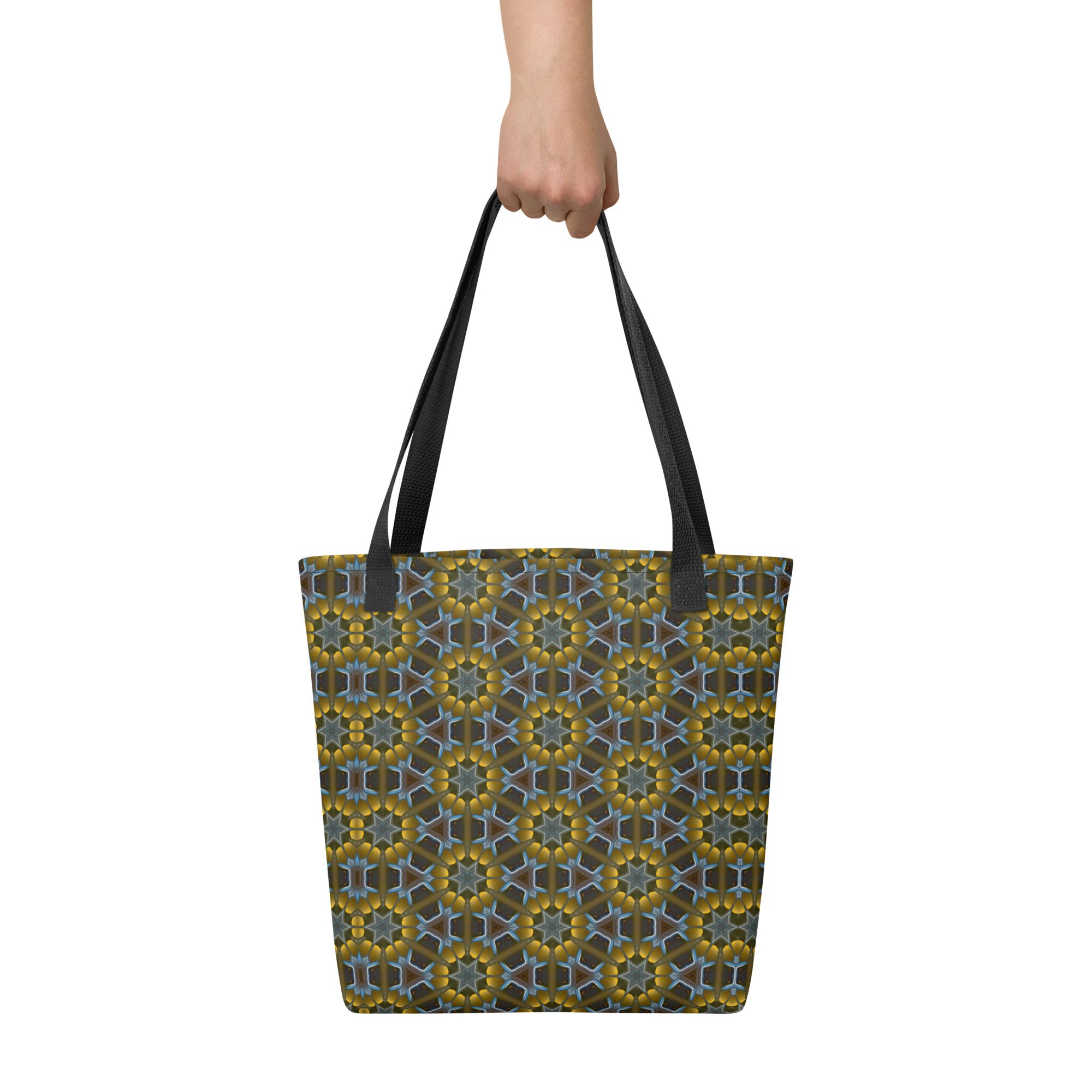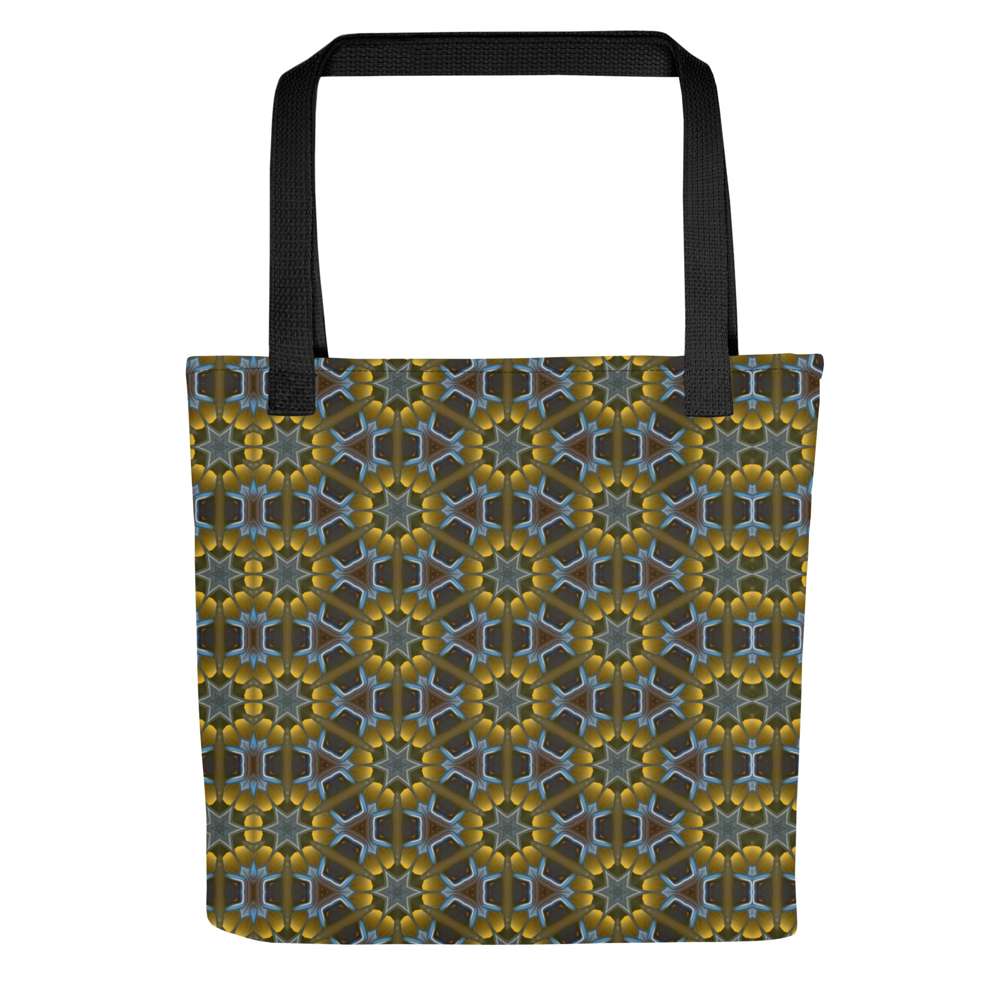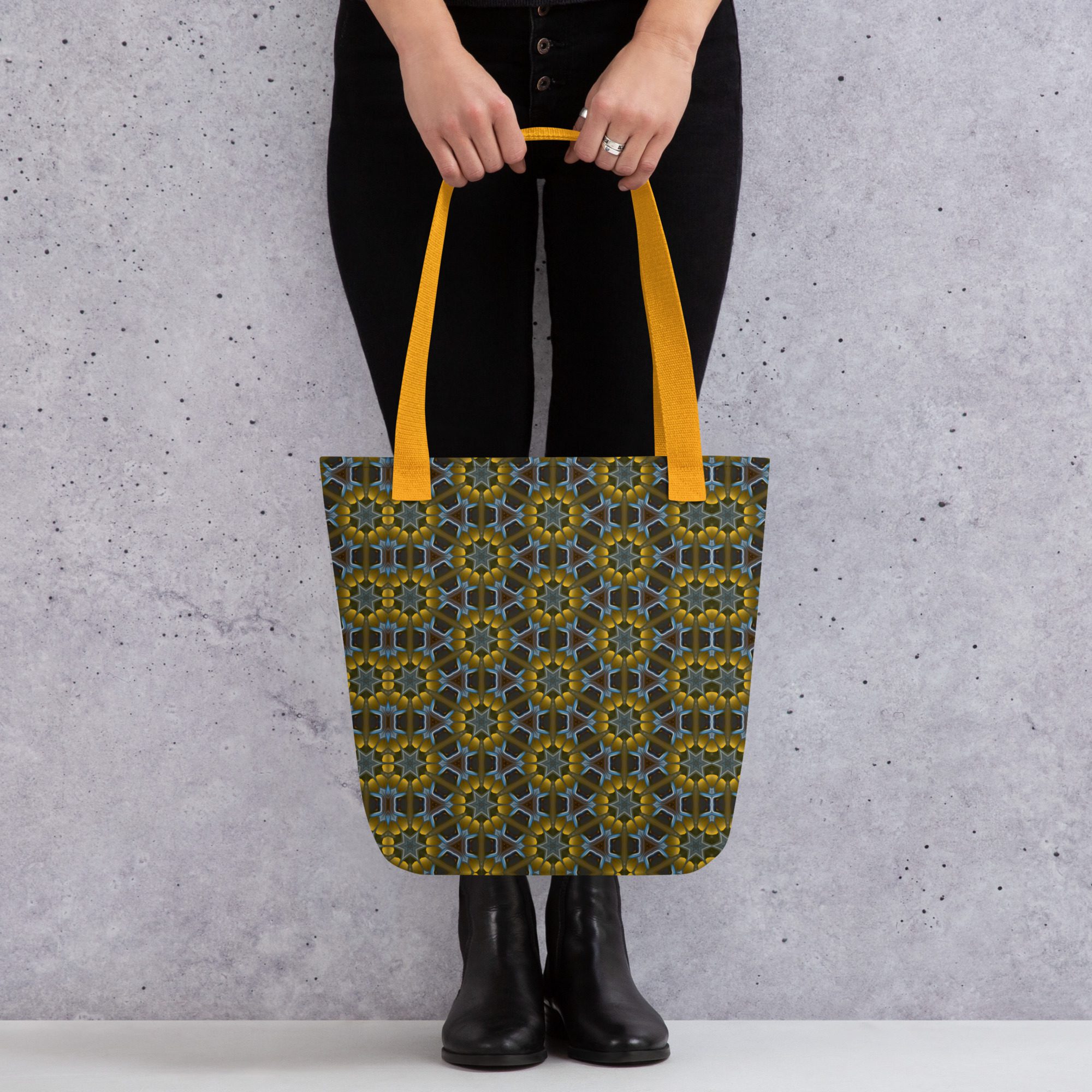 The Golden Lattice Glow – Artistic Tote Bag, featuring original pattern work by Jaysen Mansfield, transforms a daily essential into a bold style statement. This bag showcases a radiant geometric design with glowing gold accents, cool blue details, and a repeating lattice motif that creates a modern, eye-catching visual effect.
