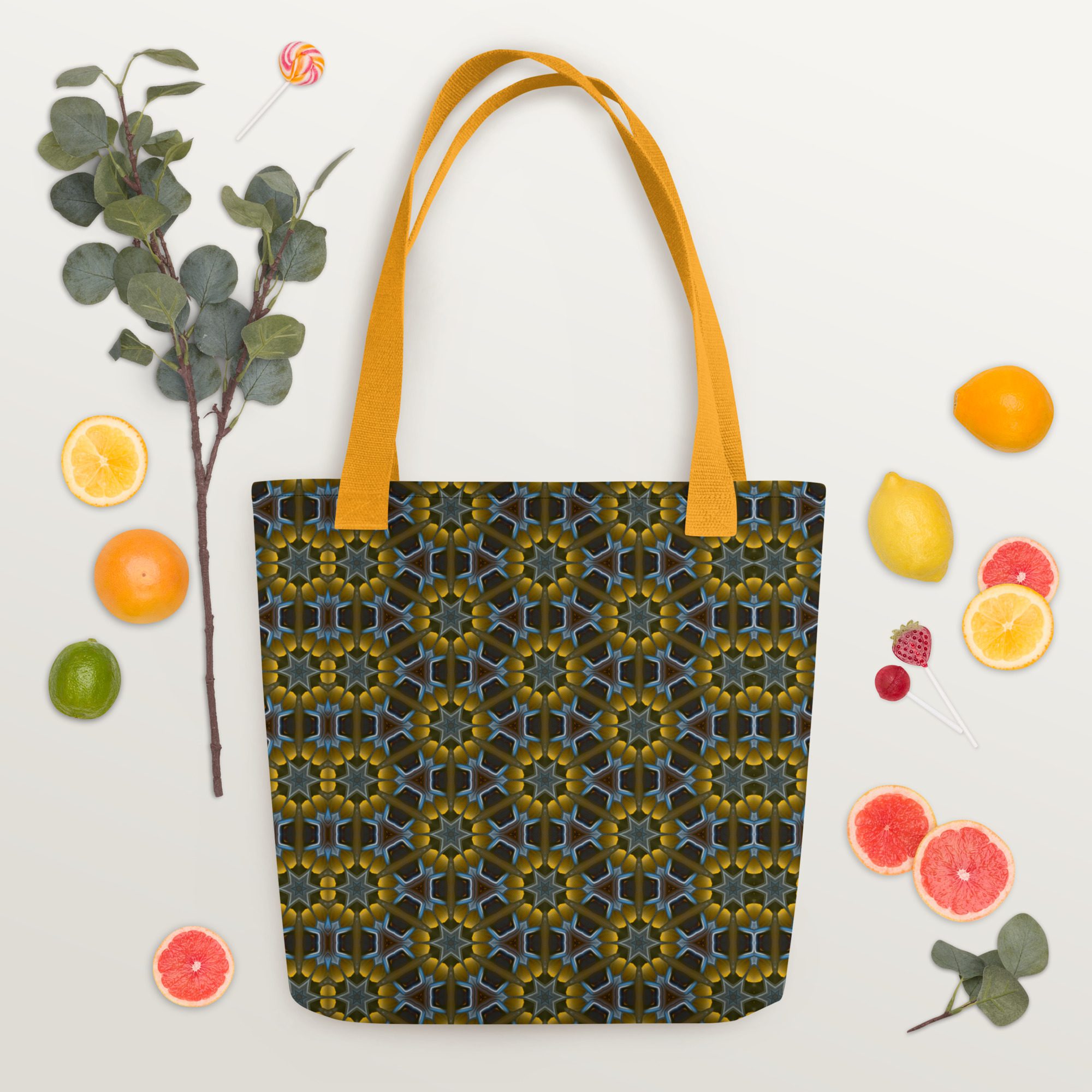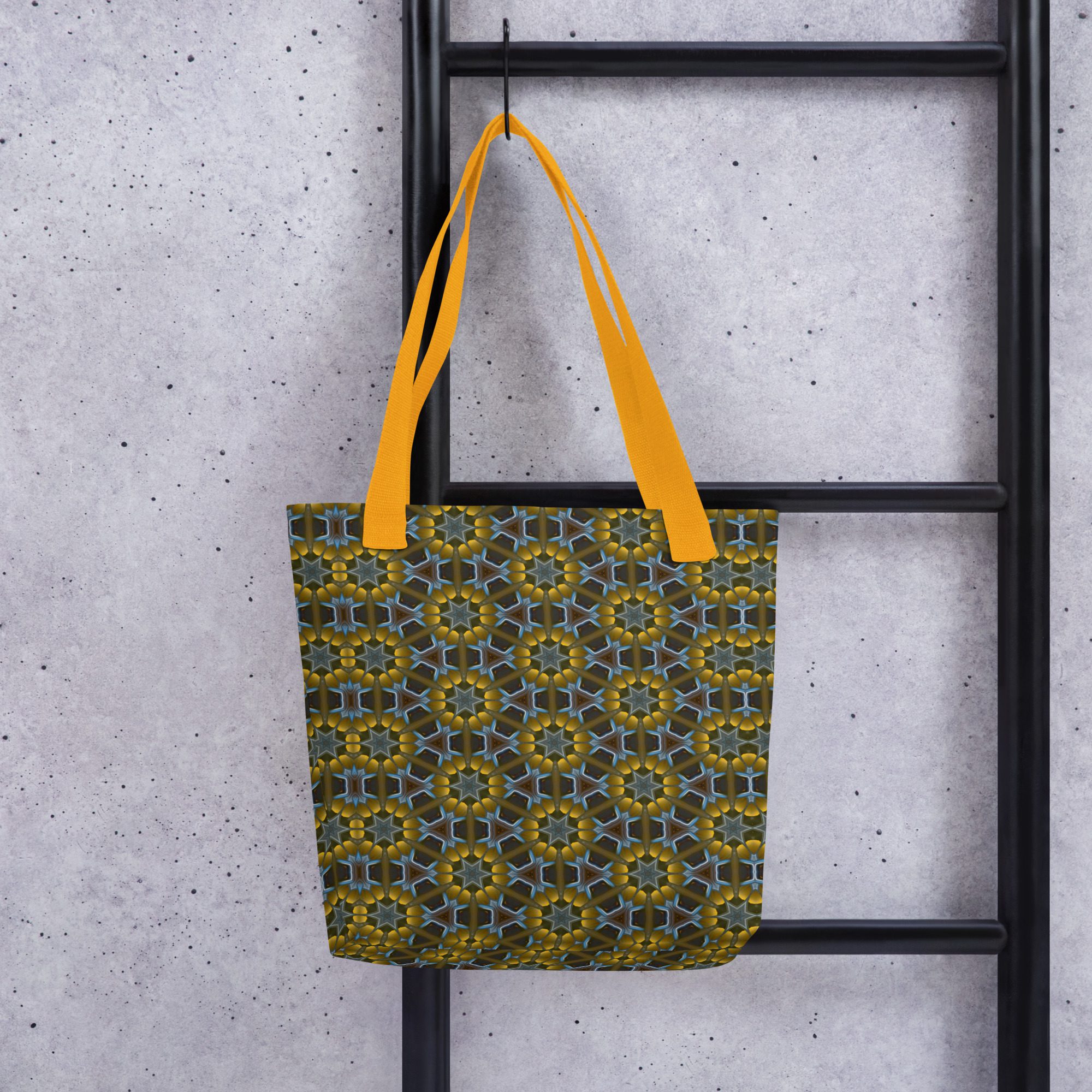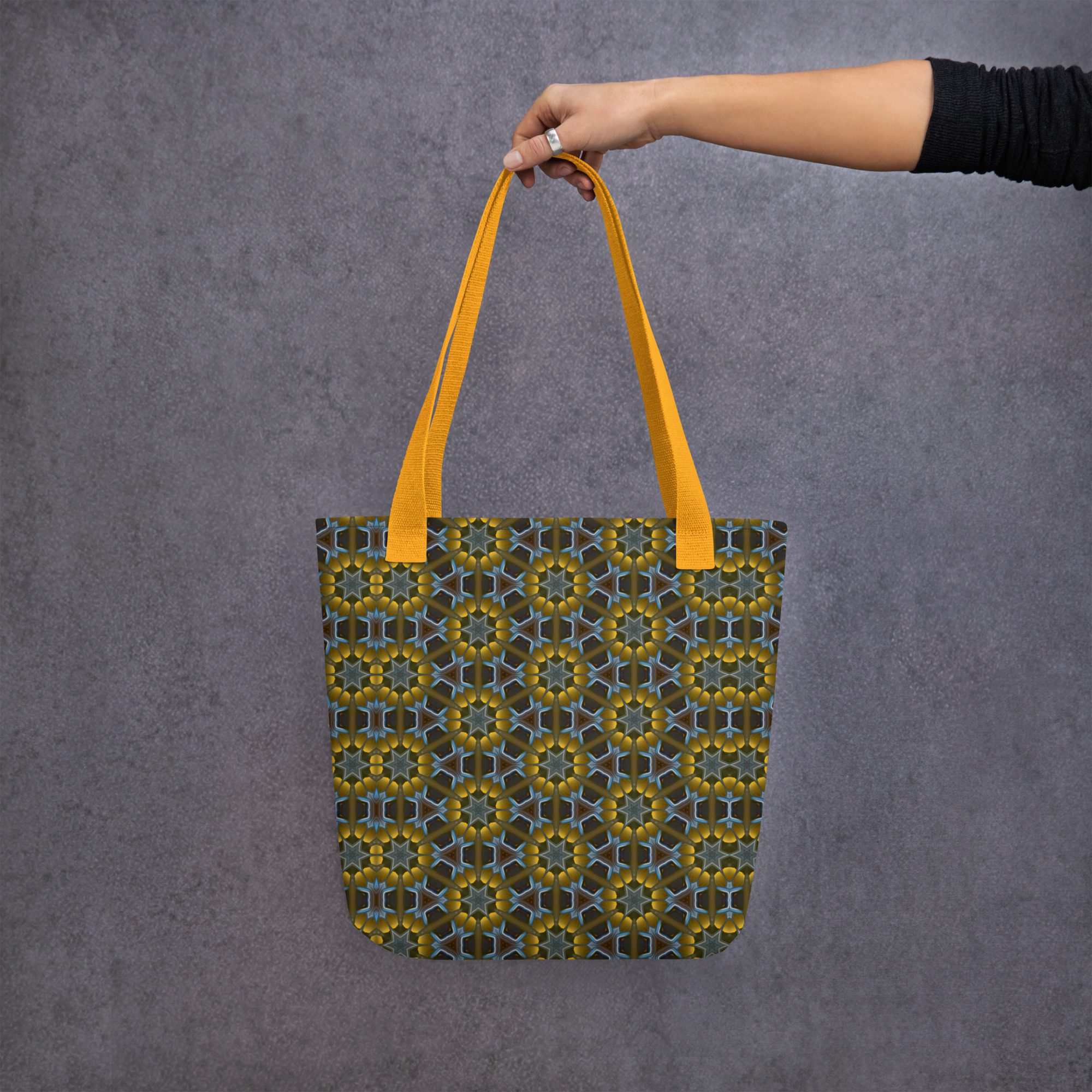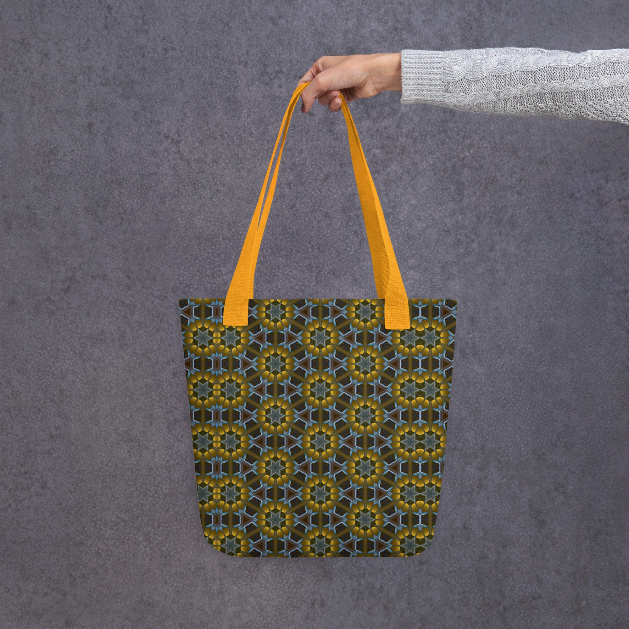 The Golden Lattice Glow – Artistic Tote Bag, featuring original pattern work by Jaysen Mansfield, transforms a daily essential into a bold style statement. This bag showcases a radiant geometric design with glowing gold accents, cool blue details, and a repeating lattice motif that creates a modern, eye-catching visual effect.