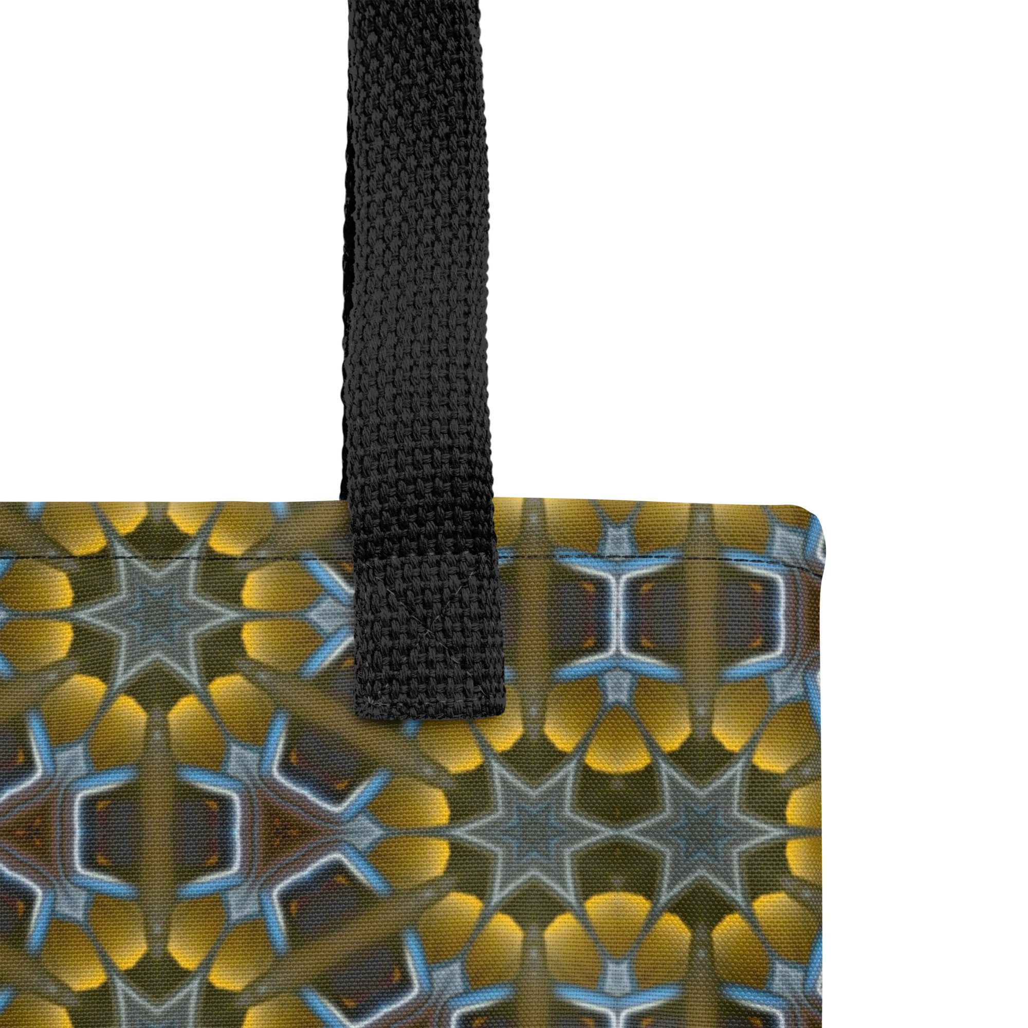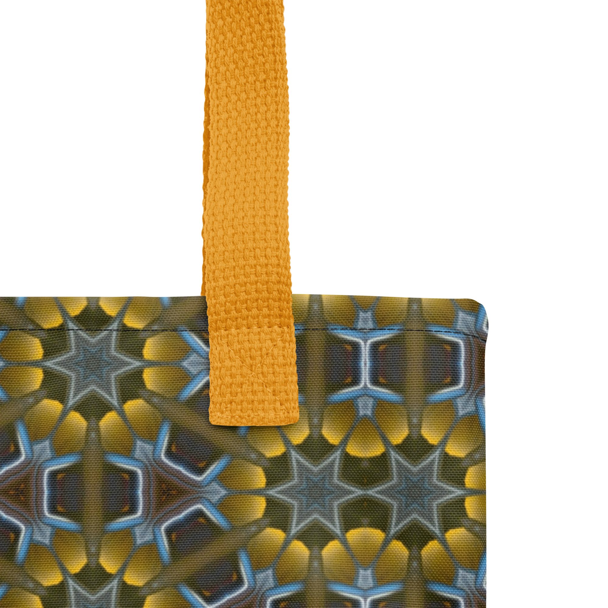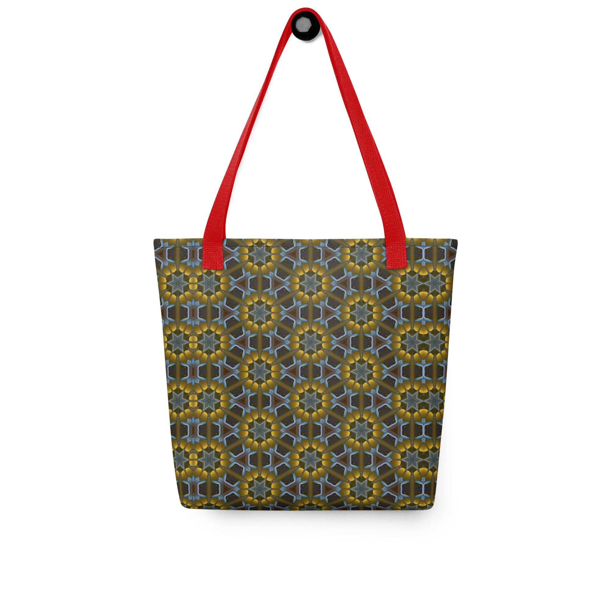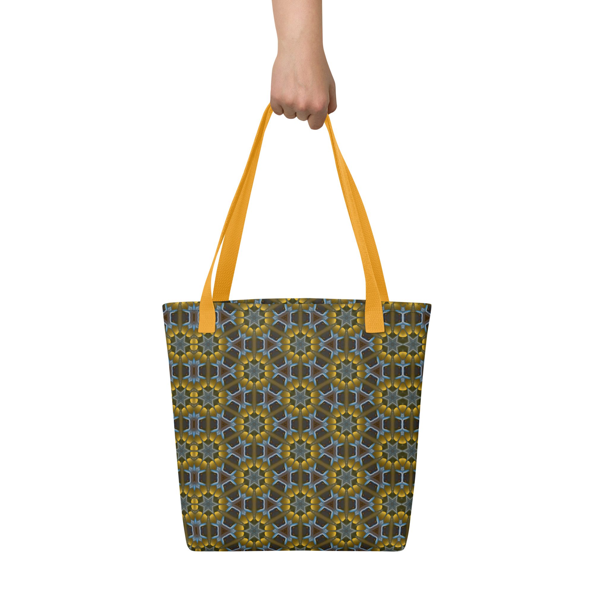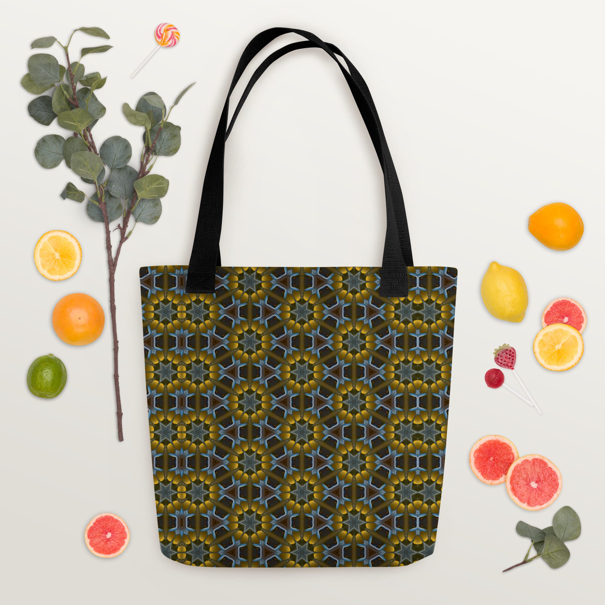 The Golden Lattice Glow – Artistic Tote Bag, featuring original pattern work by Jaysen Mansfield, transforms a daily essential into a bold style statement. This bag showcases a radiant geometric design with glowing gold accents, cool blue details, and a repeating lattice motif that creates a modern, eye-catching visual effect.