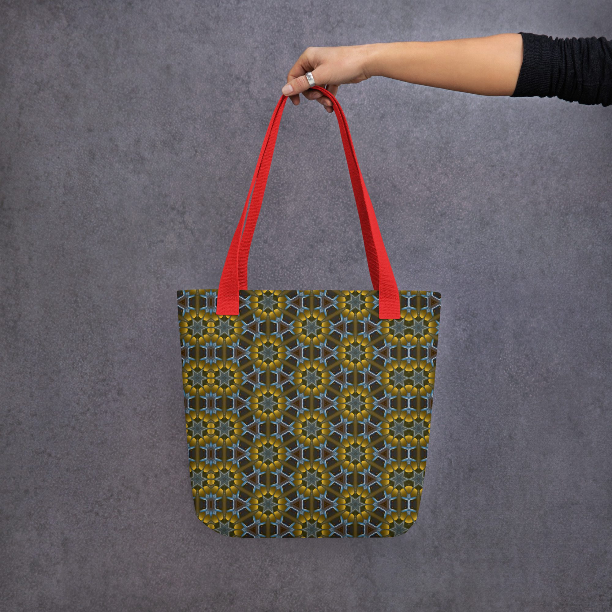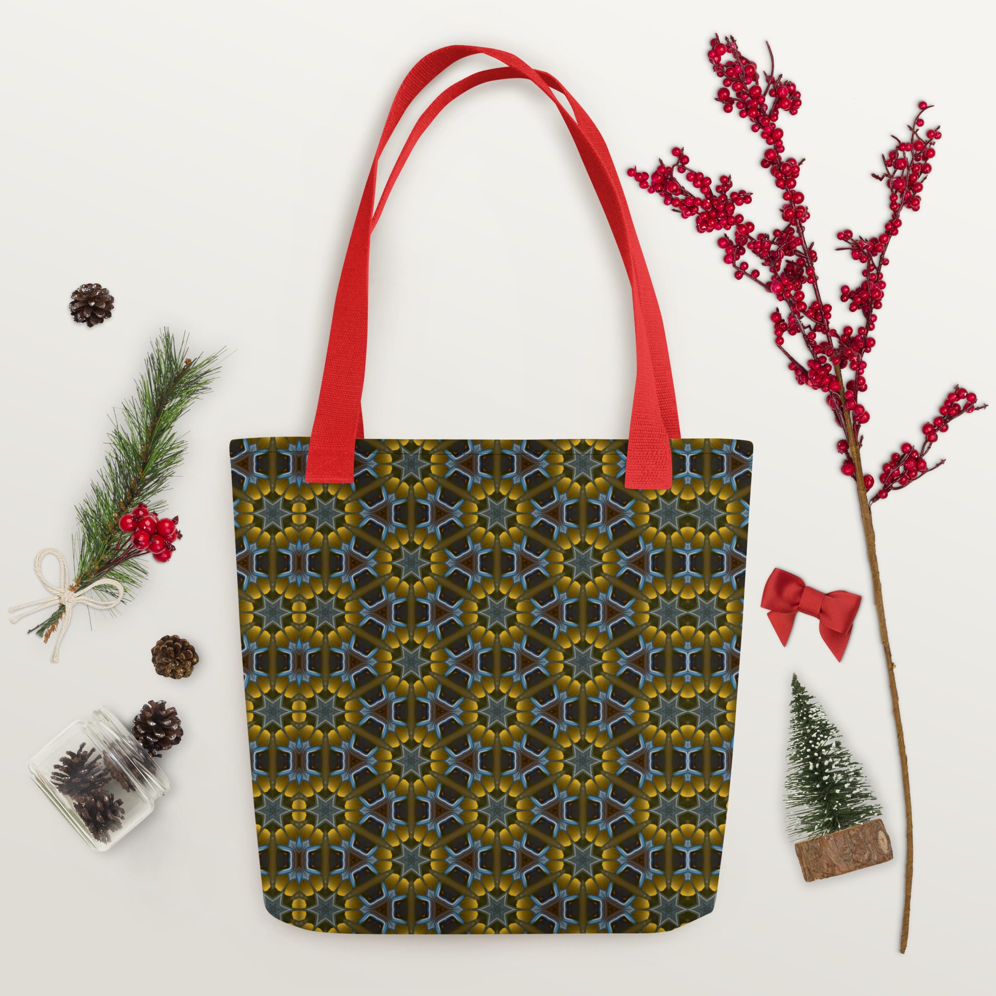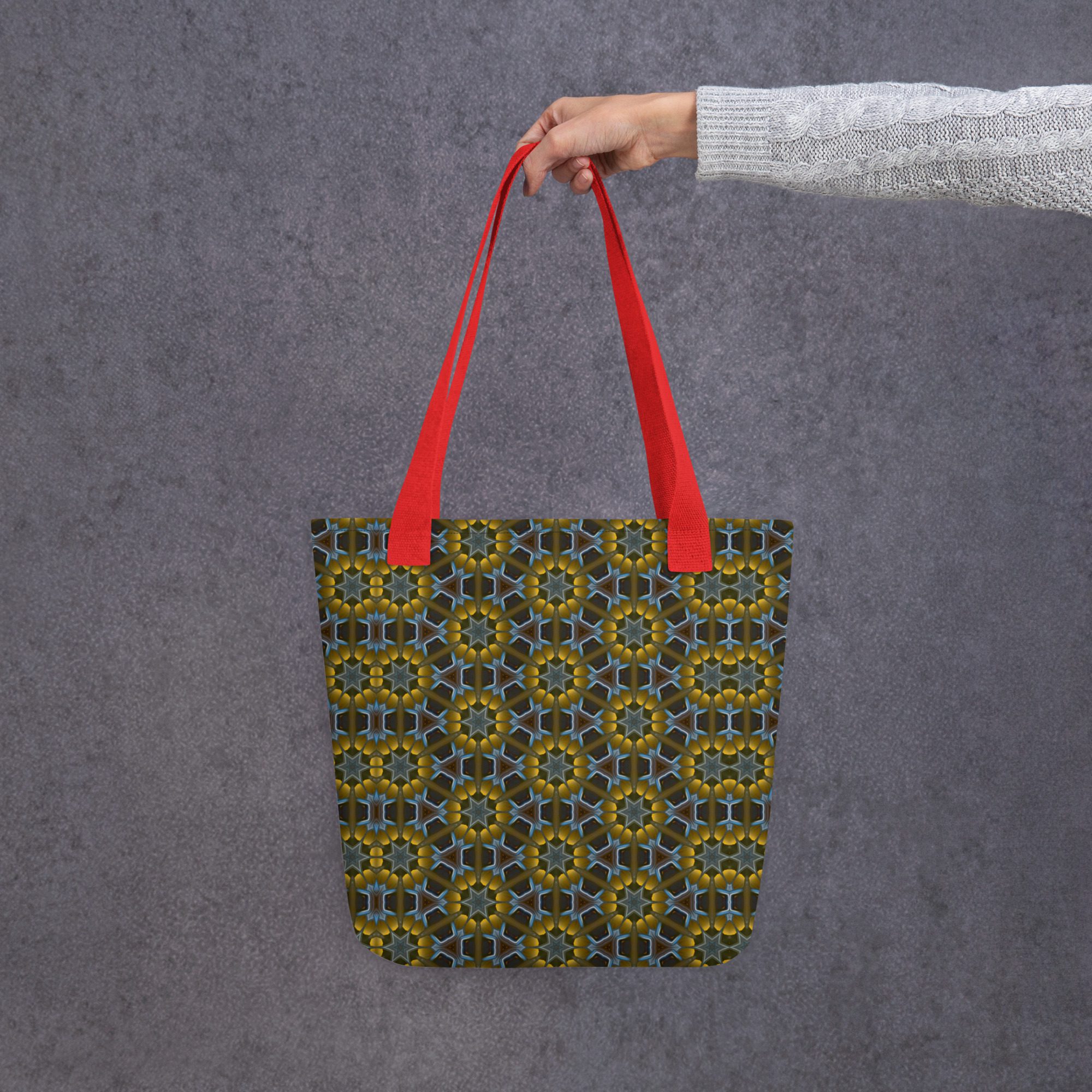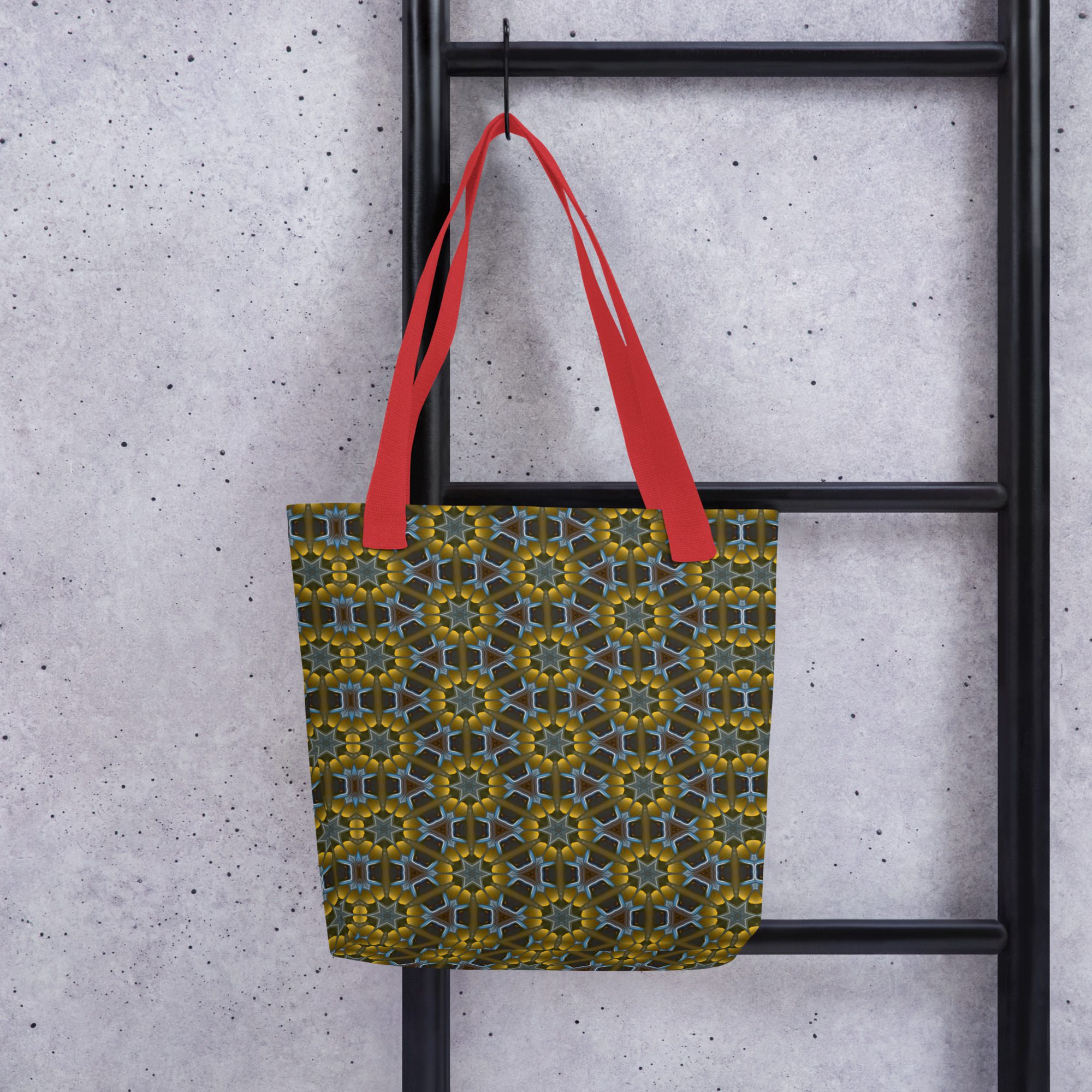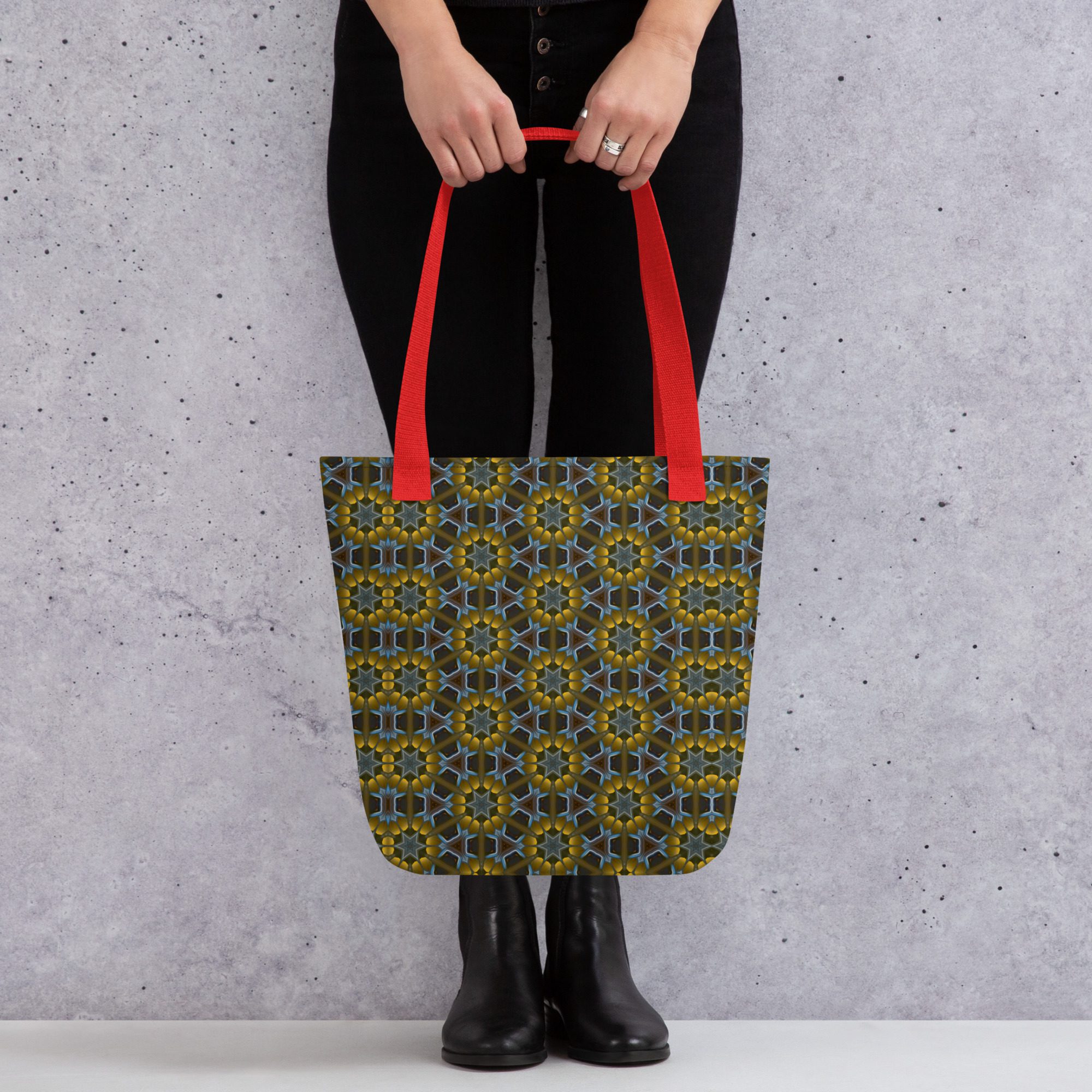 The Golden Lattice Glow – Artistic Tote Bag, featuring original pattern work by Jaysen Mansfield, transforms a daily essential into a bold style statement. This bag showcases a radiant geometric design with glowing gold accents, cool blue details, and a repeating lattice motif that creates a modern, eye-catching visual effect.