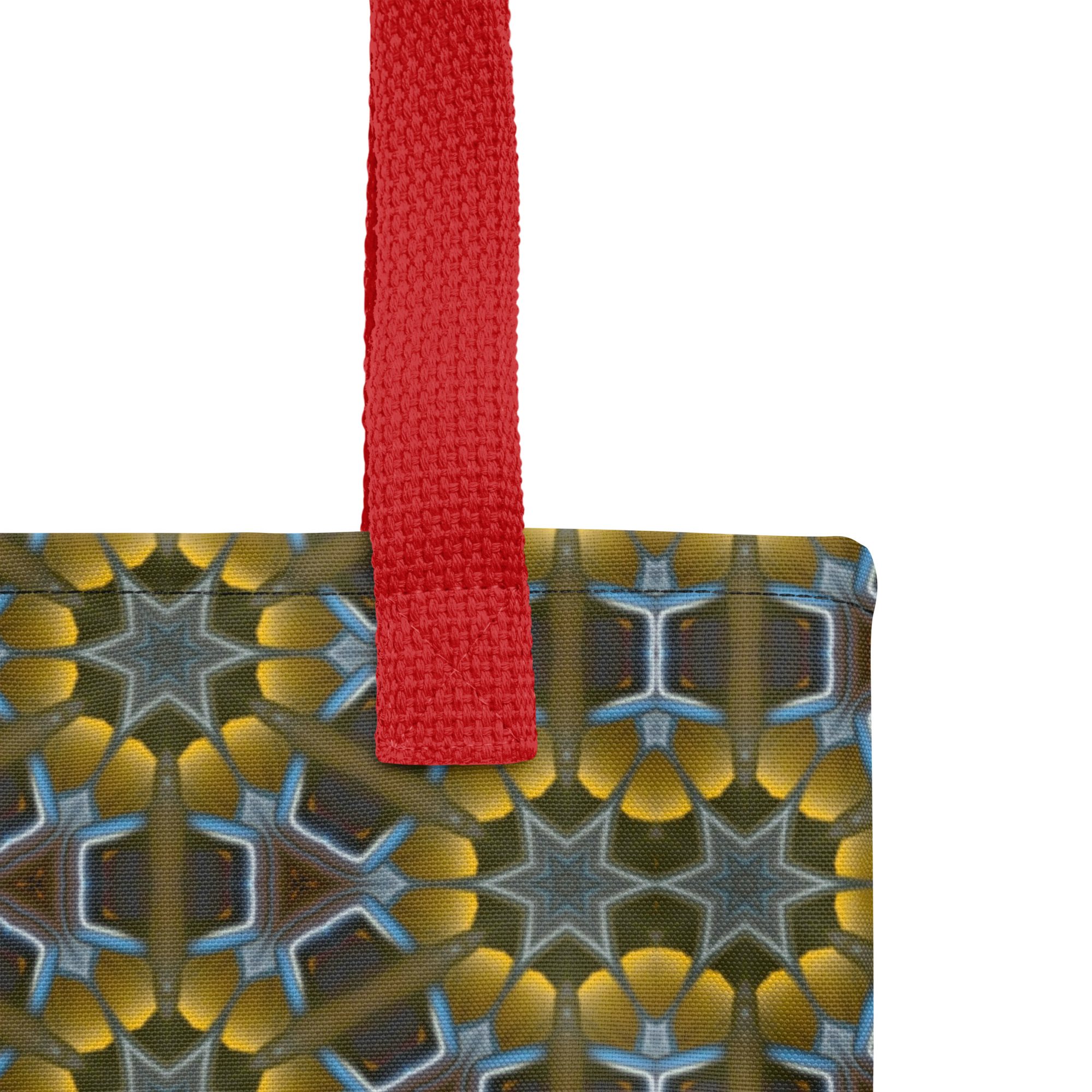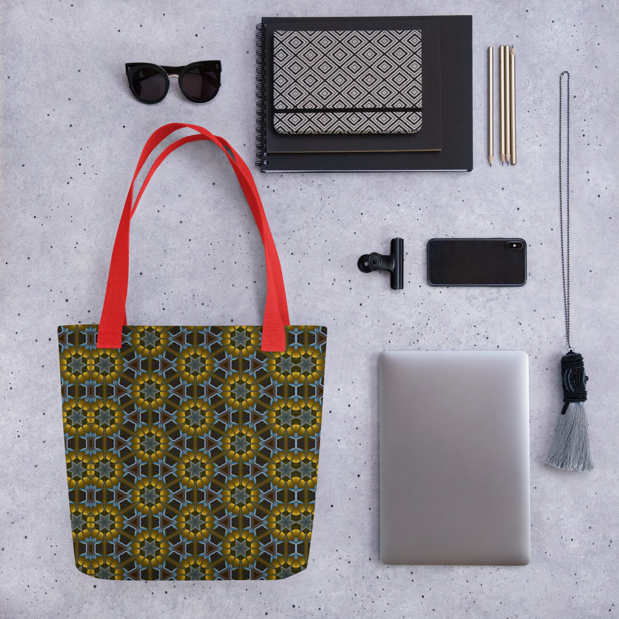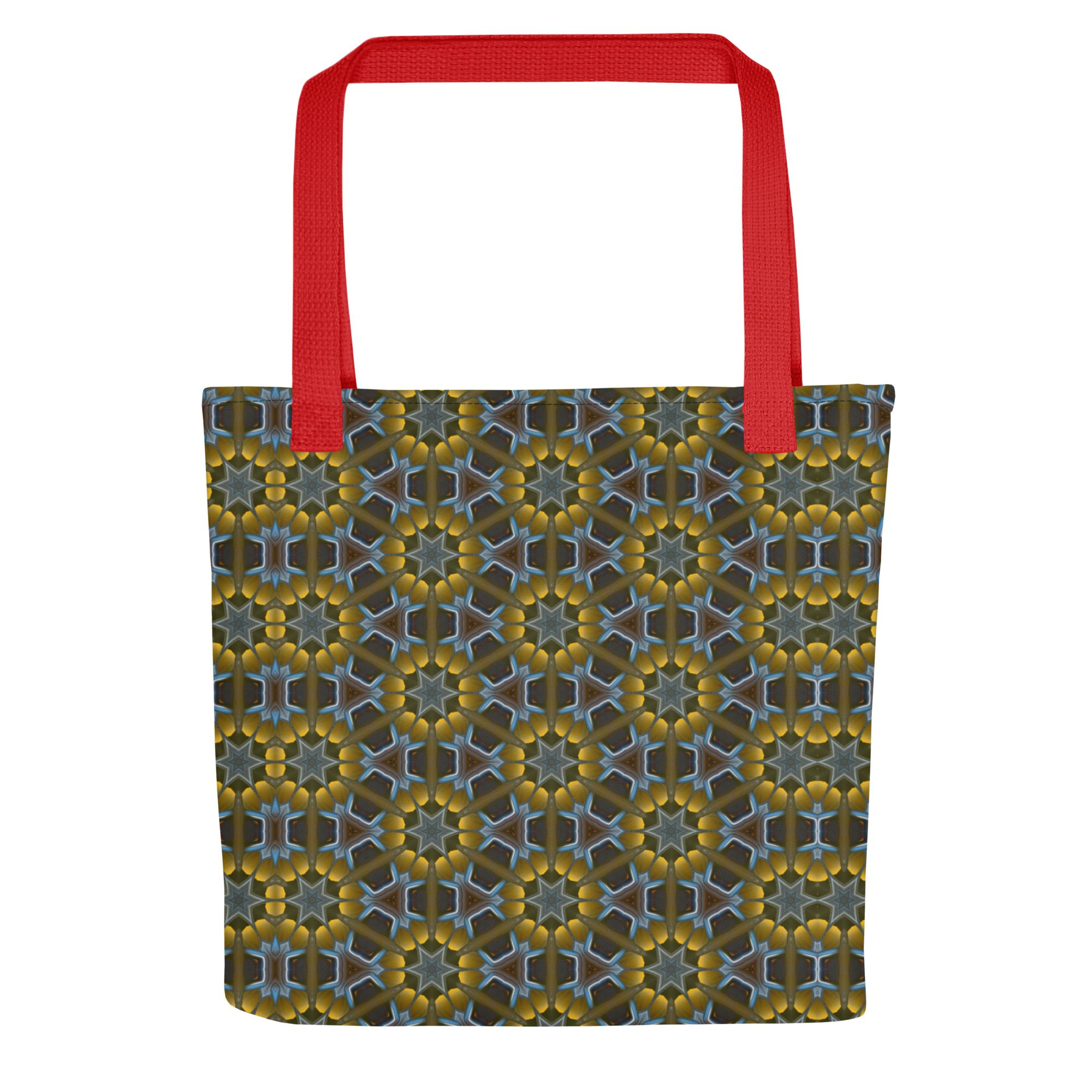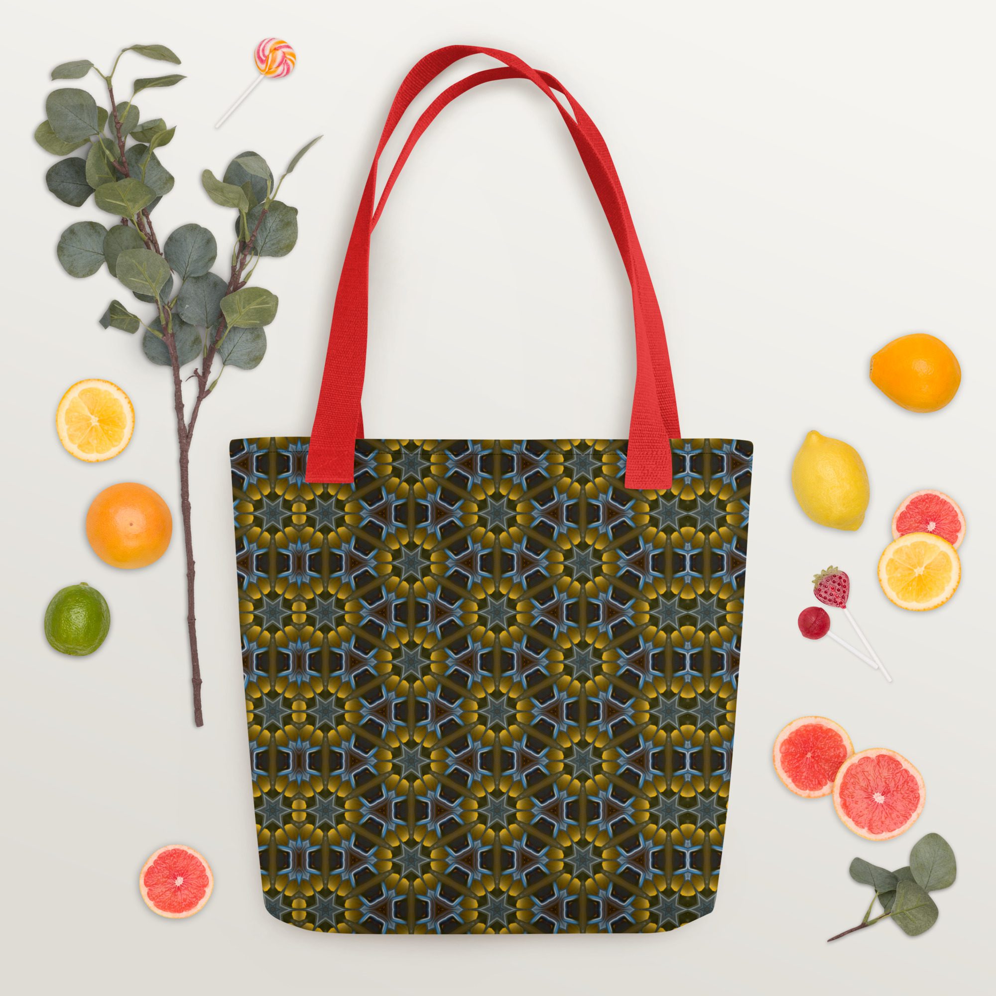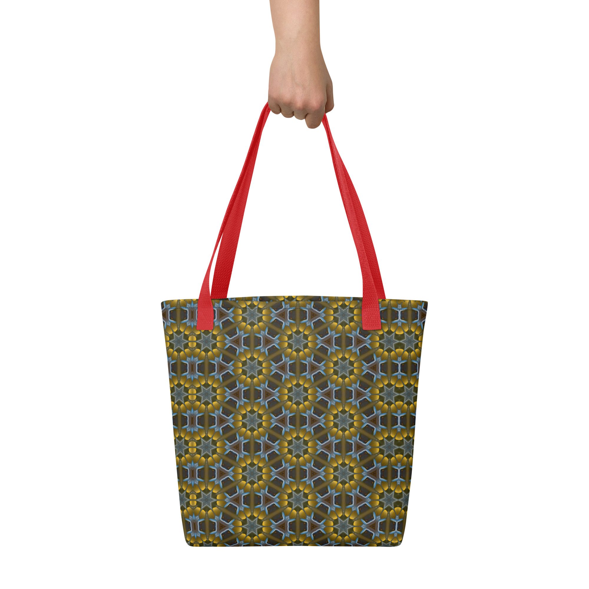 The Golden Lattice Glow – Artistic Tote Bag, featuring original pattern work by Jaysen Mansfield, transforms a daily essential into a bold style statement. This bag showcases a radiant geometric design with glowing gold accents, cool blue details, and a repeating lattice motif that creates a modern, eye-catching visual effect.