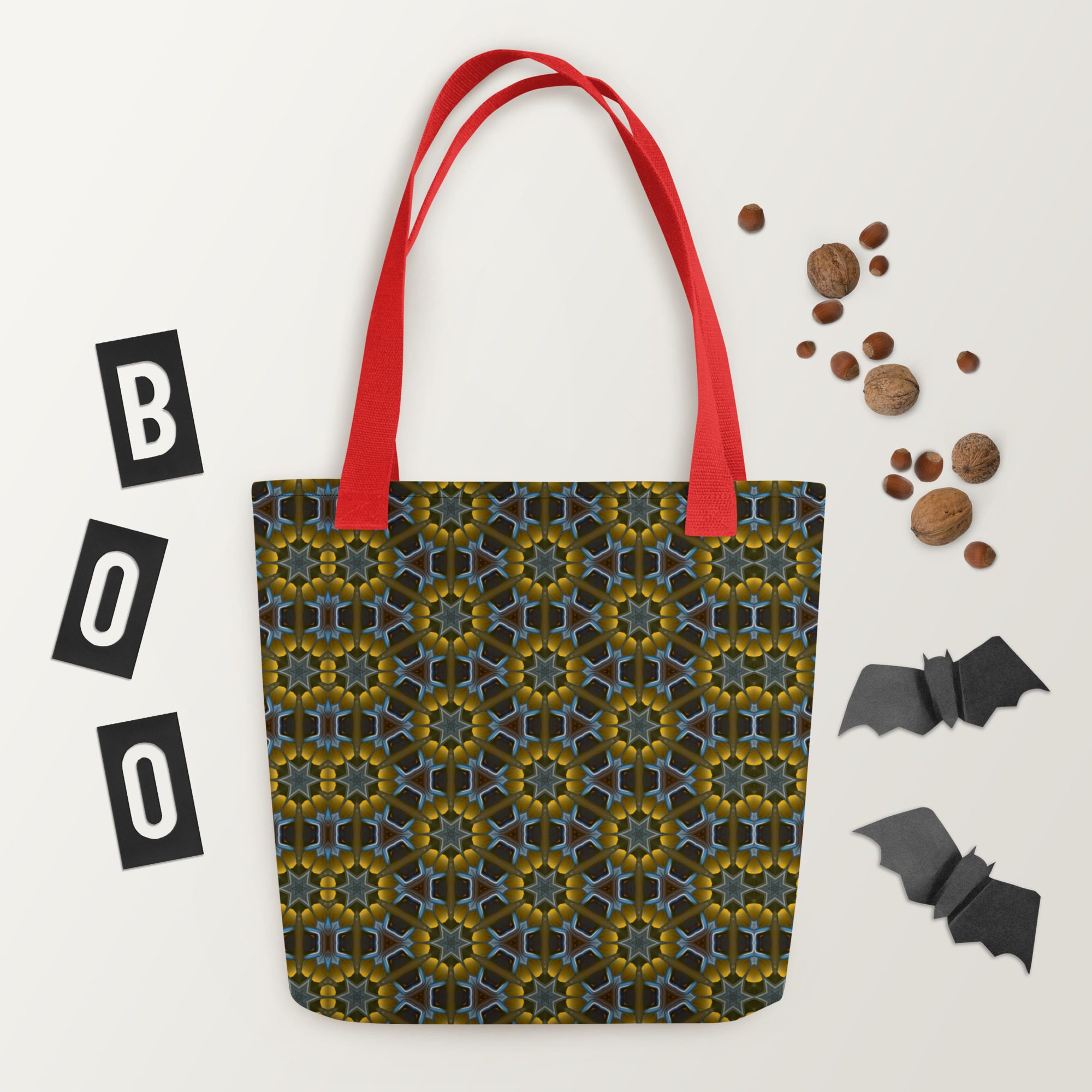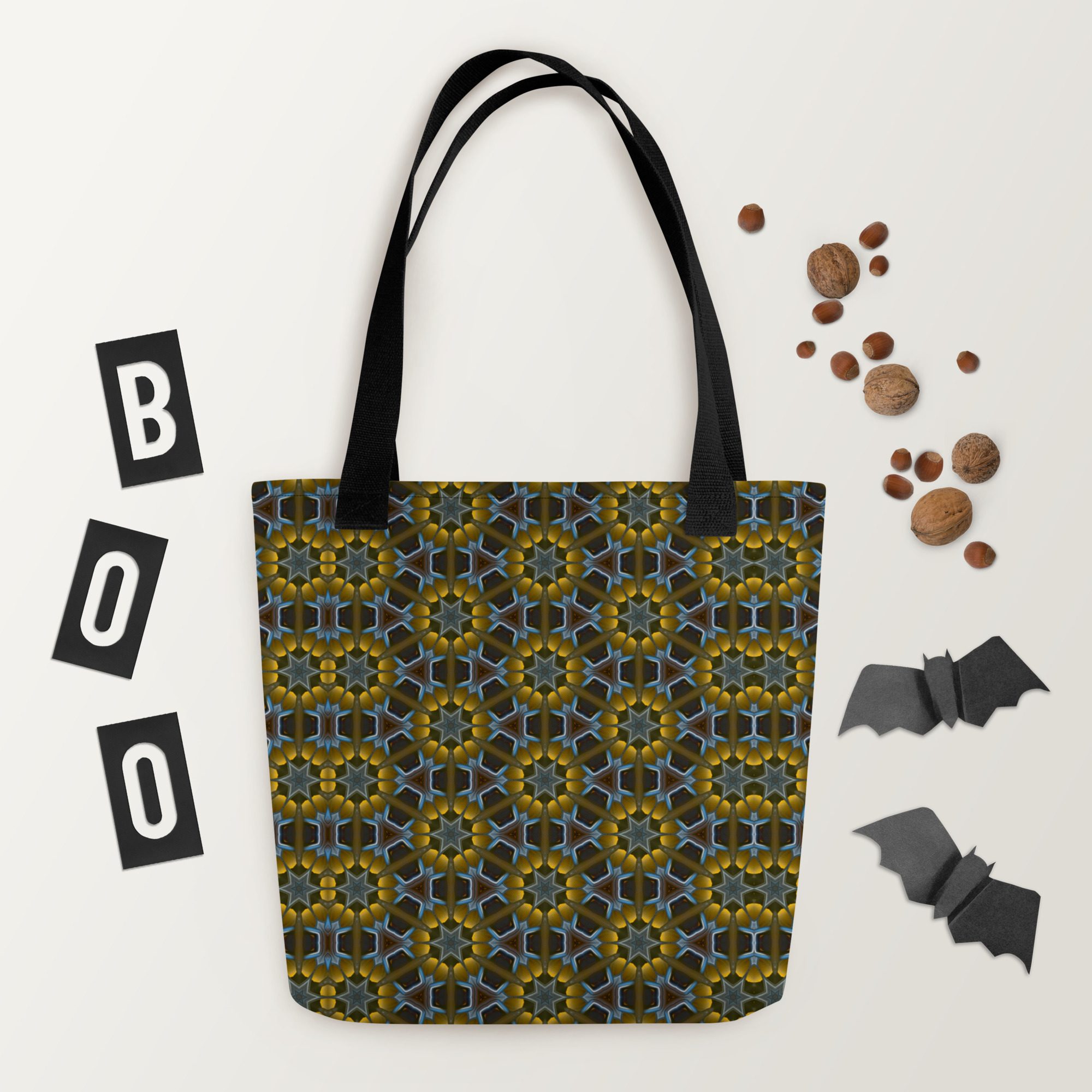 Designed for shoppers, commuters, students, creators, and anyone who loves expressive accessories, this tote blends art and functionality with a striking, fashion-forward aesthetic. The Golden Lattice Glow pattern adds depth, symmetry, and texture, making it perfect for everyday carry, travel, errands, beach days, or creative workspaces.