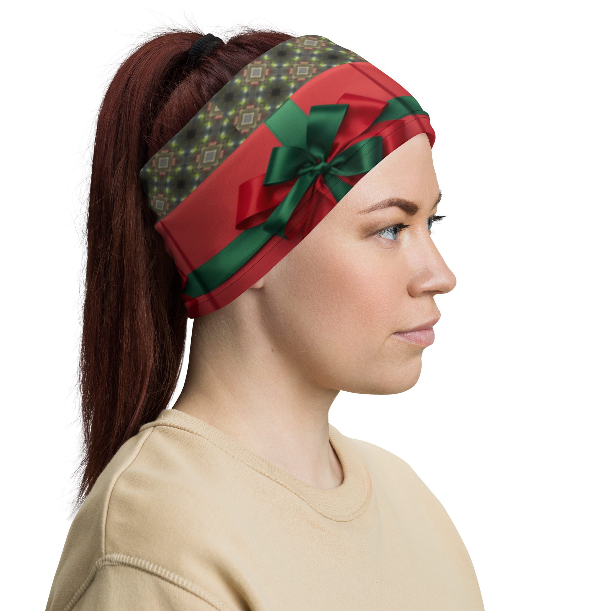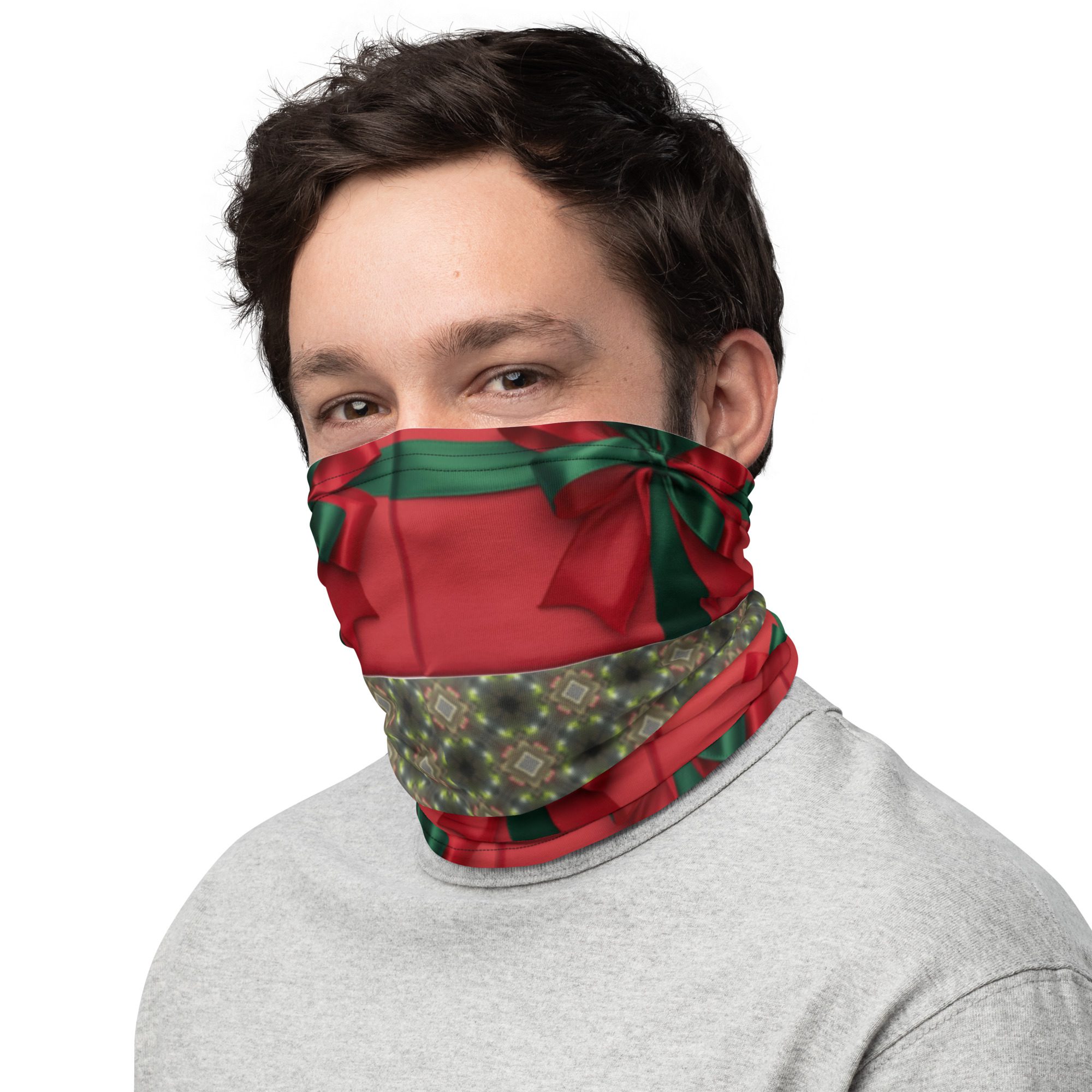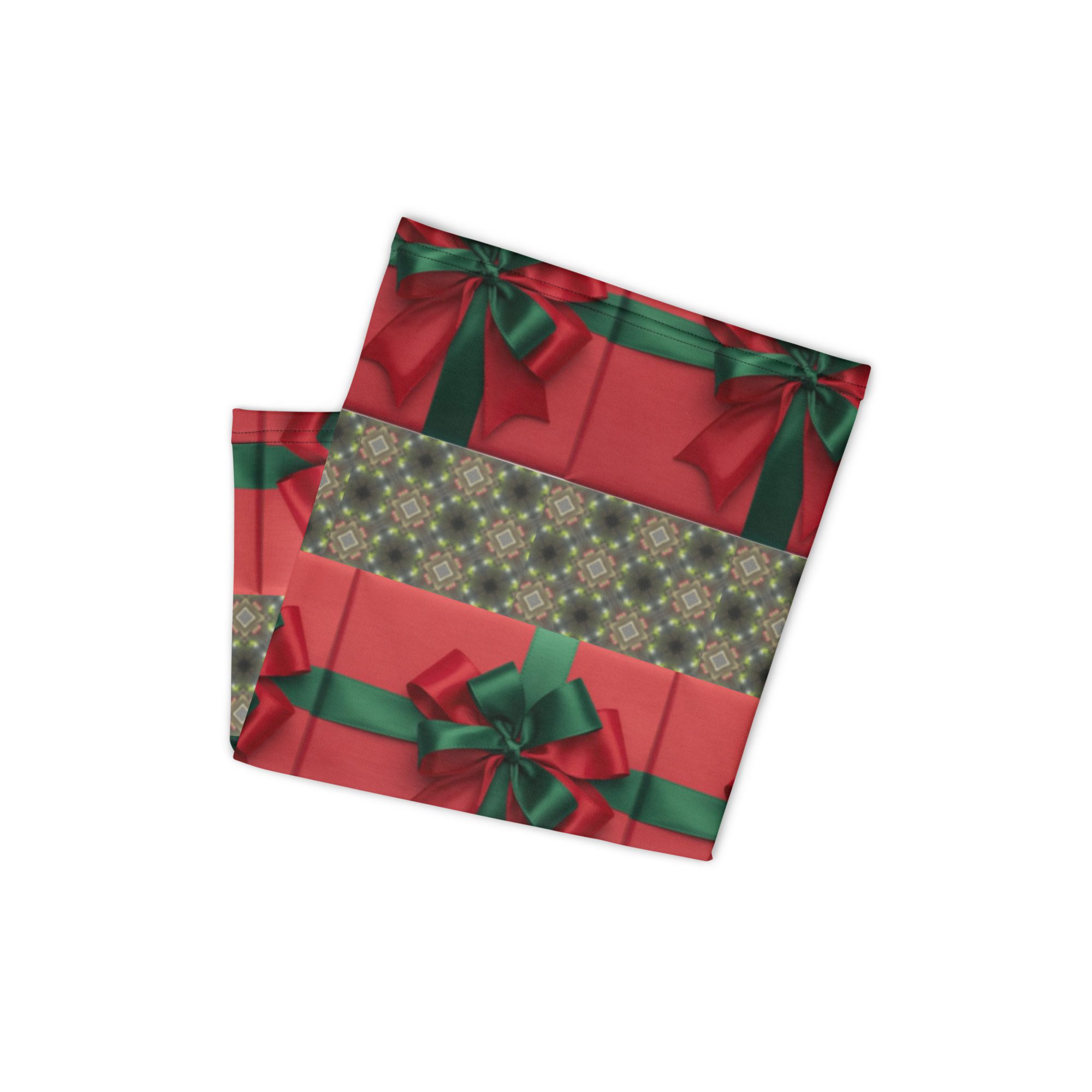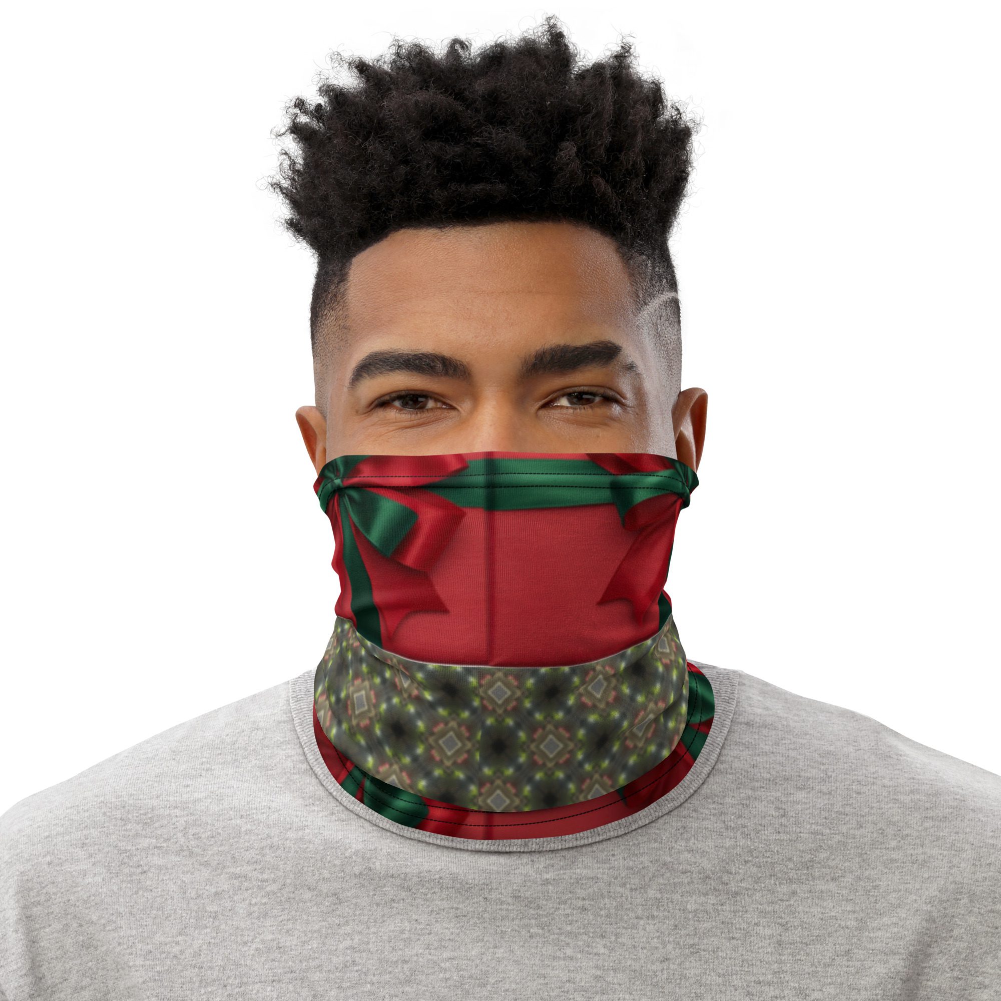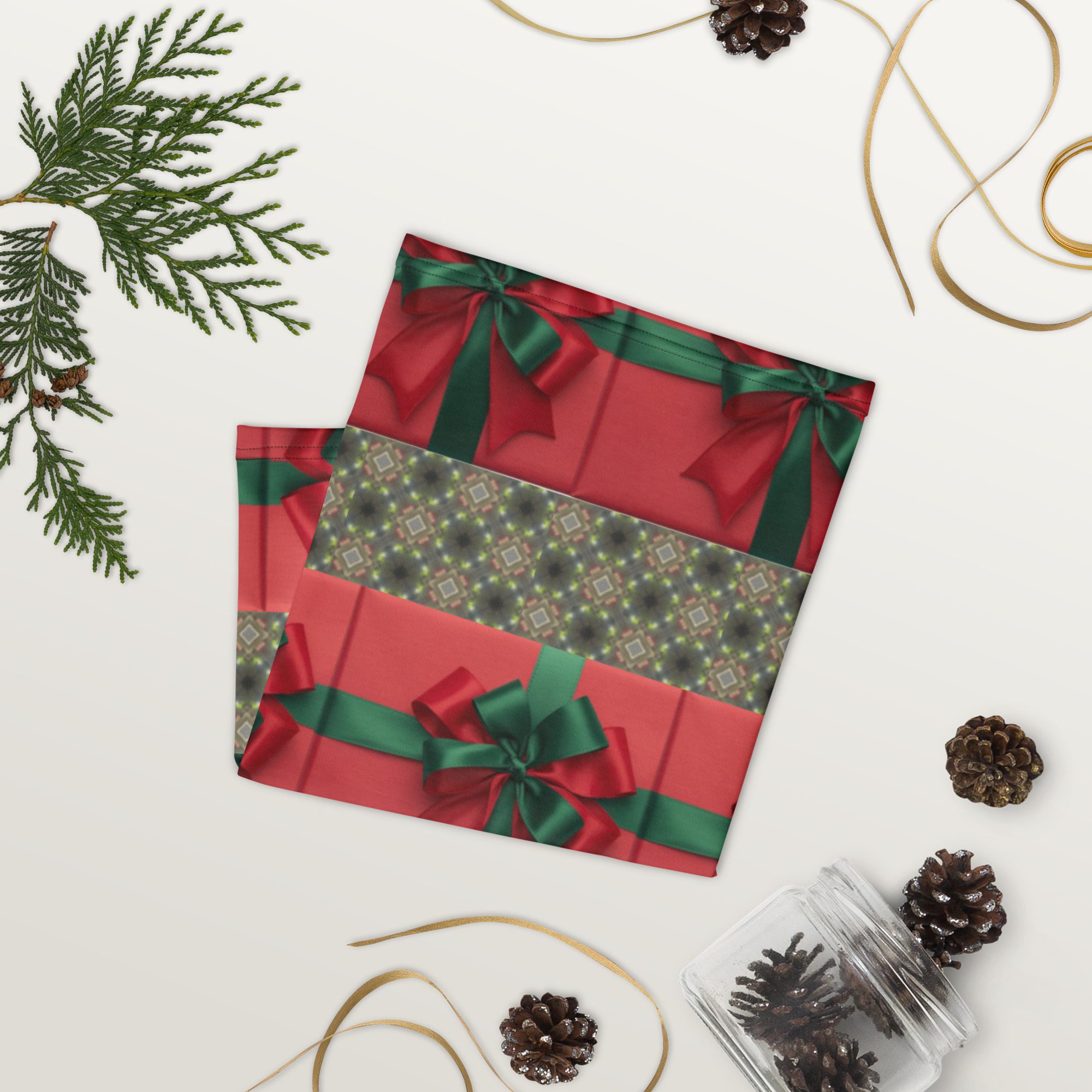 This stunning neck gaiter captures the charm of a beautifully wrapped present — bold red panels adorned with lush green bows and intricate geometric accents inspired by vintage holiday patterns. The result is a wearable expression of warmth, cheer, and sophistication that feels like the holidays themselves.