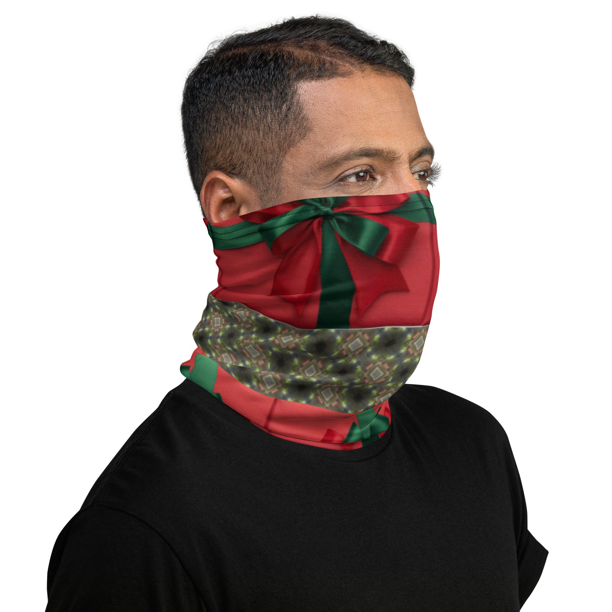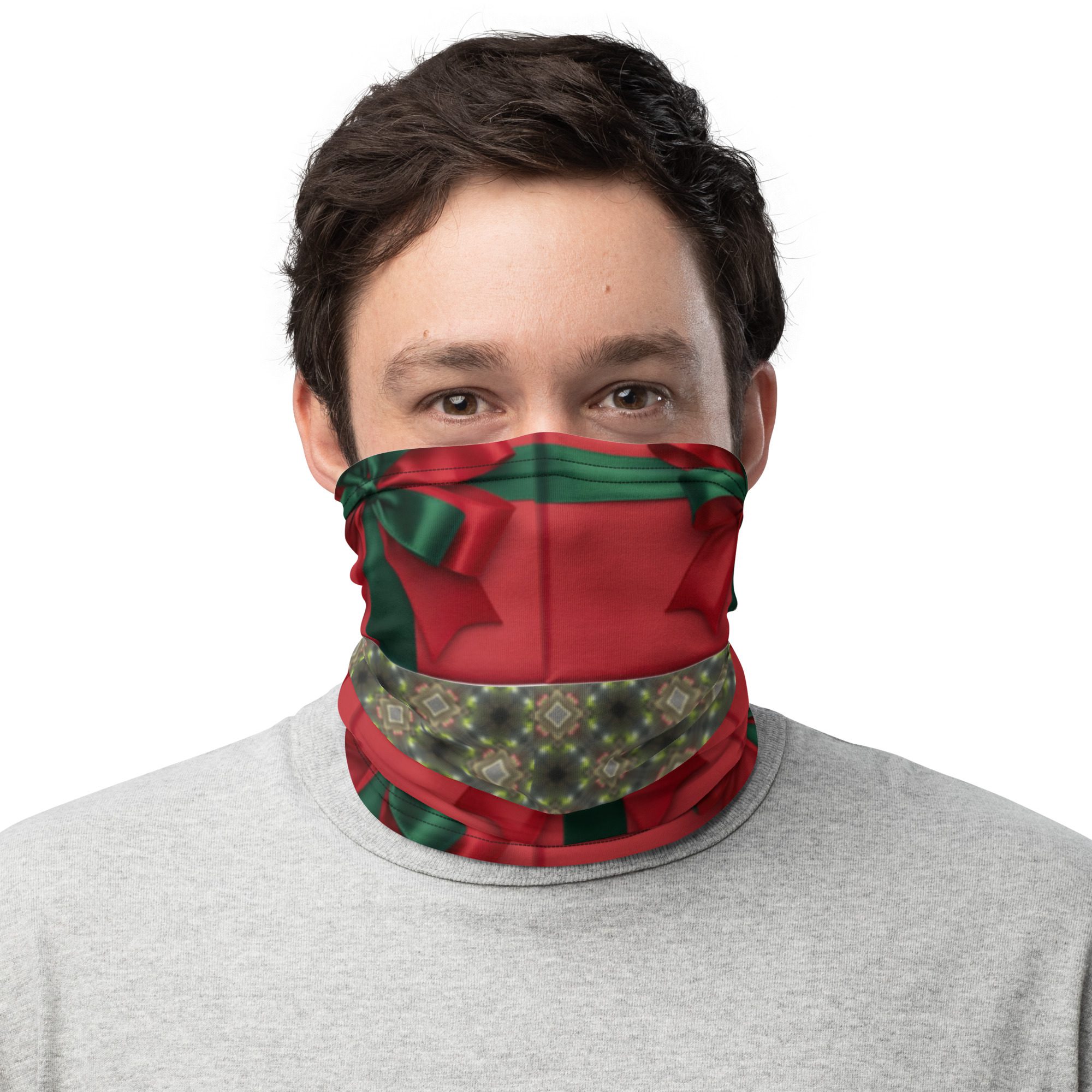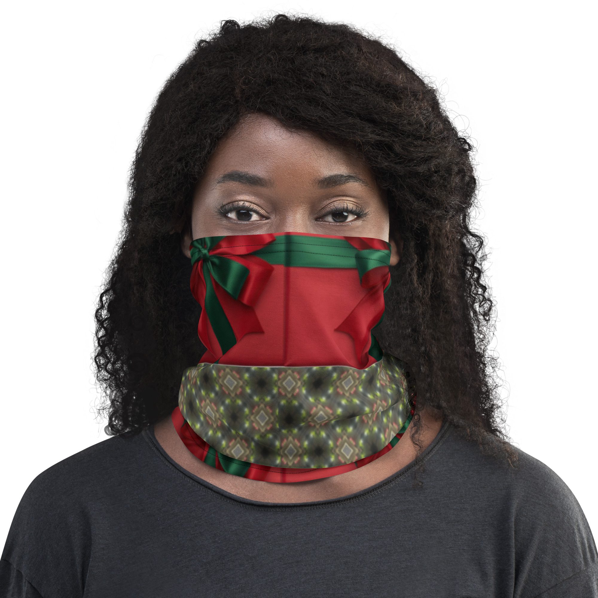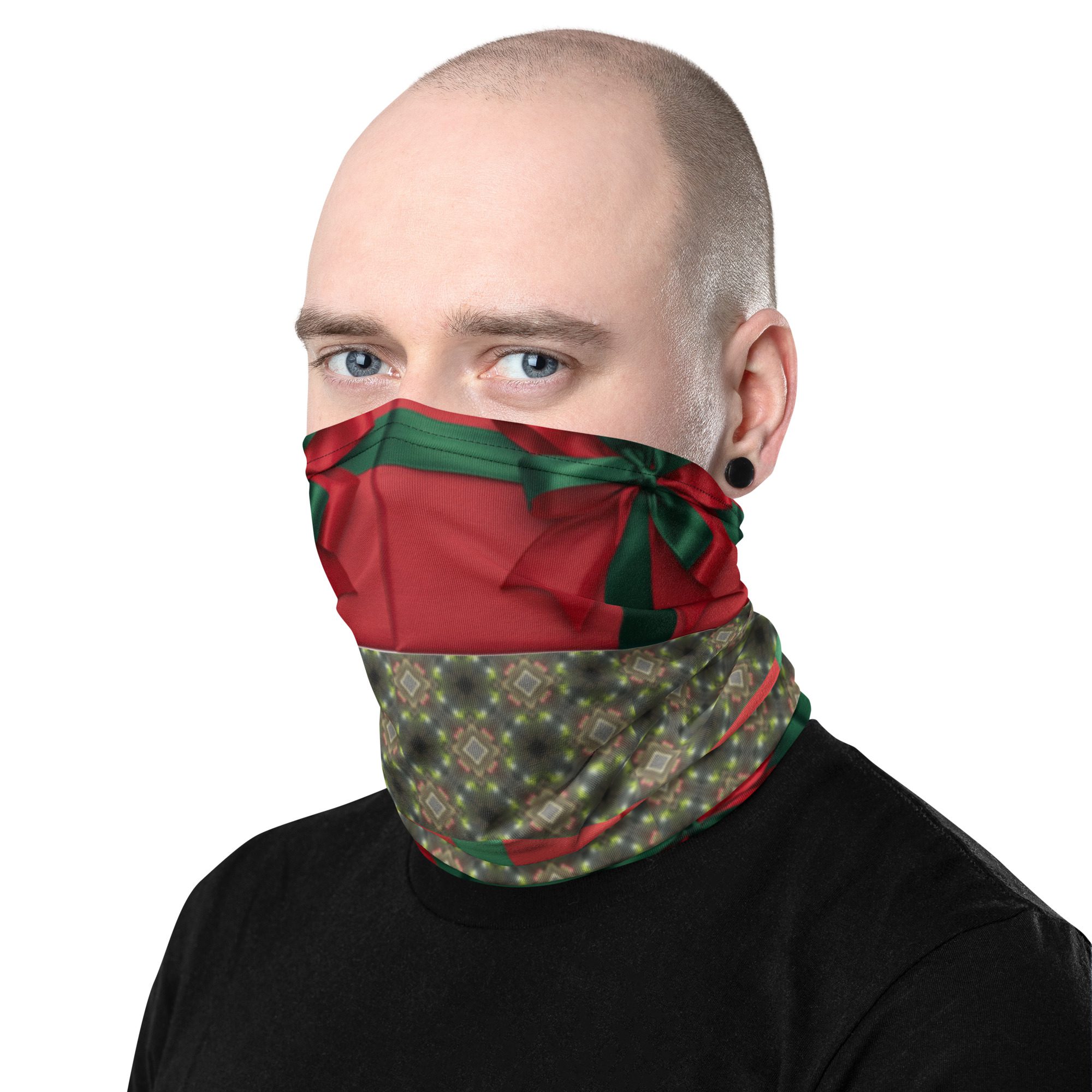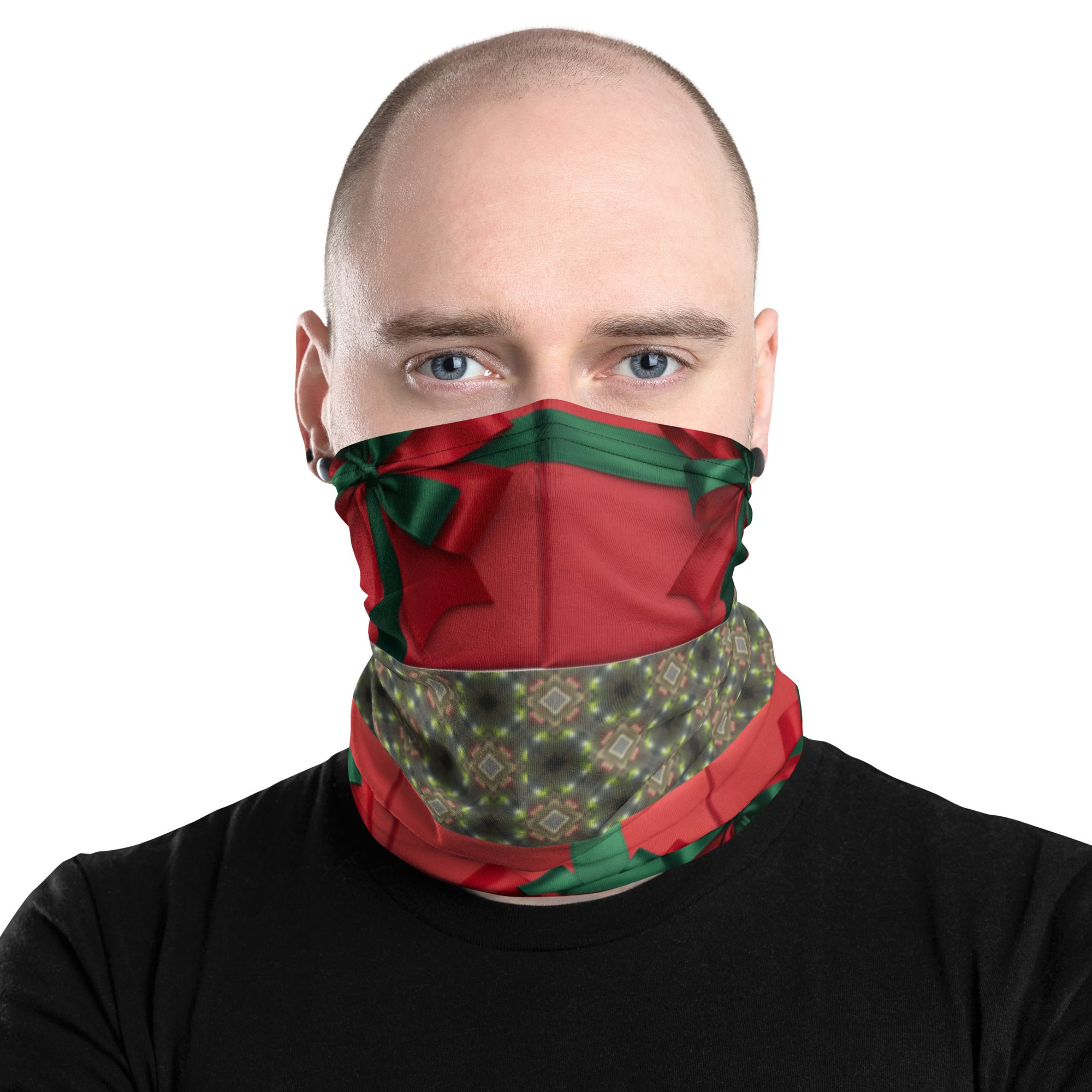 This stunning neck gaiter captures the charm of a beautifully wrapped present — bold red panels adorned with lush green bows and intricate geometric accents inspired by vintage holiday patterns. The result is a wearable expression of warmth, cheer, and sophistication that feels like the holidays themselves.
