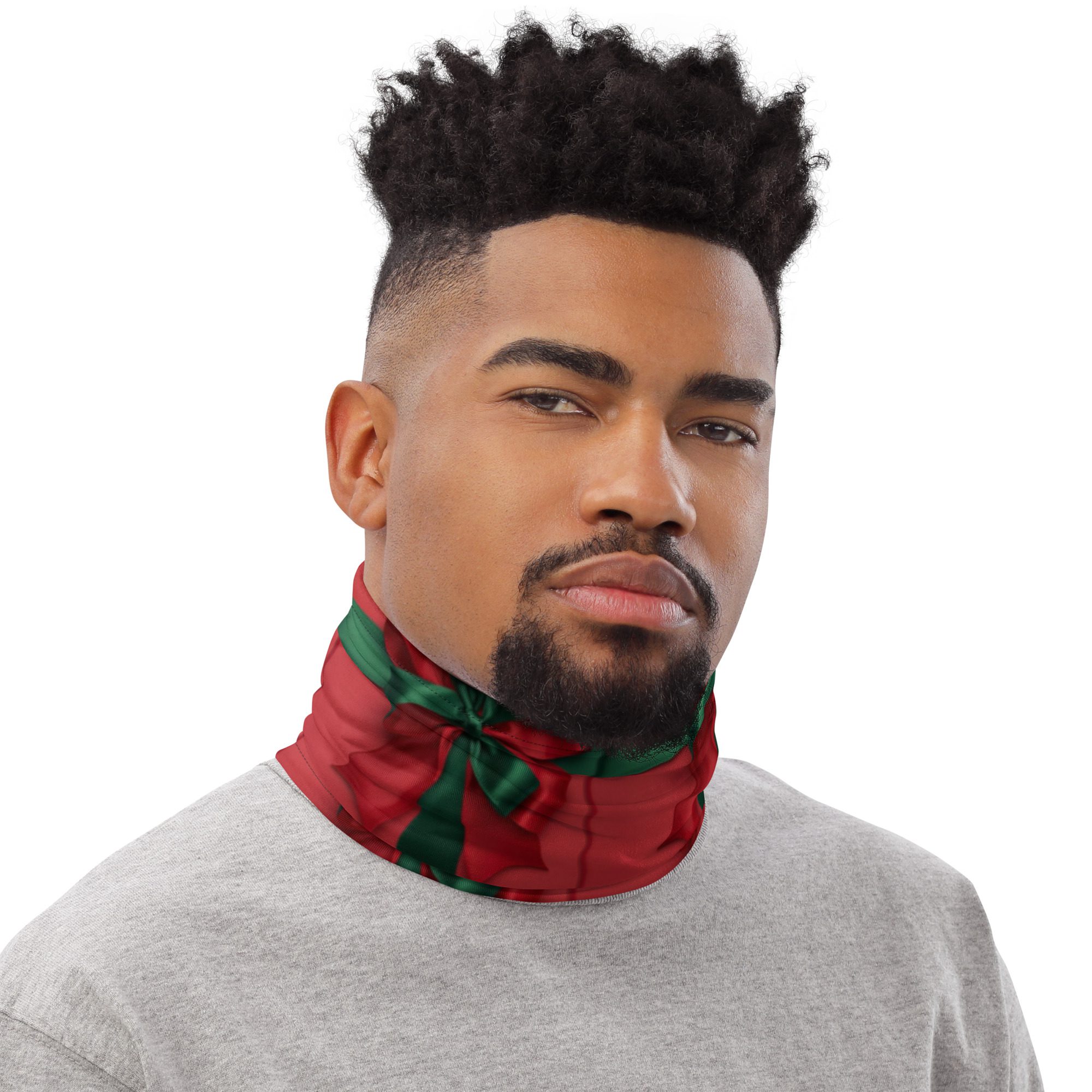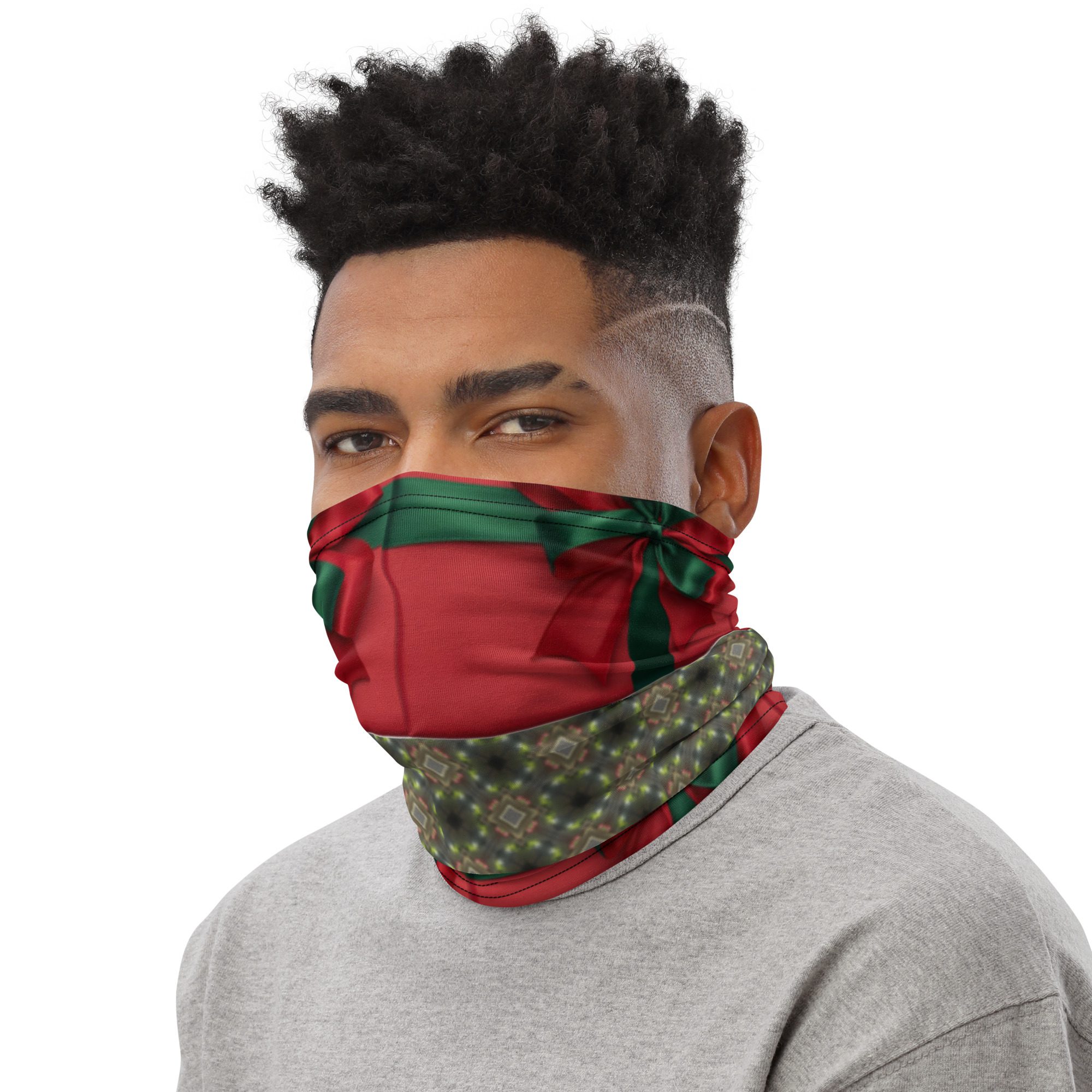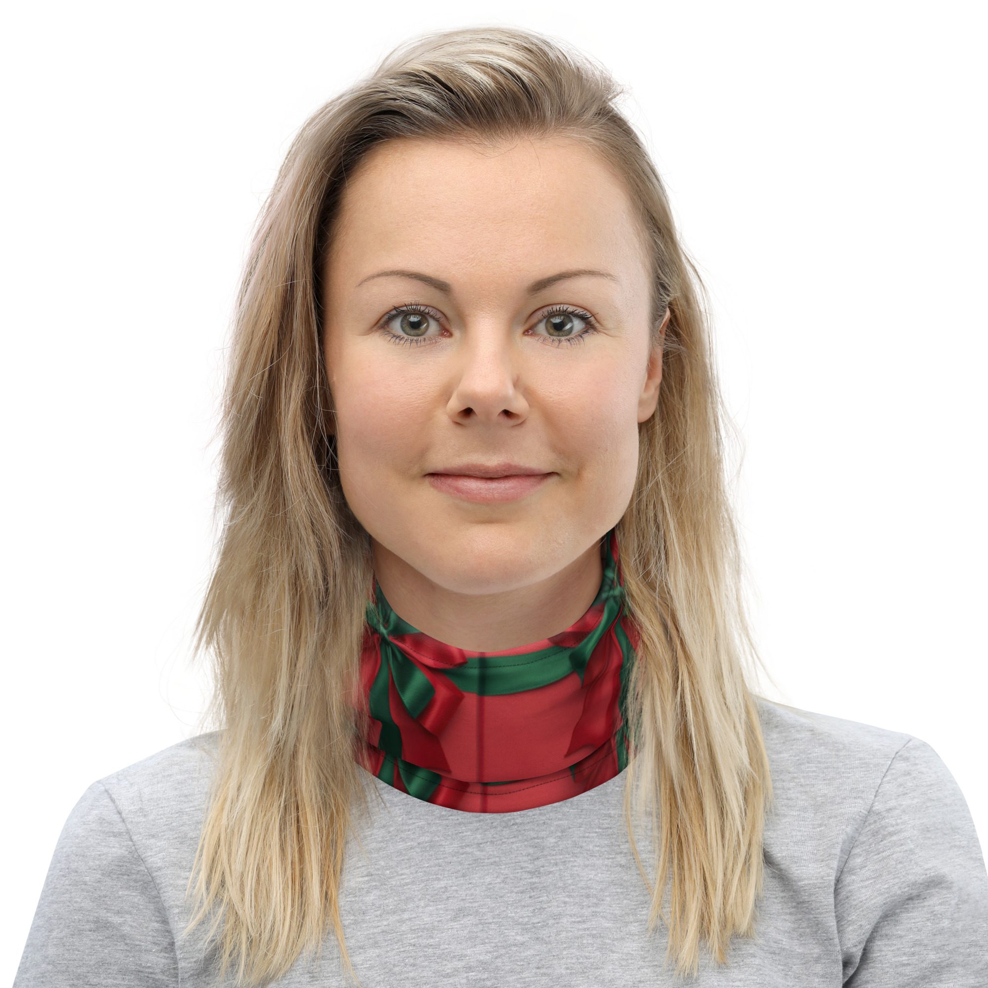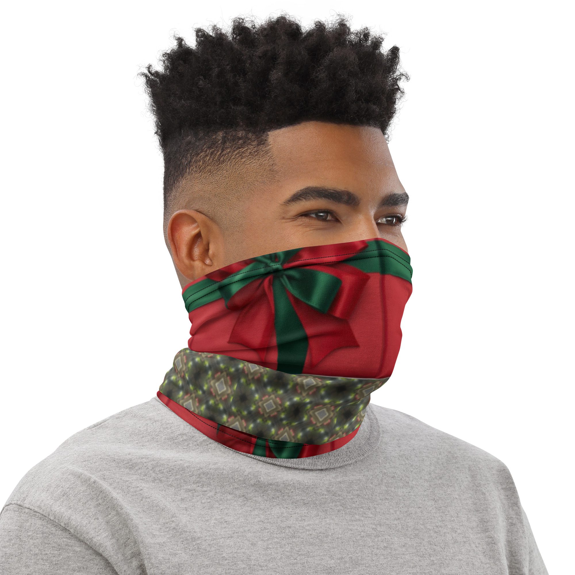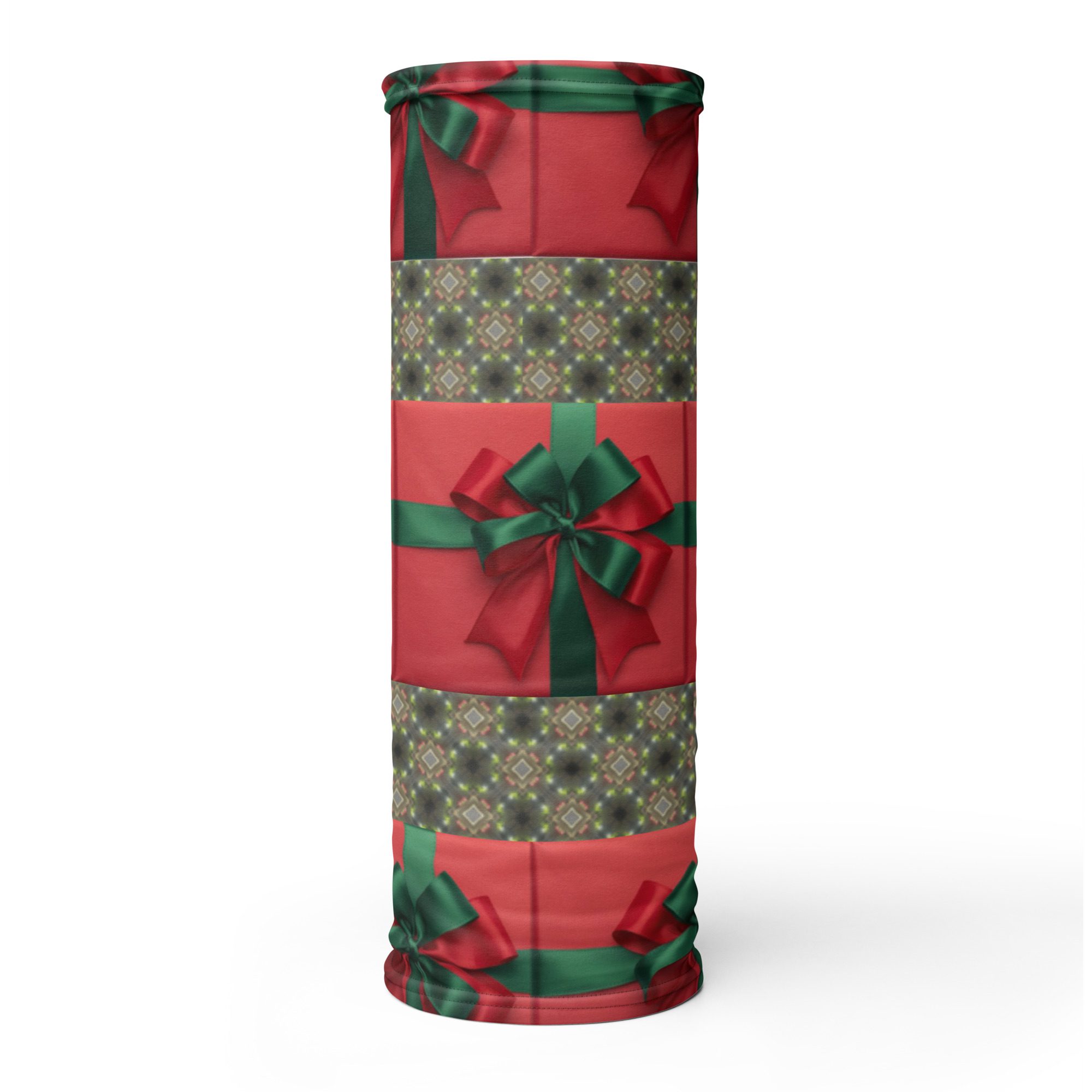 This stunning neck gaiter captures the charm of a beautifully wrapped present — bold red panels adorned with lush green bows and intricate geometric accents inspired by vintage holiday patterns. The result is a wearable expression of warmth, cheer, and sophistication that feels like the holidays themselves.