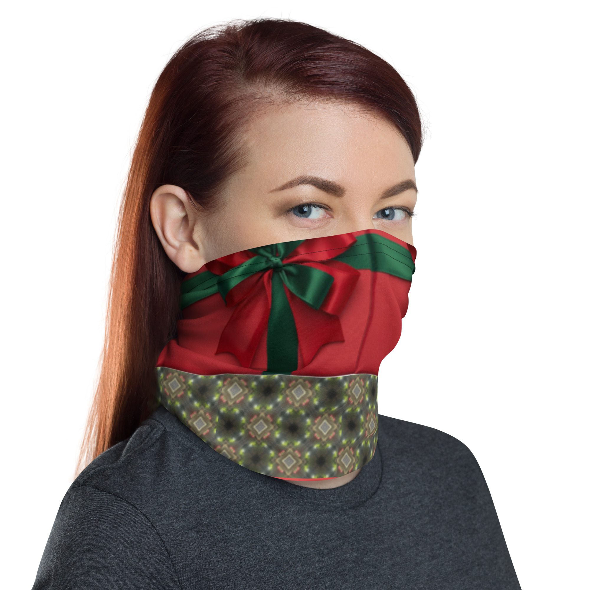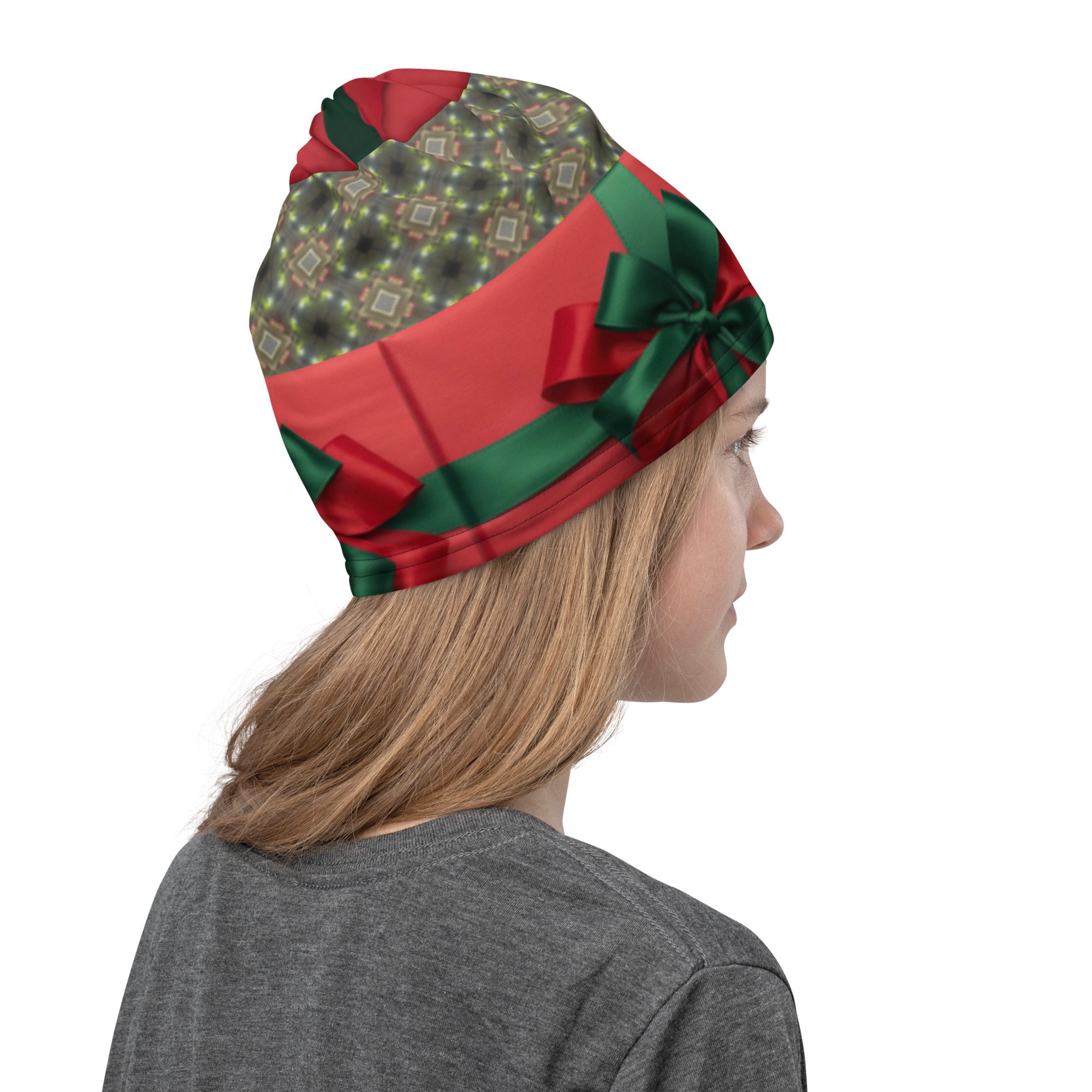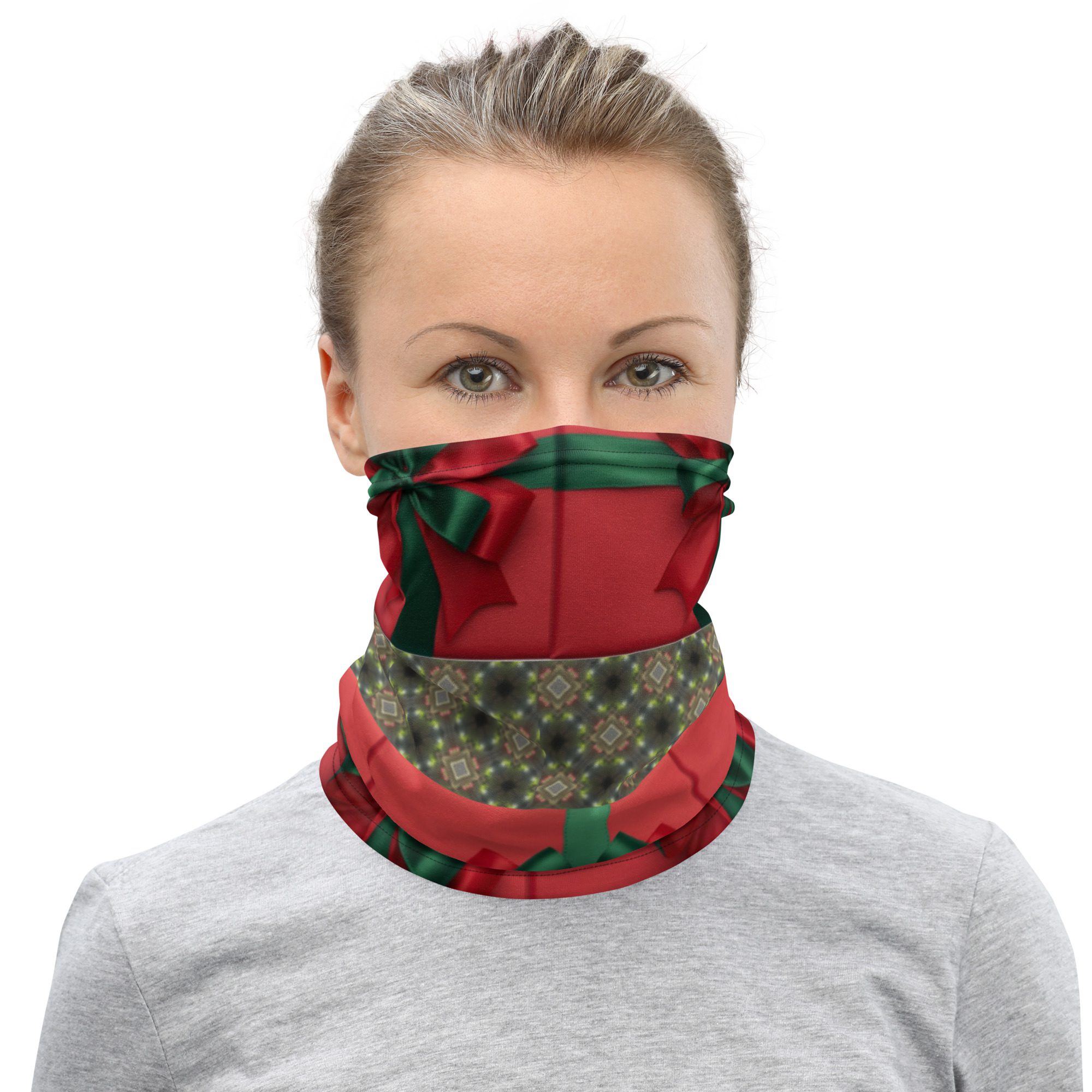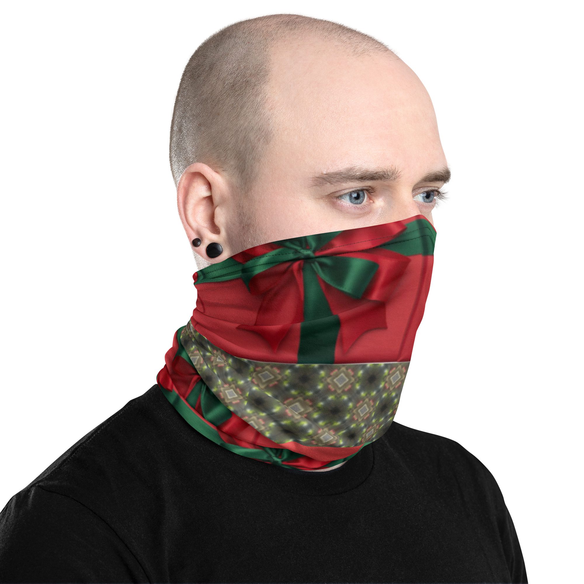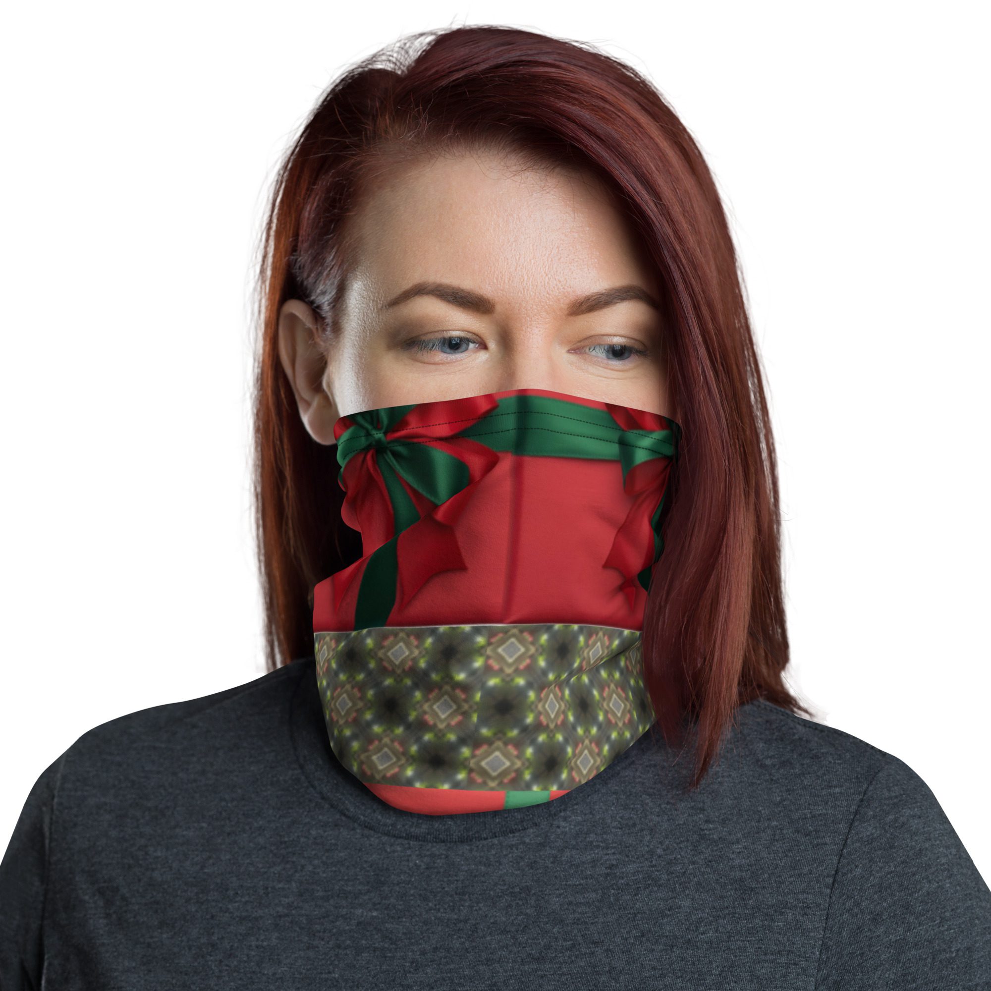 This stunning neck gaiter captures the charm of a beautifully wrapped present — bold red panels adorned with lush green bows and intricate geometric accents inspired by vintage holiday patterns. The result is a wearable expression of warmth, cheer, and sophistication that feels like the holidays themselves.