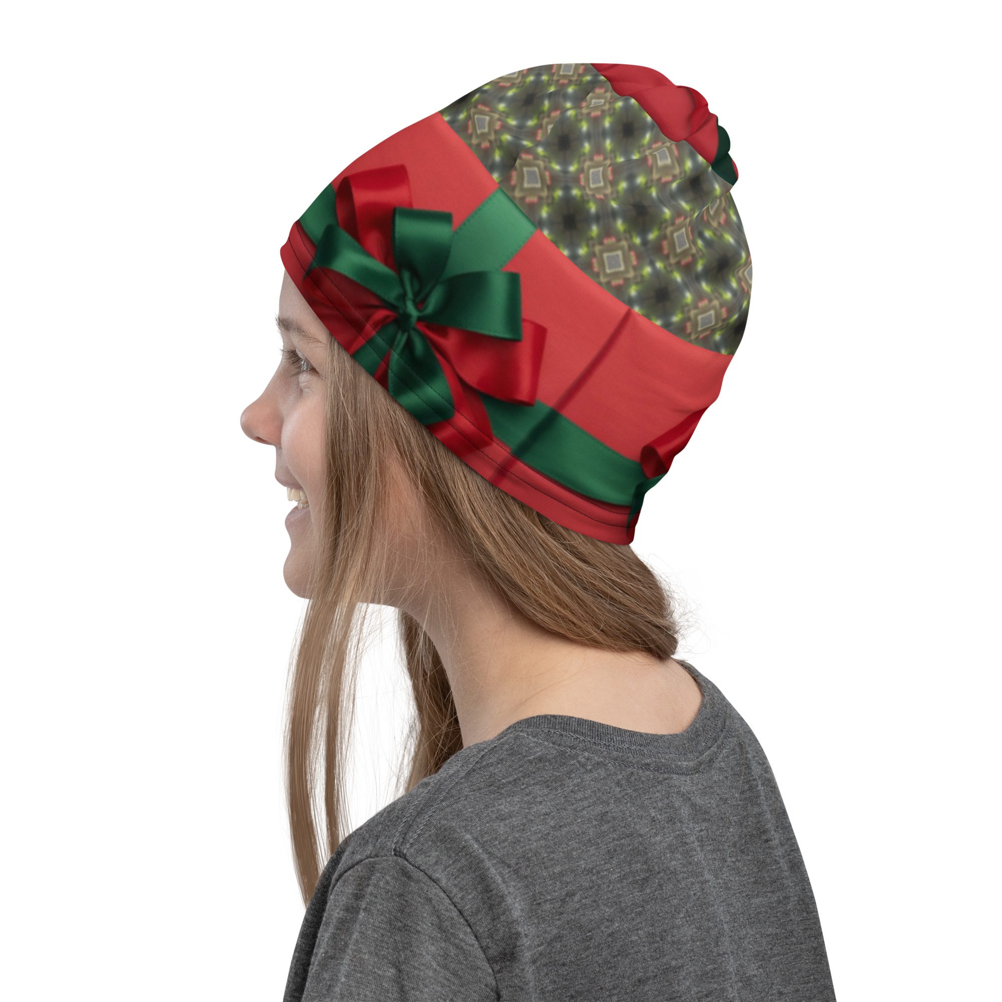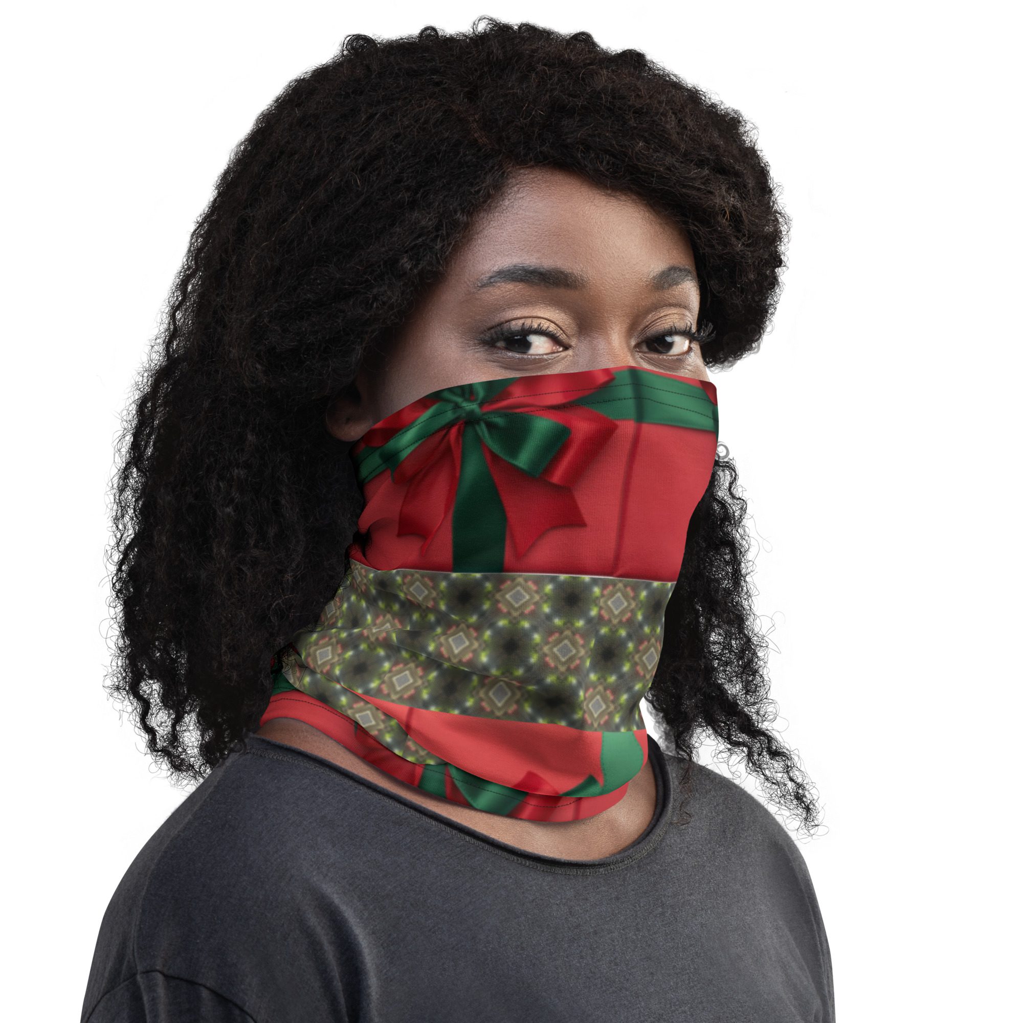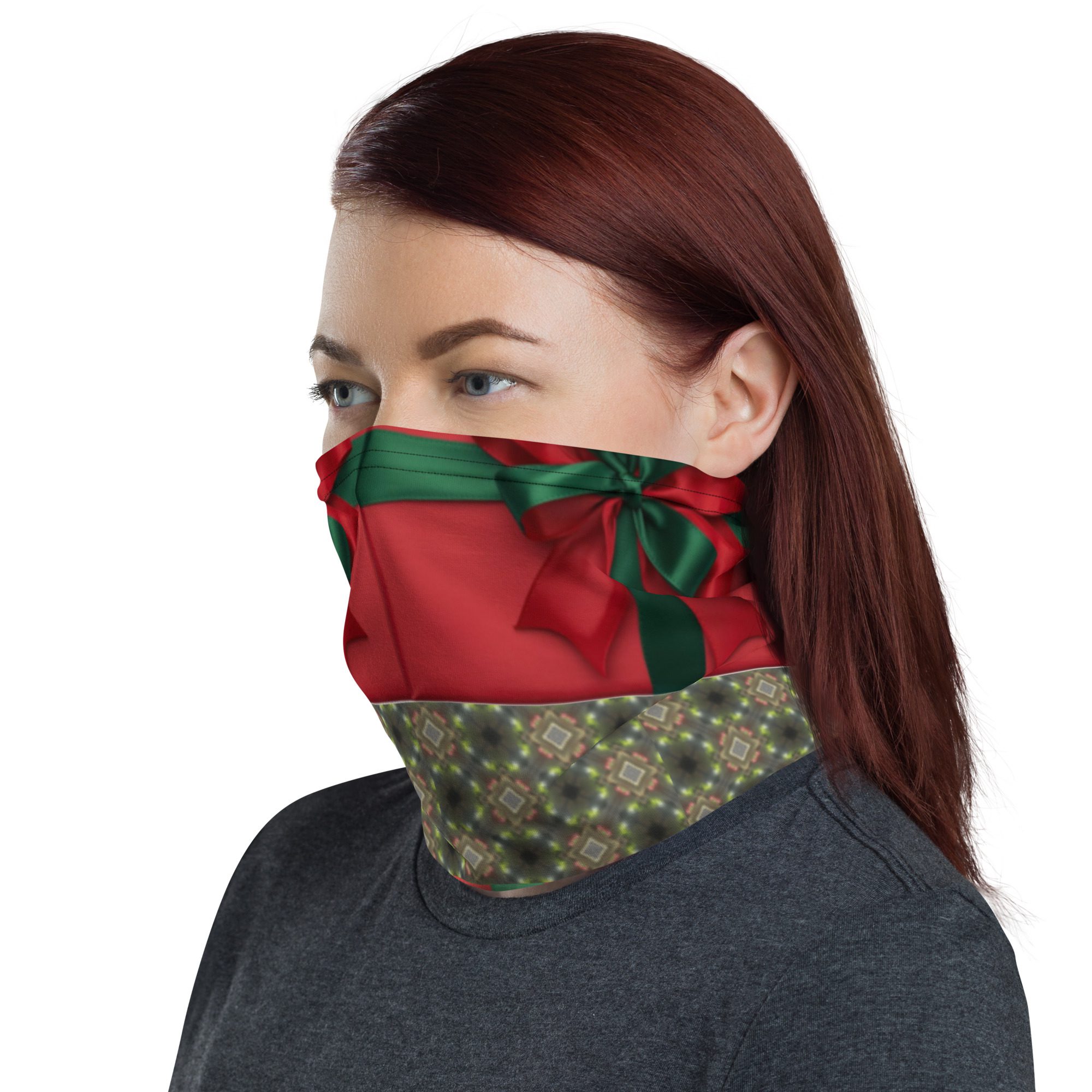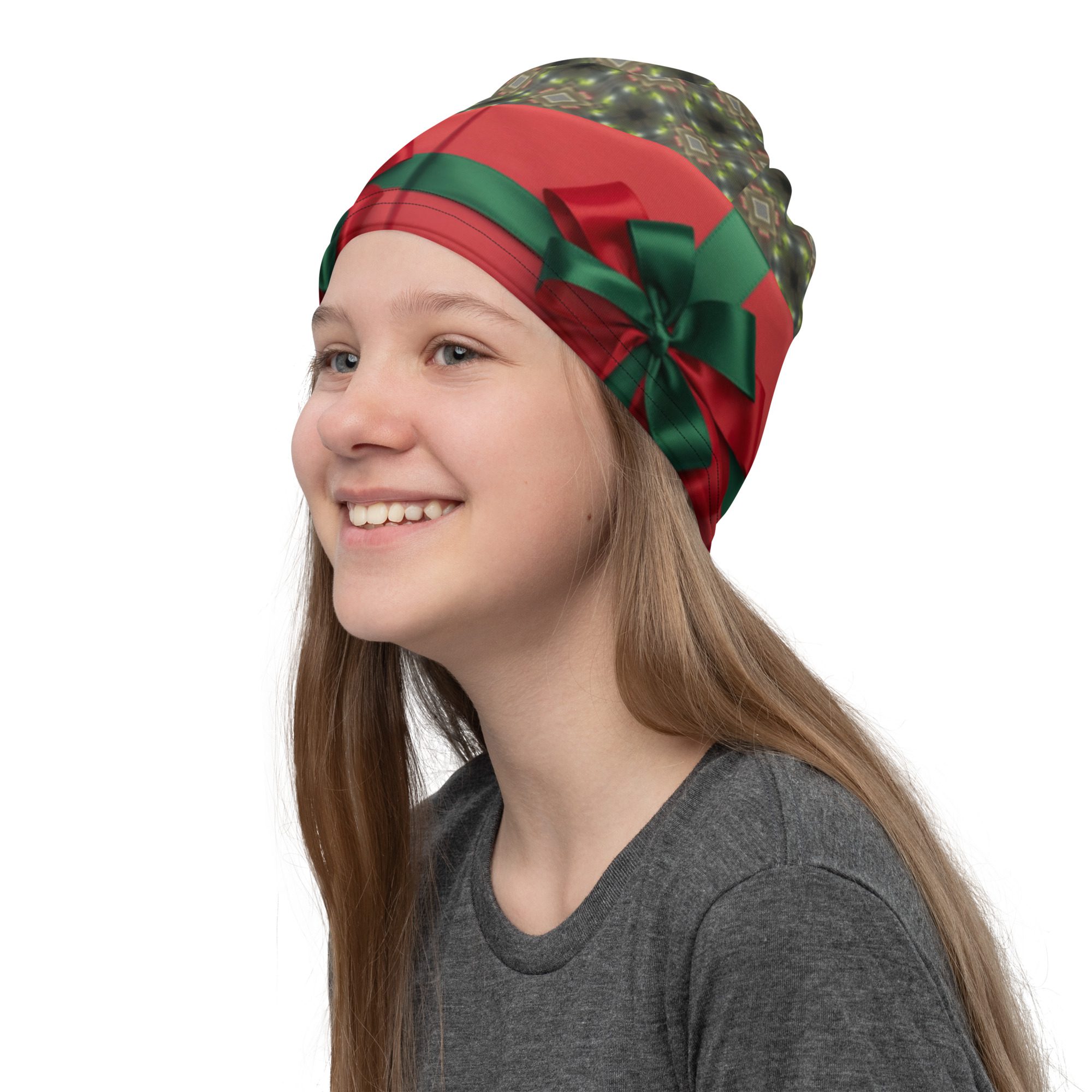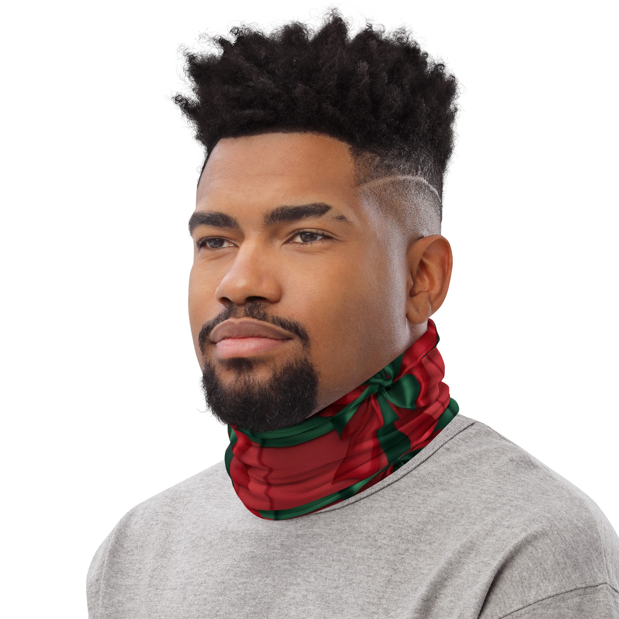 This stunning neck gaiter captures the charm of a beautifully wrapped present — bold red panels adorned with lush green bows and intricate geometric accents inspired by vintage holiday patterns. The result is a wearable expression of warmth, cheer, and sophistication that feels like the holidays themselves.