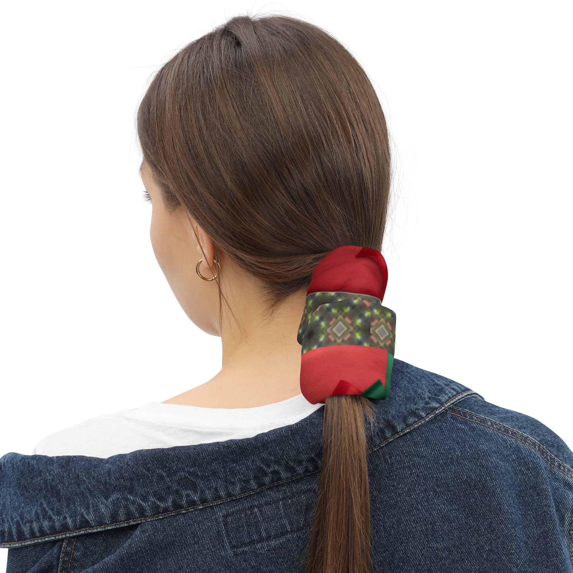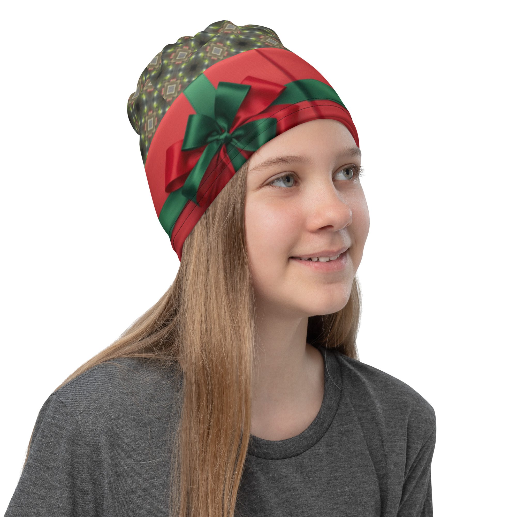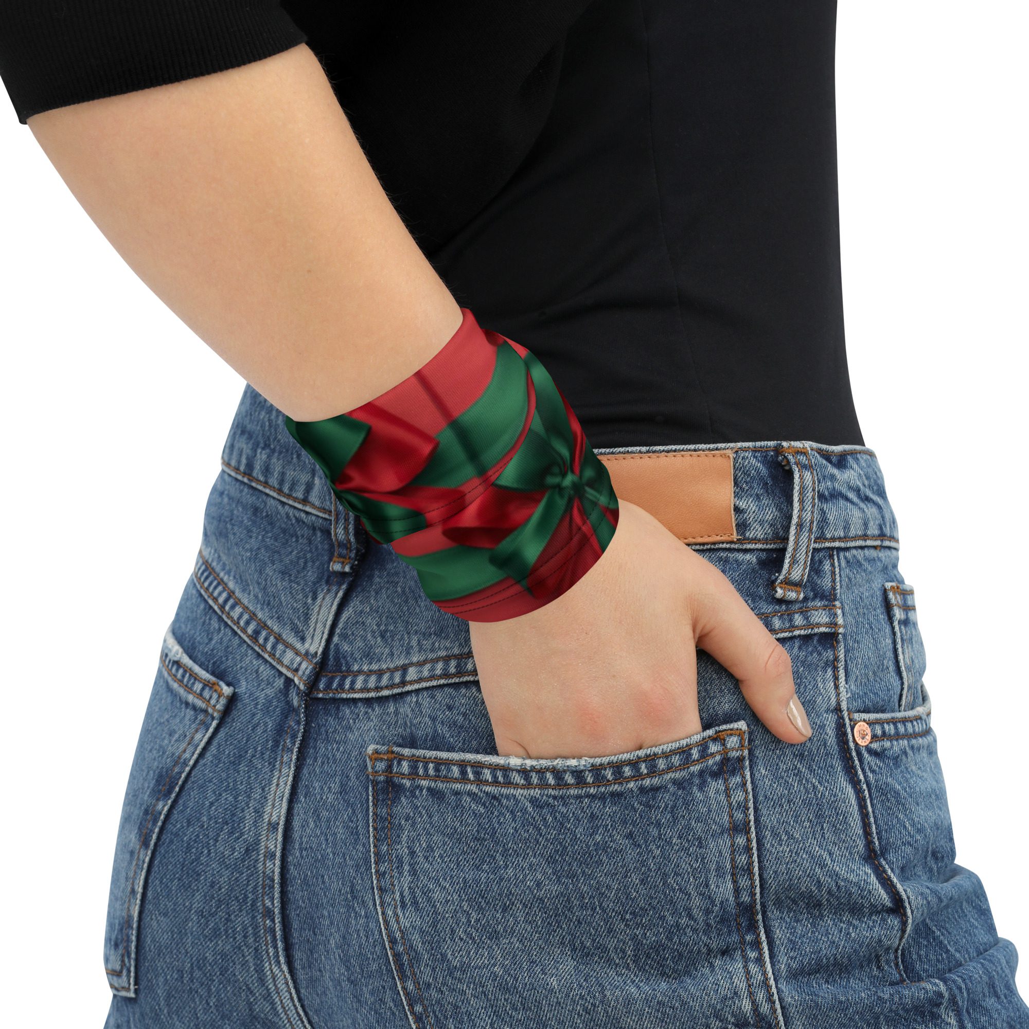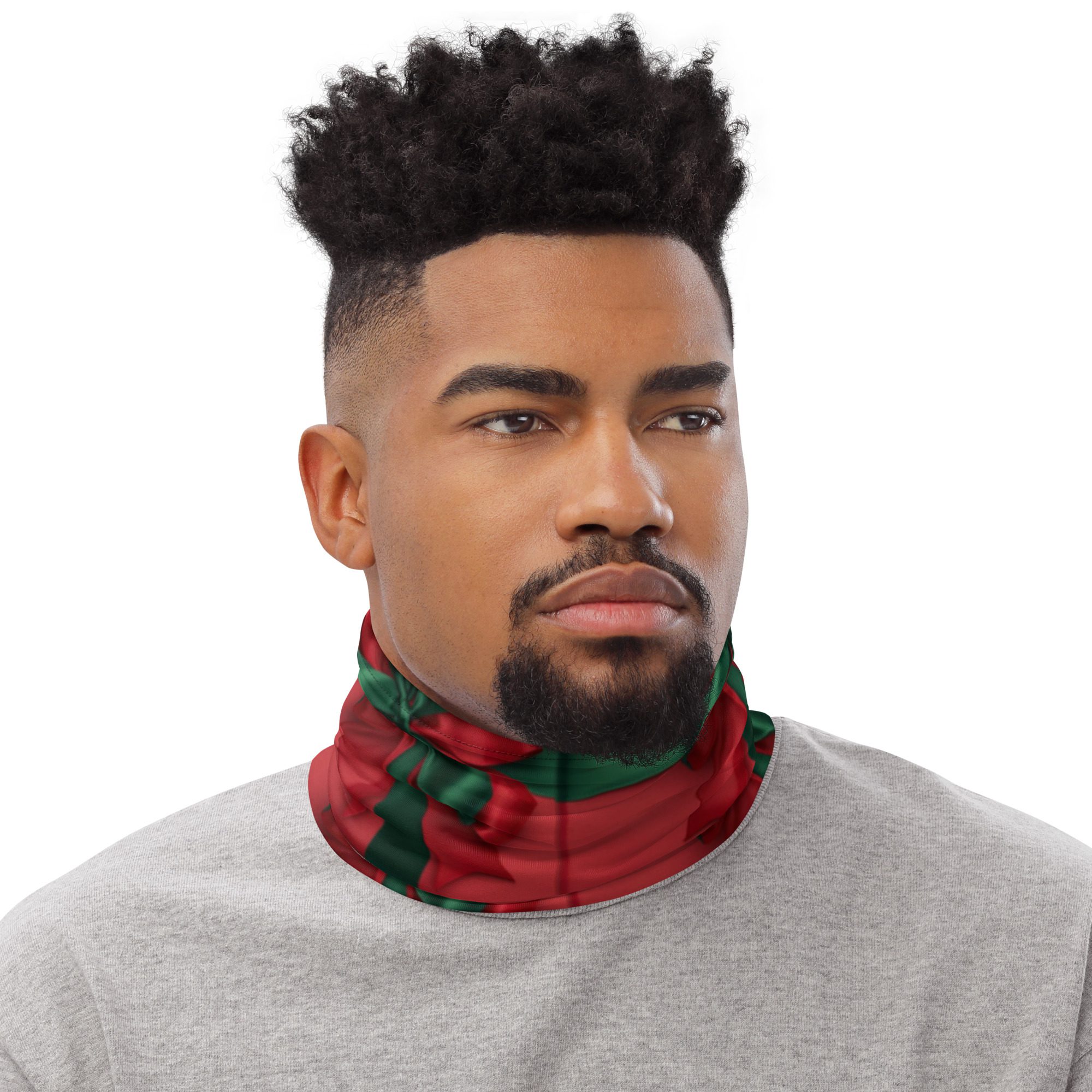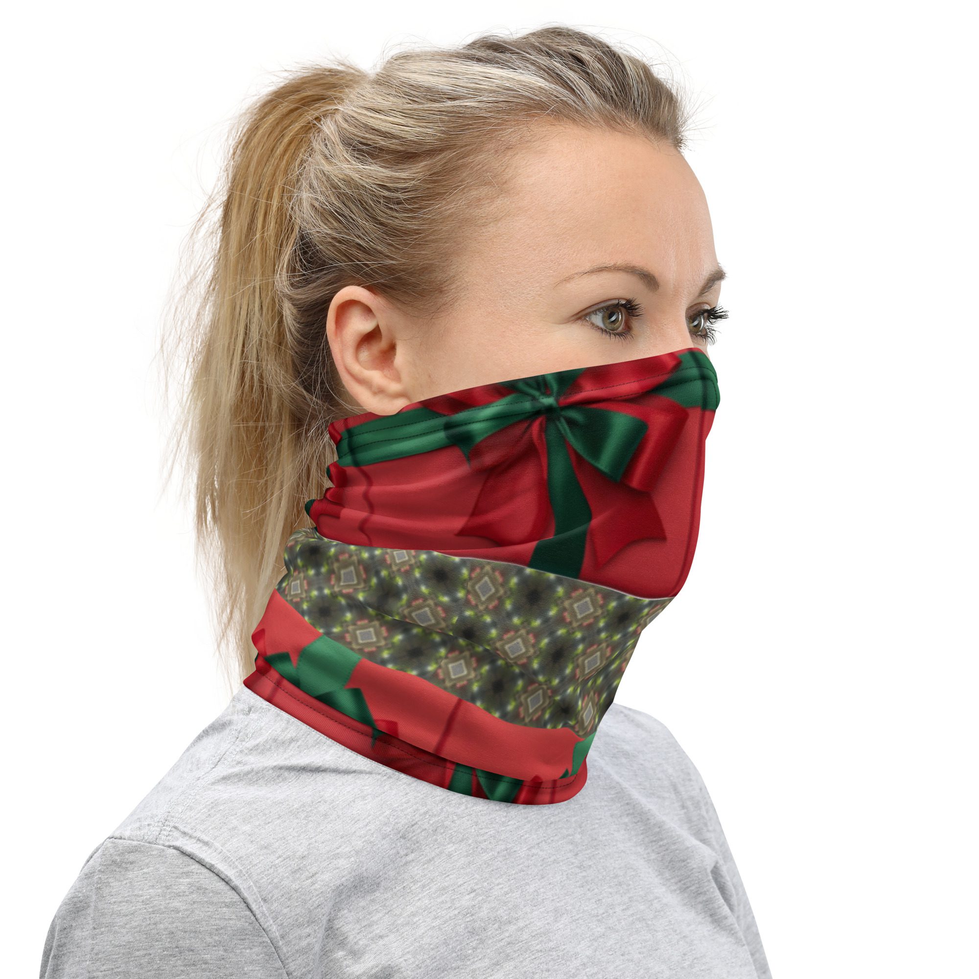 This stunning neck gaiter captures the charm of a beautifully wrapped present — bold red panels adorned with lush green bows and intricate geometric accents inspired by vintage holiday patterns. The result is a wearable expression of warmth, cheer, and sophistication that feels like the holidays themselves.