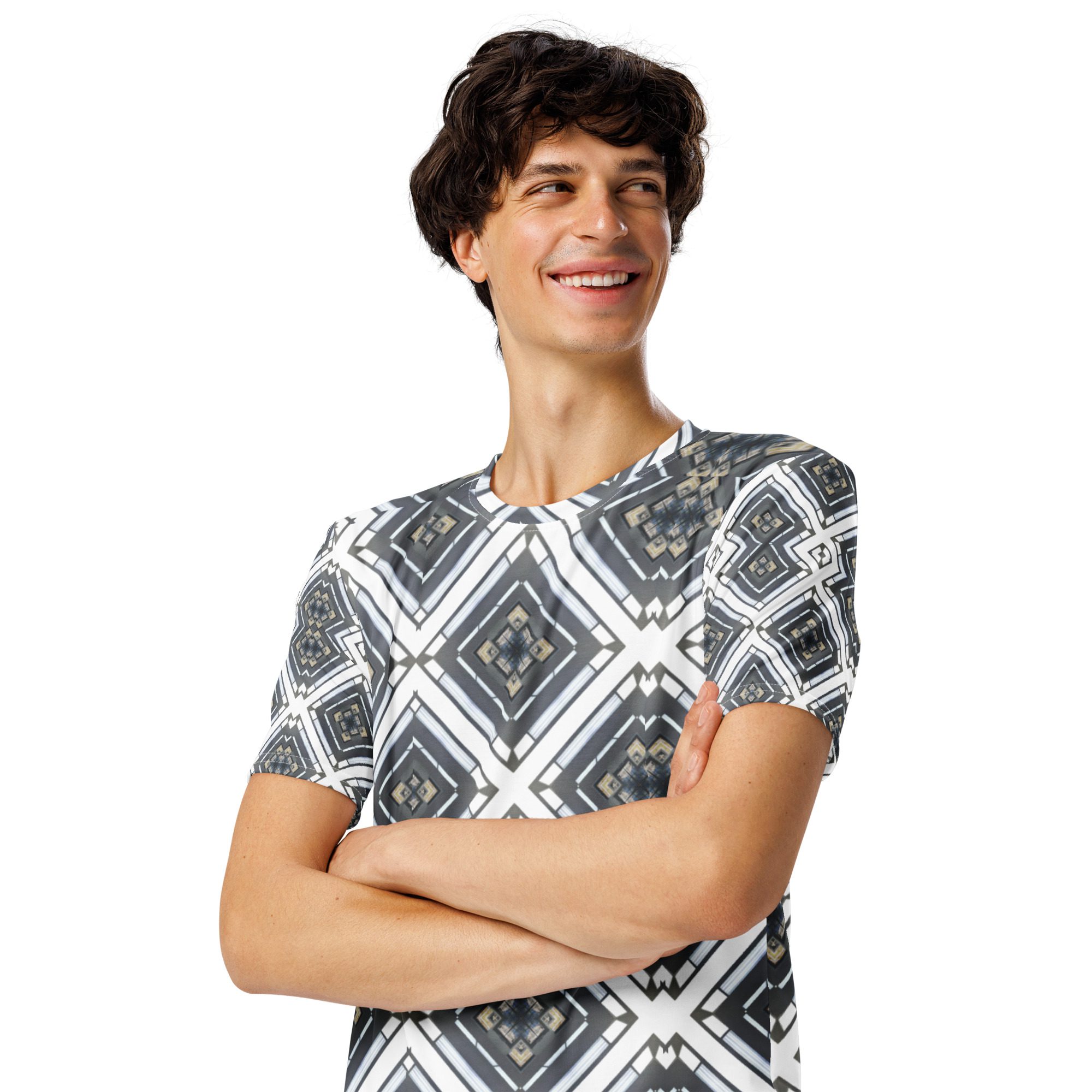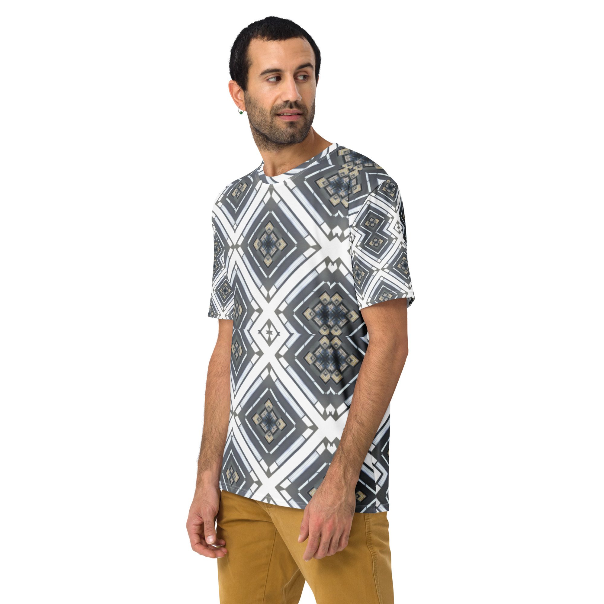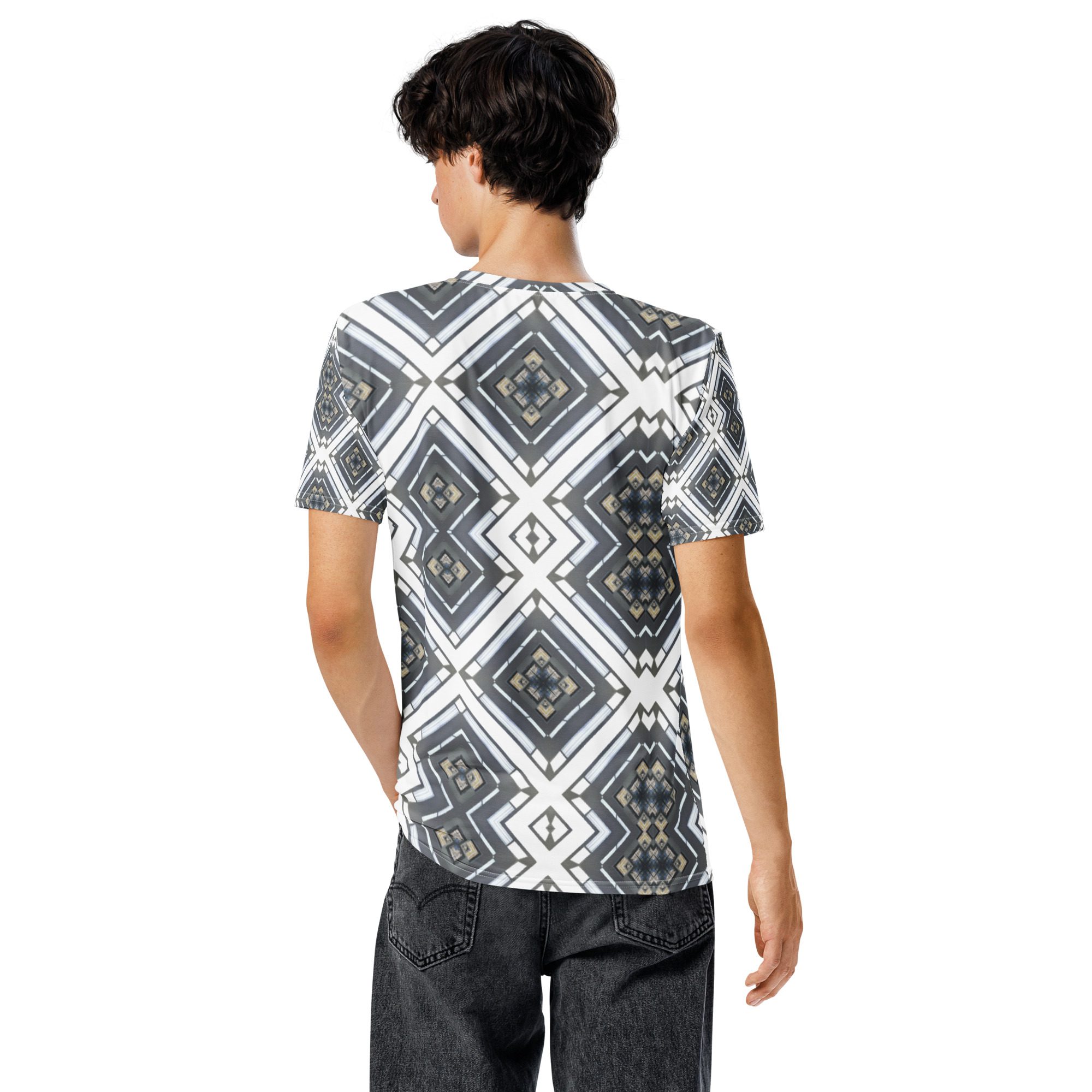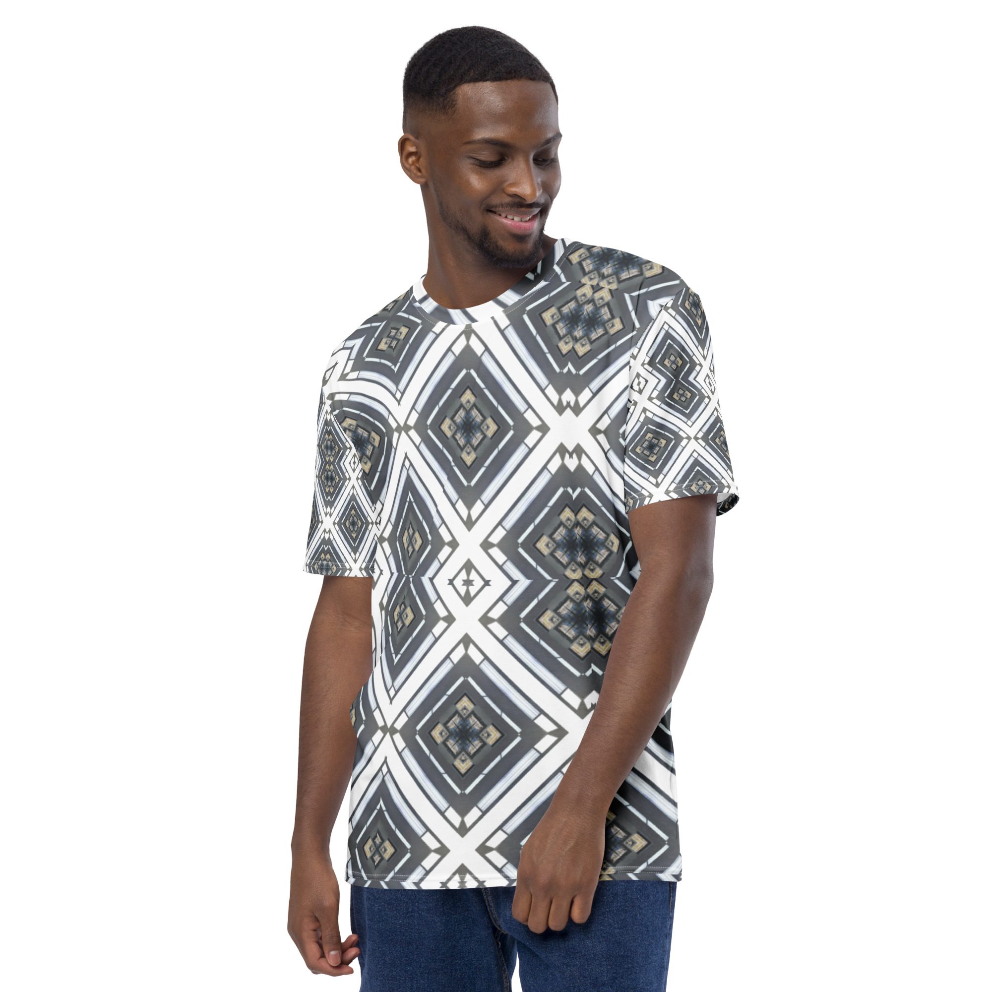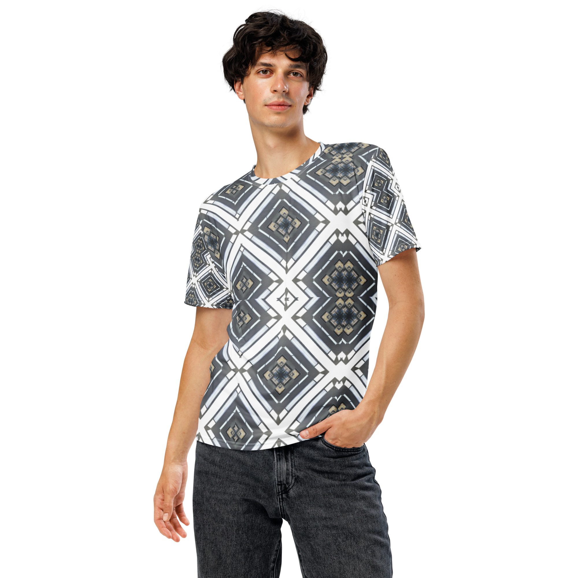 Sharp lines meet subtle rhythm in Industrial Echo, an original design by Jaysen Mansfield. This all-over print T-shirt blends grayscale tones and geometric precision into a statement piece that feels both bold and balanced. Inspired by architecture and soundwave symmetry, the pattern gives a modern edge that pairs easily with jeans, joggers, or layered looks.