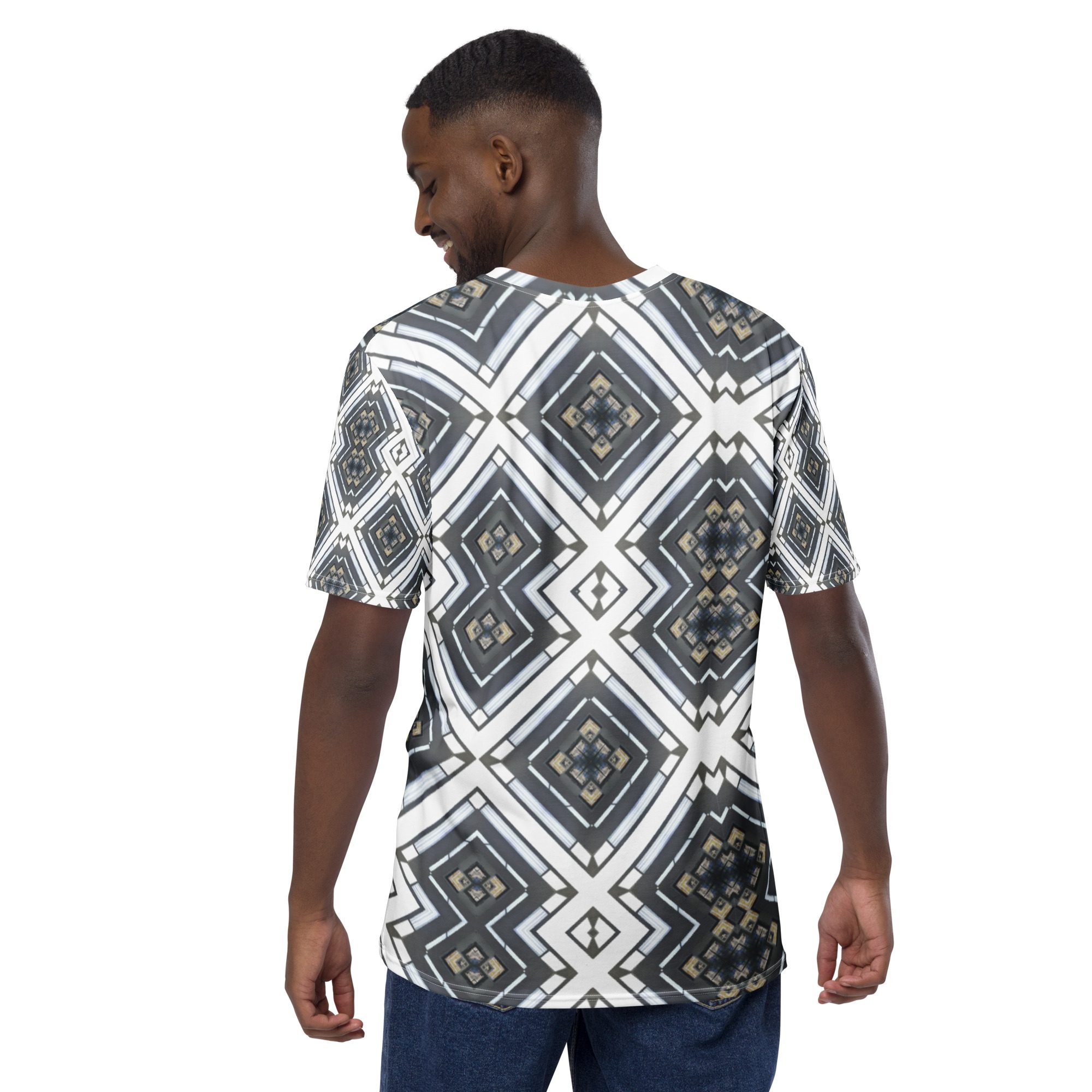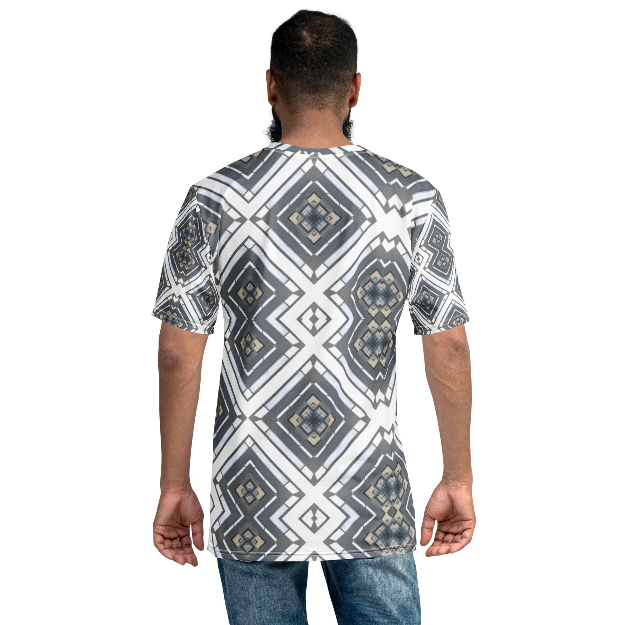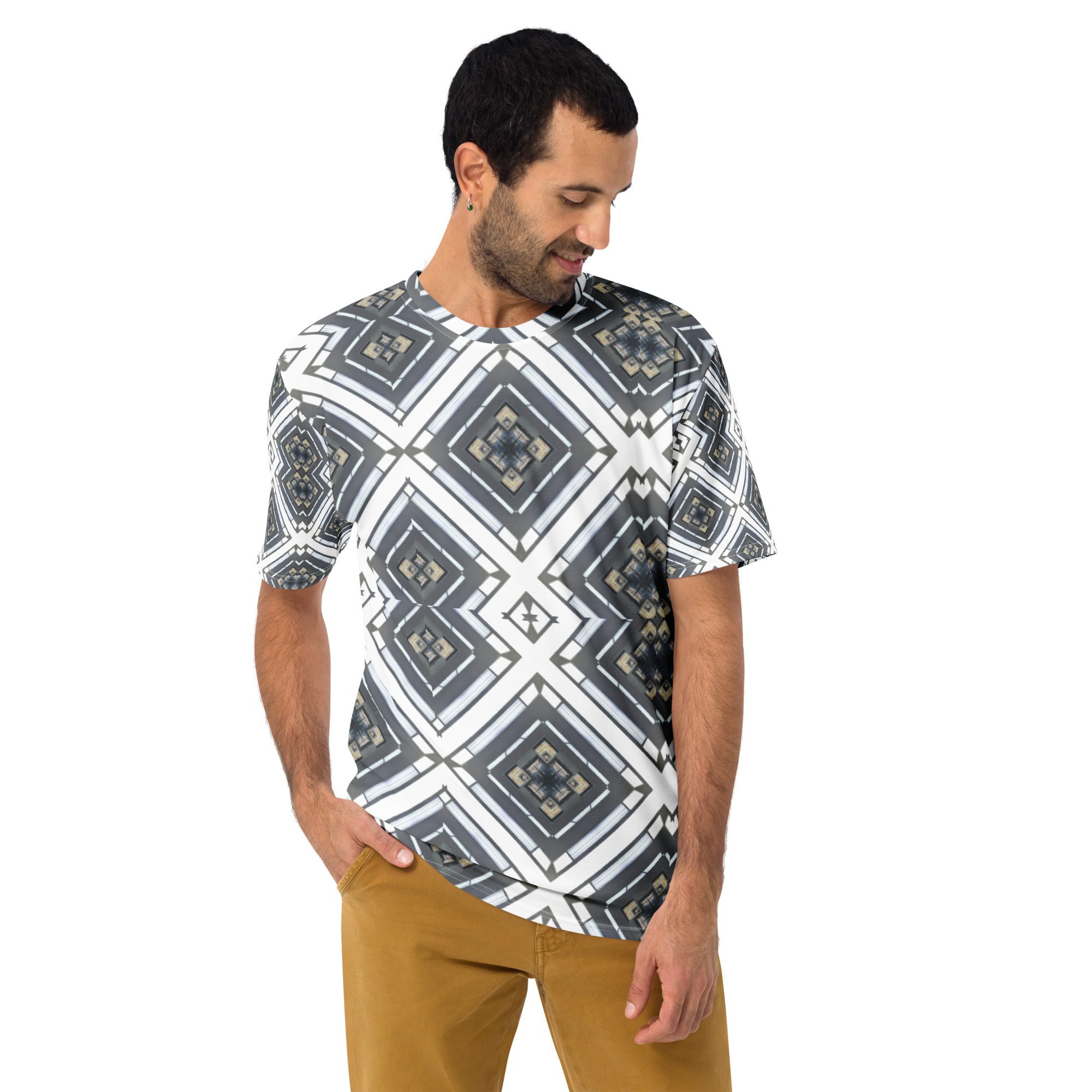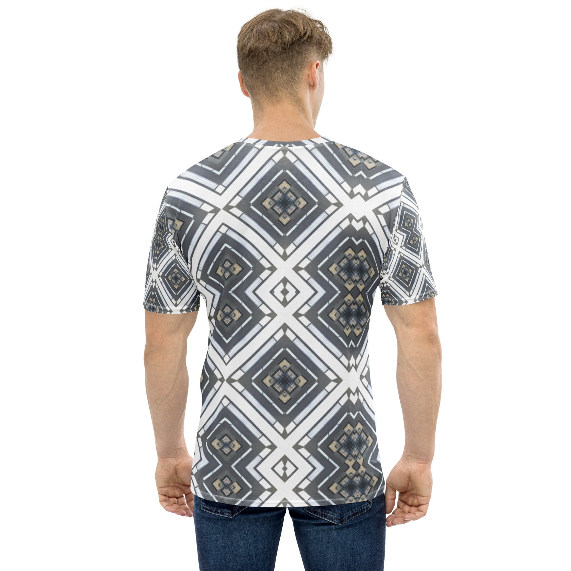 Sharp lines meet subtle rhythm in Industrial Echo, an original design by Jaysen Mansfield. This all-over print T-shirt blends grayscale tones and geometric precision into a statement piece that feels both bold and balanced. Inspired by architecture and soundwave symmetry, the pattern gives a modern edge that pairs easily with jeans, joggers, or layered looks.