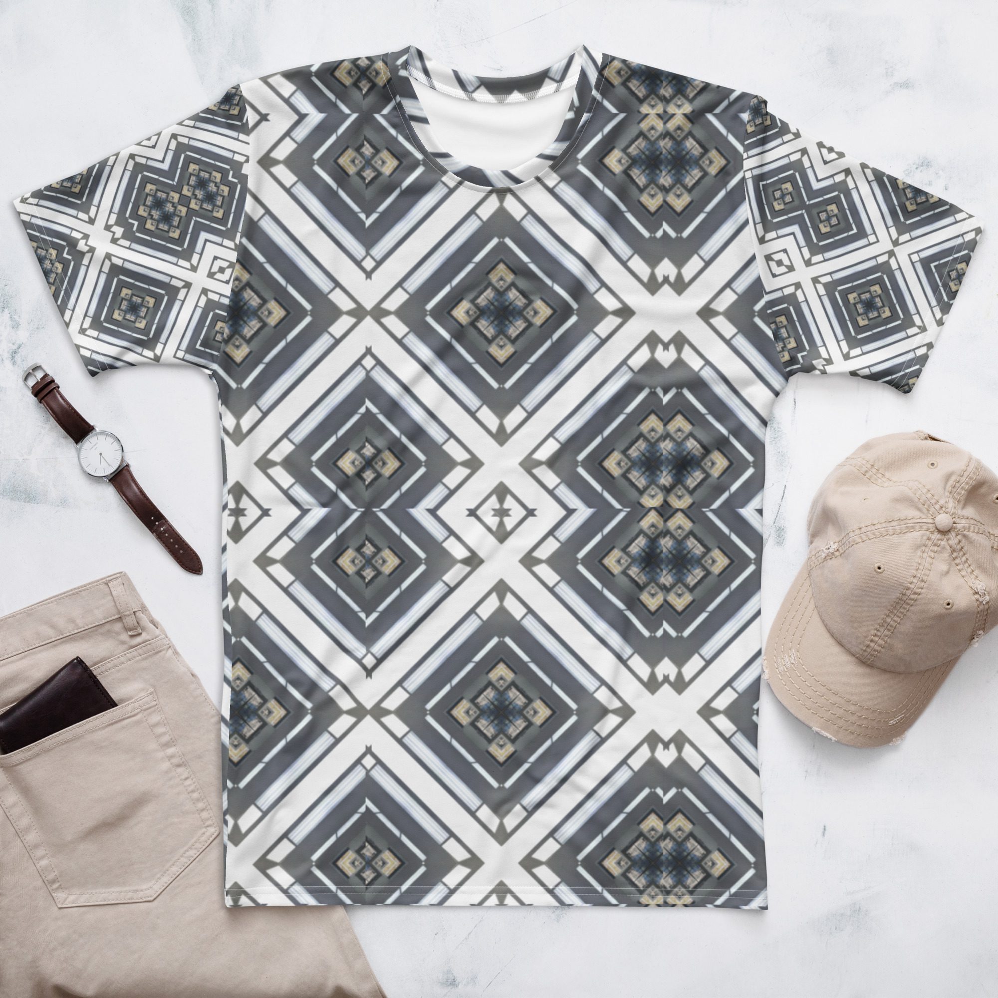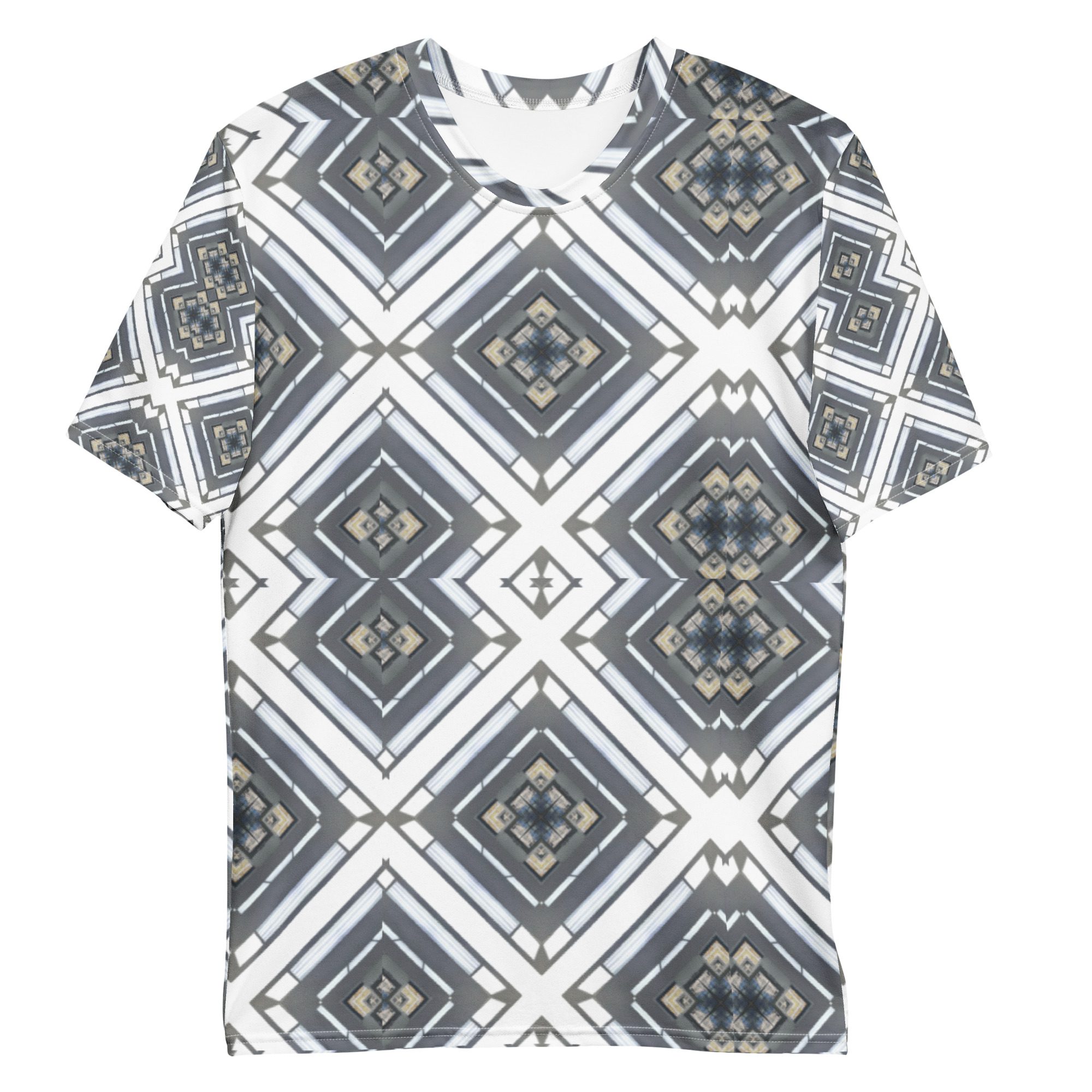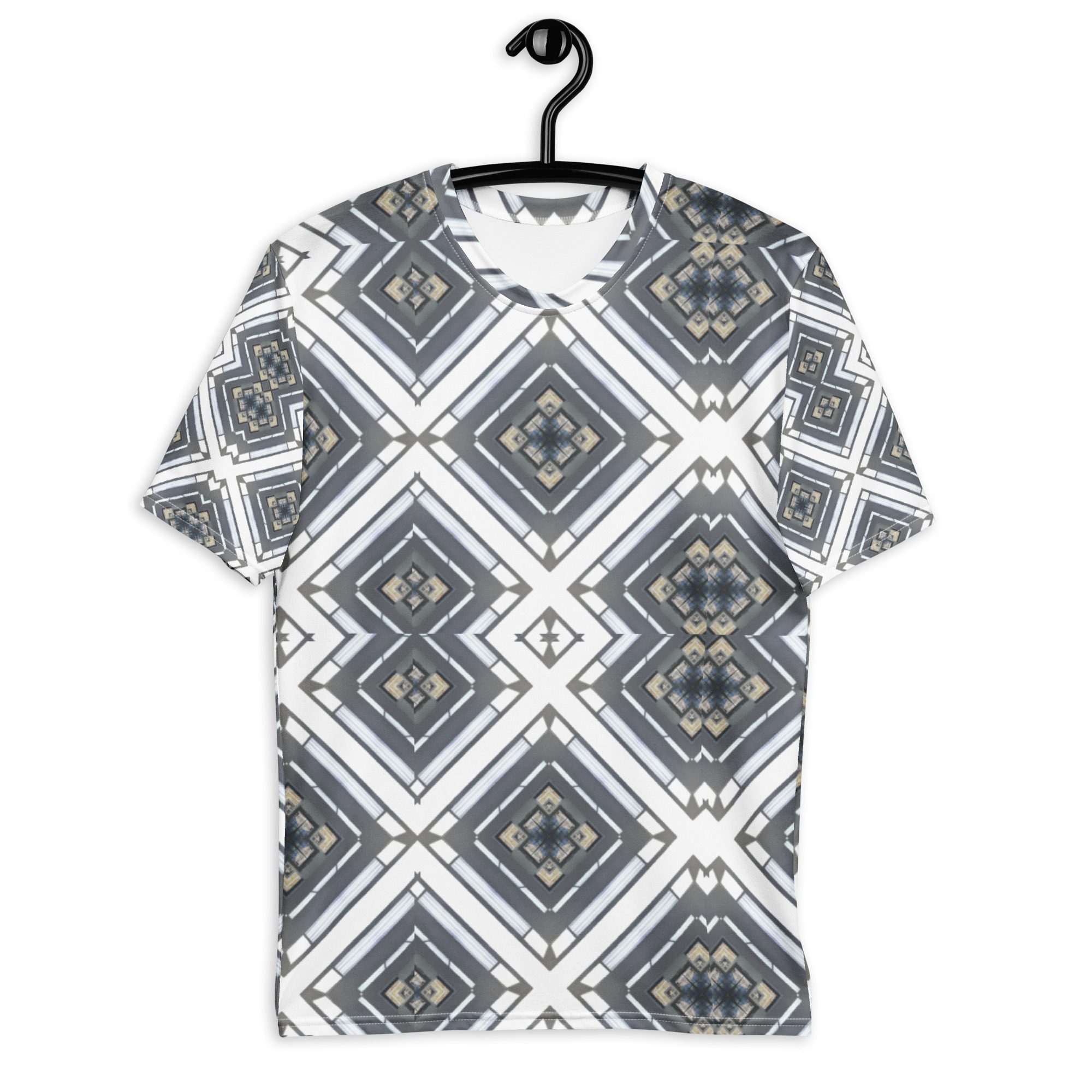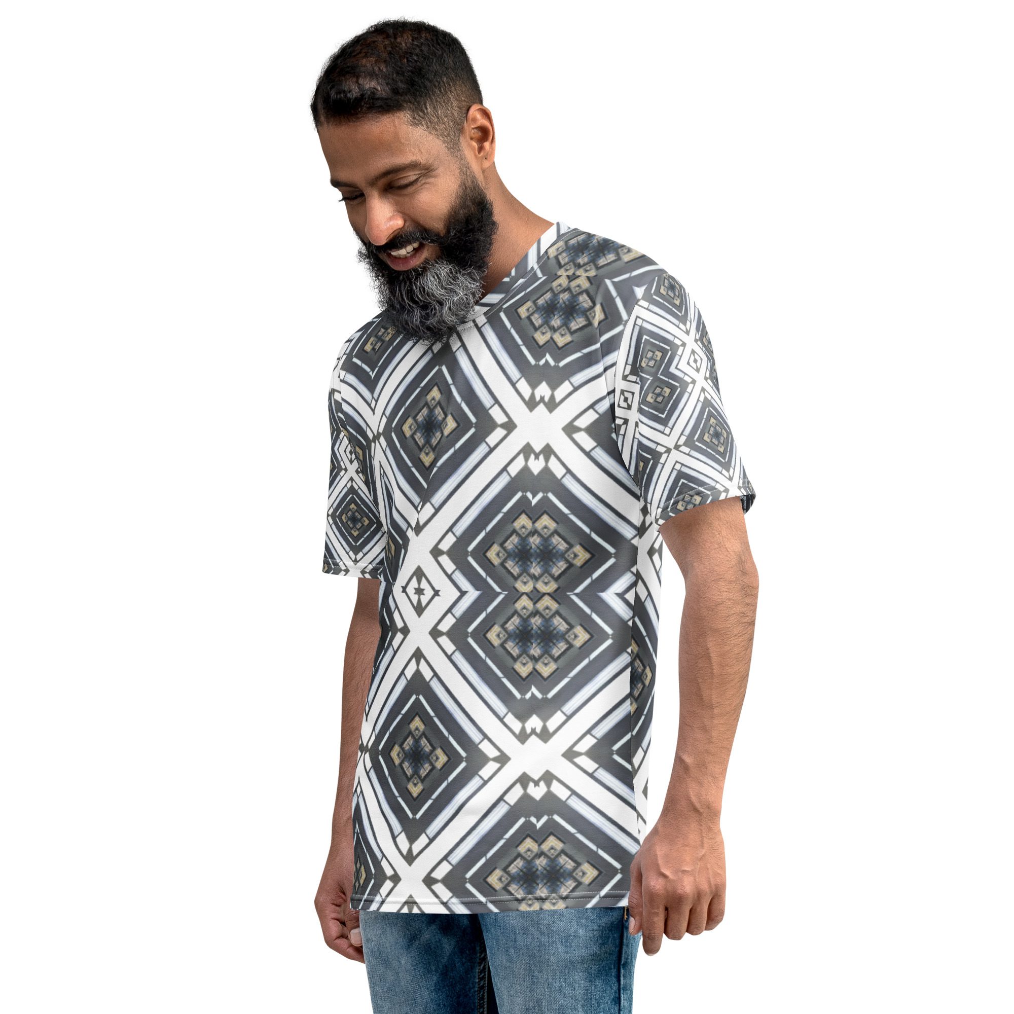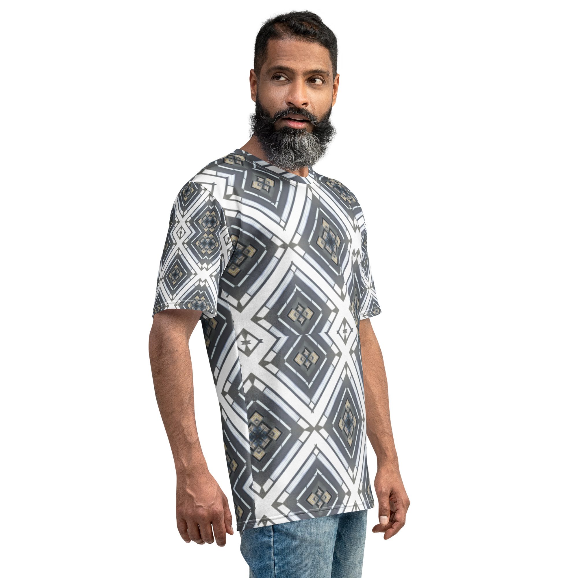 Sharp lines meet subtle rhythm in Industrial Echo, an original design by Jaysen Mansfield. This all-over print T-shirt blends grayscale tones and geometric precision into a statement piece that feels both bold and balanced. Inspired by architecture and soundwave symmetry, the pattern gives a modern edge that pairs easily with jeans, joggers, or layered looks.