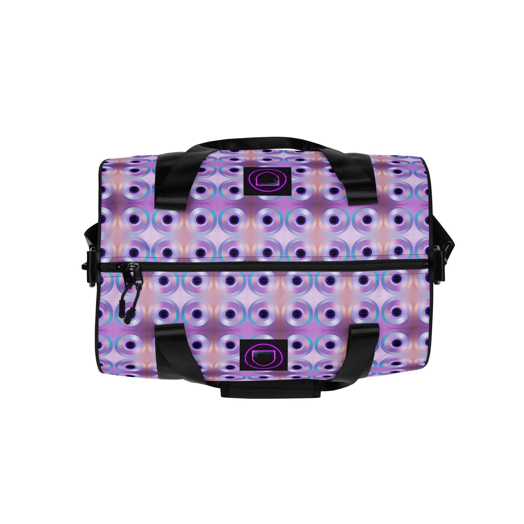 Iris Circuit: Pulse Guard Edition layers soft lavender-rose gradients with repeating digital iris portals, anchored by a glowing ring sequence along the base. The result is a gym bag that feels alert, intelligent, and quietly powerful.