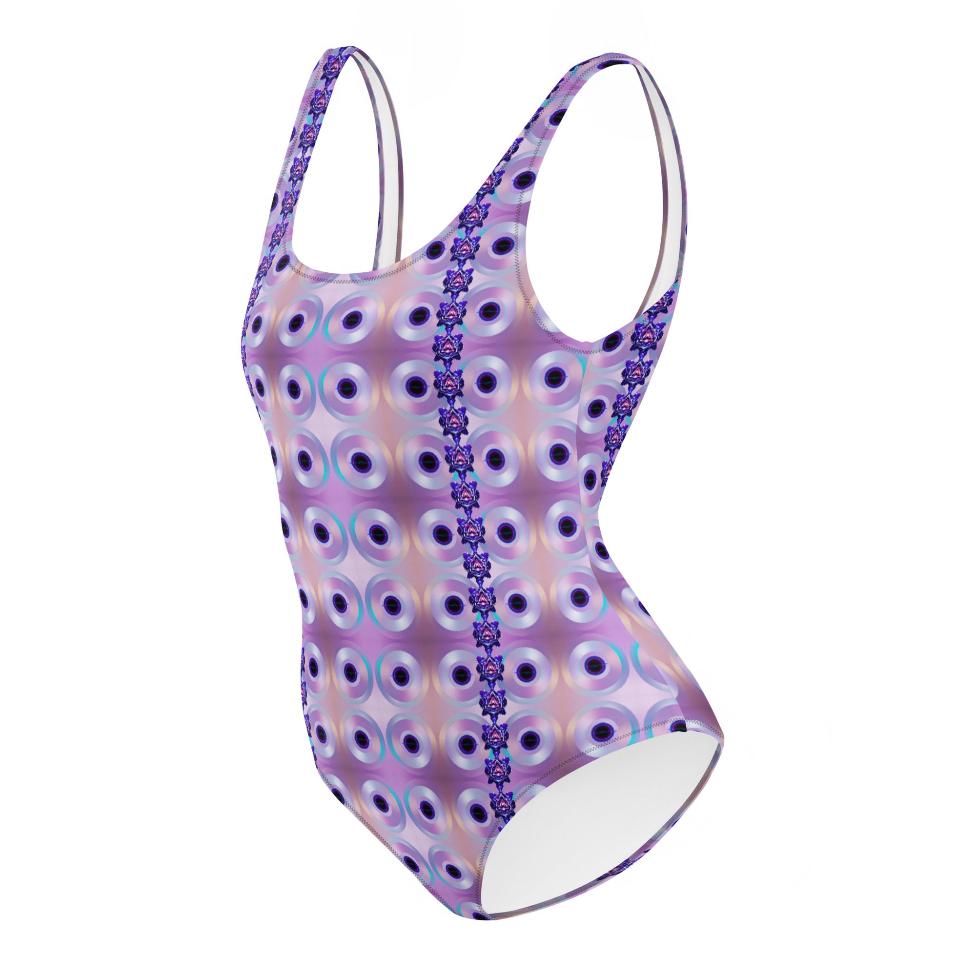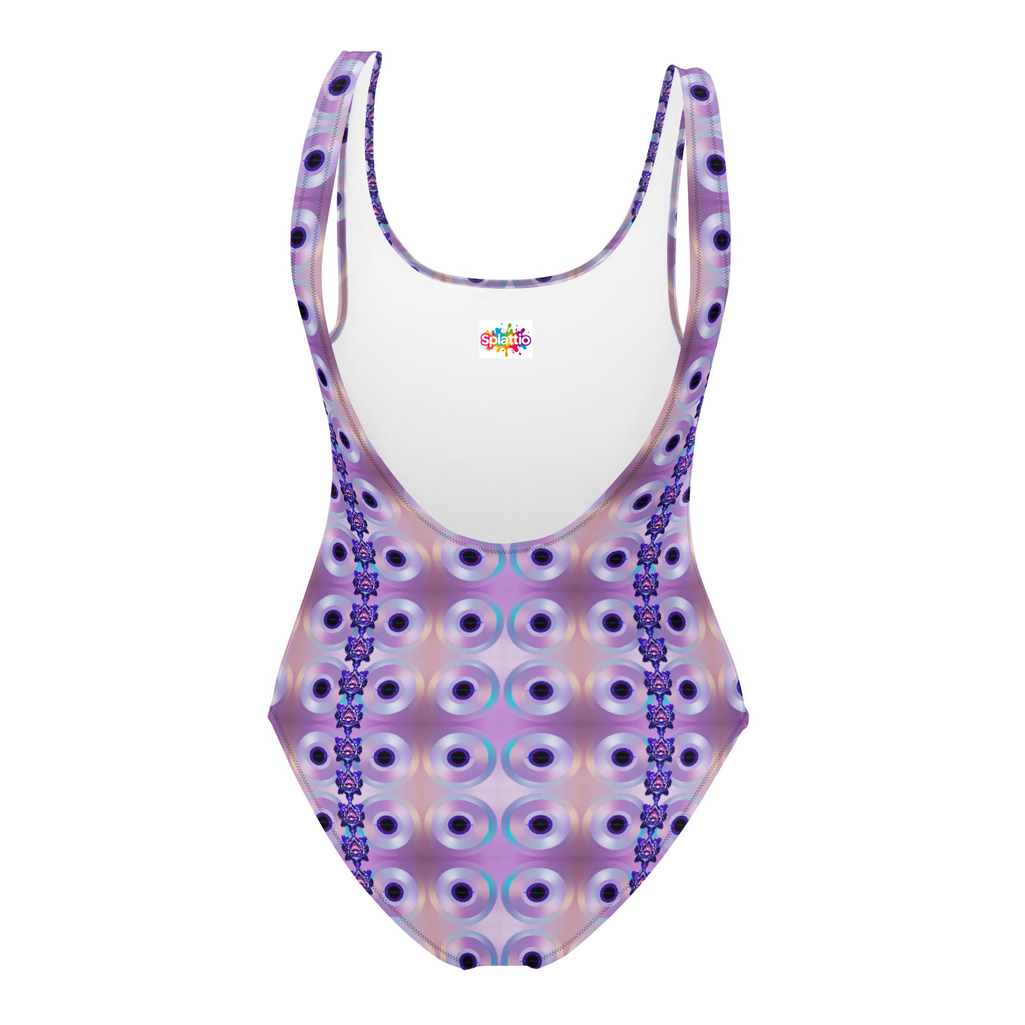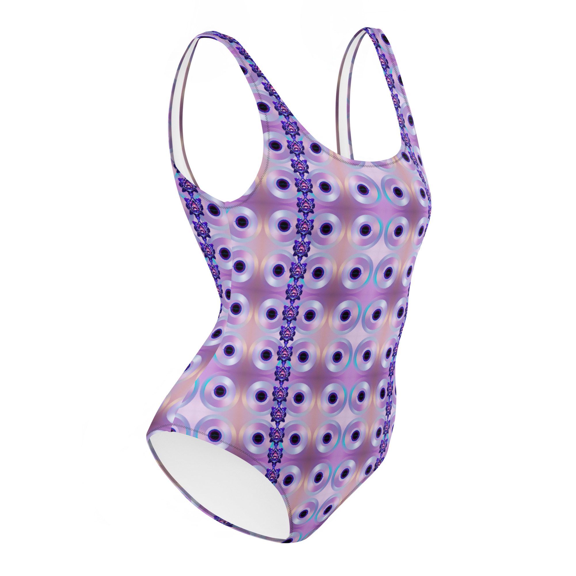 The Iris Pulse Reactor One-Piece Swimsuit features a repeating circular energy pattern that creates a hypnotic, flowing visual system. The design feels alive—like a pulse moving across the surface—blending symmetry, motion, and futuristic color into a clean, wearable form.