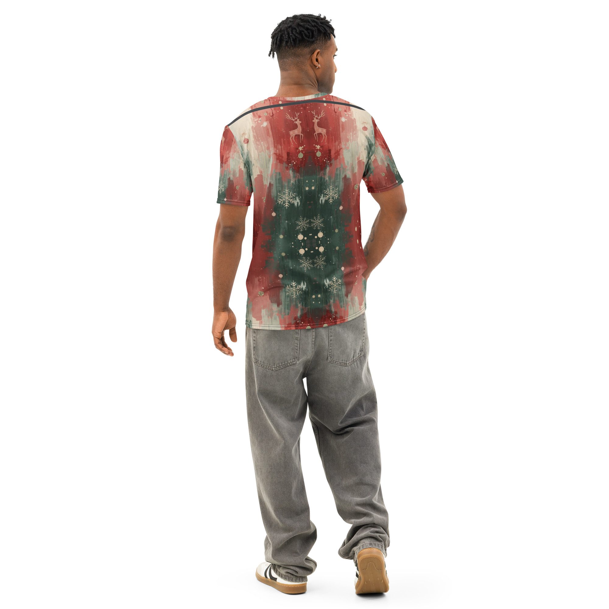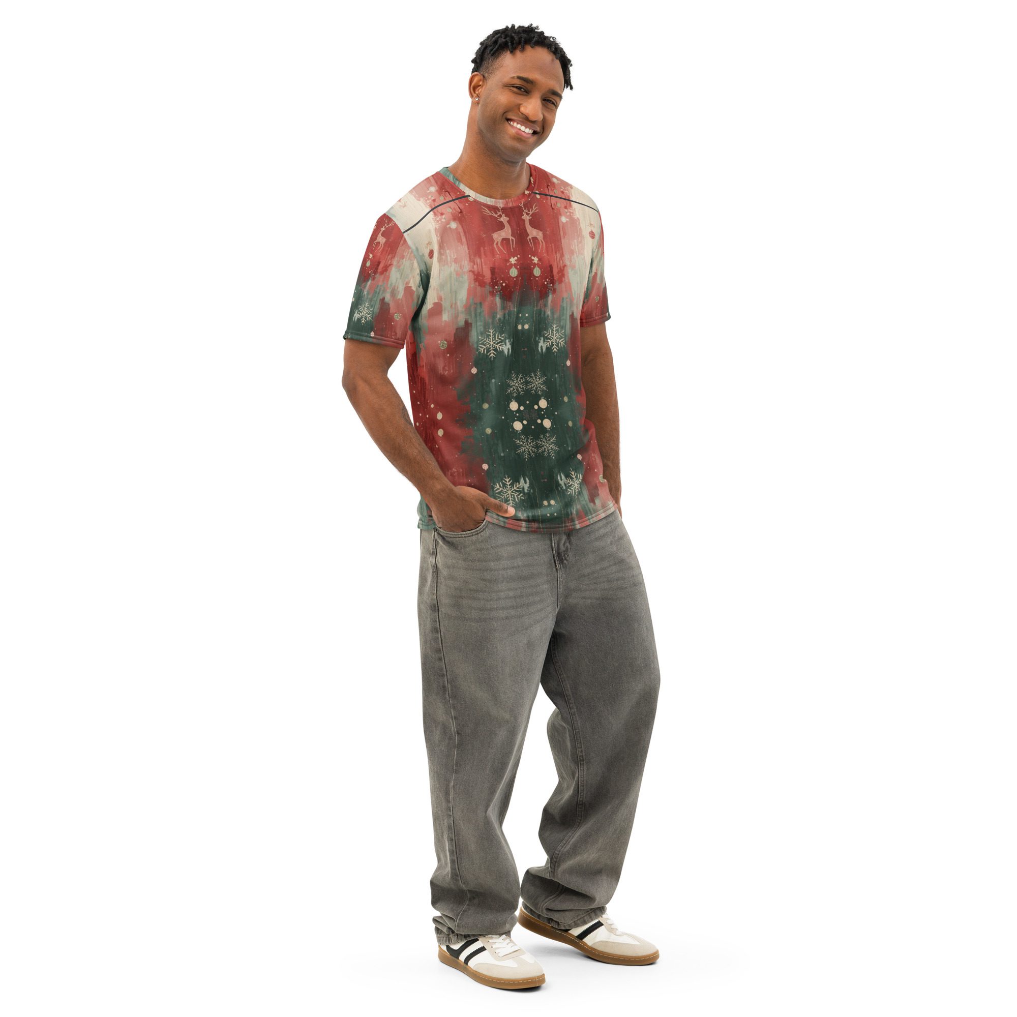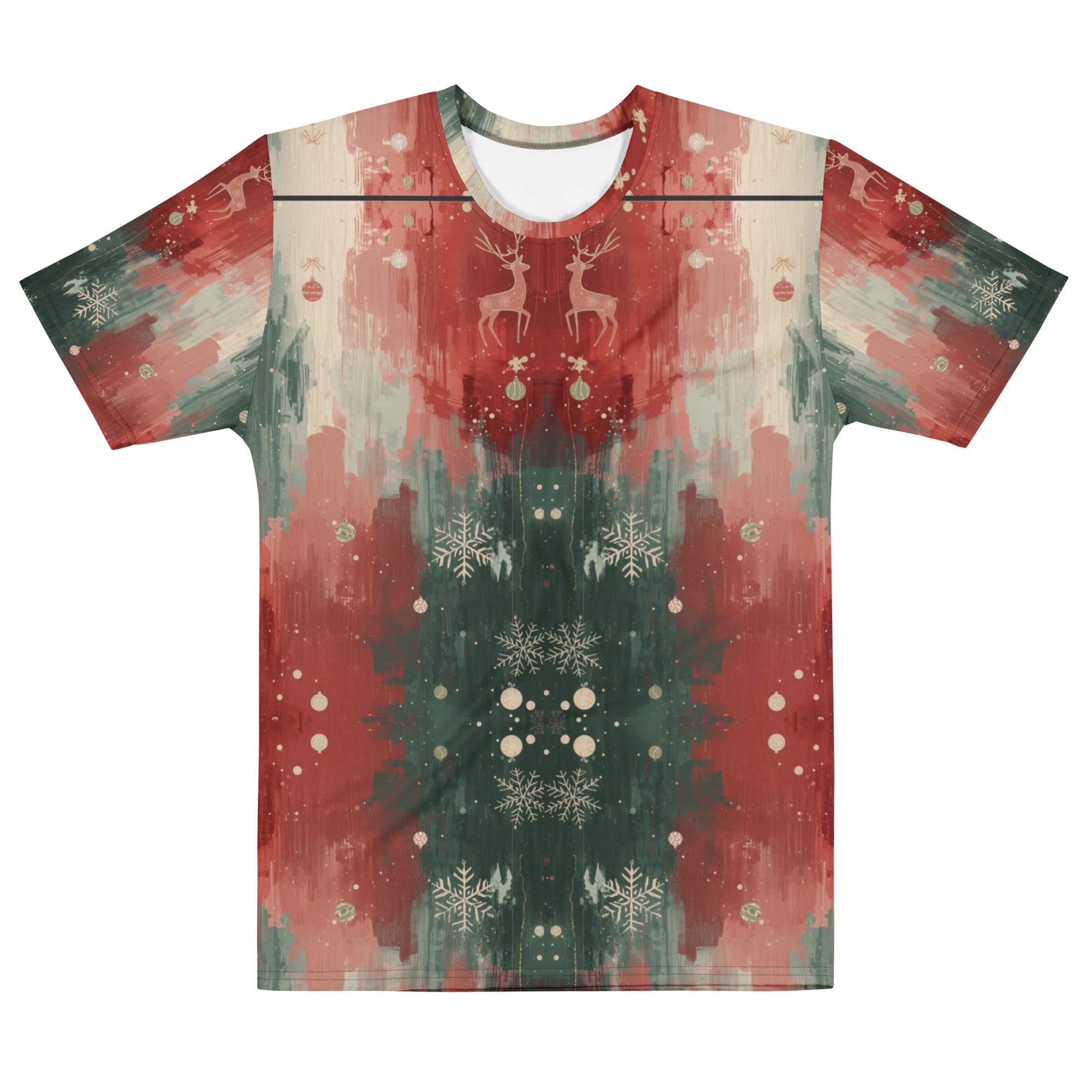 Wrap yourself in winter artistry with the Frosted Ember Symphony tee — a unique blend of deep forest greens, frosted whites, and warm ember reds that melt together in an abstract snowfall pattern. This all-over design creates a modern, painterly take on holiday style — perfect for the season yet wearable year-round.