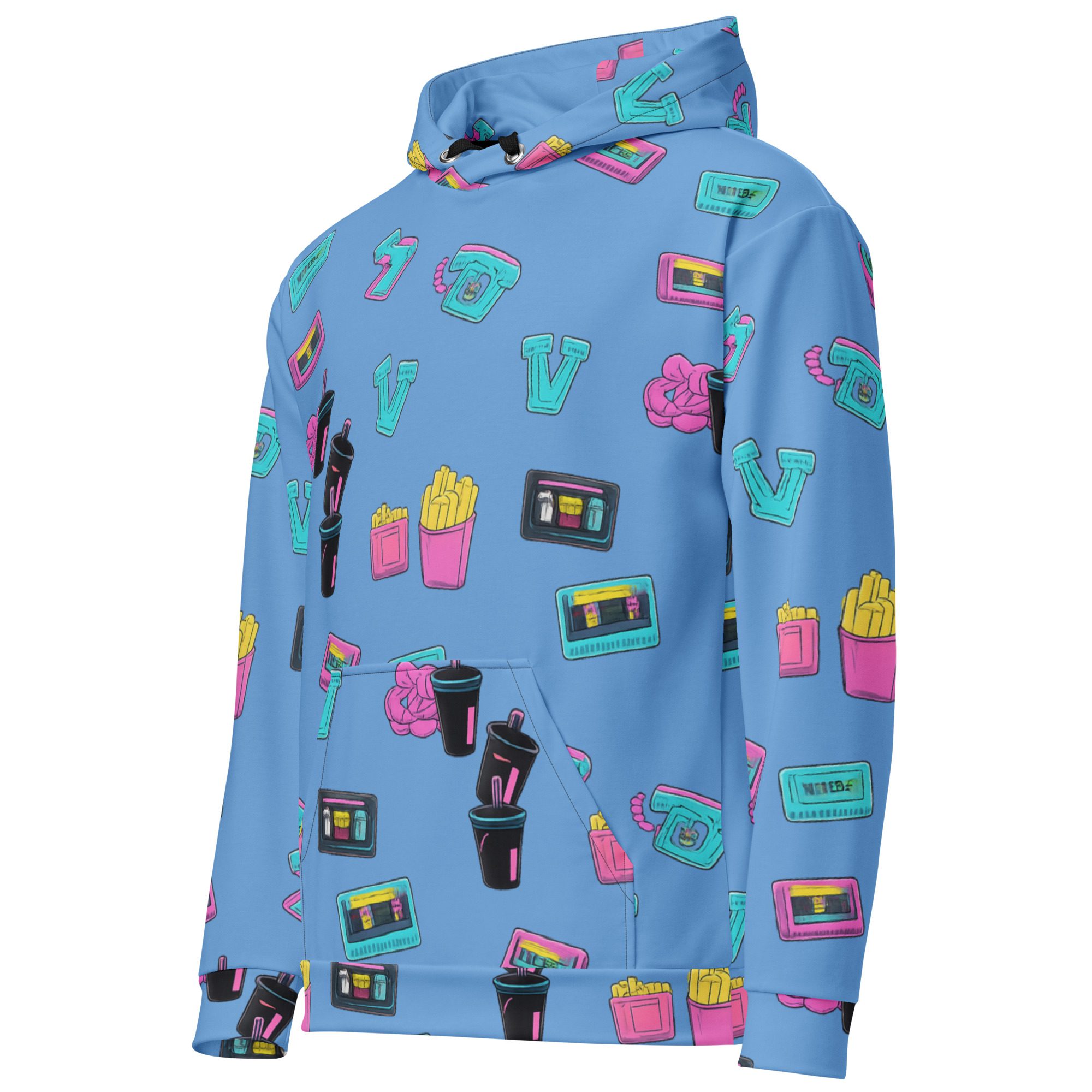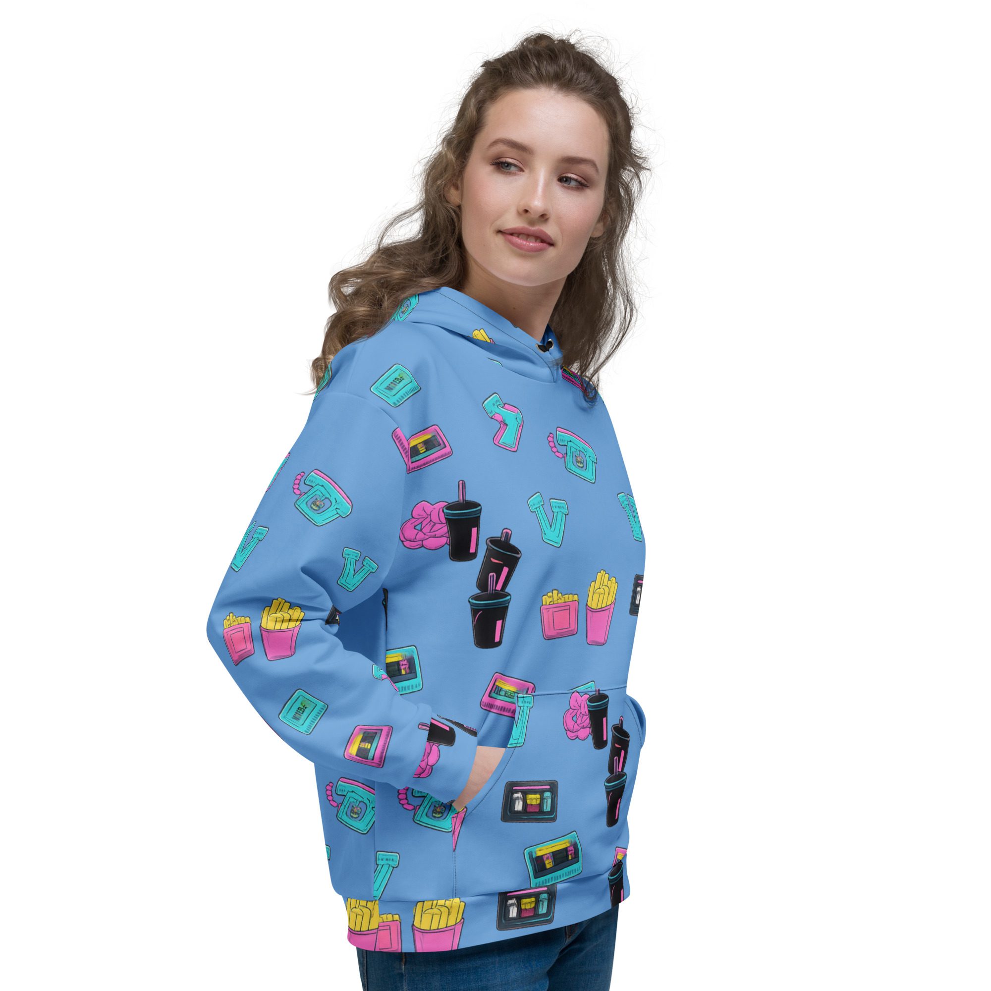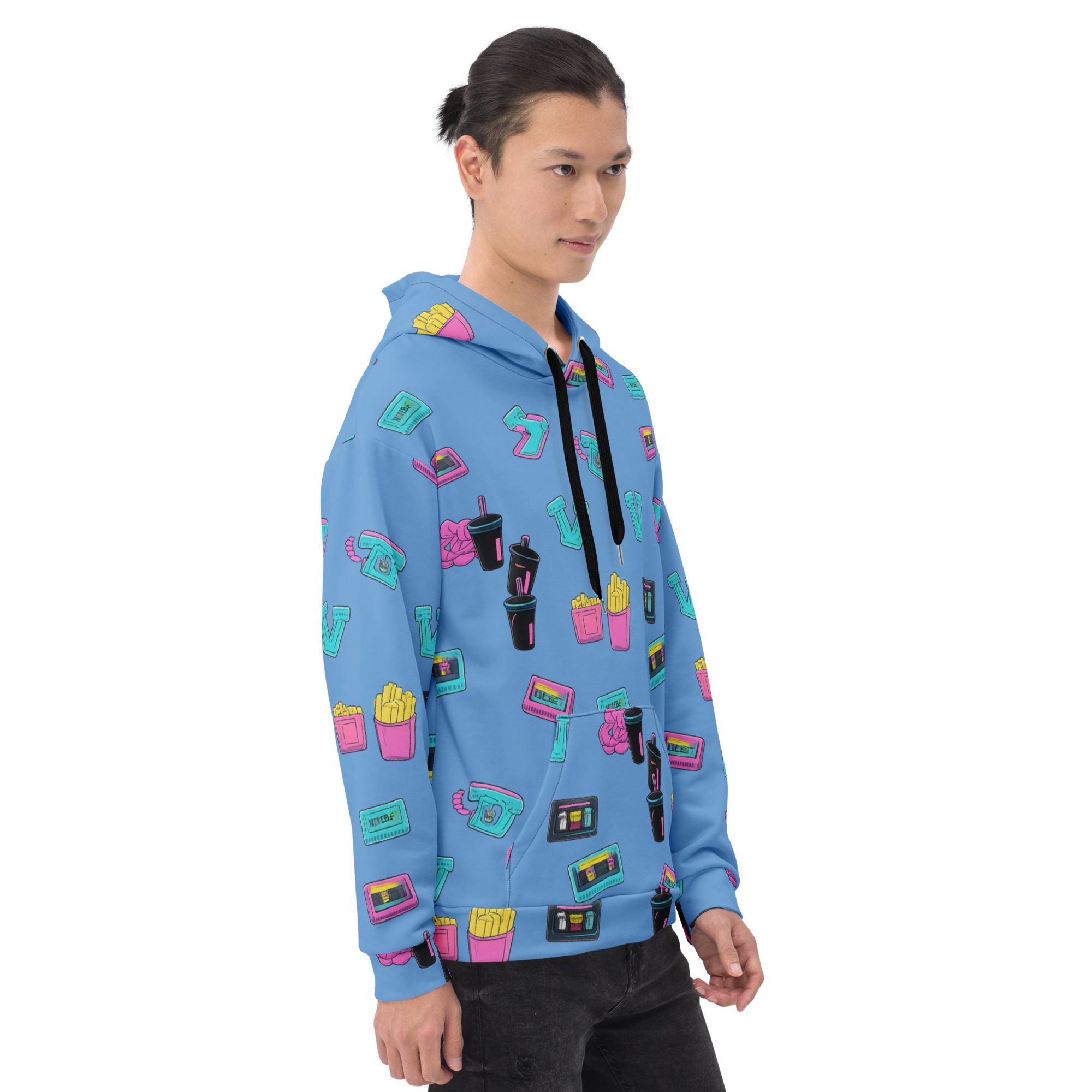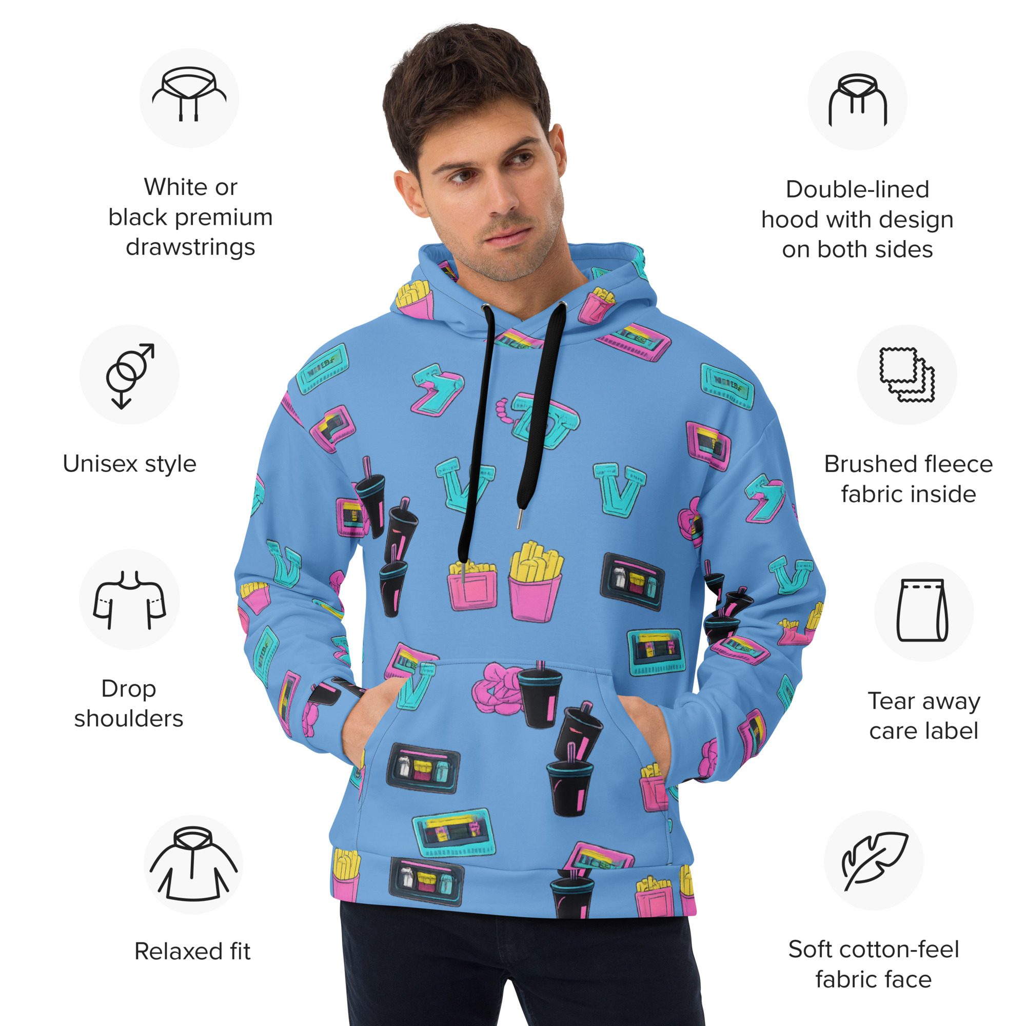 Meet your new throwback favorite. This all-over print hoodie brings peak retro vibes—cassette tapes, fries, soda cups, and that neon “rewind the good times” energy—wrapped into one loud, cozy statement piece.