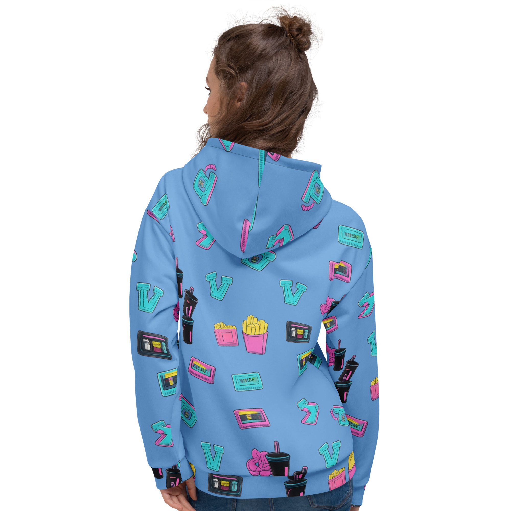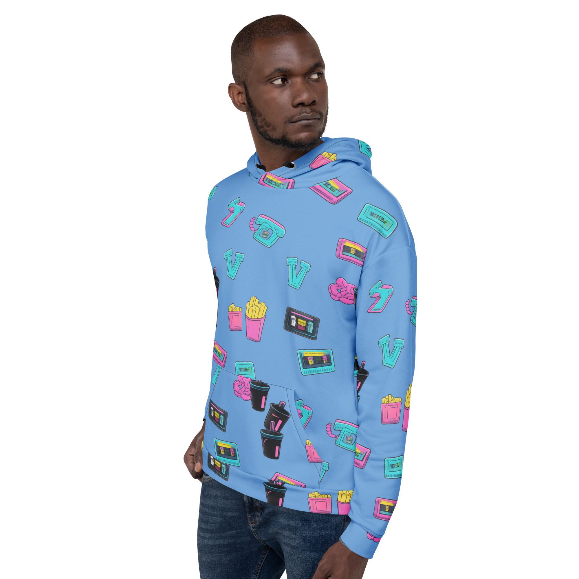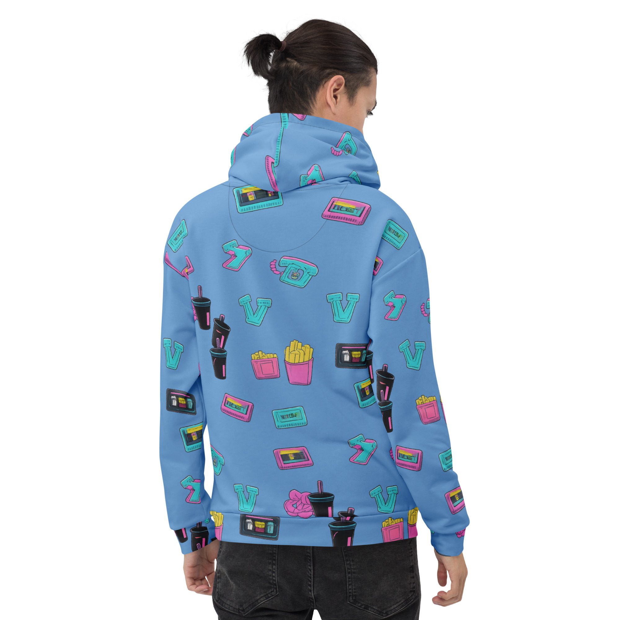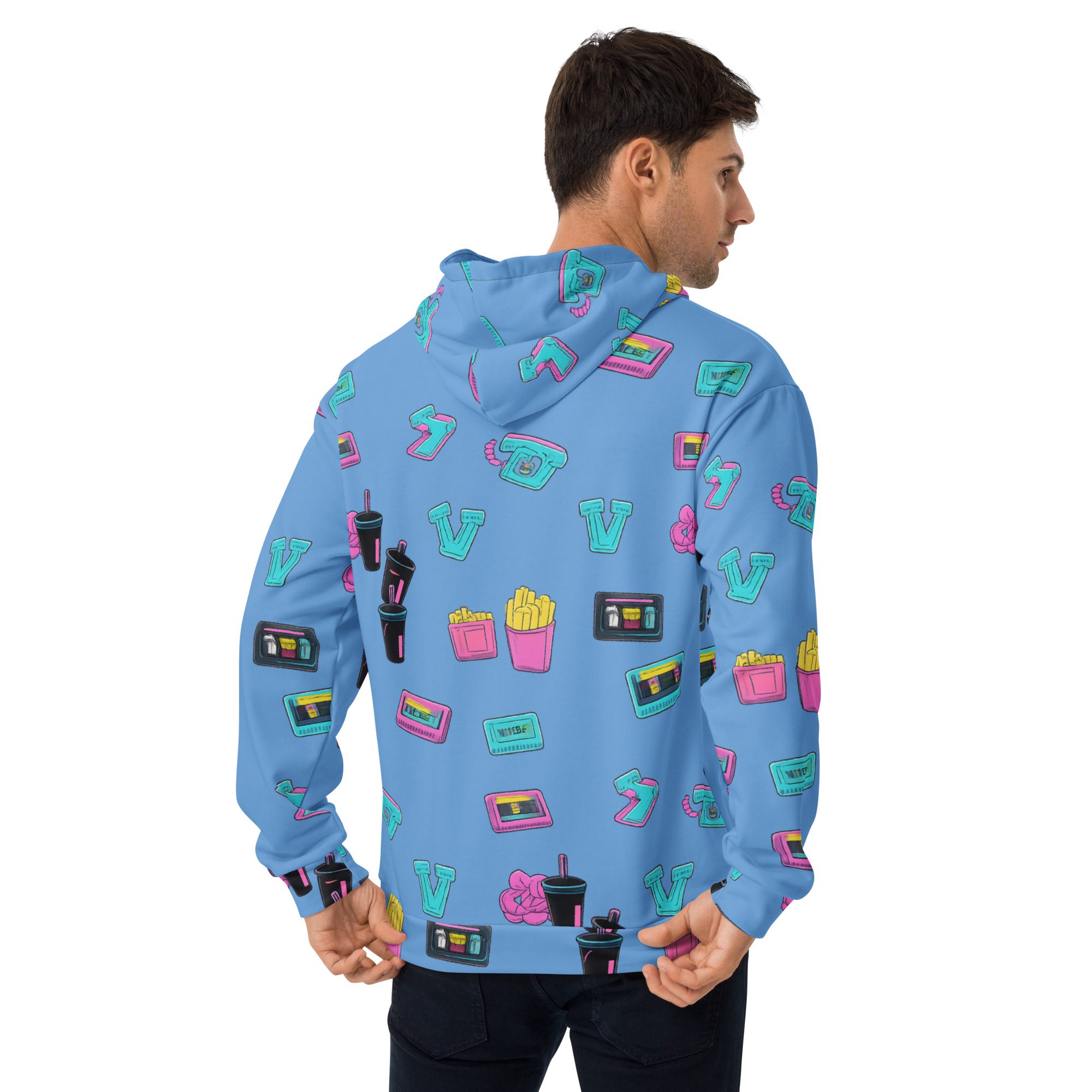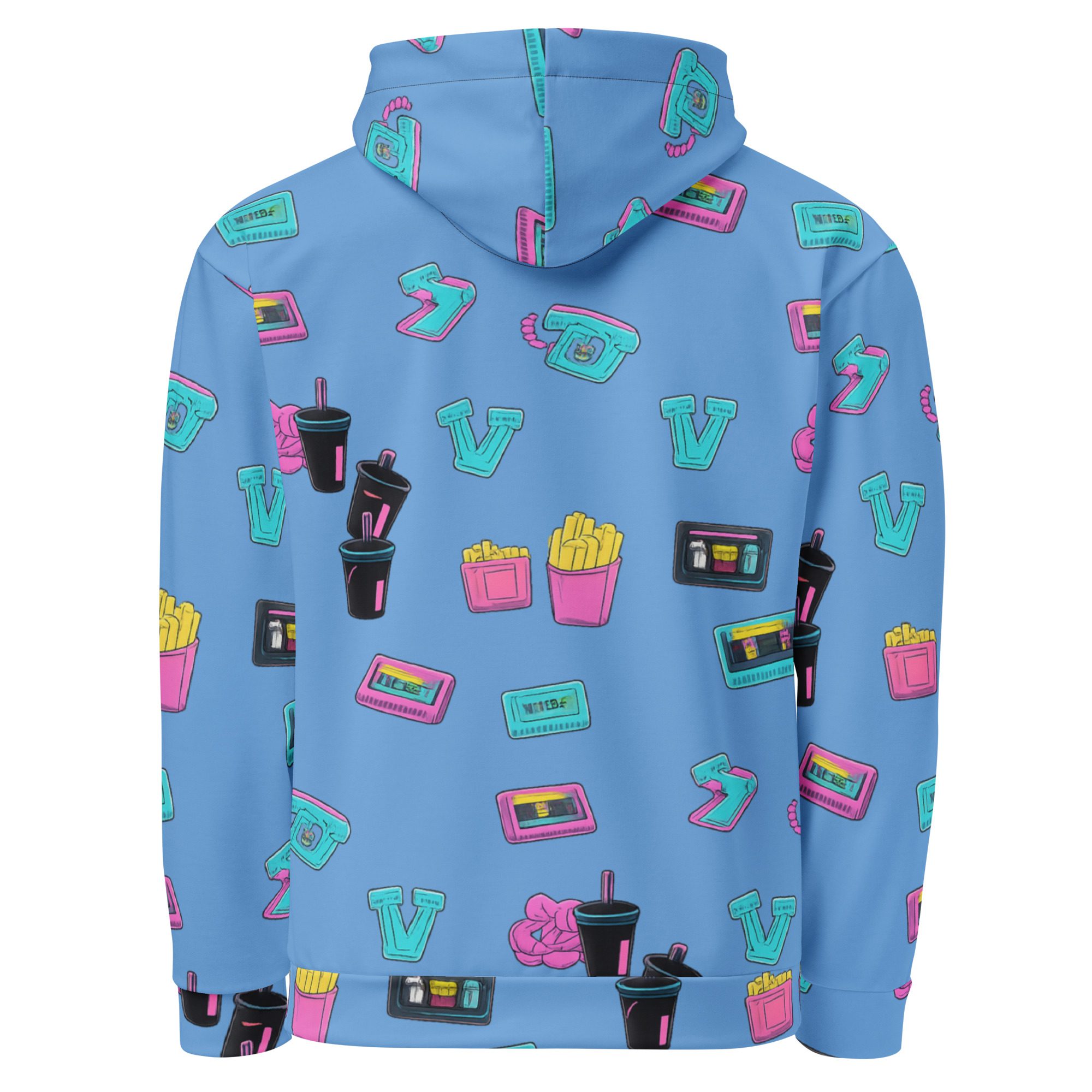 Meet your new throwback favorite. This all-over print hoodie brings peak retro vibes—cassette tapes, fries, soda cups, and that neon “rewind the good times” energy—wrapped into one loud, cozy statement piece.