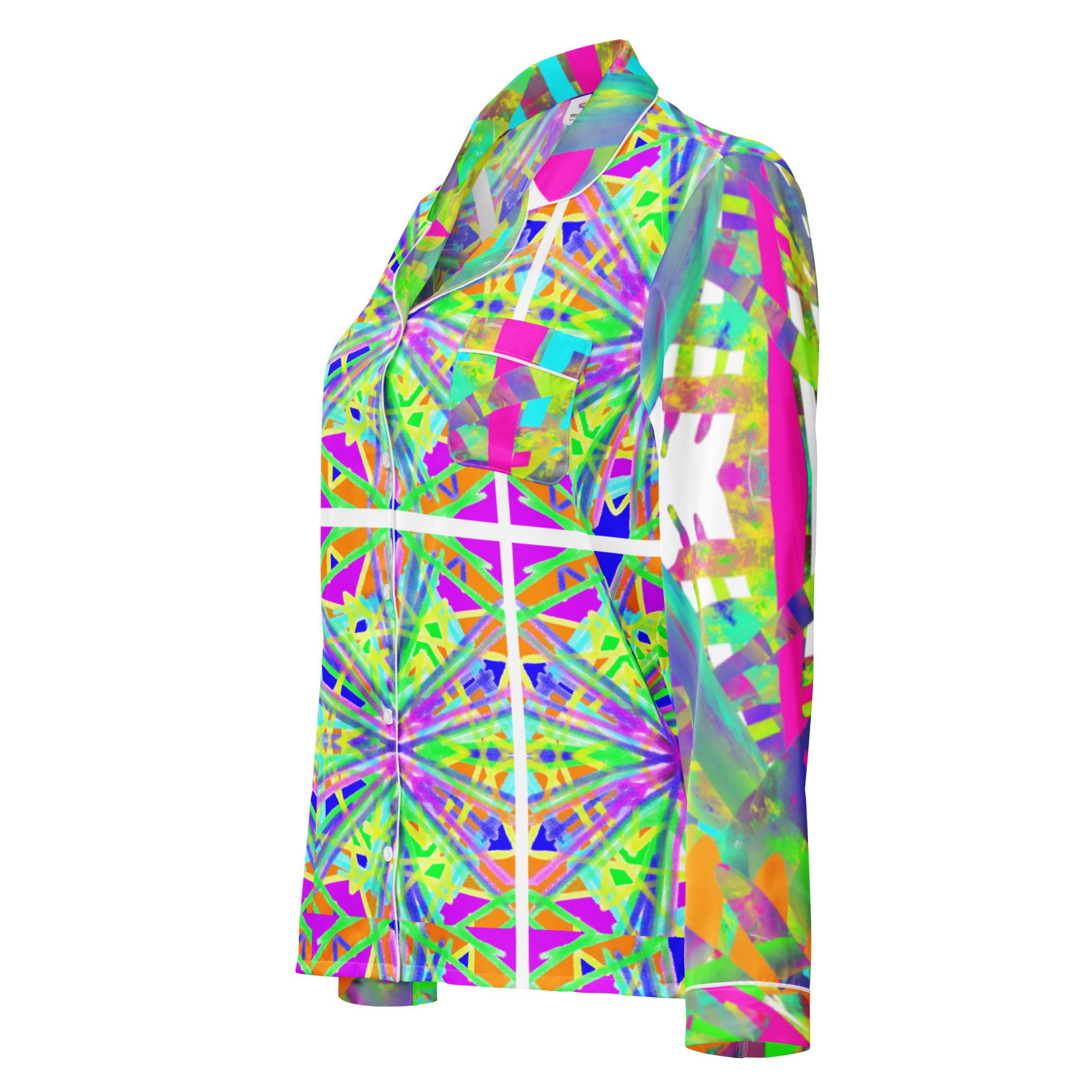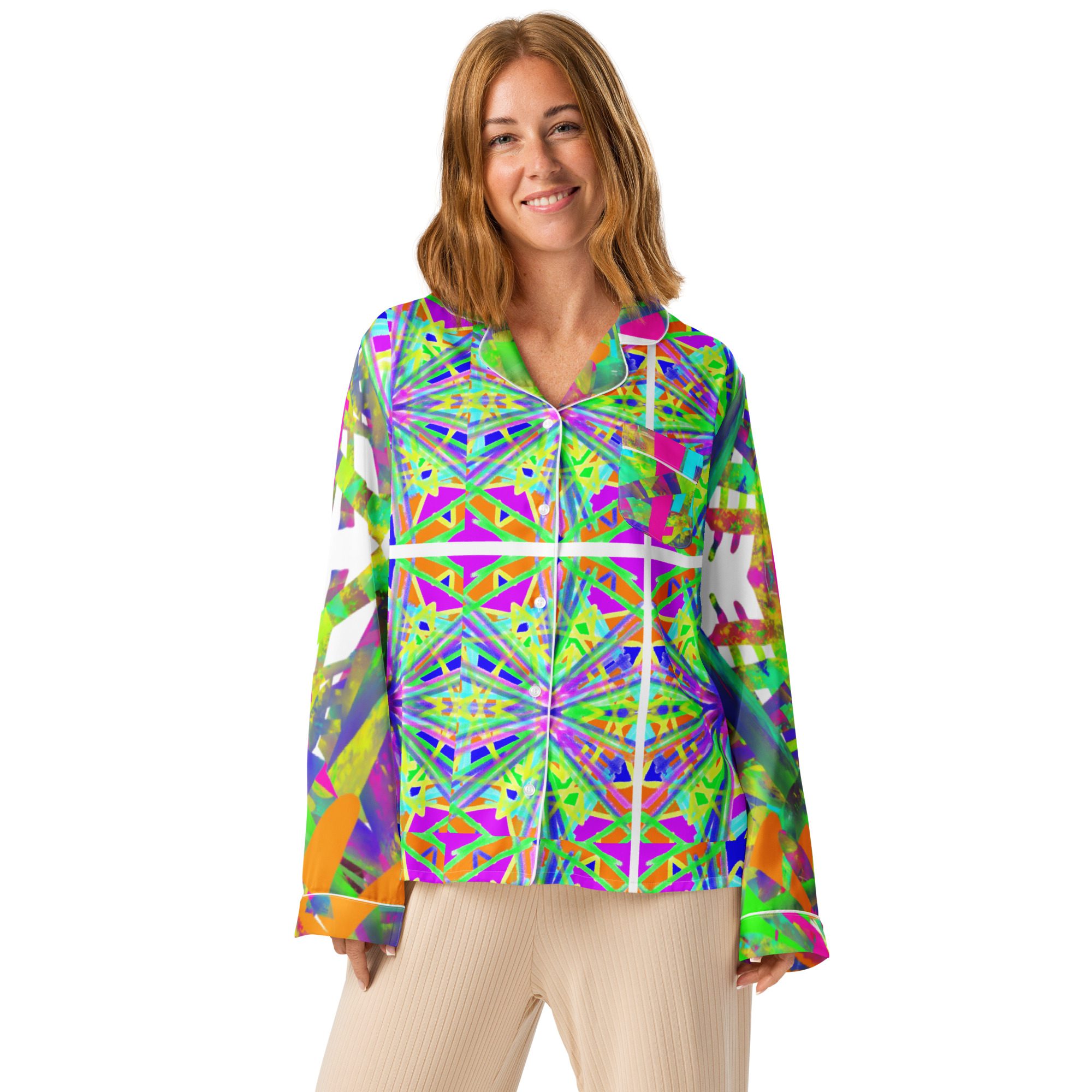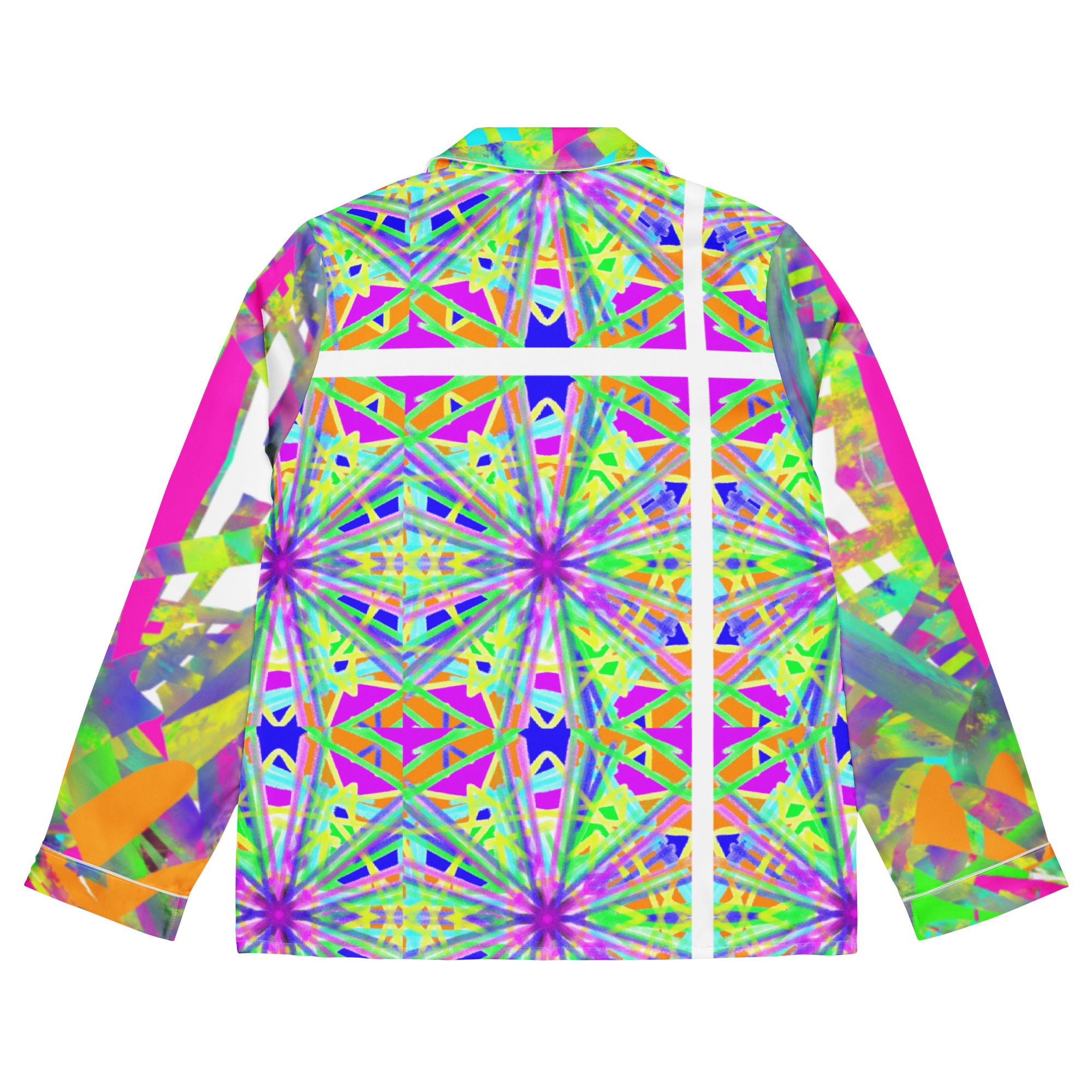 Wrap yourself in color and comfort with Neon Reverie, an original digital artwork by Jaysen Mansfield. This luminous pajama top bursts with electric greens, vivid magentas, and radiant blues arranged in a kaleidoscopic pattern that feels both dreamy and modern. Designed for those who love to bring art into every part of life—even bedtime—this top turns lounging into a visual statement.