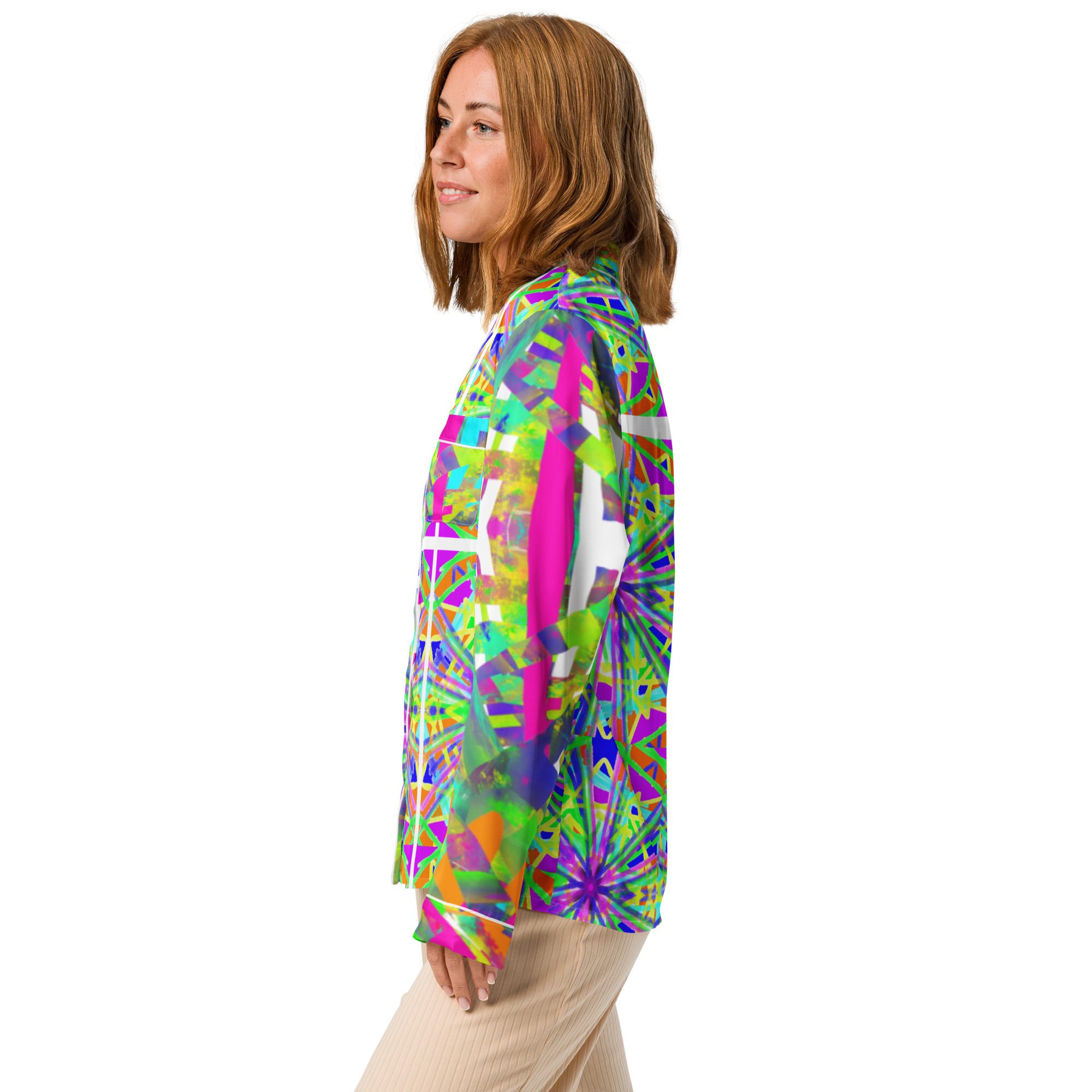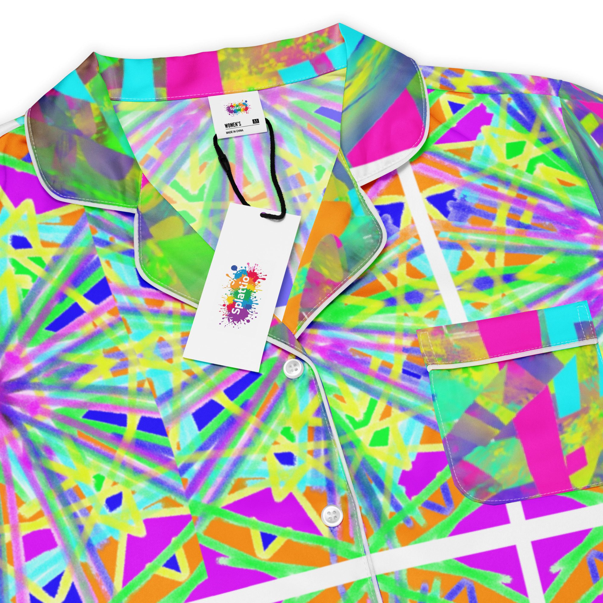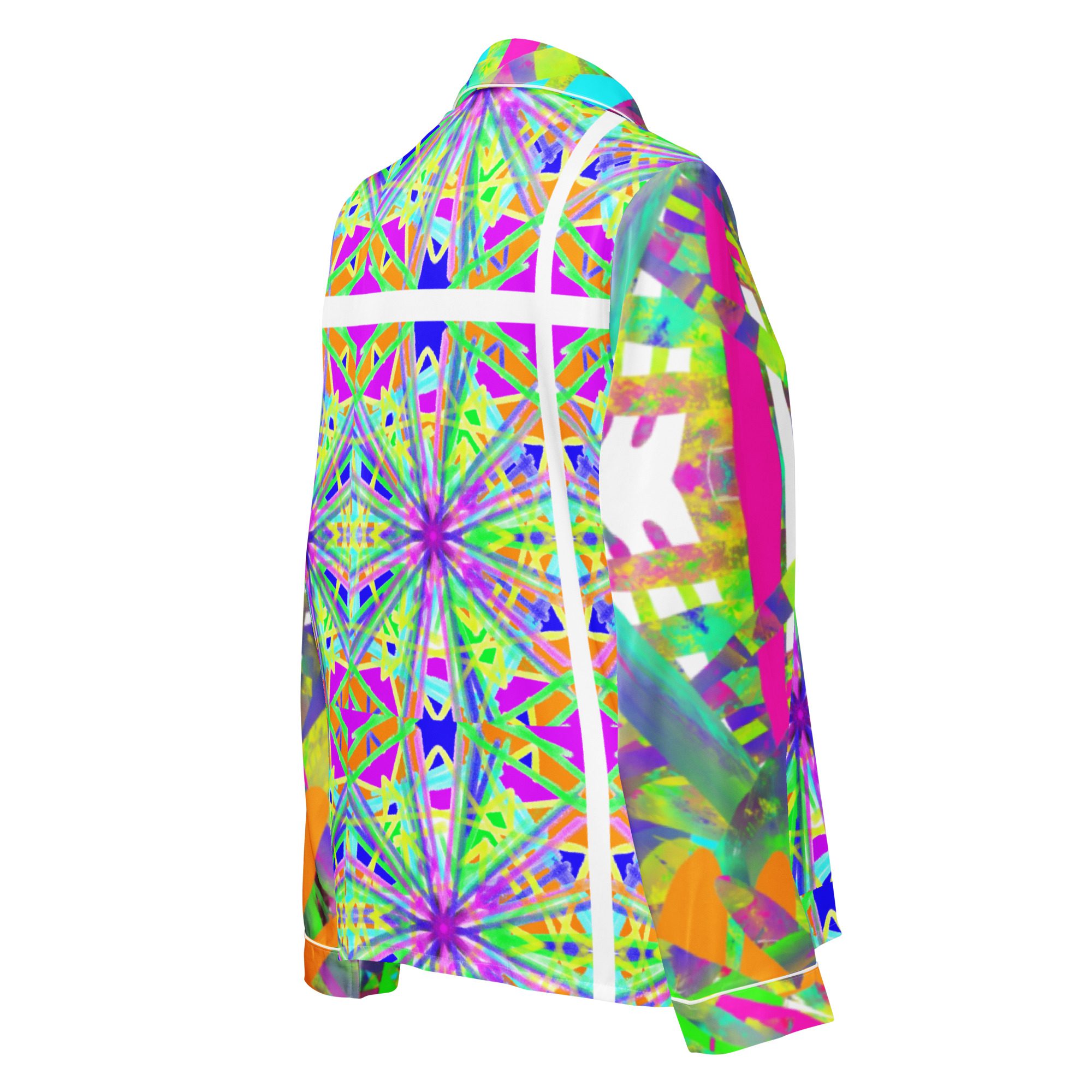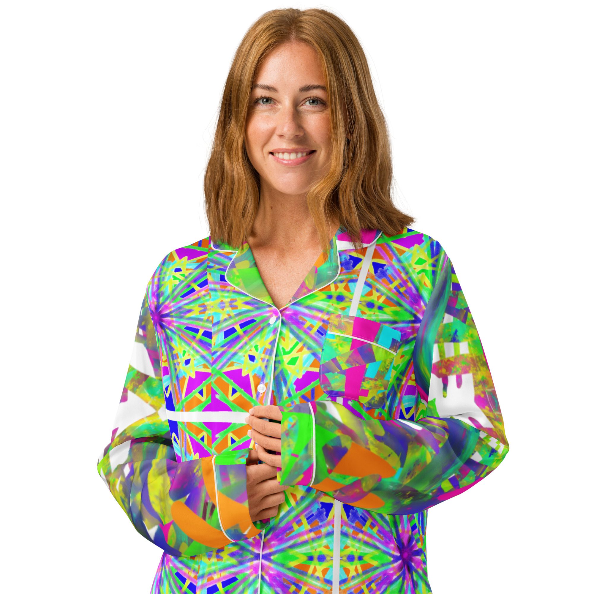 Wrap yourself in color and comfort with Neon Reverie, an original digital artwork by Jaysen Mansfield. This luminous pajama top bursts with electric greens, vivid magentas, and radiant blues arranged in a kaleidoscopic pattern that feels both dreamy and modern. Designed for those who love to bring art into every part of life—even bedtime—this top turns lounging into a visual statement.