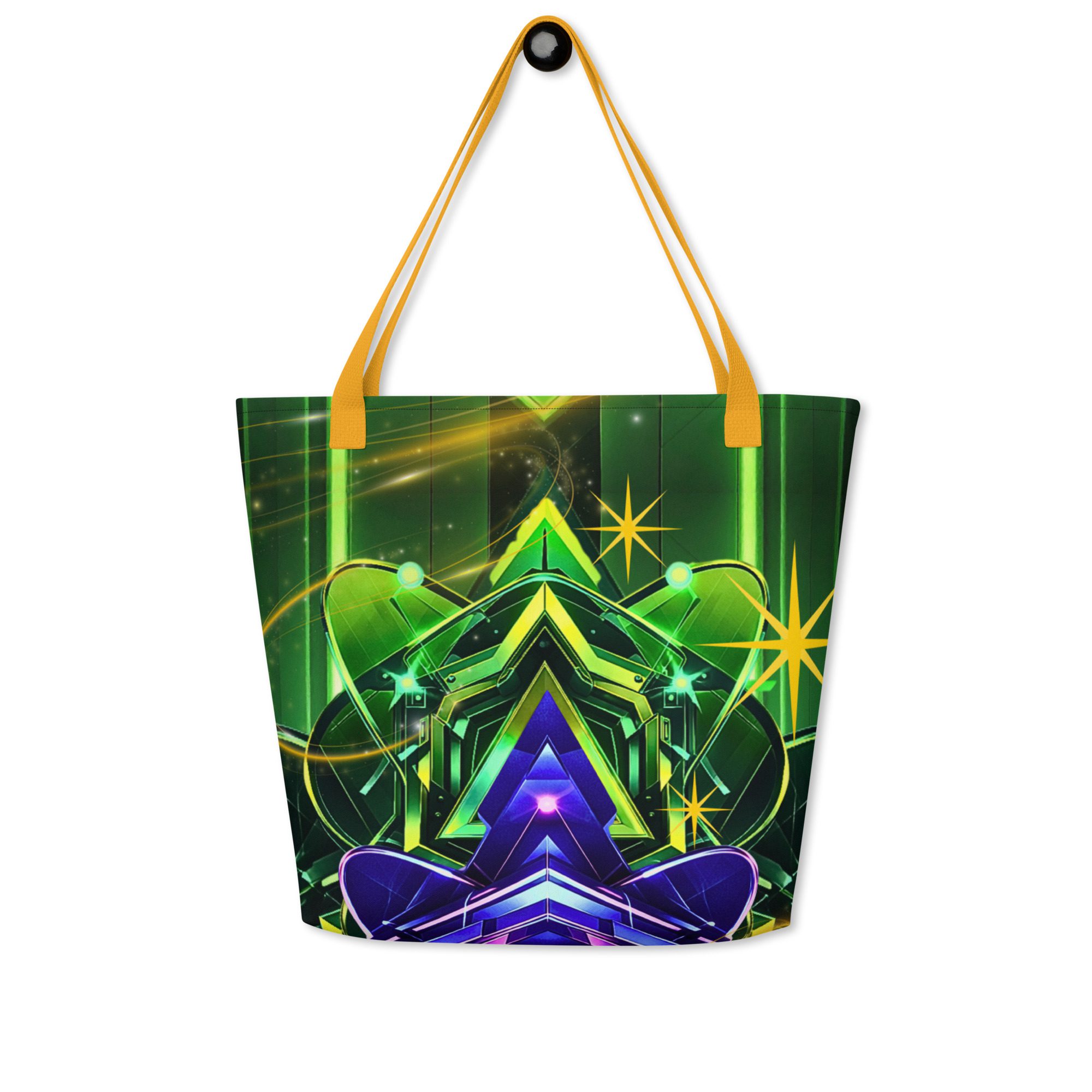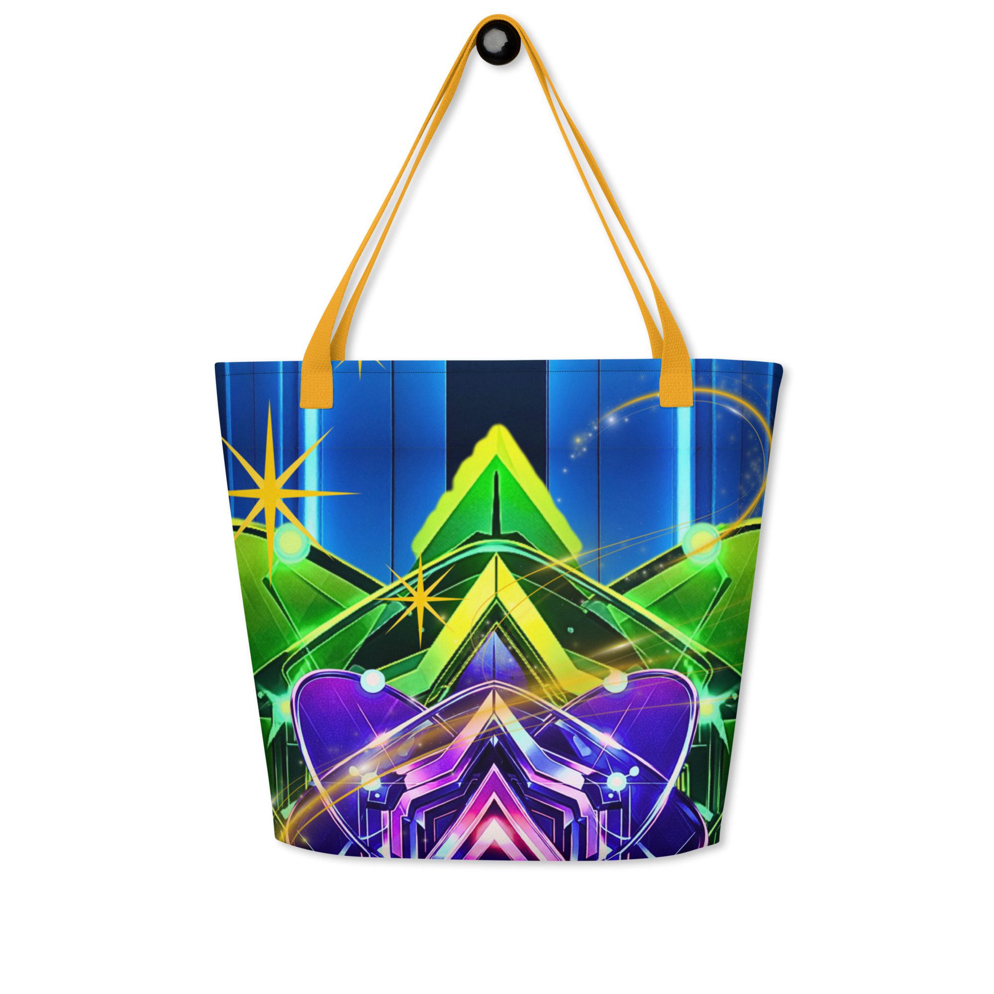 The Nova Reactor All-Over Print Large Tote Bag features a glowing energy core design built from layered geometry, neon circuitry, and high-contrast cyberpunk color. It feels bold, electric, and intentional—like a portable power system designed for modern life.
