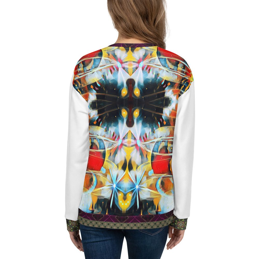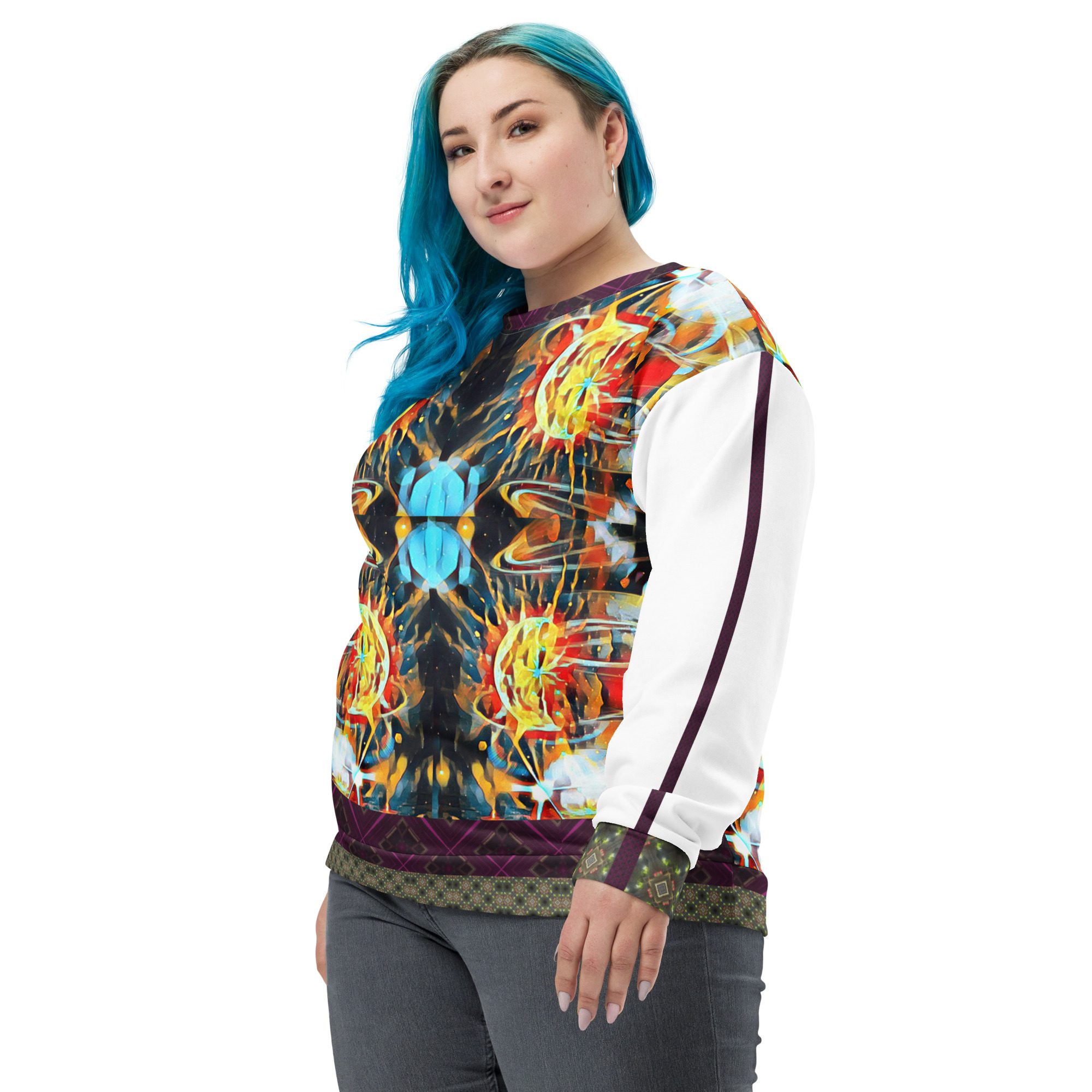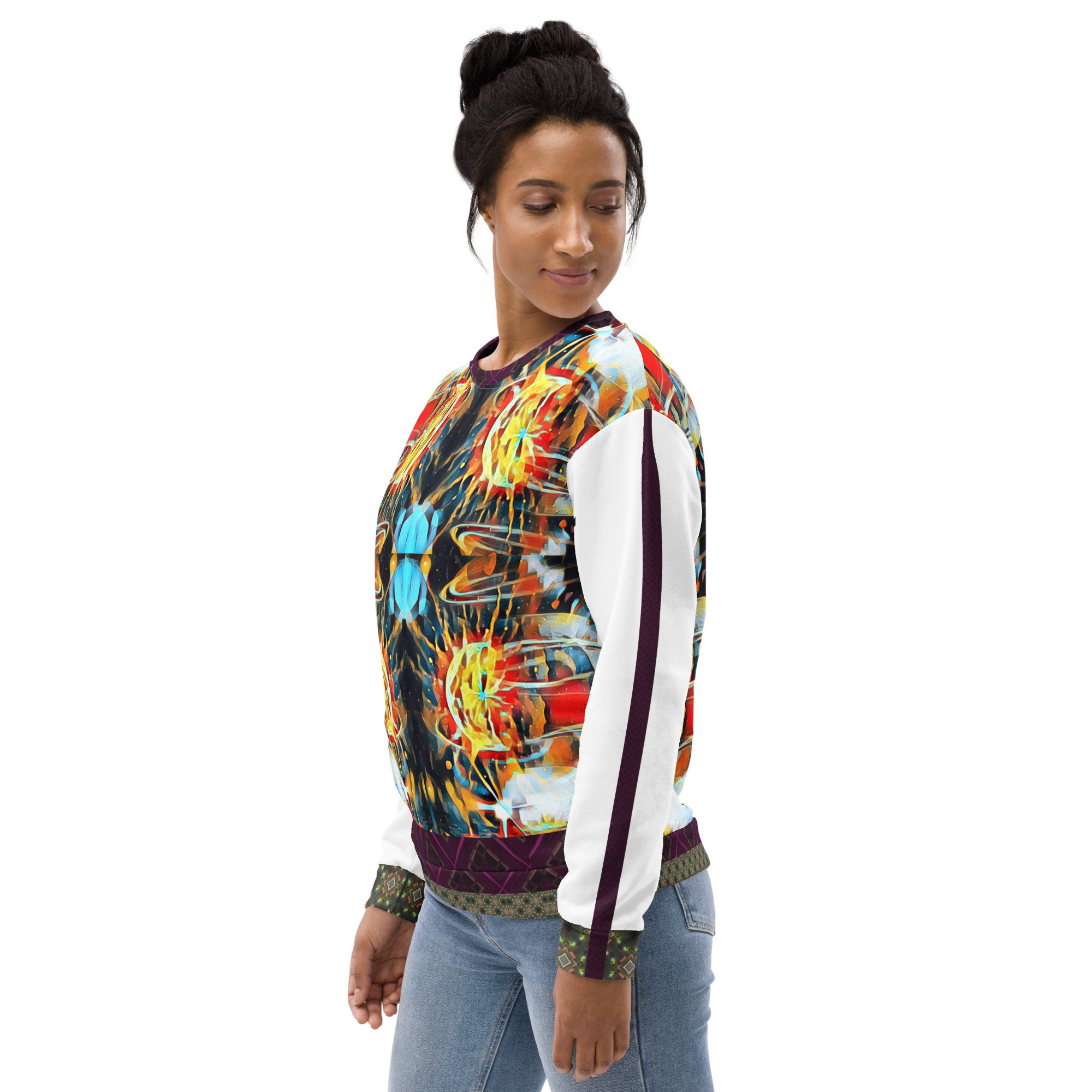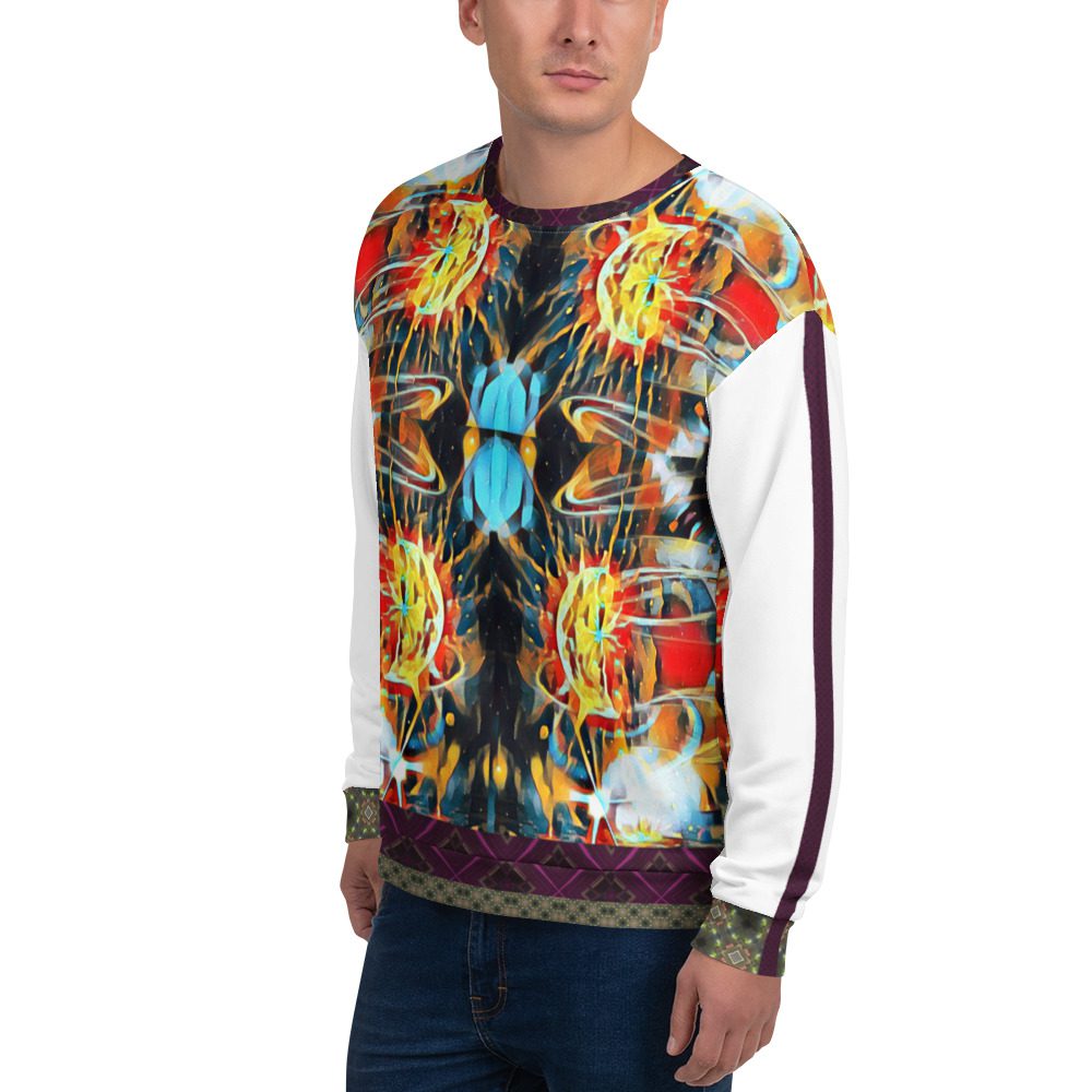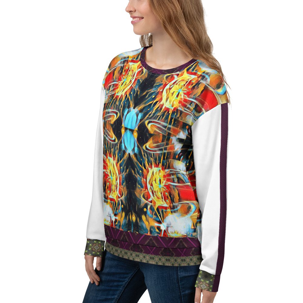 Ideal for lovers of abstract art apparel, cosmic prints, galaxy-inspired clothing, colorful streetwear, bold graphic sweatshirts, artistic fashion, statement tops, and unique designer pieces. A perfect choice for fans of futuristic aesthetics, psychedelic patterns, festival fashion, and handcrafted artwork on sustainable clothing.