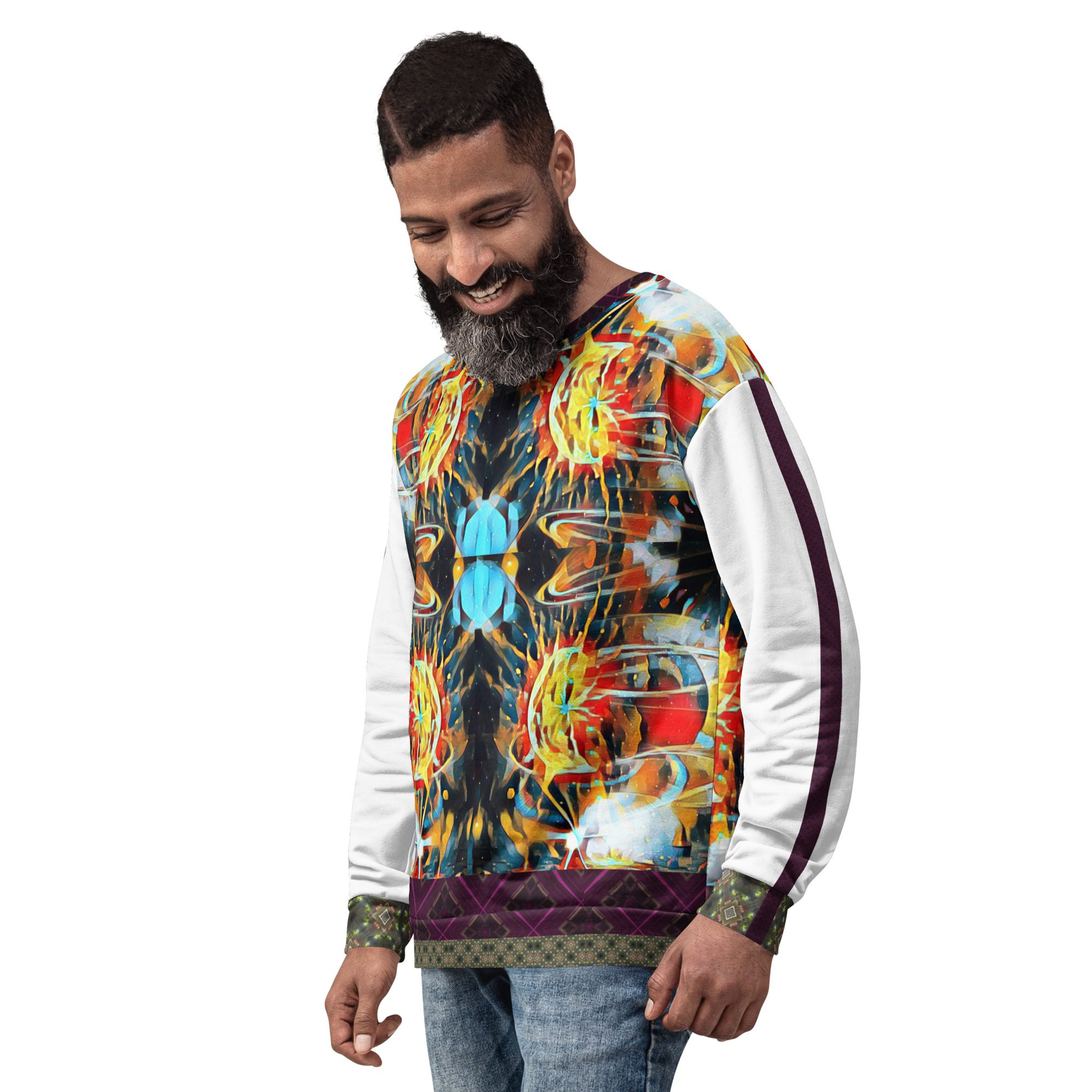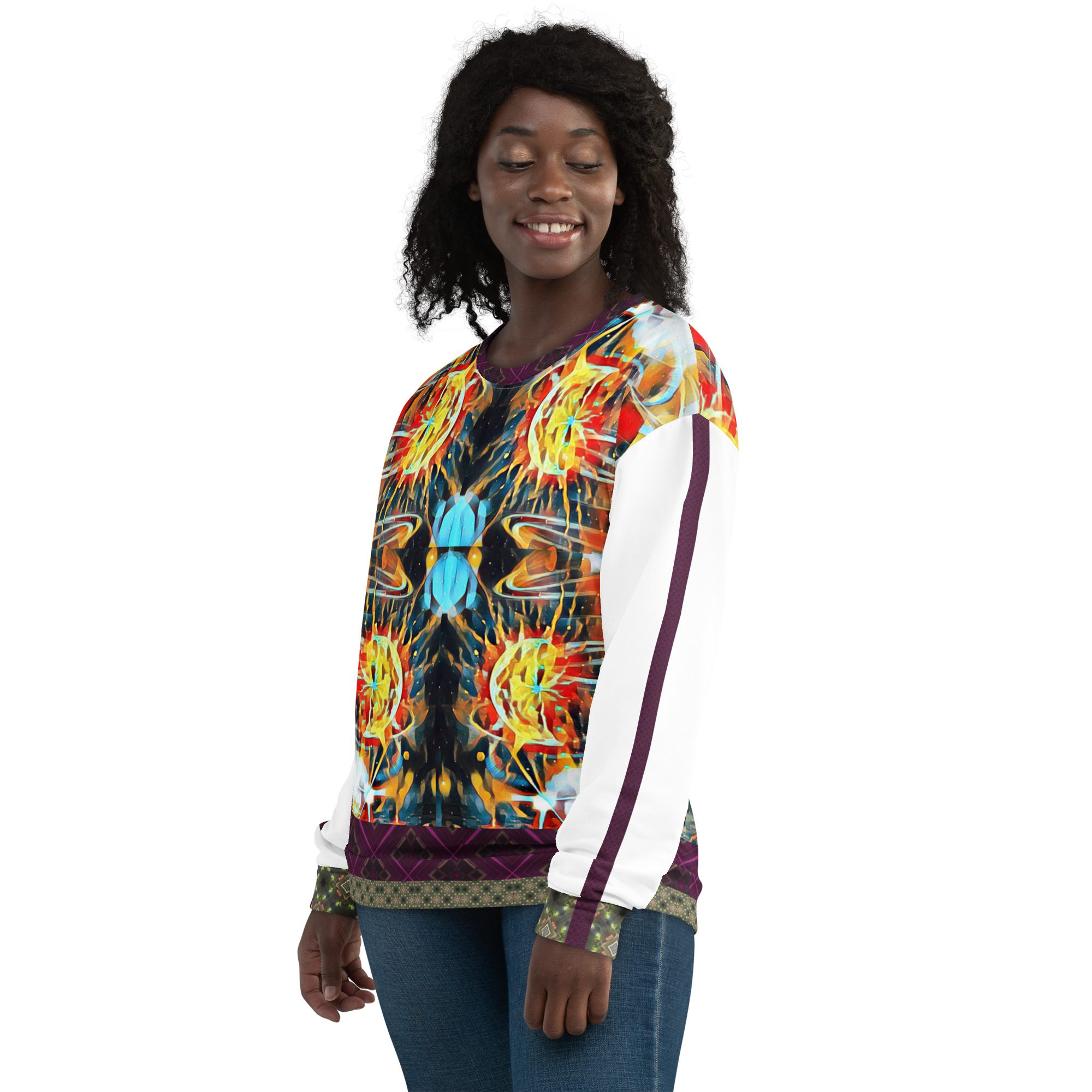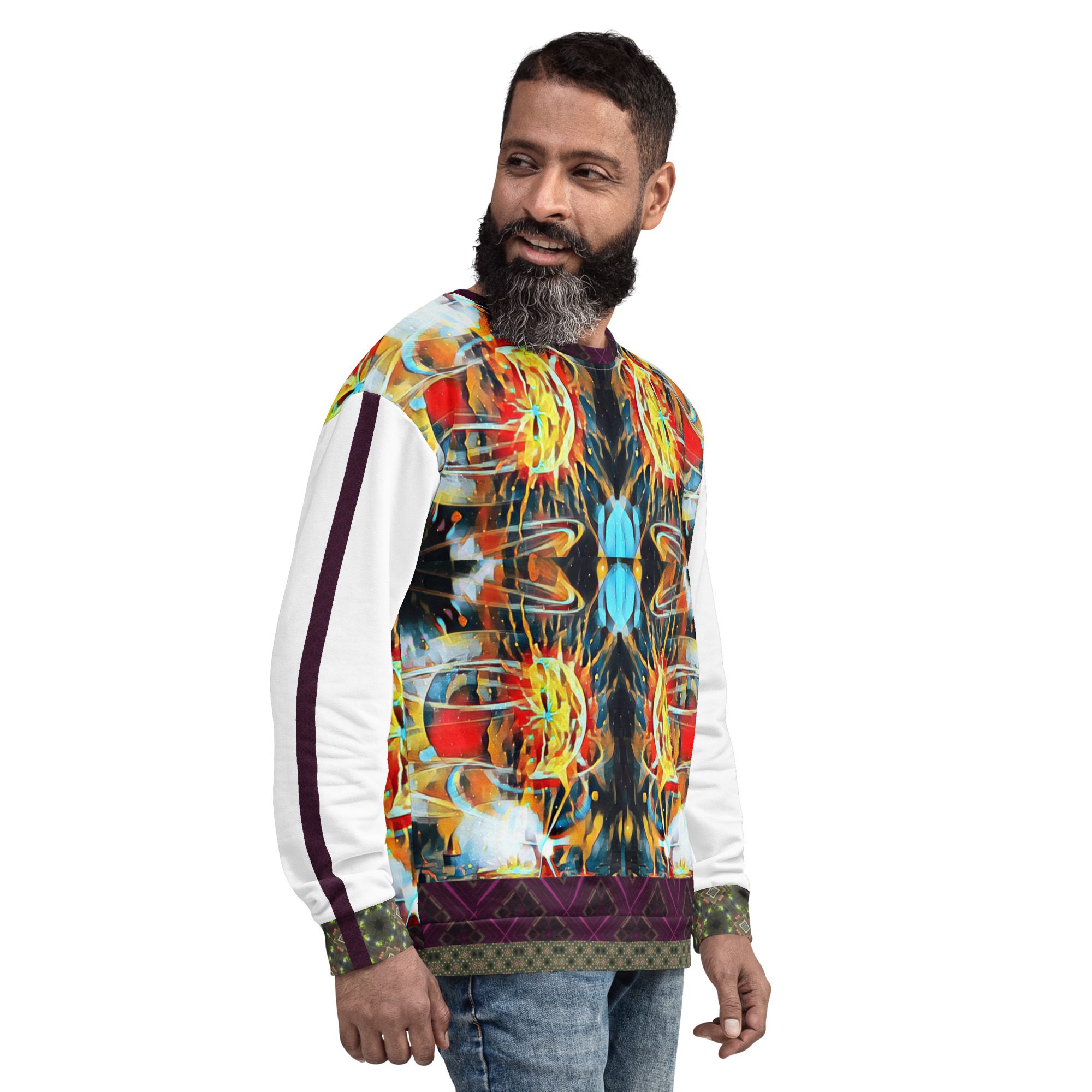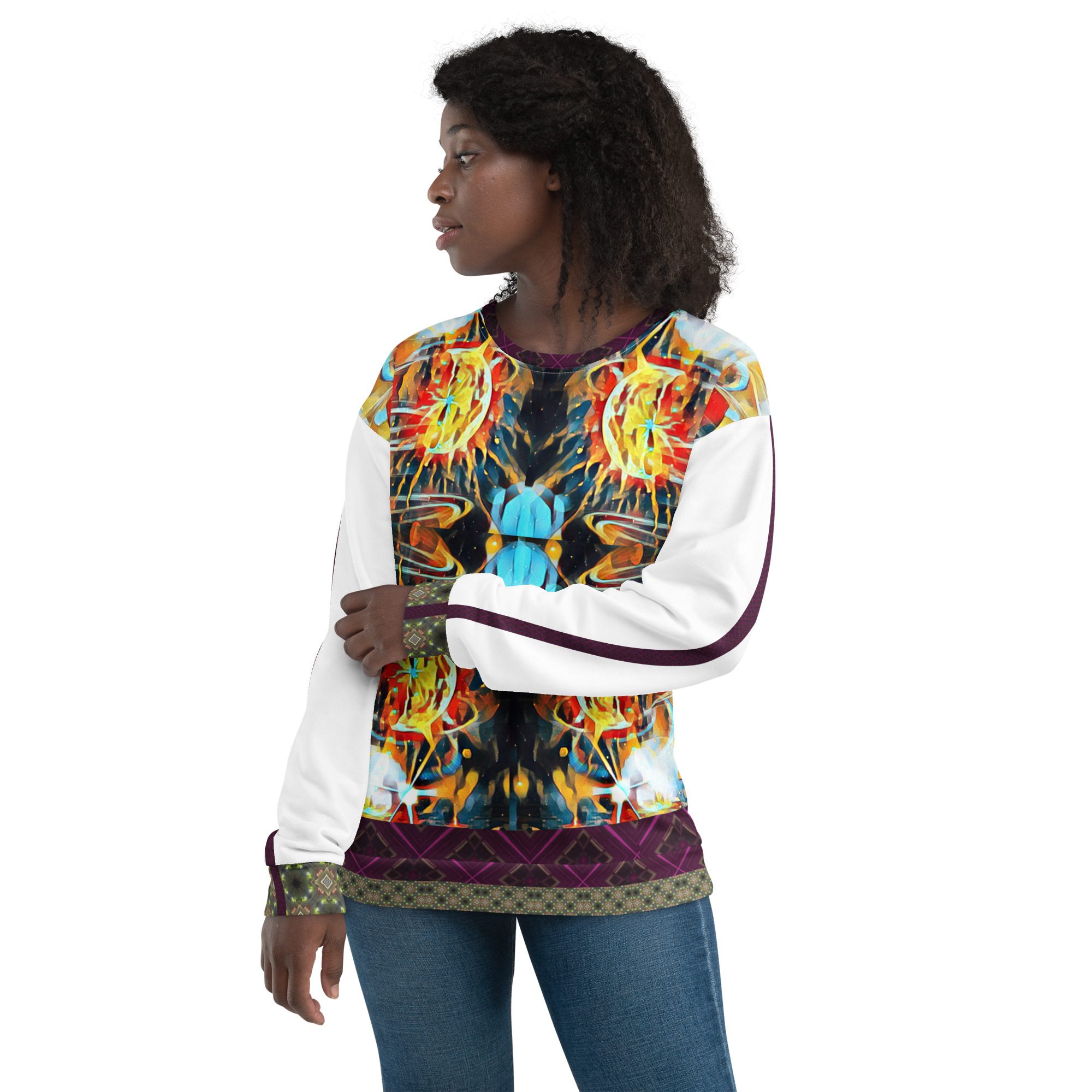 Ideal for lovers of abstract art apparel, cosmic prints, galaxy-inspired clothing, colorful streetwear, bold graphic sweatshirts, artistic fashion, statement tops, and unique designer pieces. A perfect choice for fans of futuristic aesthetics, psychedelic patterns, festival fashion, and handcrafted artwork on sustainable clothing.