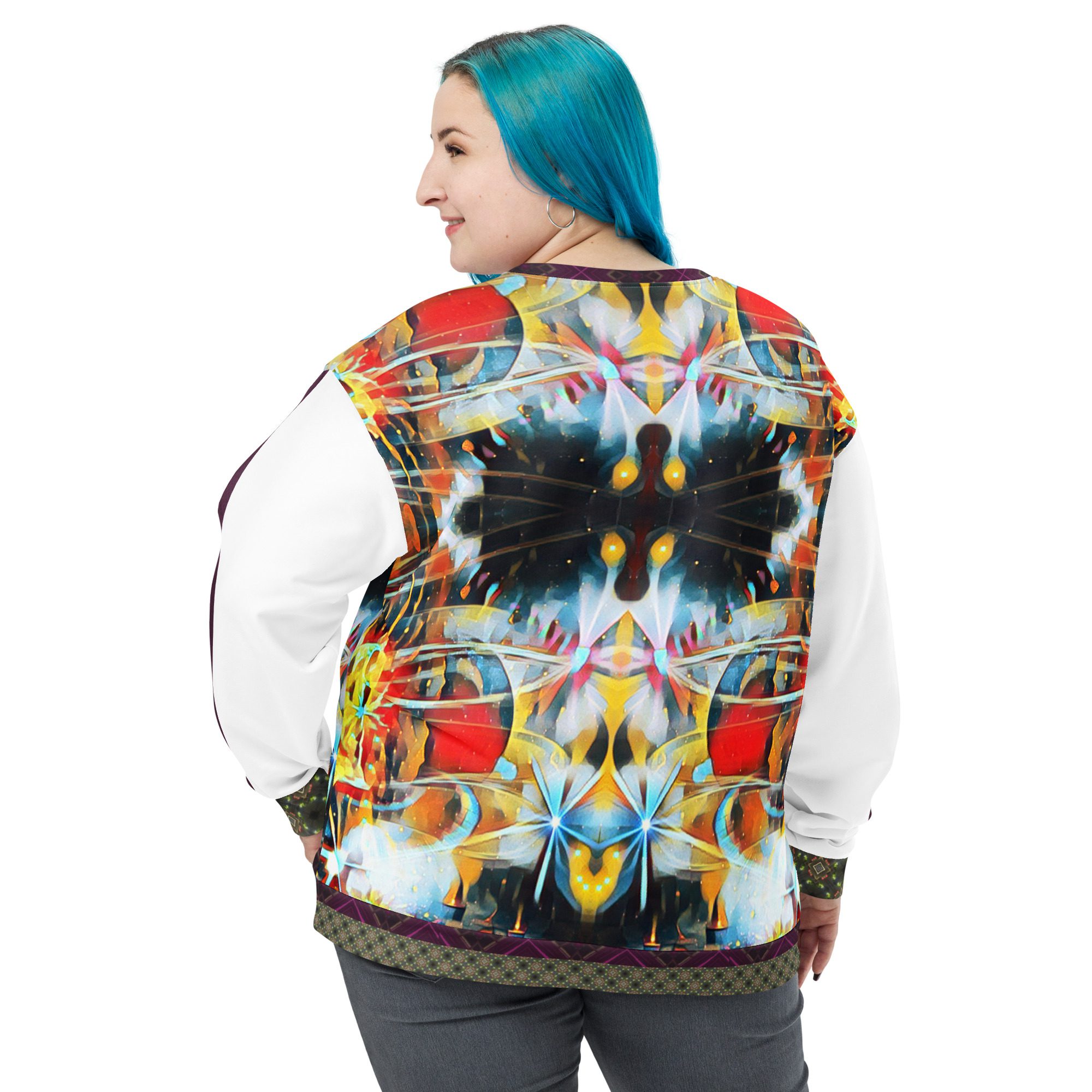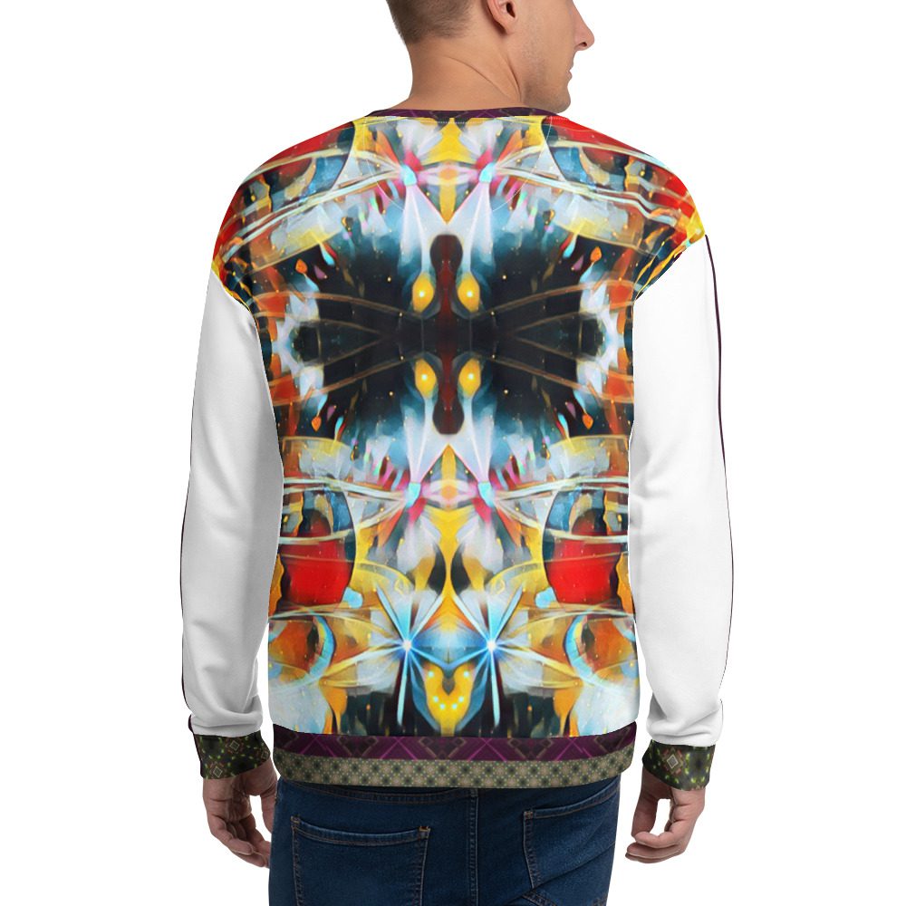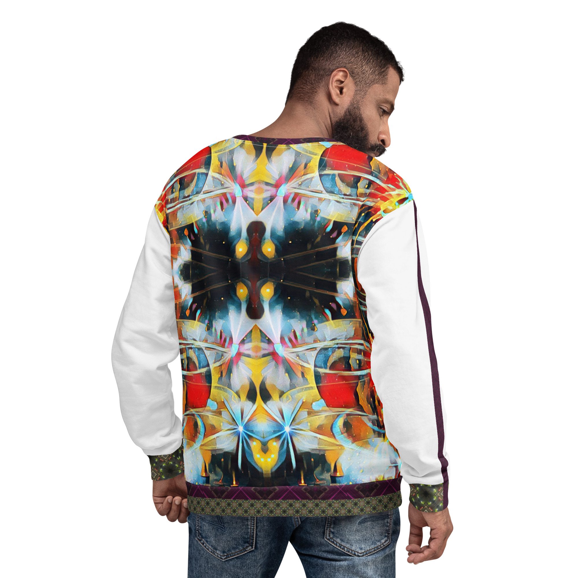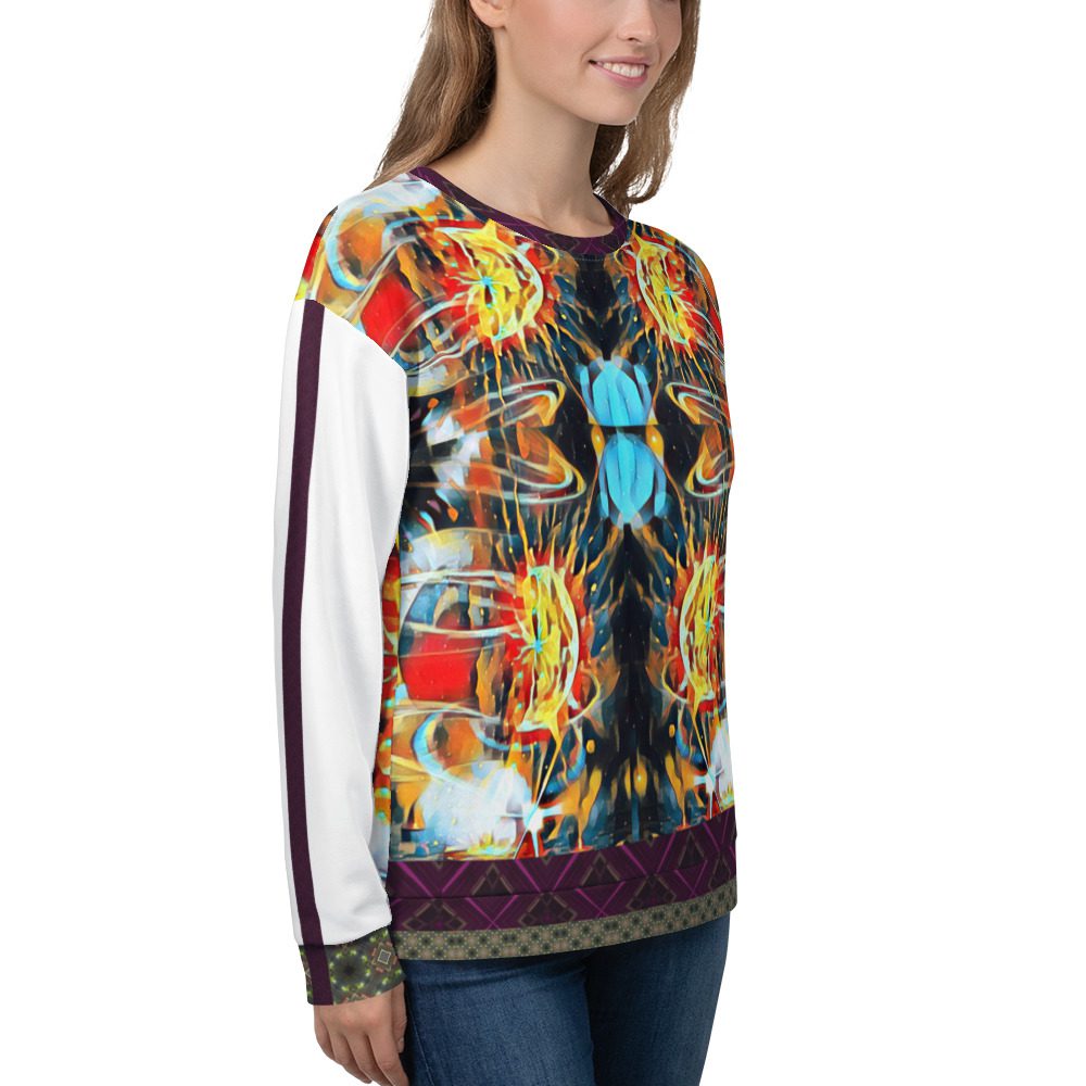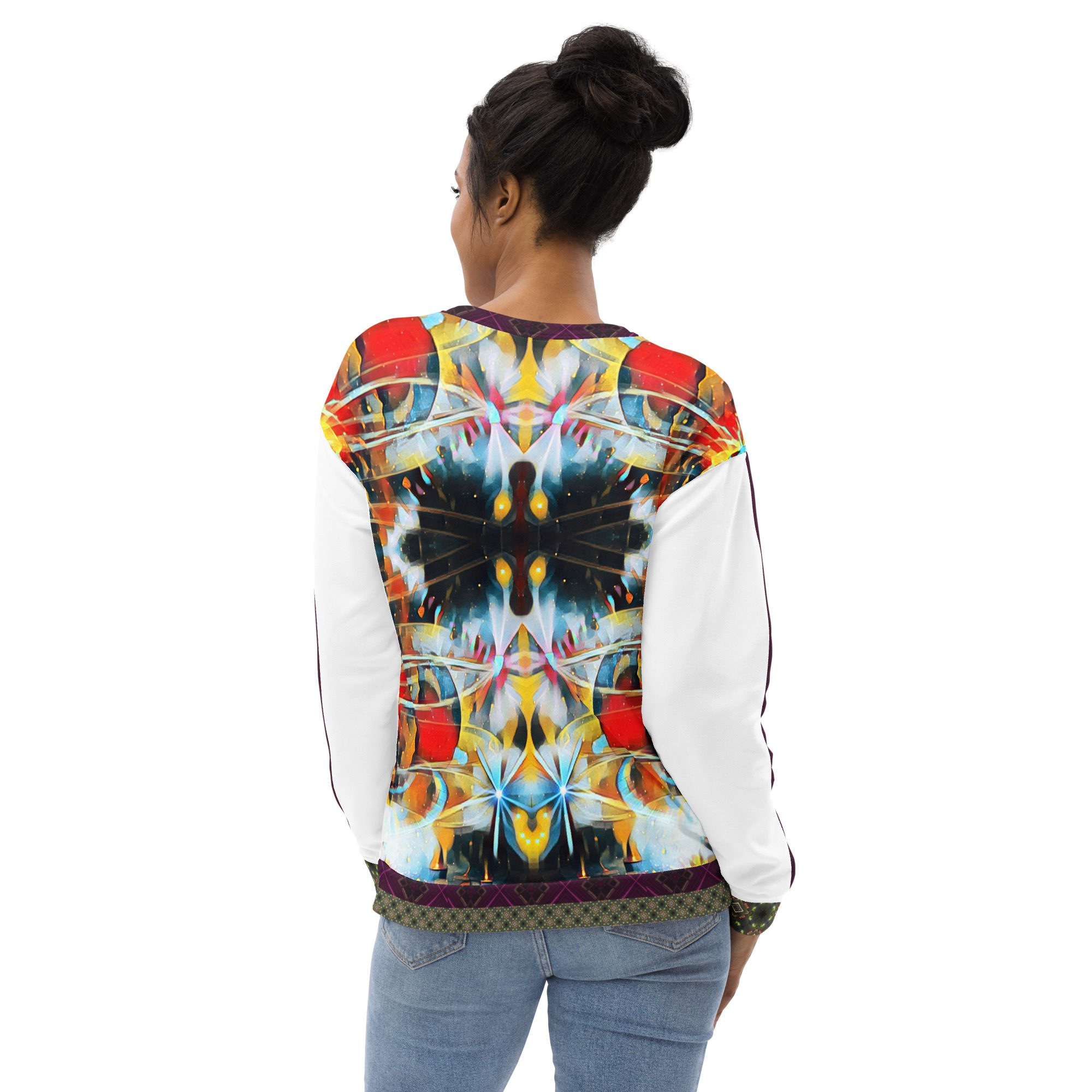 Ideal for lovers of abstract art apparel, cosmic prints, galaxy-inspired clothing, colorful streetwear, bold graphic sweatshirts, artistic fashion, statement tops, and unique designer pieces. A perfect choice for fans of futuristic aesthetics, psychedelic patterns, festival fashion, and handcrafted artwork on sustainable clothing.