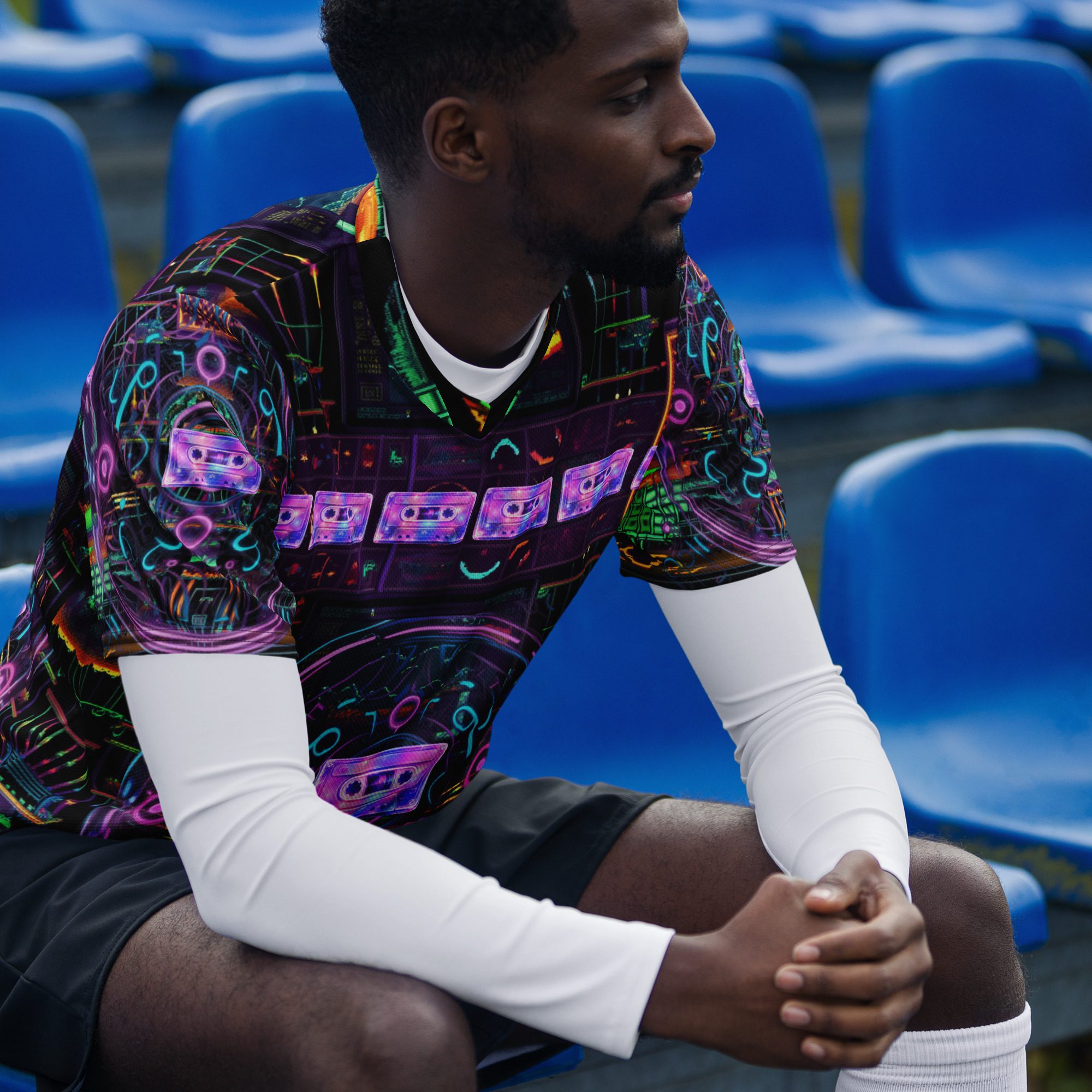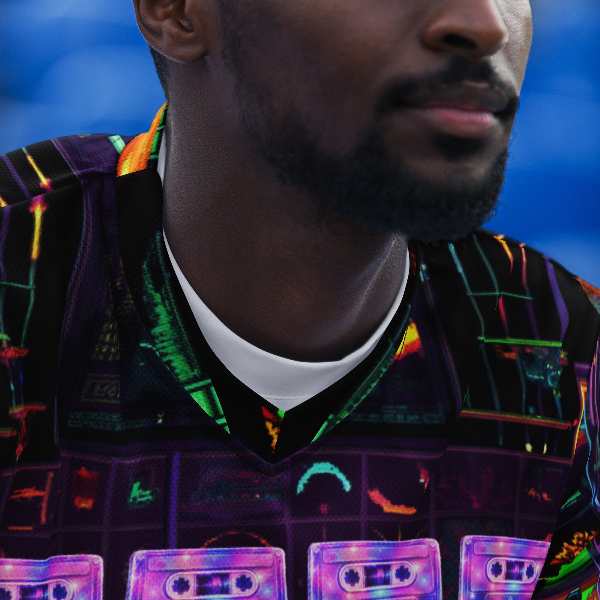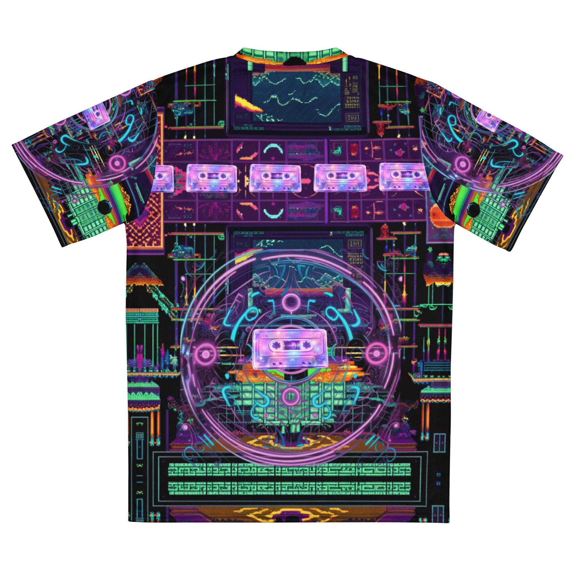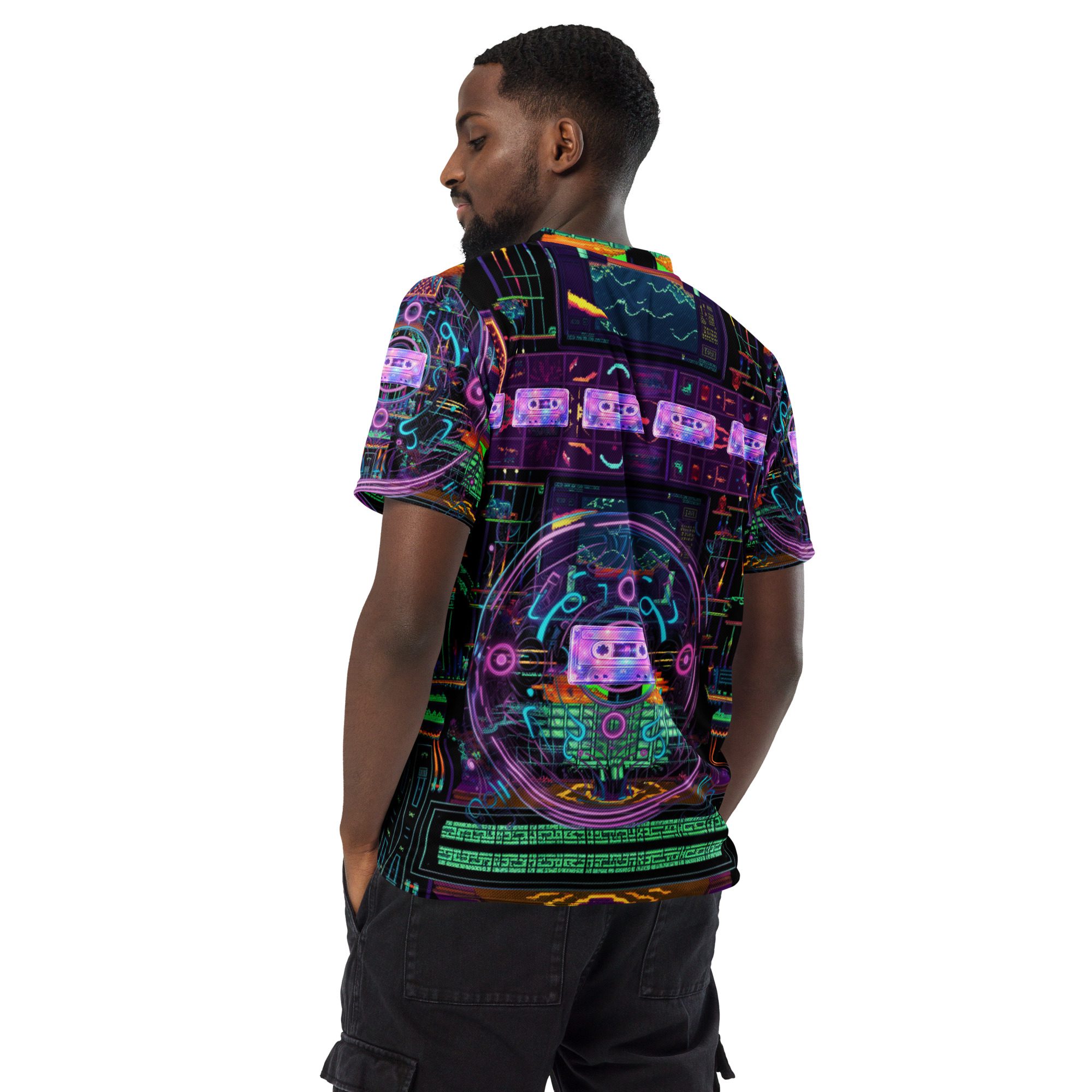 Rave Relic 2000 channels underground rave culture, neon circuitry, cassette nostalgia, cyber grids, and retro-futurist chaos into a wearable artifact that feels pulled straight from a forgotten warehouse party at the edge of the millennium. Electric purples, glitch greens, holographic symbols, and techno-relic visuals collide to create a jersey that looks alive under lights, movement, and sound.