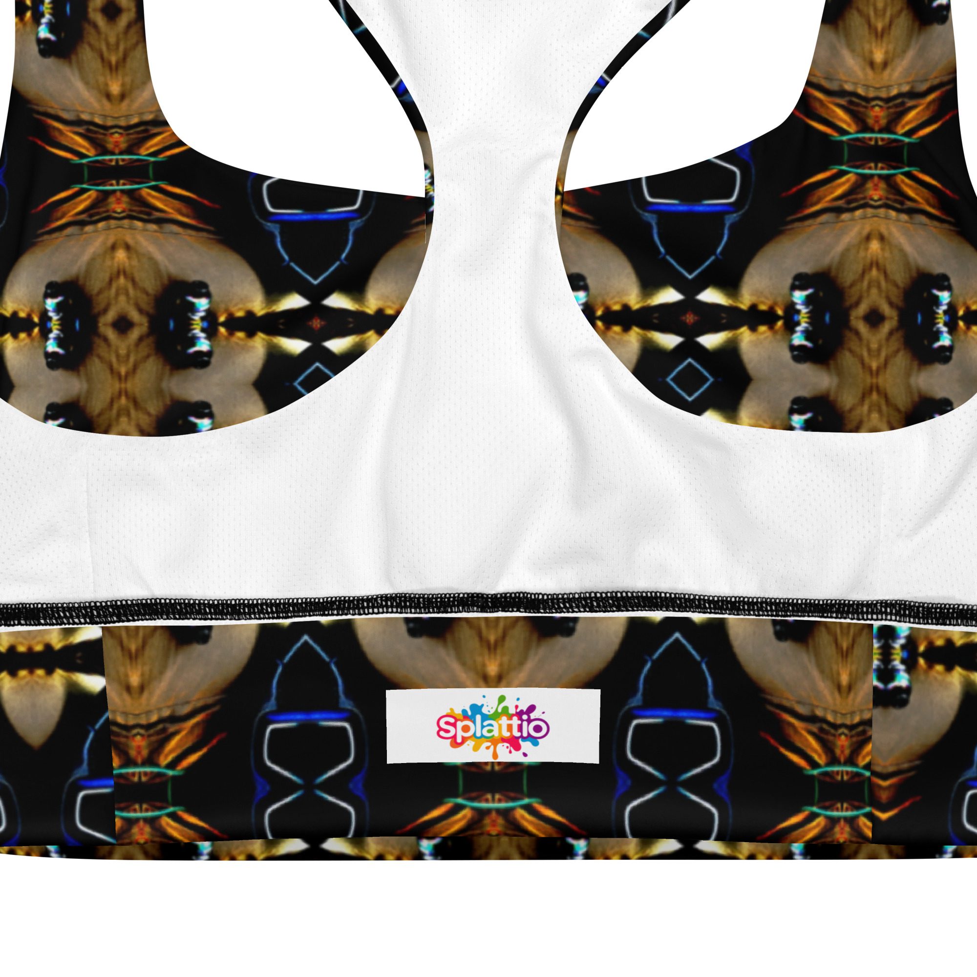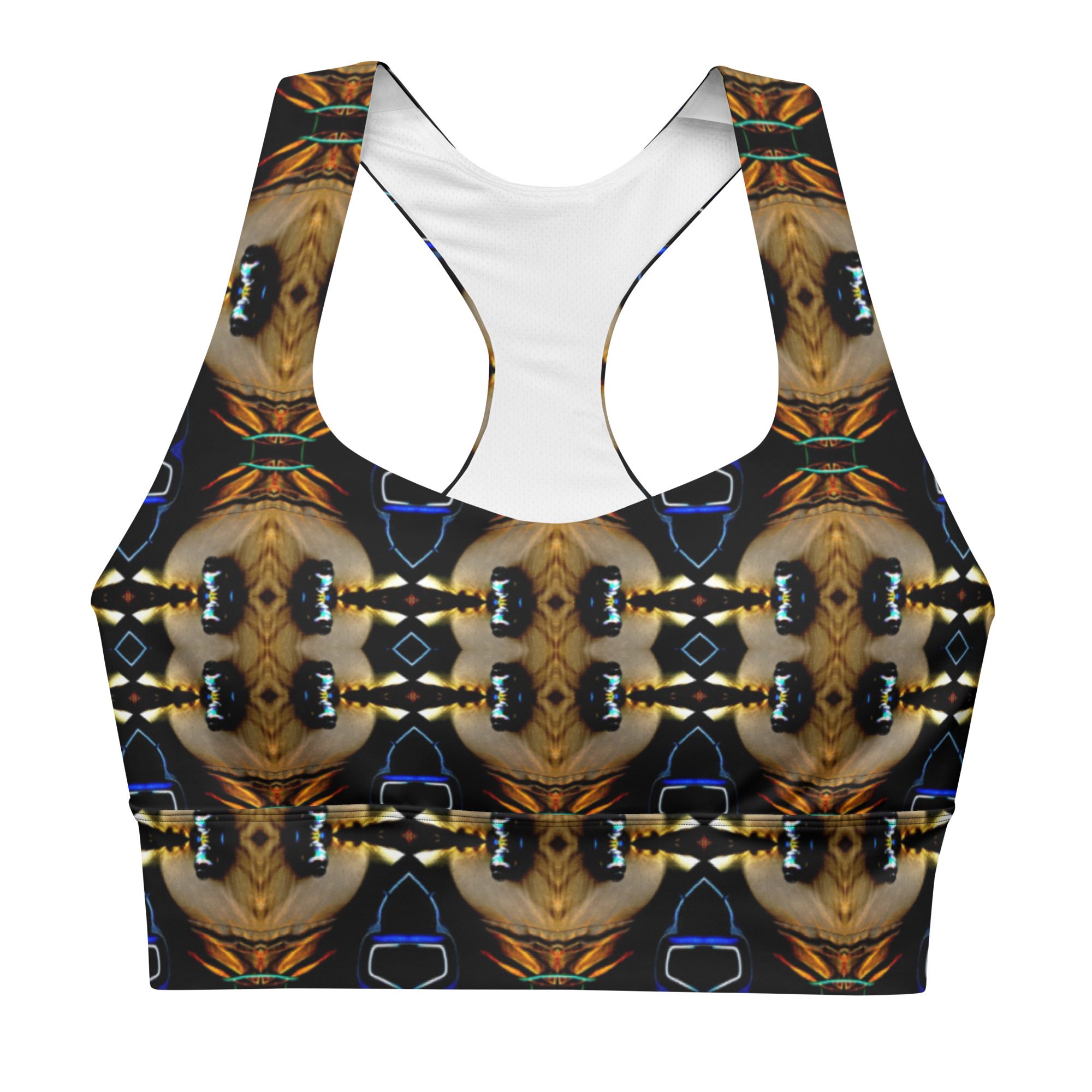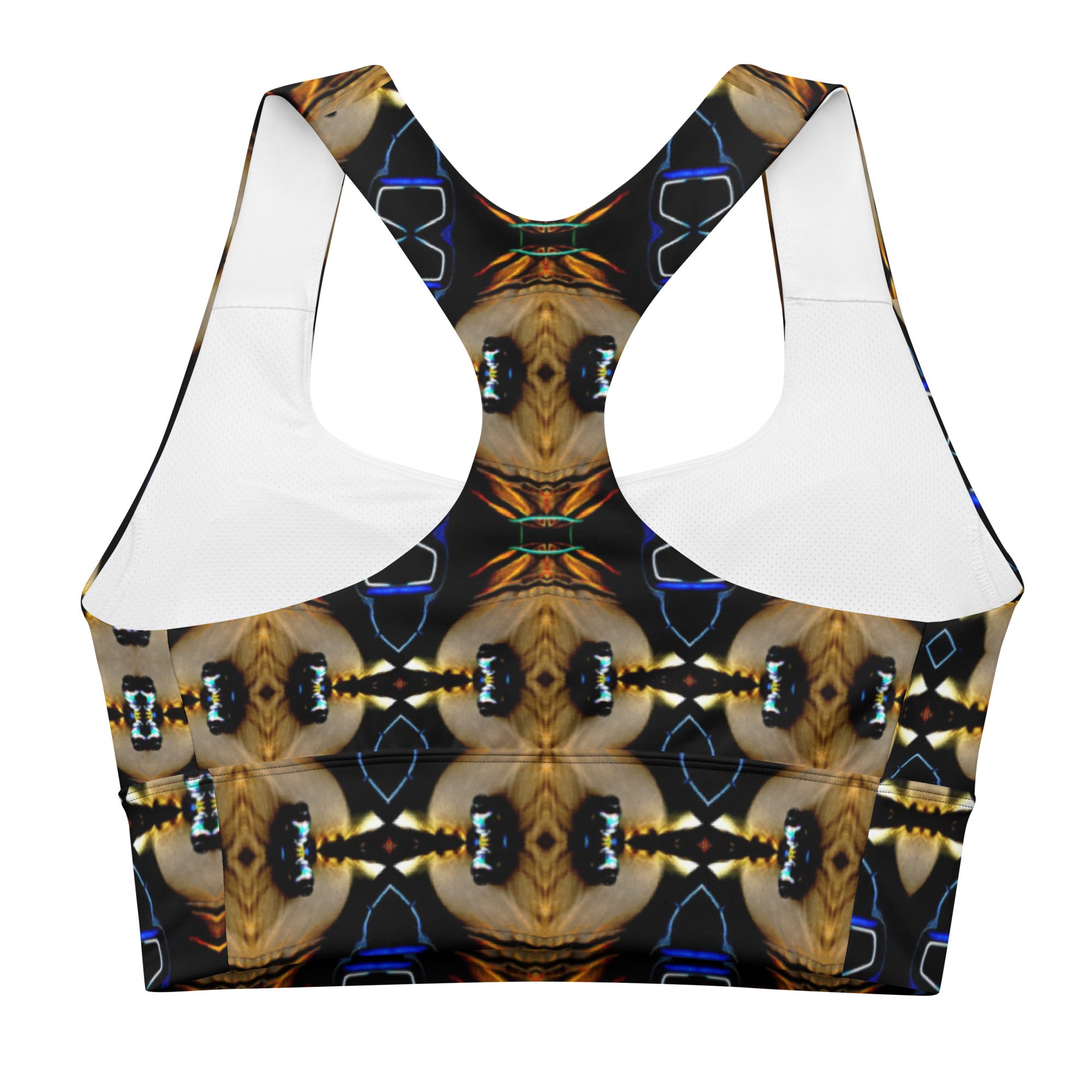 Bring bold elegance into every workout with this all-over print longline sports bra featuring Afterglow’s Noir Mirage, a hypnotic gold-and-ink kaleidoscope pattern crafted from original artwork by Jaysen Mansfield. Designed for comfort, support, and high-impact style, this recycled sports bra blends performance fabric with artistic luxury — perfect for gym sessions, yoga, athleisure outfits, or daily wear.