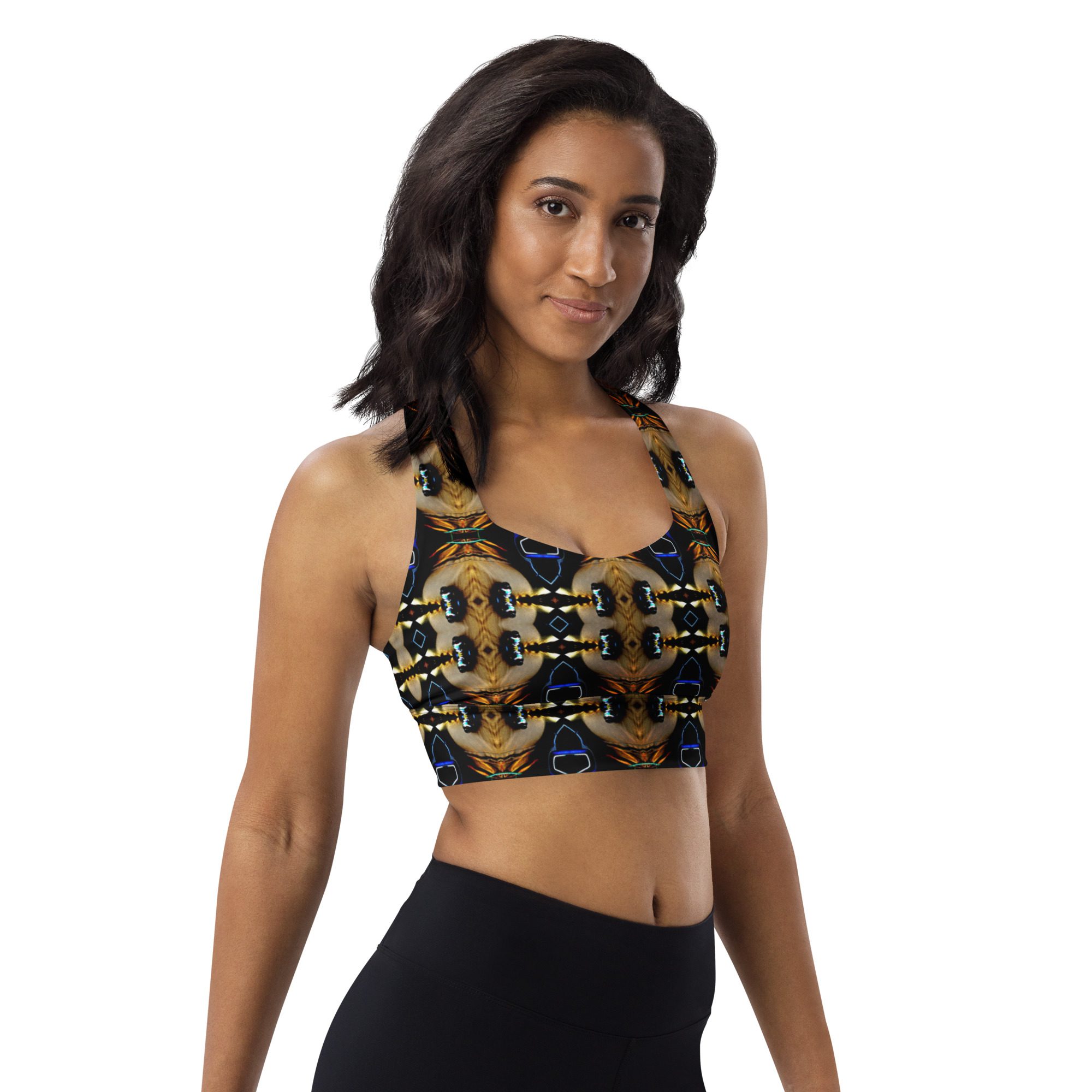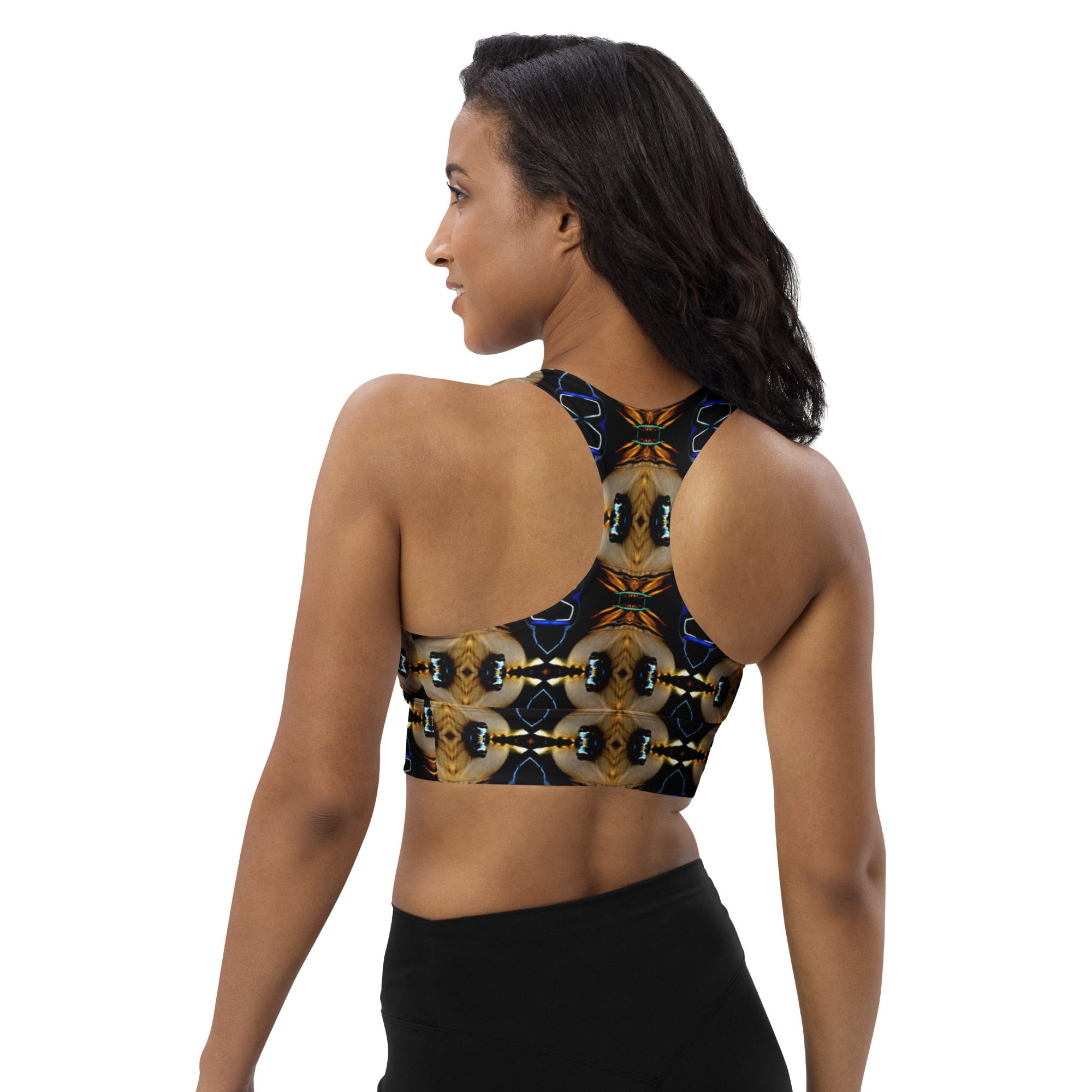 Recycled Longline Sports Bra – Afterglow’s Noir Mirage – Original Artwork by Jaysen Mansfield.