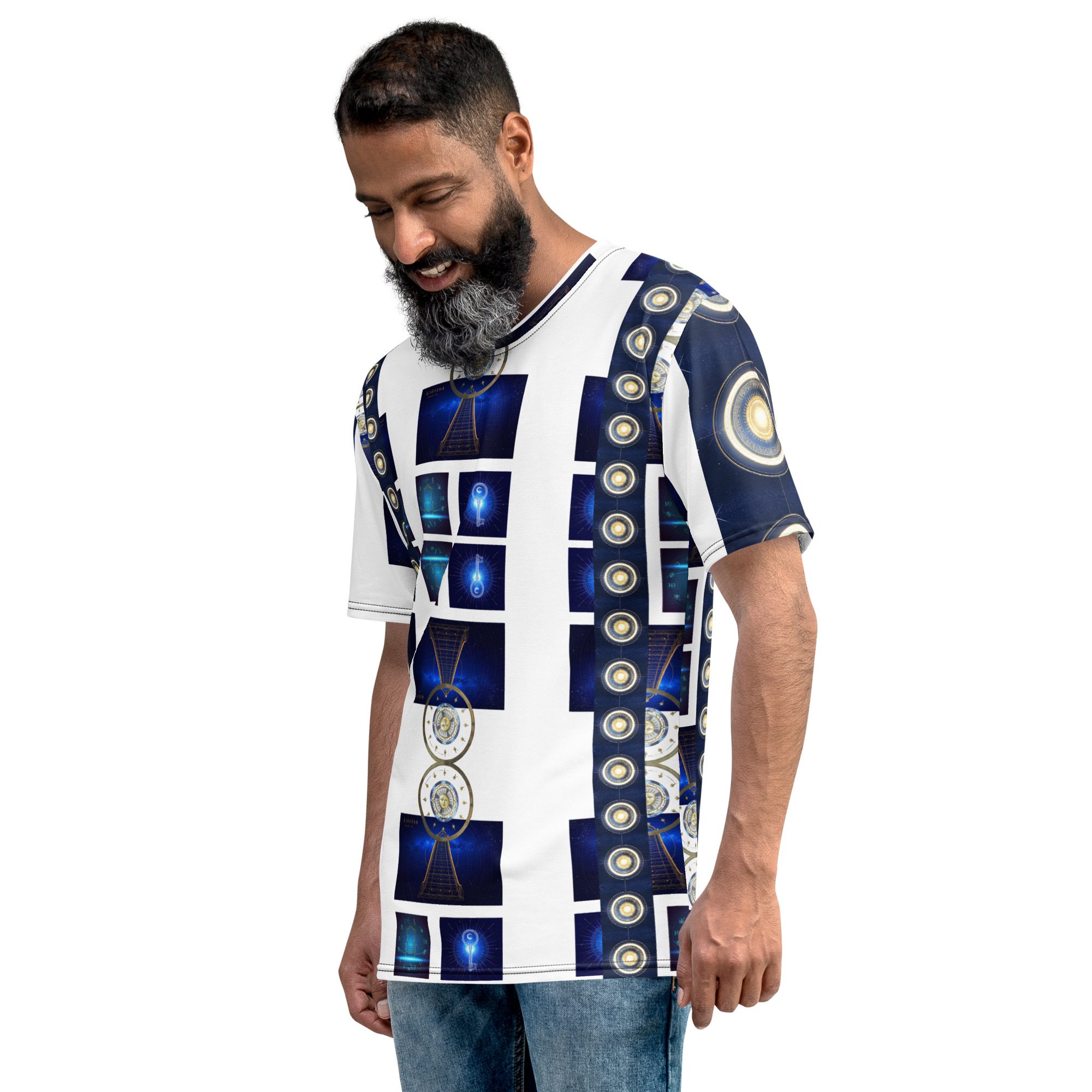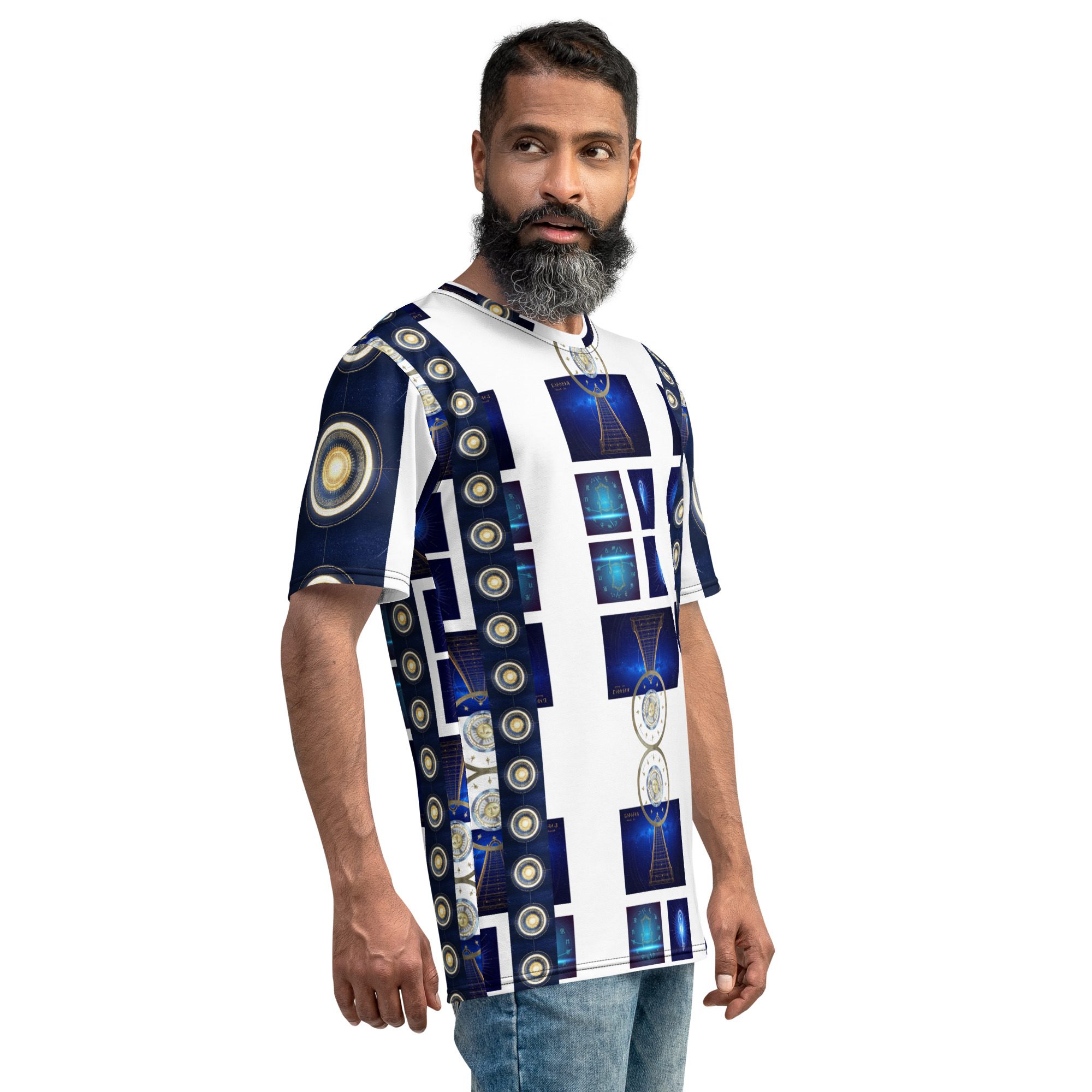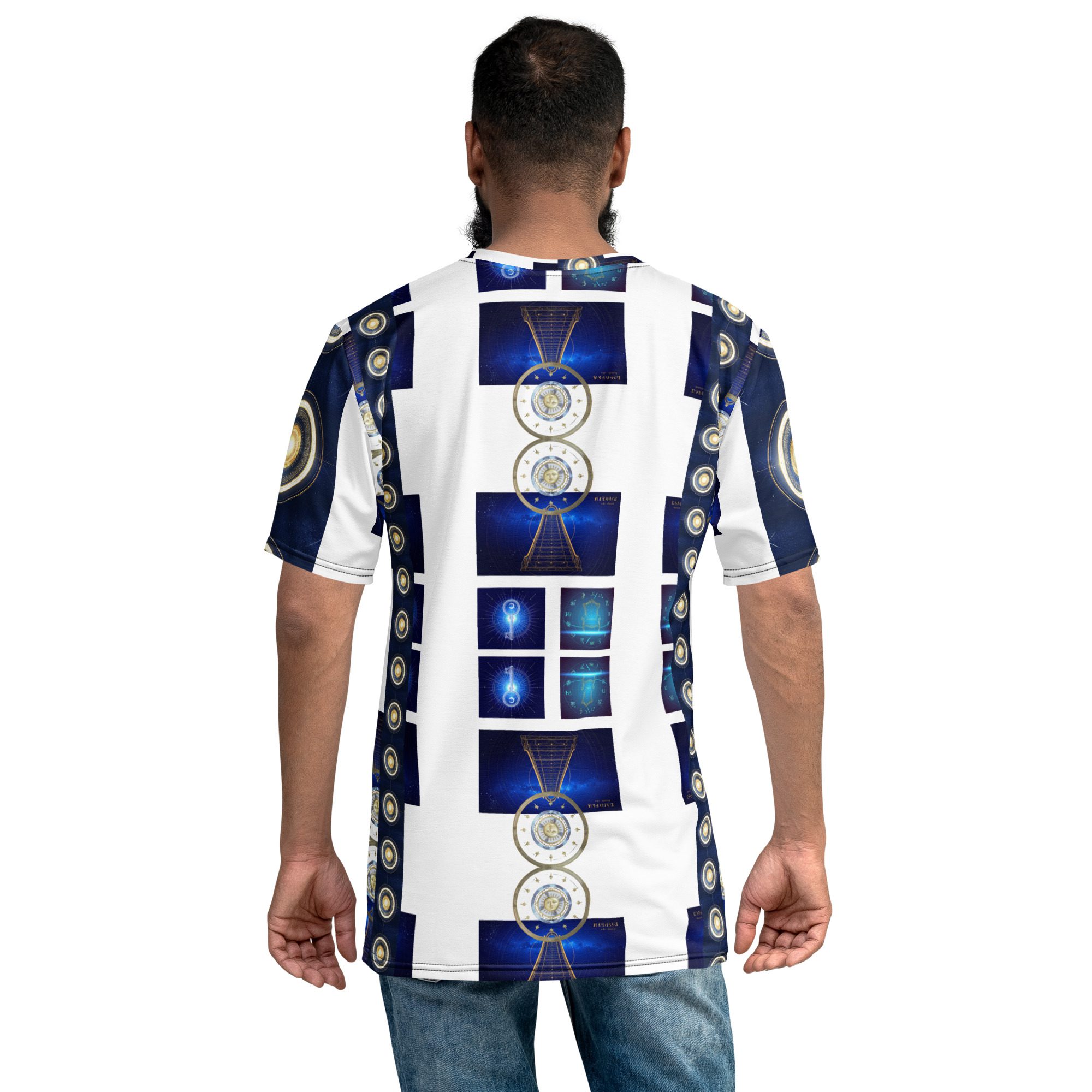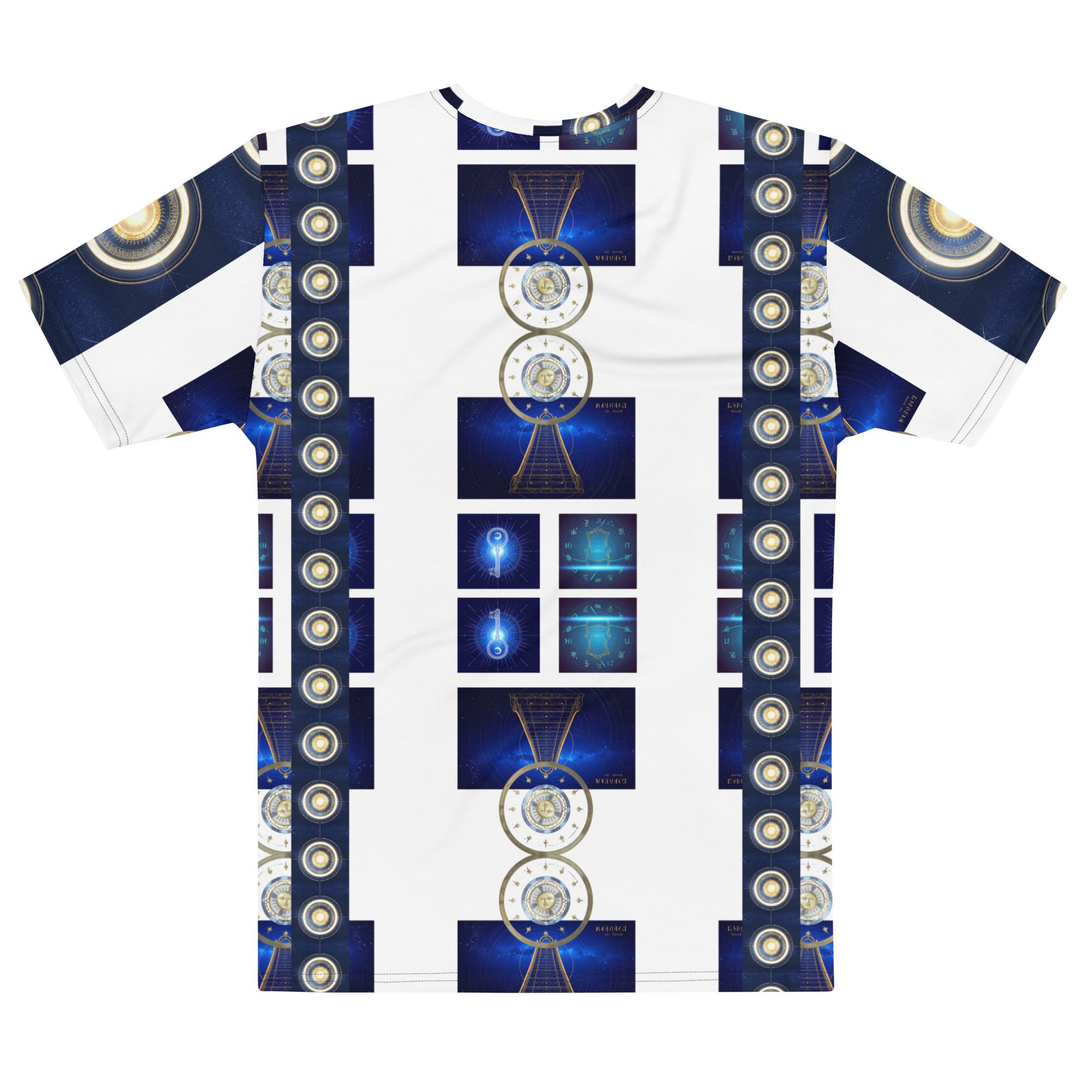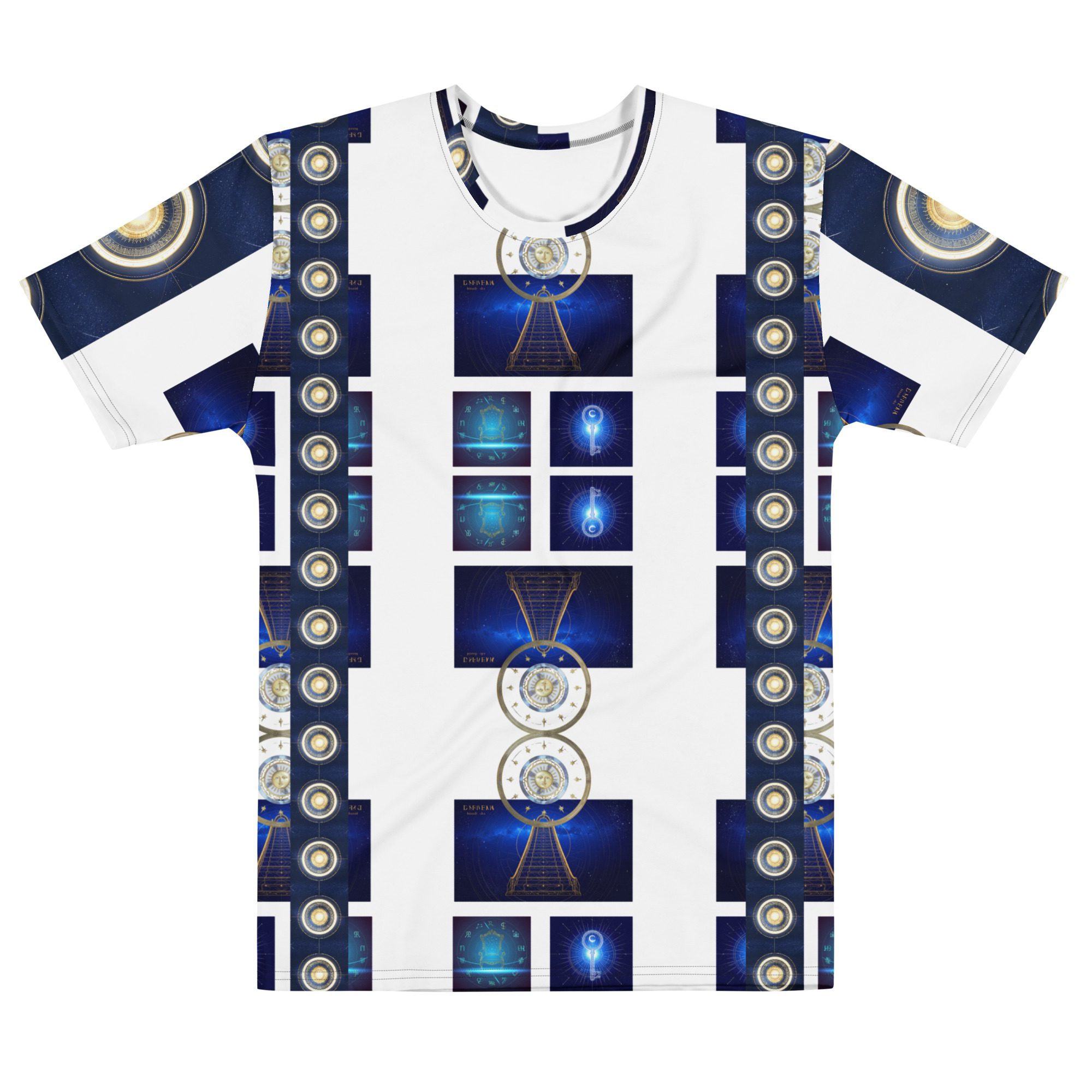 The layered graphic panels create a striking visual pathway across the shirt, blending deep galaxy blues with radiant golden symbols reminiscent of star maps, planetary alignment, and spiritual energy diagrams. The repeating cosmic structures echo the idea that the universe is built upon beautiful patterns, mathematical harmony, and universal balance.