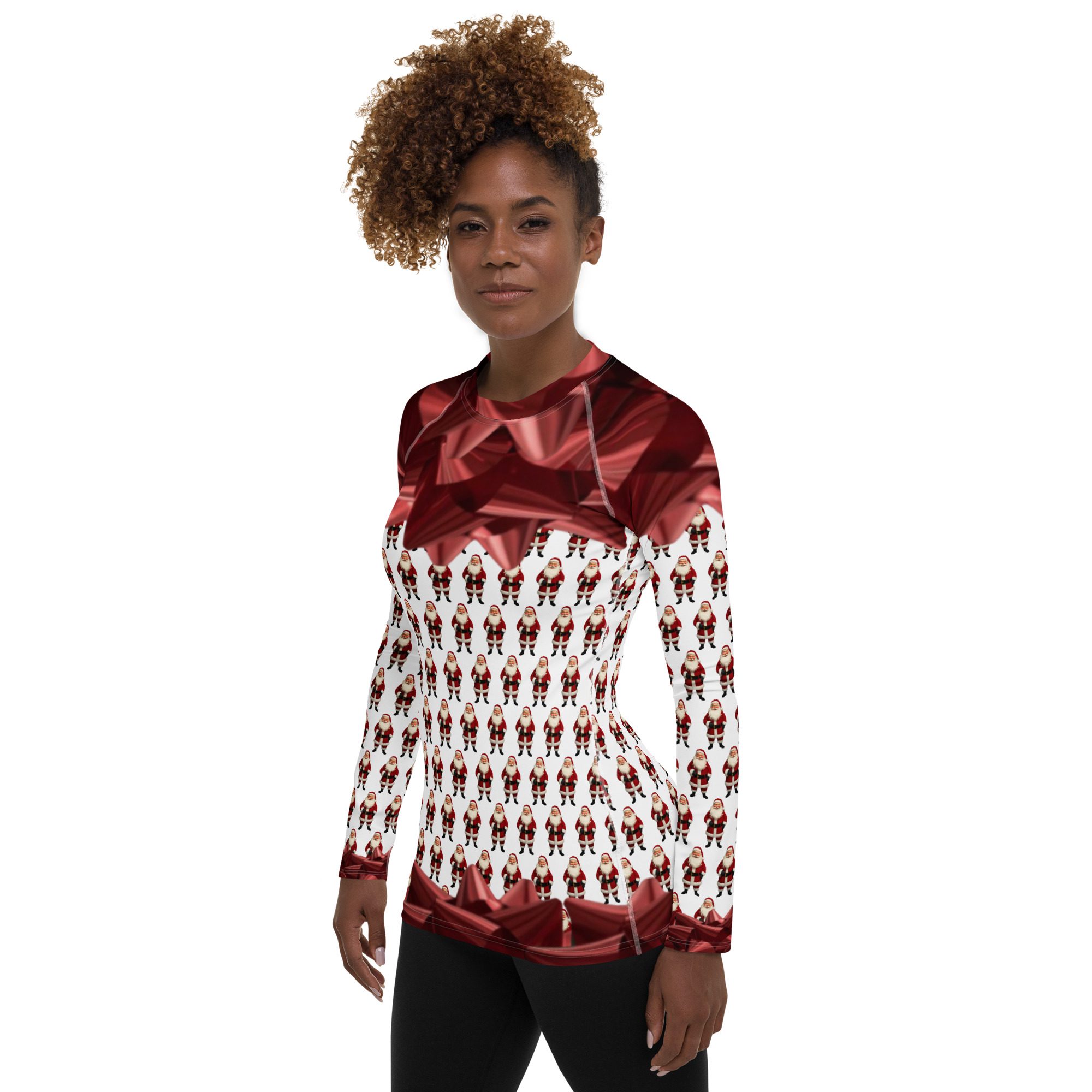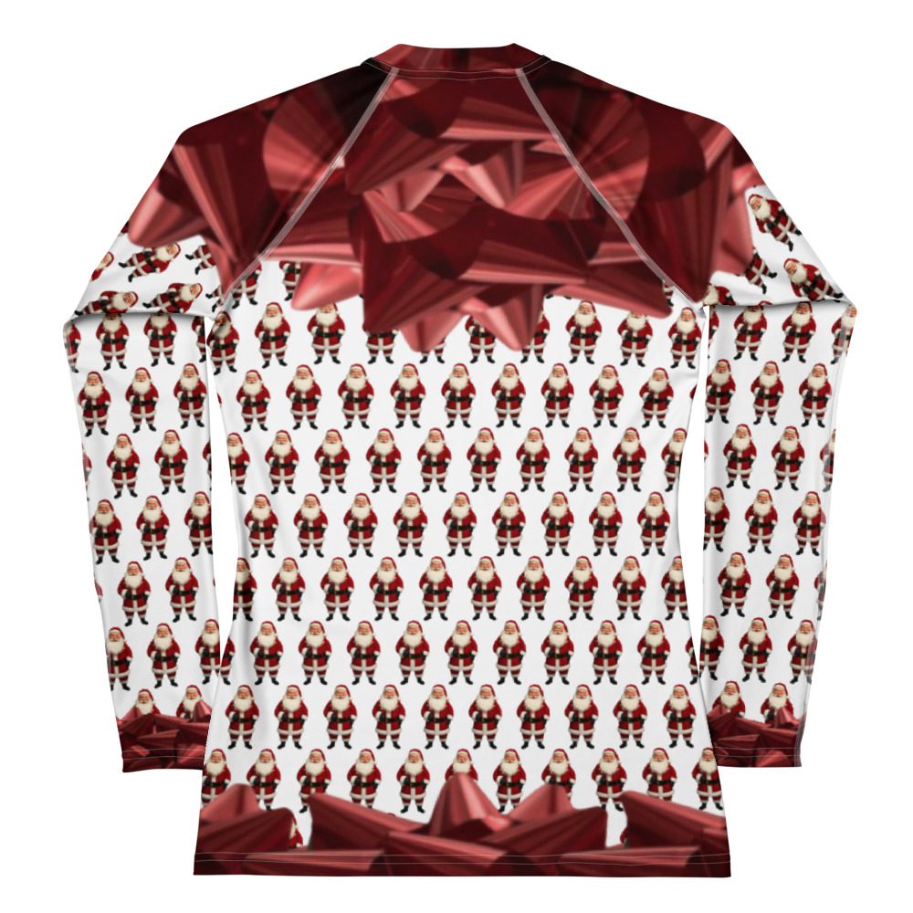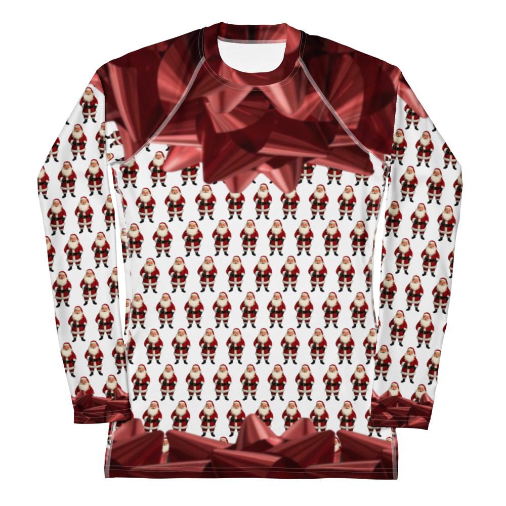 Stay merry and in motion with Santa’s Squad Ugly Christmas Rash Guard. An original festive artwork by Jaysen Mansfield. This vibrant holiday rash guard combines comfort and cheer with a playful pattern of classic Santas surrounded by deep red gift bows and emerald accents.
