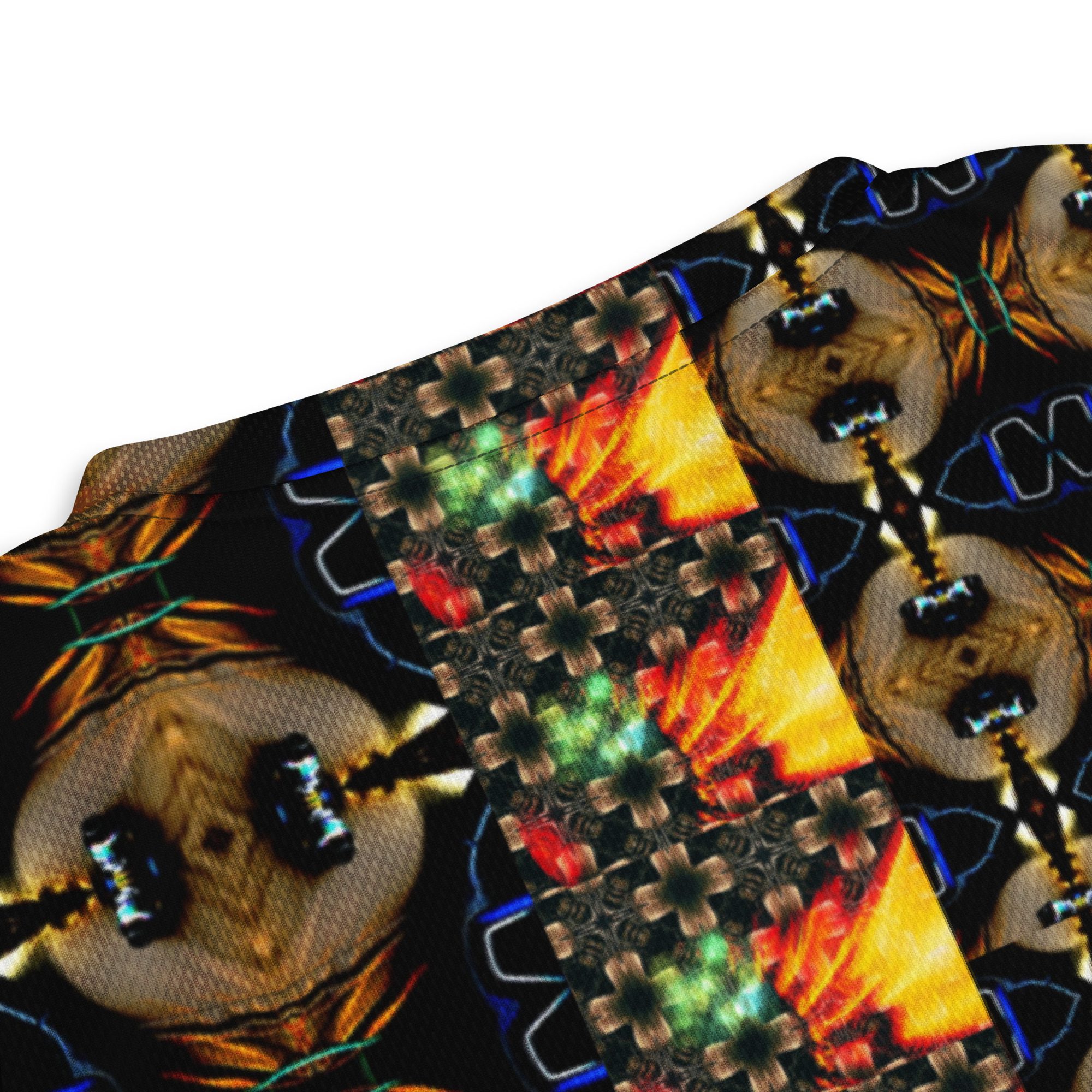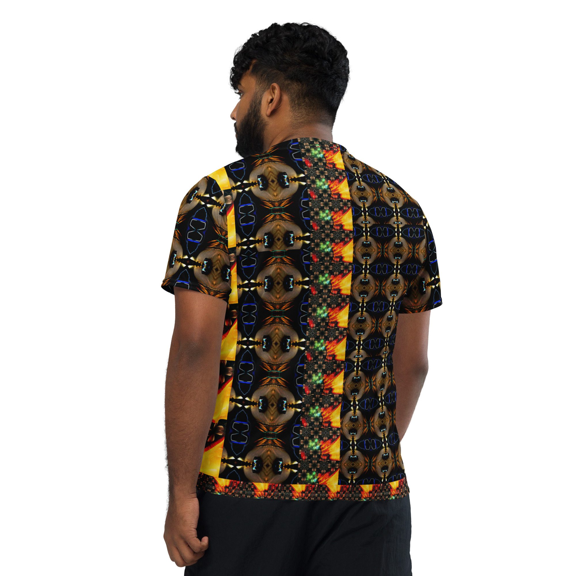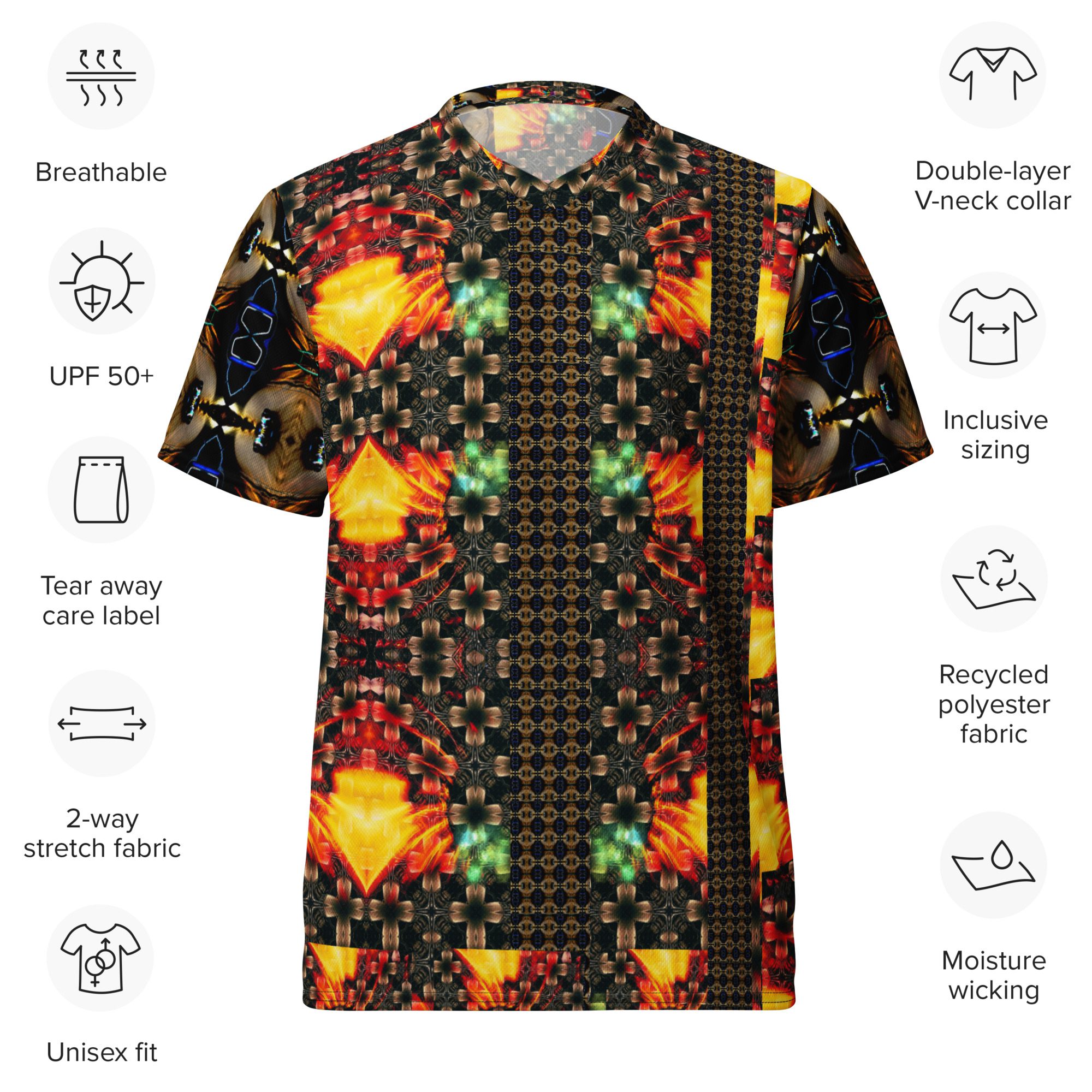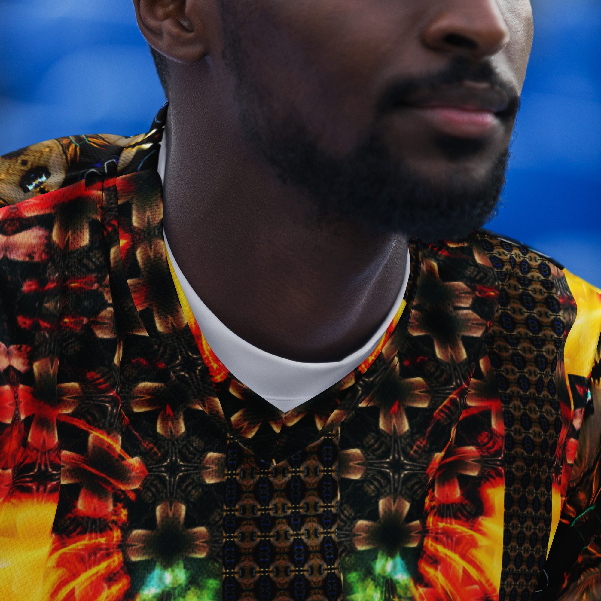 This vibrant, fire-infused jersey erupts with molten reds, neon yellows, deep ember tones, and a kaleidoscopic energy that embodies movement, heat, and power. Designed from Jaysen Mansfield’s original artwork, this all-over print sports jersey elevates your athletic look with striking symmetry, bold color, and a premium recycled fabric that feels lightweight, breathable, and ultra-comfortable for workouts or everyday wear.