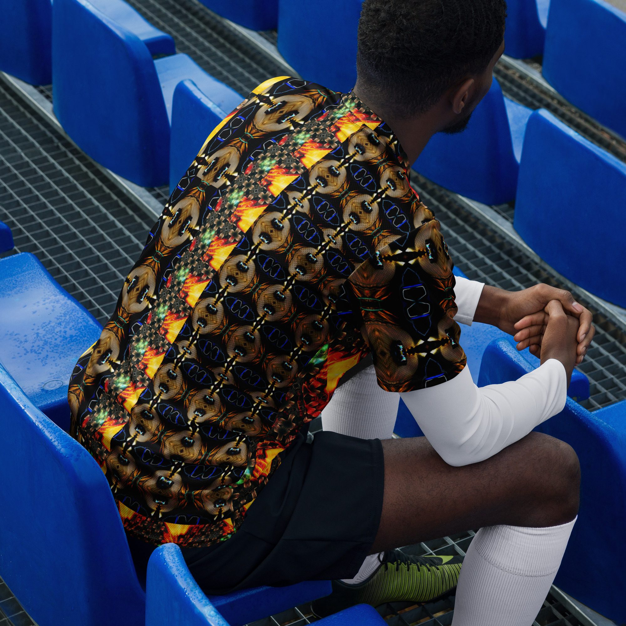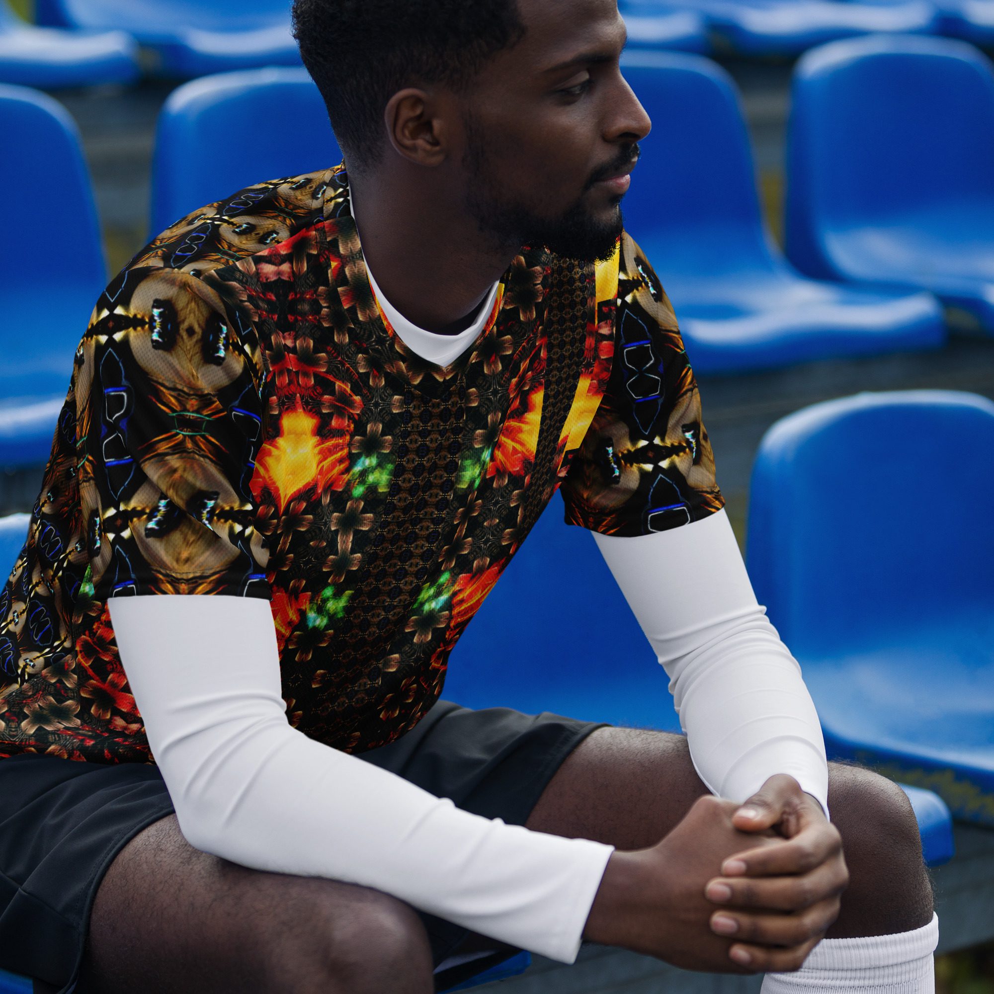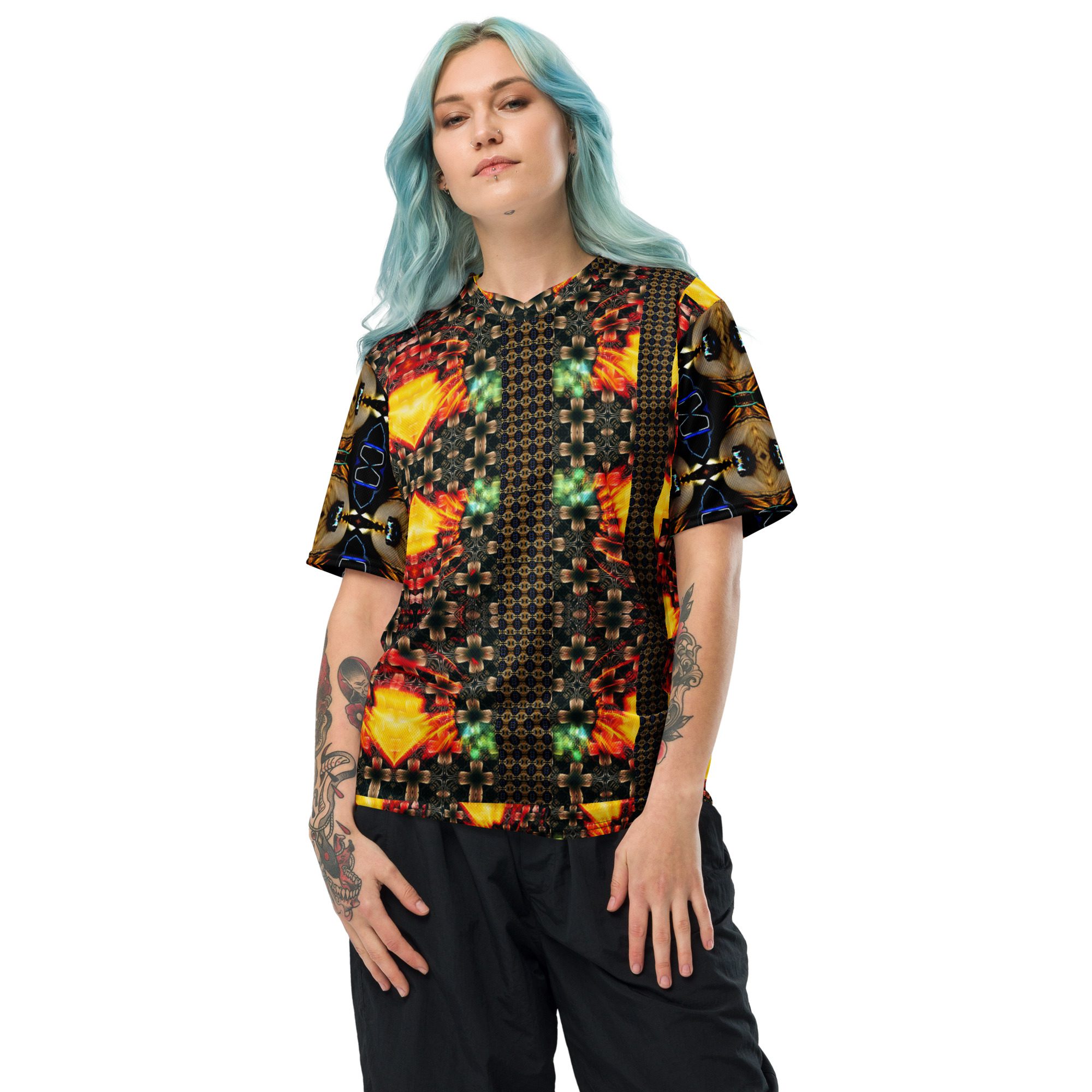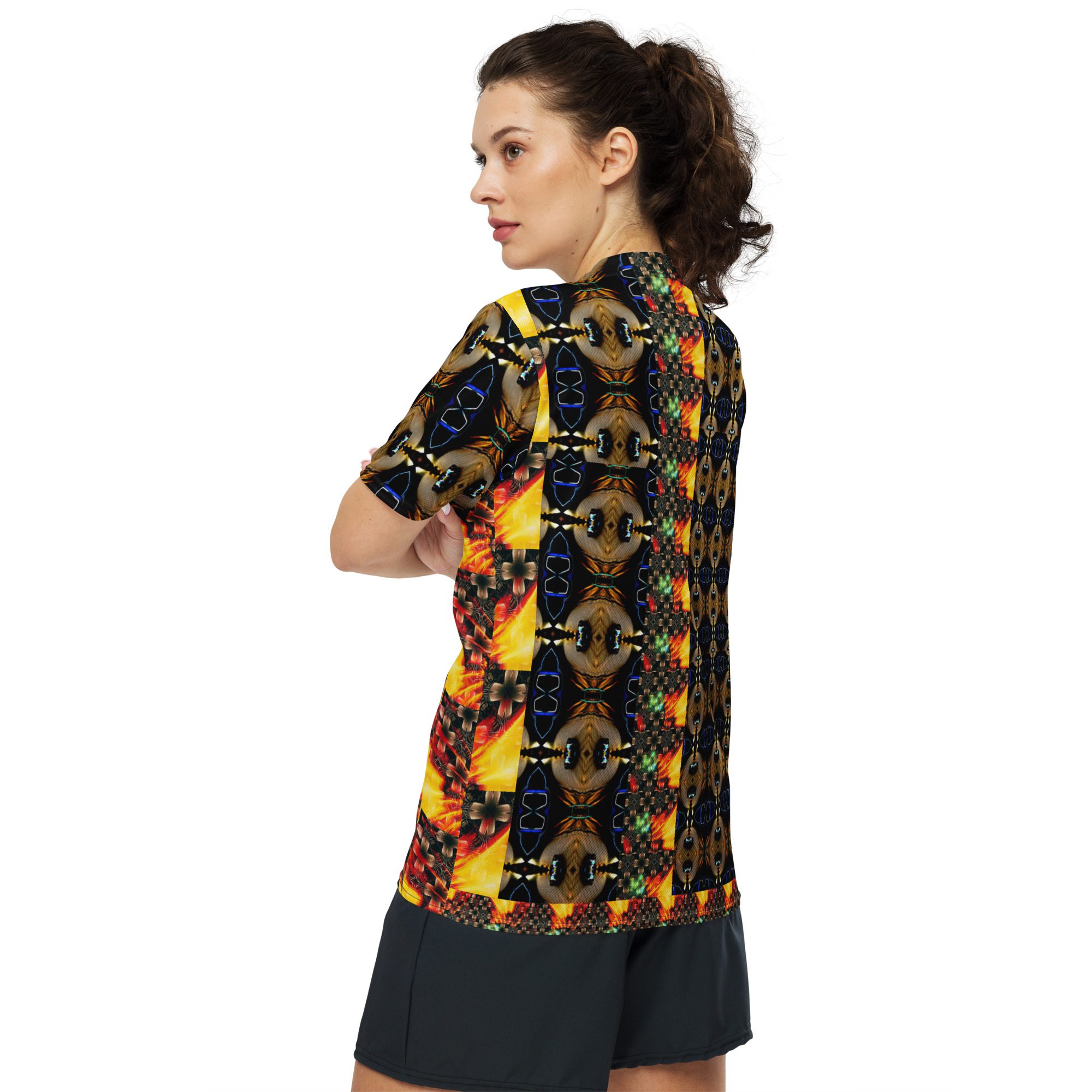 This vibrant, fire-infused jersey erupts with molten reds, neon yellows, deep ember tones, and a kaleidoscopic energy that embodies movement, heat, and power. Designed from Jaysen Mansfield’s original artwork, this all-over print sports jersey elevates your athletic look with striking symmetry, bold color, and a premium recycled fabric that feels lightweight, breathable, and ultra-comfortable for workouts or everyday wear.