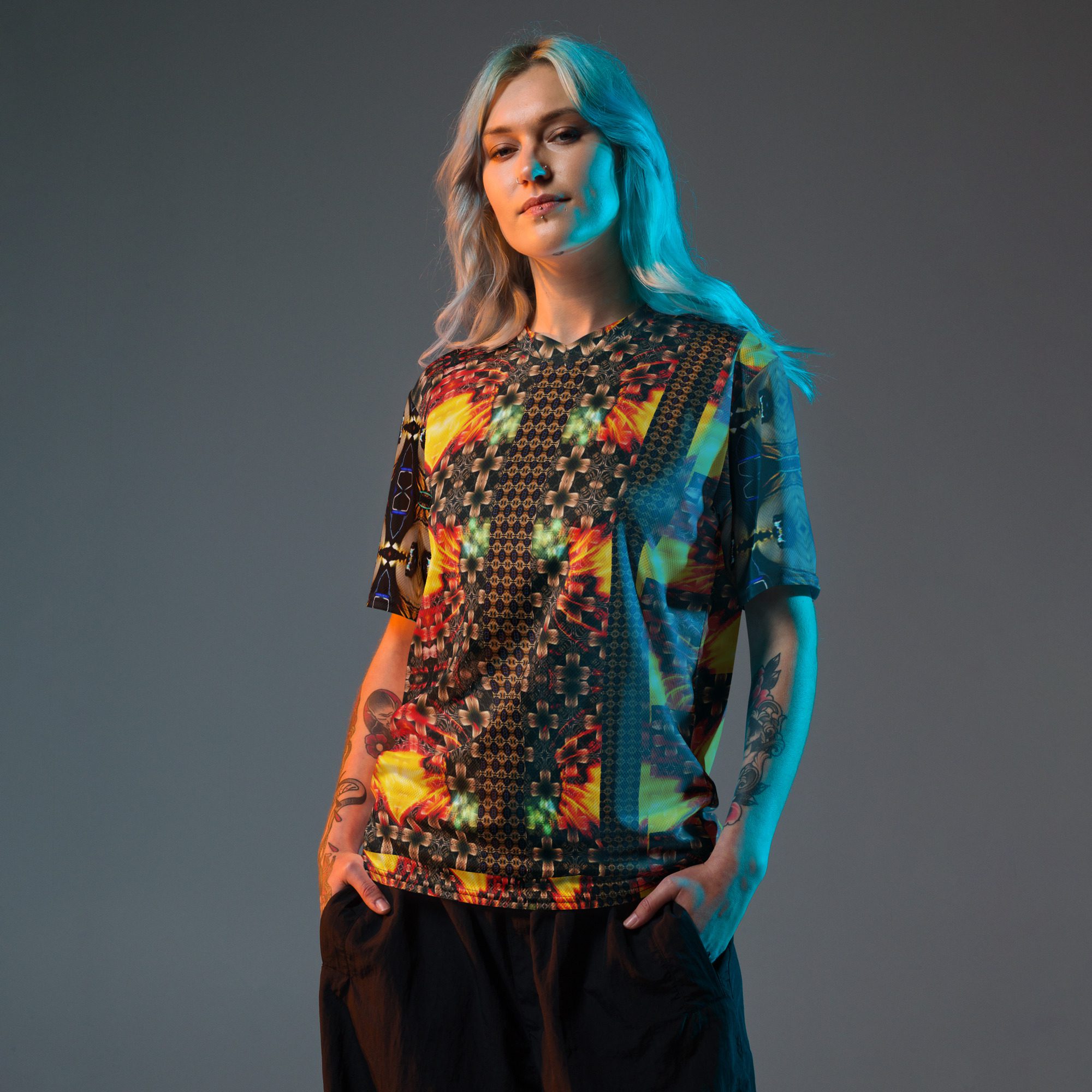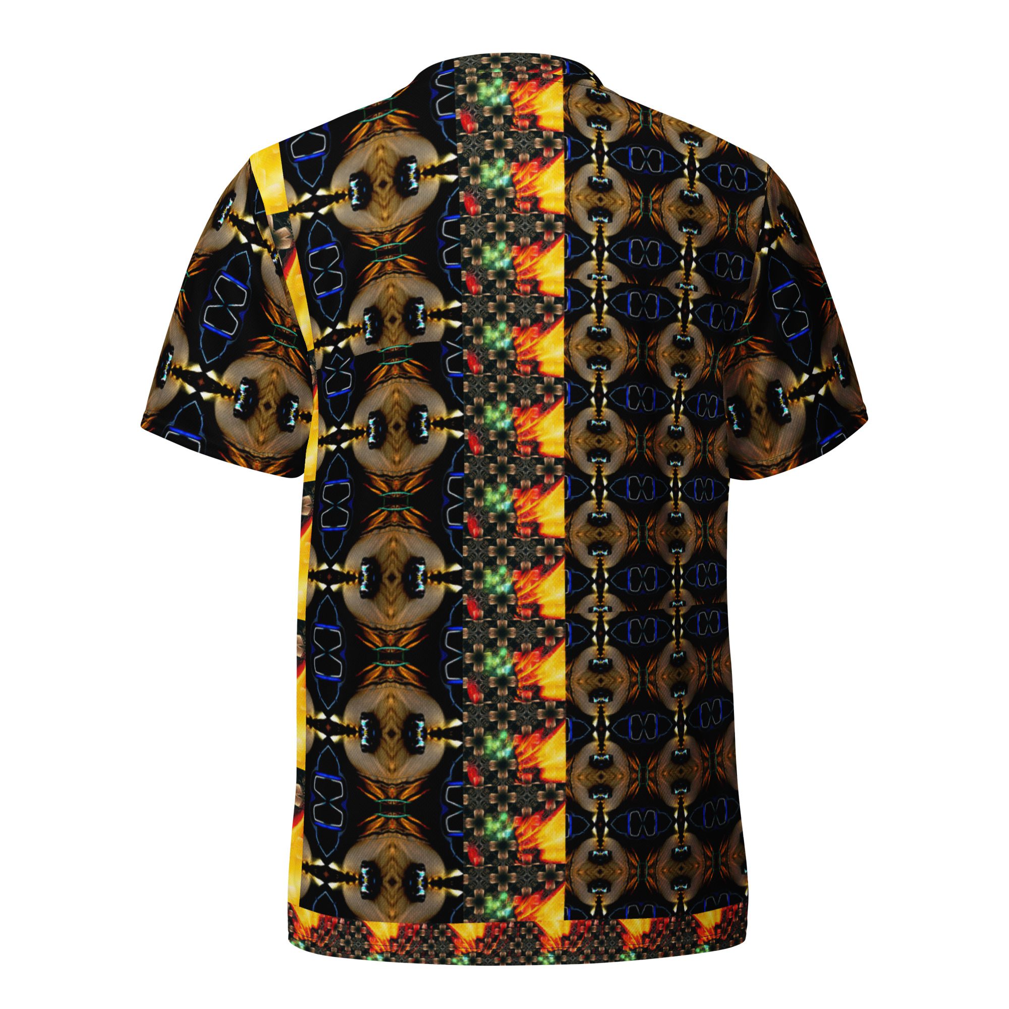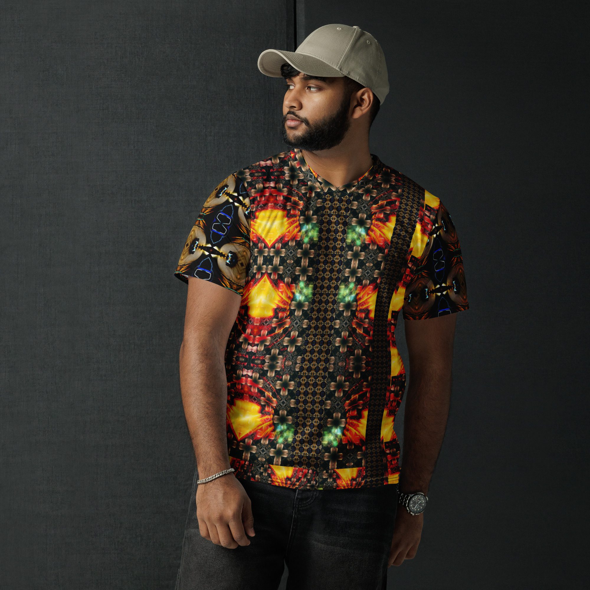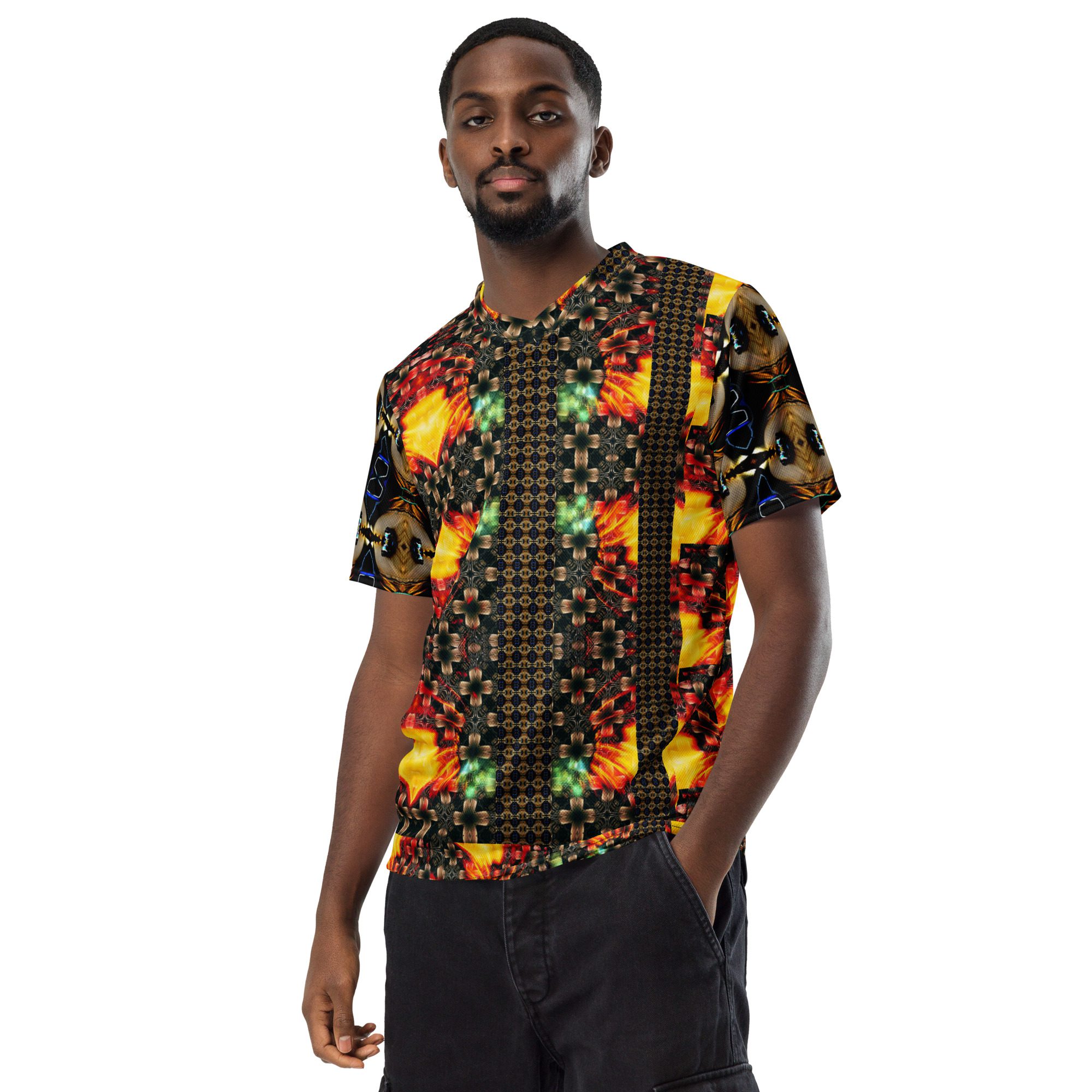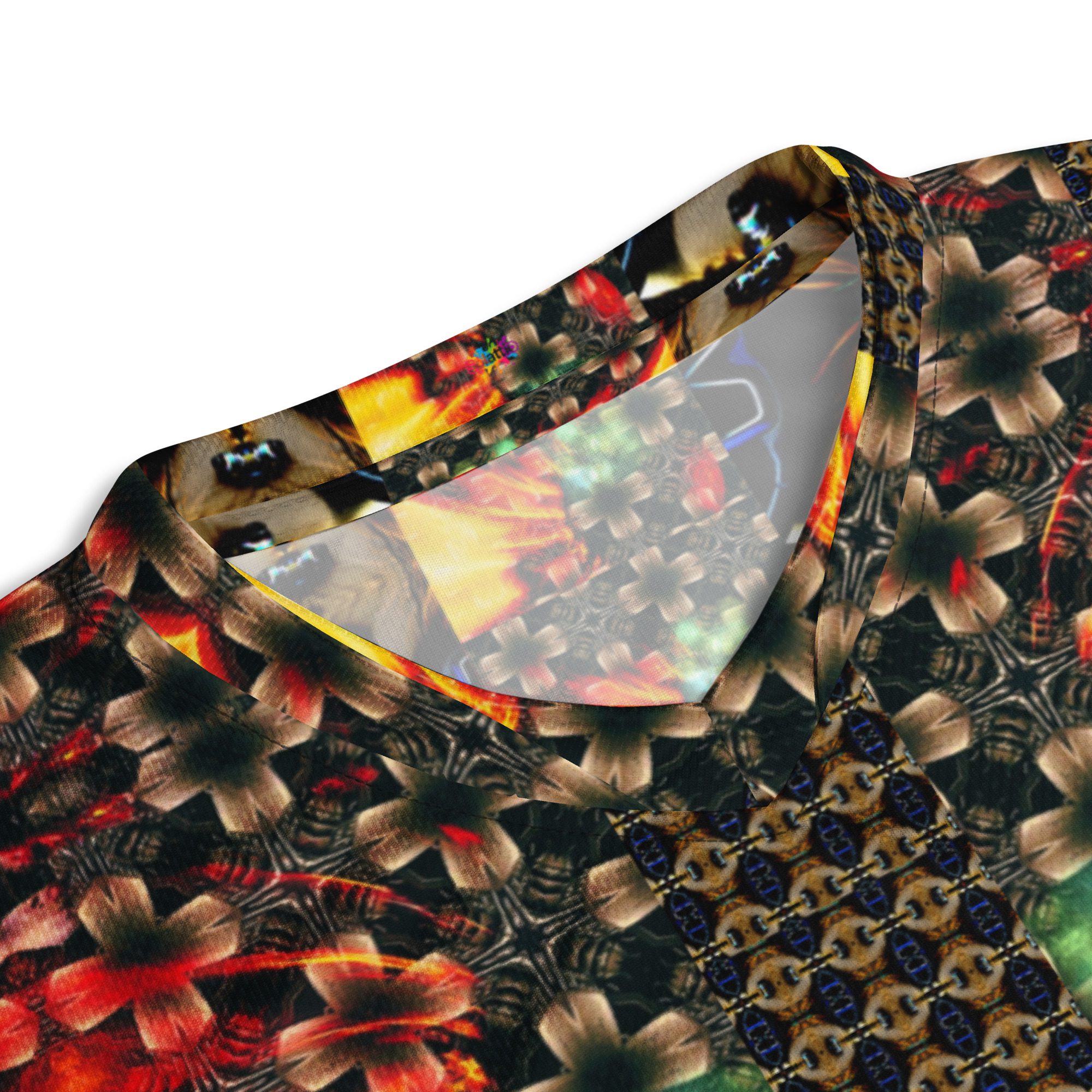 This vibrant, fire-infused jersey erupts with molten reds, neon yellows, deep ember tones, and a kaleidoscopic energy that embodies movement, heat, and power. Designed from Jaysen Mansfield’s original artwork, this all-over print sports jersey elevates your athletic look with striking symmetry, bold color, and a premium recycled fabric that feels lightweight, breathable, and ultra-comfortable for workouts or everyday wear.