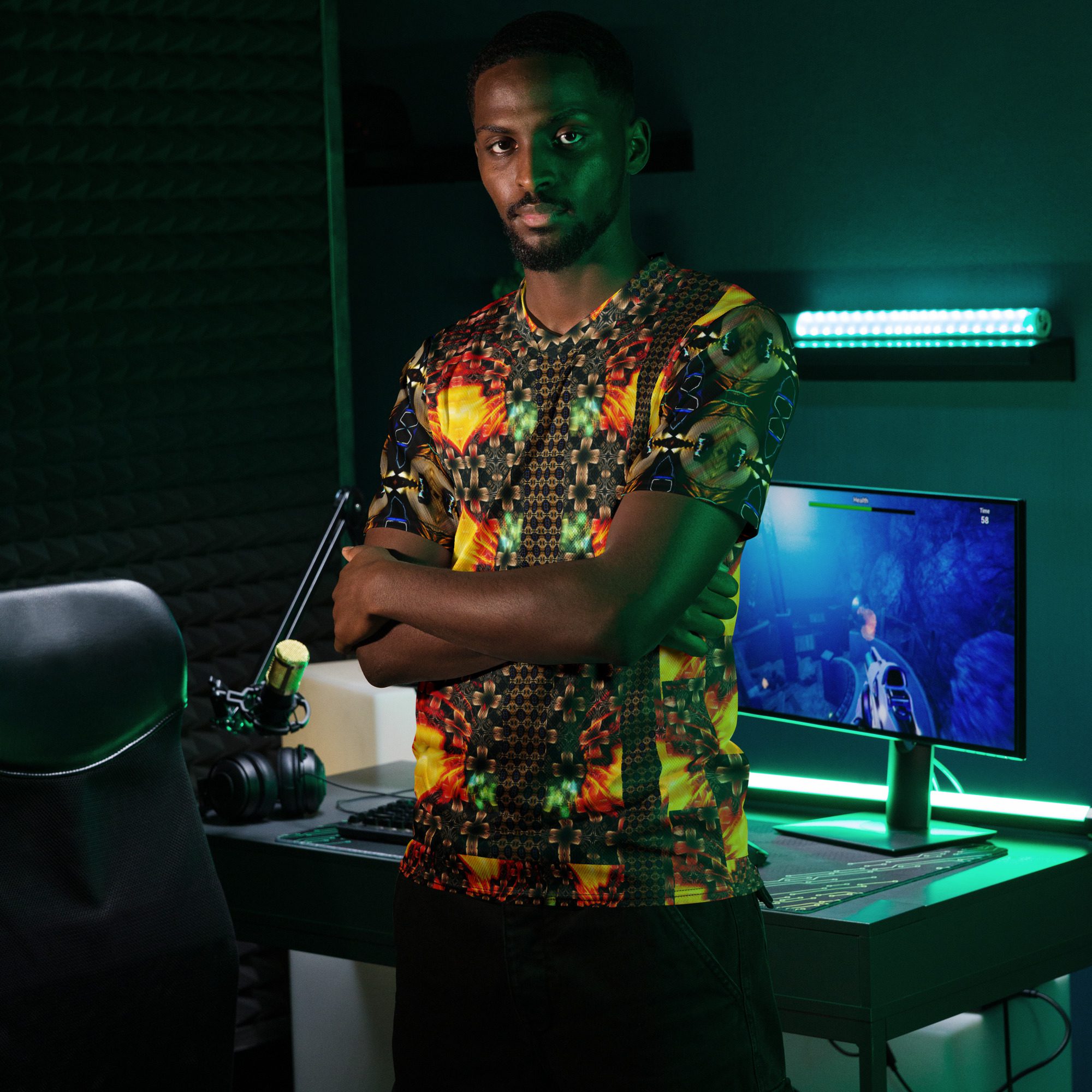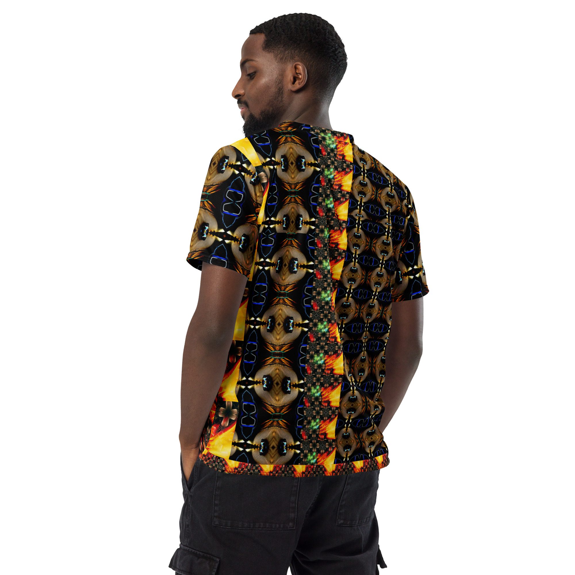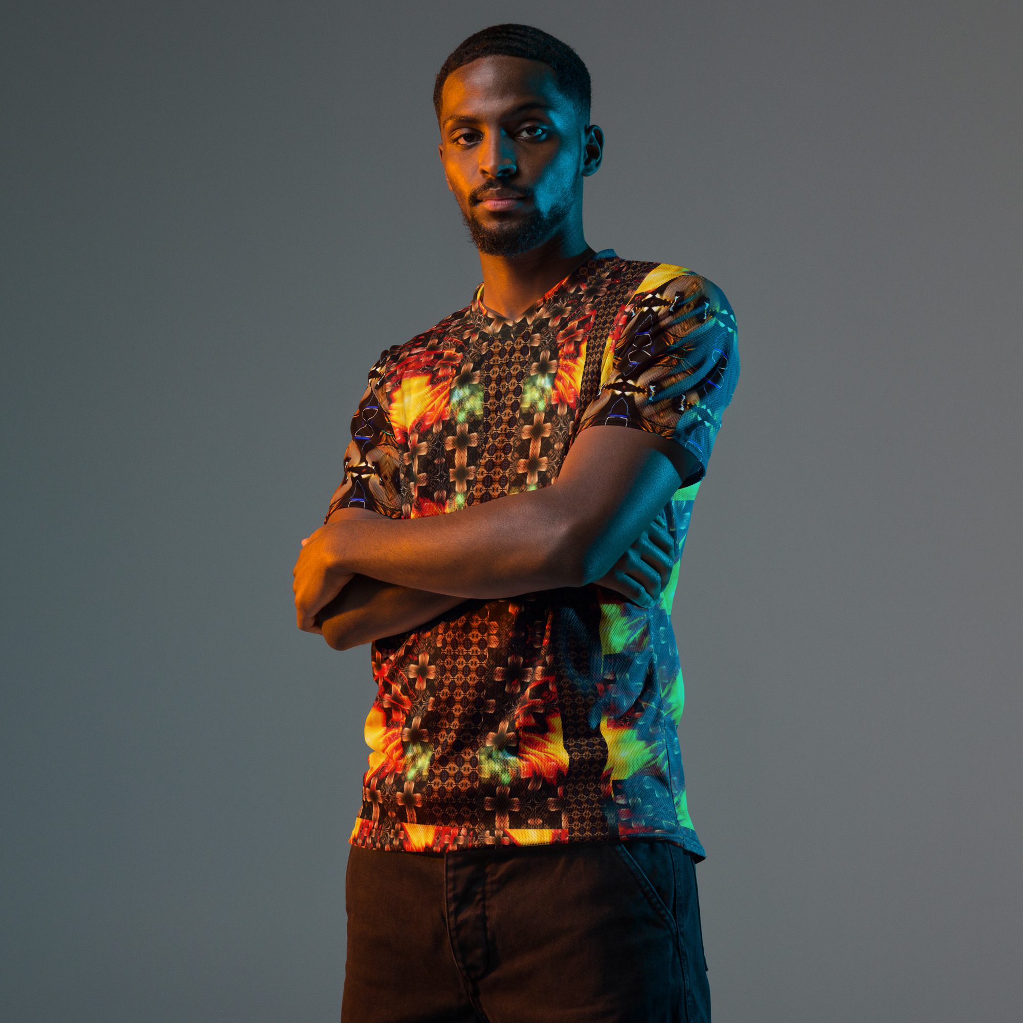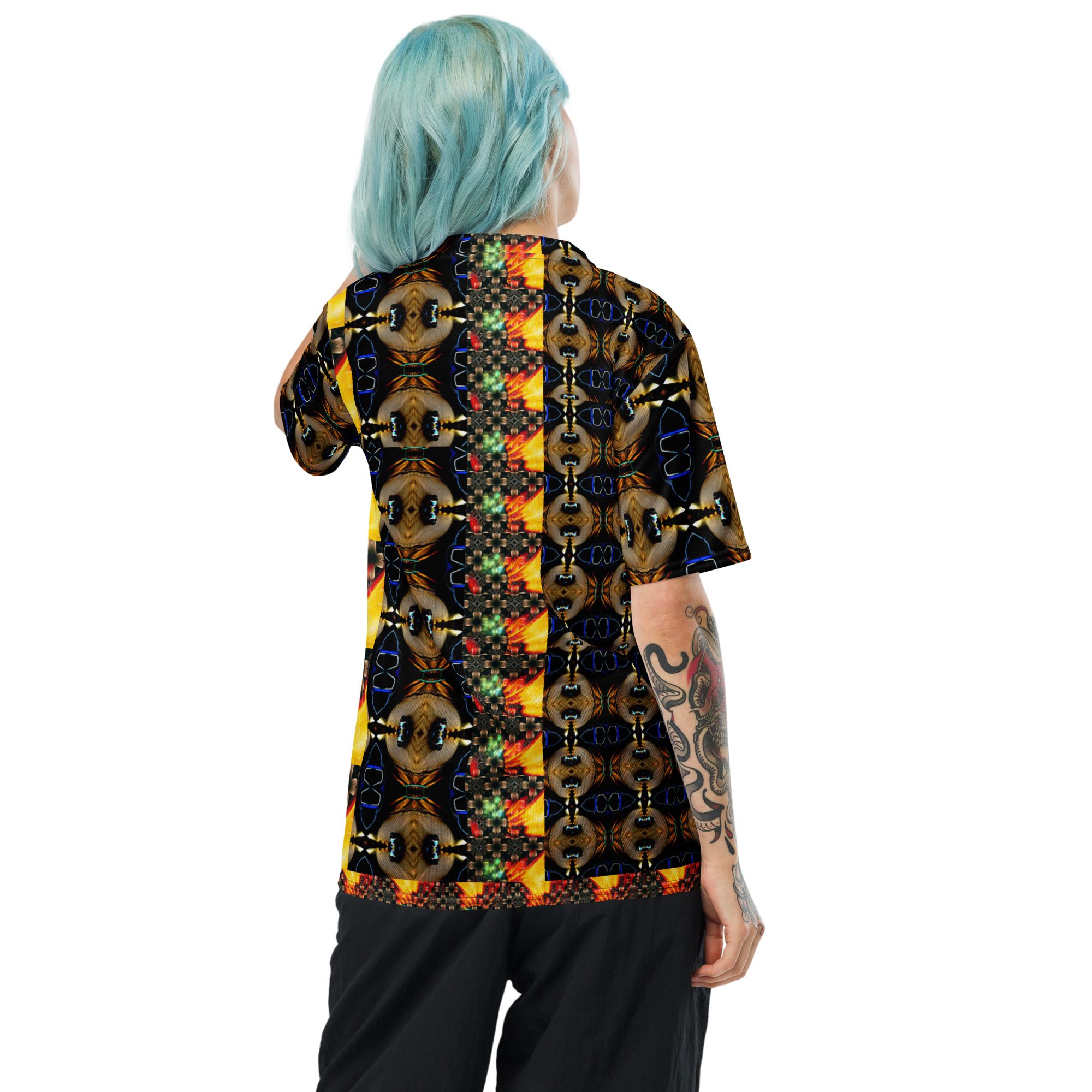 This vibrant, fire-infused jersey erupts with molten reds, neon yellows, deep ember tones, and a kaleidoscopic energy that embodies movement, heat, and power. Designed from Jaysen Mansfield’s original artwork, this all-over print sports jersey elevates your athletic look with striking symmetry, bold color, and a premium recycled fabric that feels lightweight, breathable, and ultra-comfortable for workouts or everyday wear.