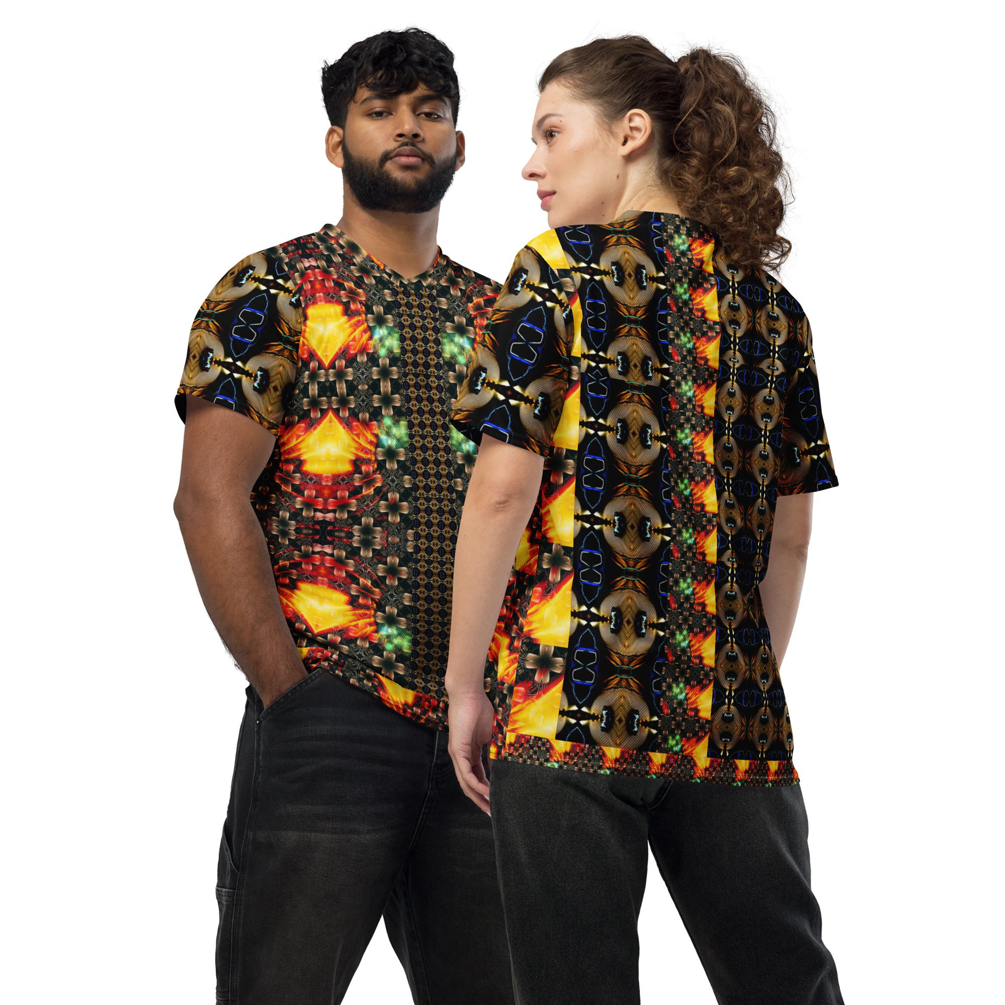 Solar Flare’s Glow – Recycled Unisex Sports Jersey — Original Artwork by Jaysen Mansfield.