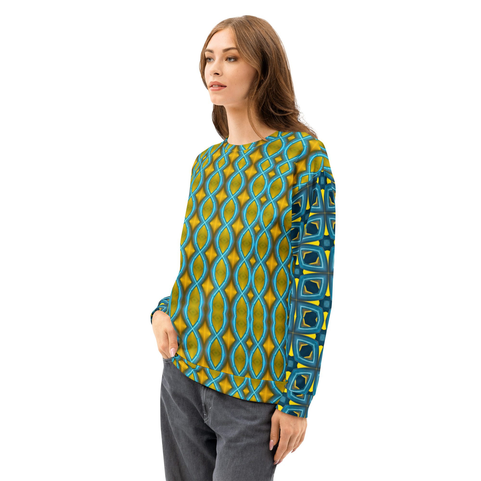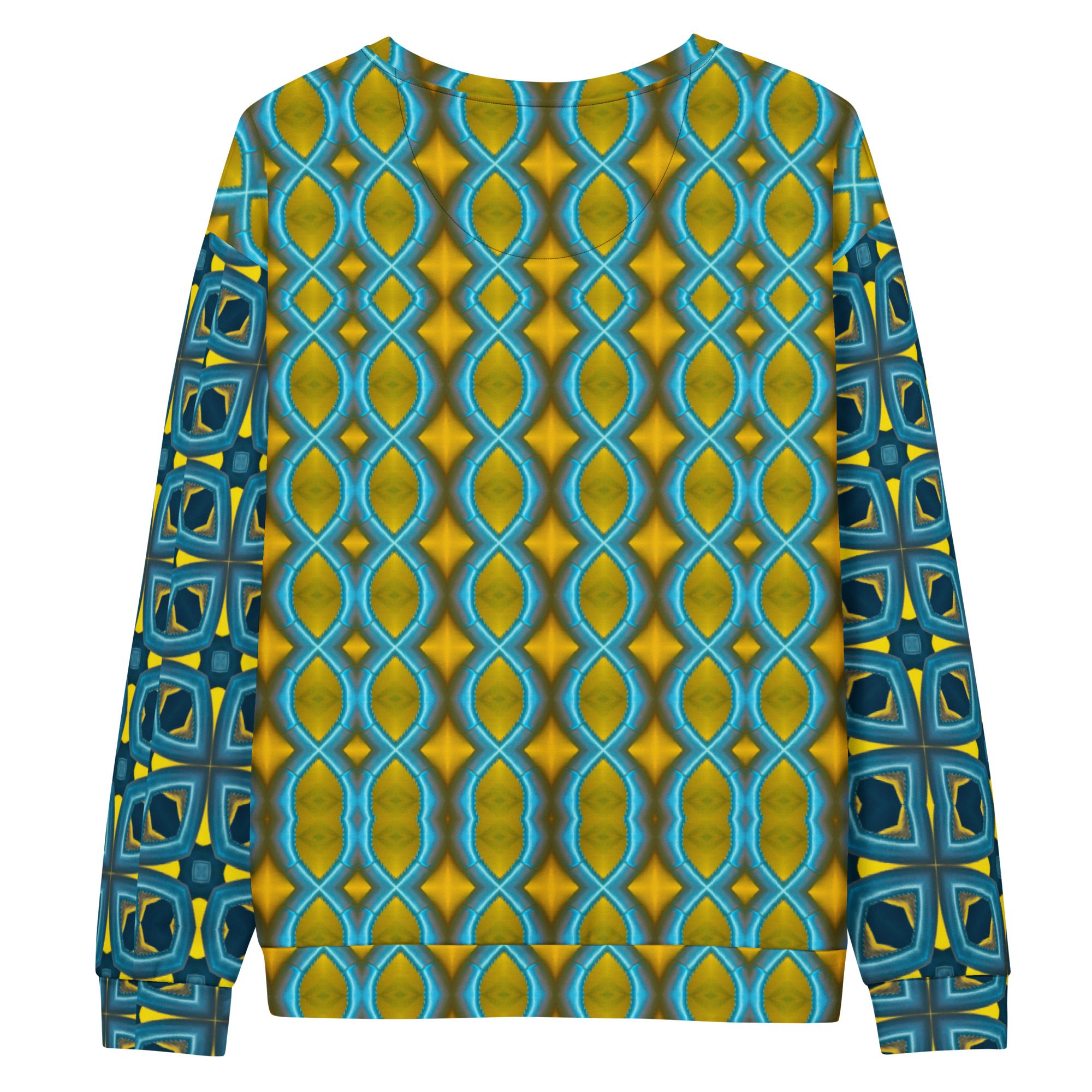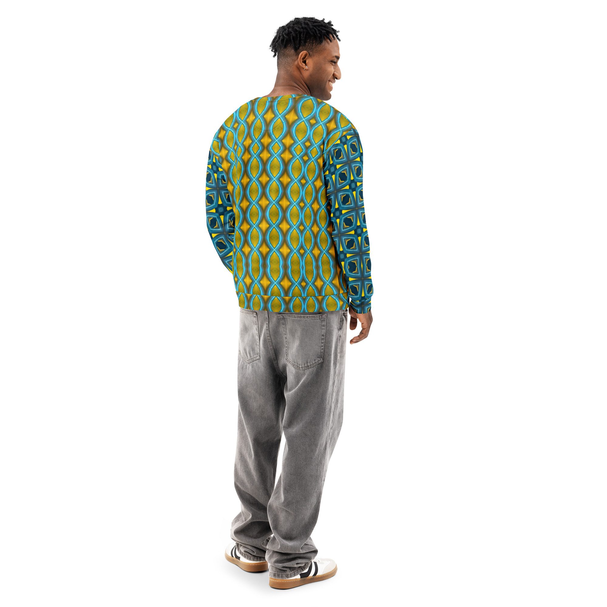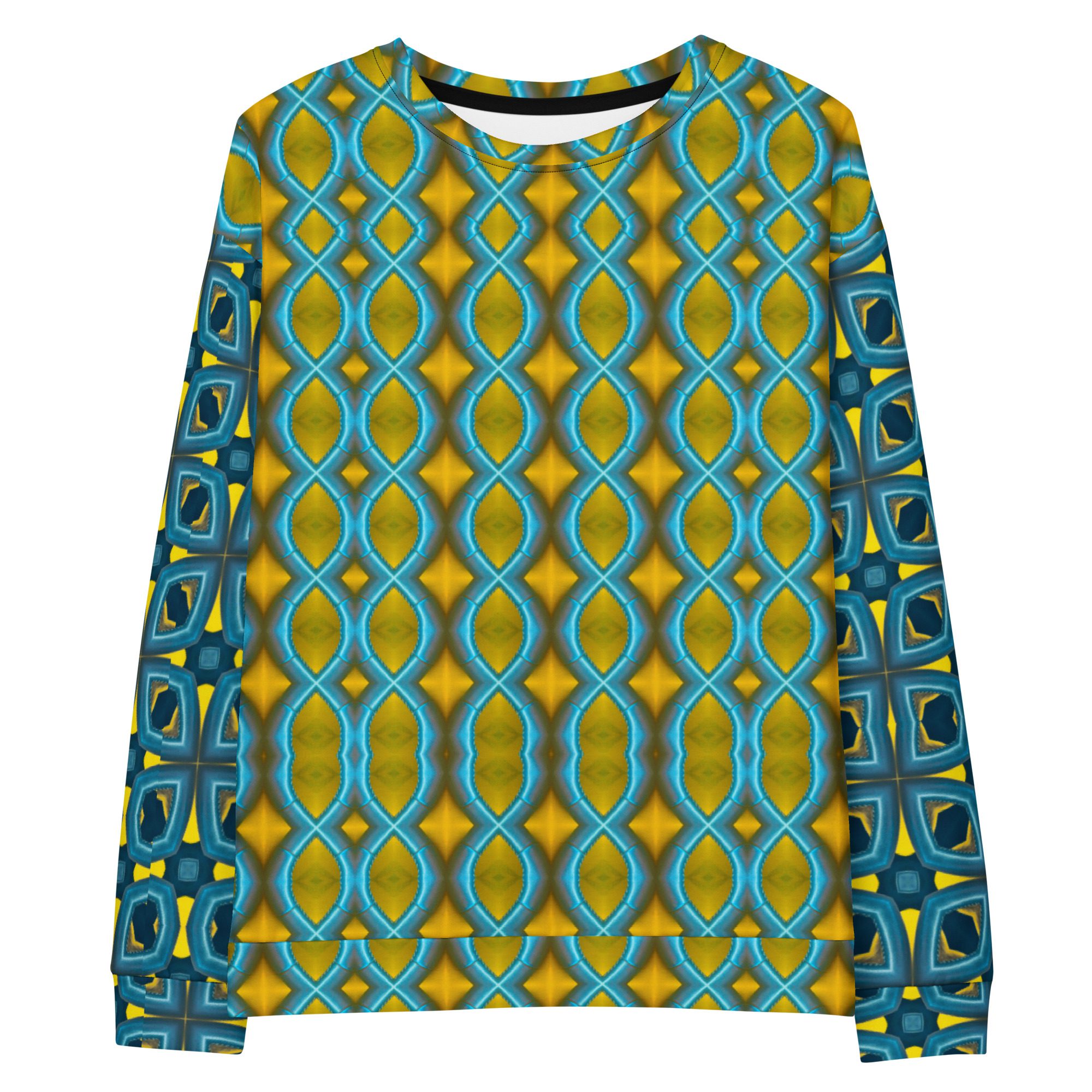 Bold, bright, and full of flowing motion, Solar Tide Wave brings abstract geometry and kinetic color to life in a striking wearable-art design. Created by artist Jaysen Mansfield, this recycled unisex cotton sweatshirt blends teal currents, golden sunlit tones, and mesmerizing symmetrical patterns into a fluid, modern aesthetic.
