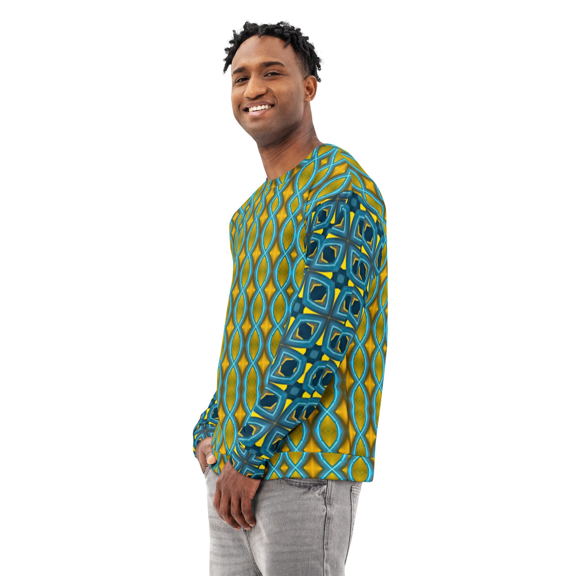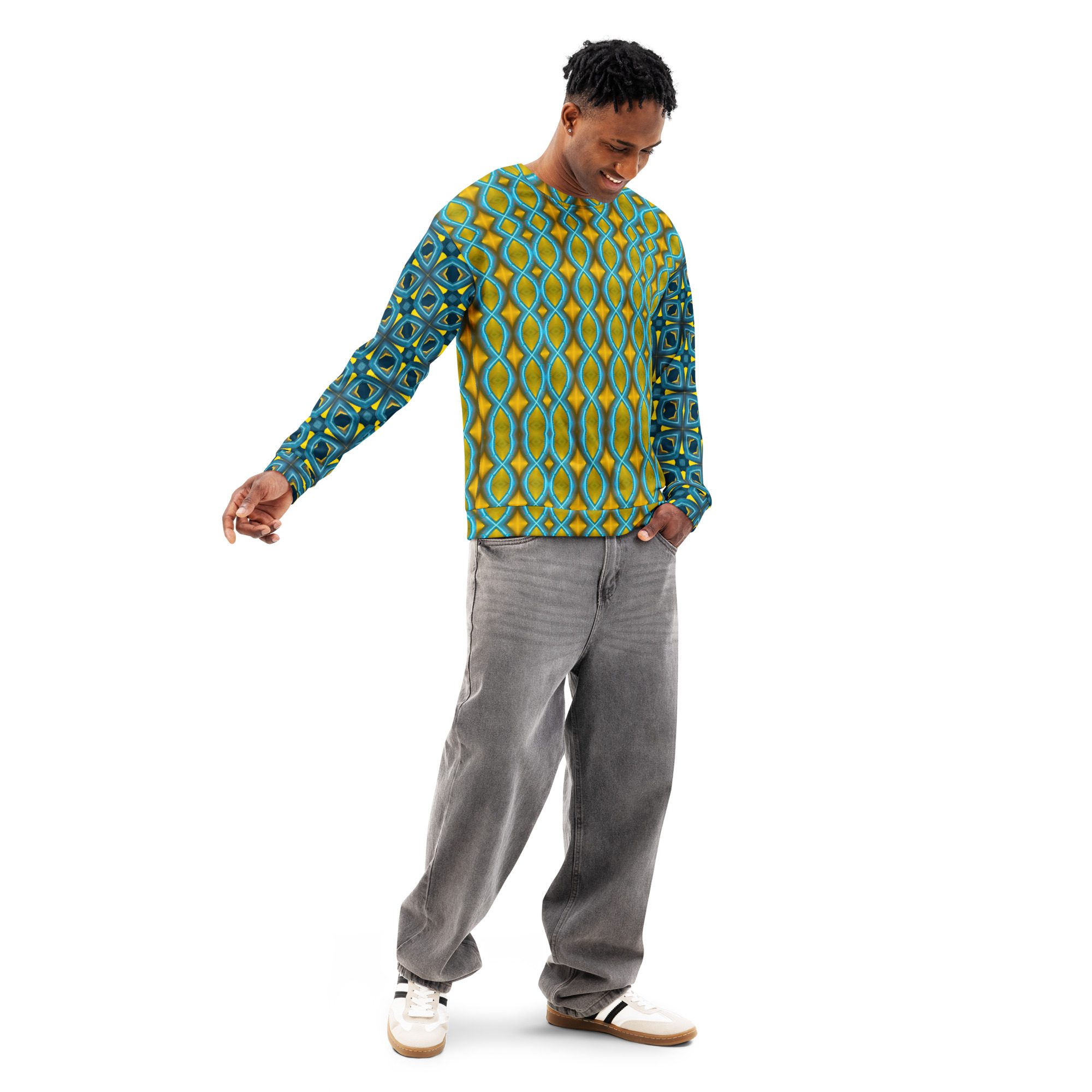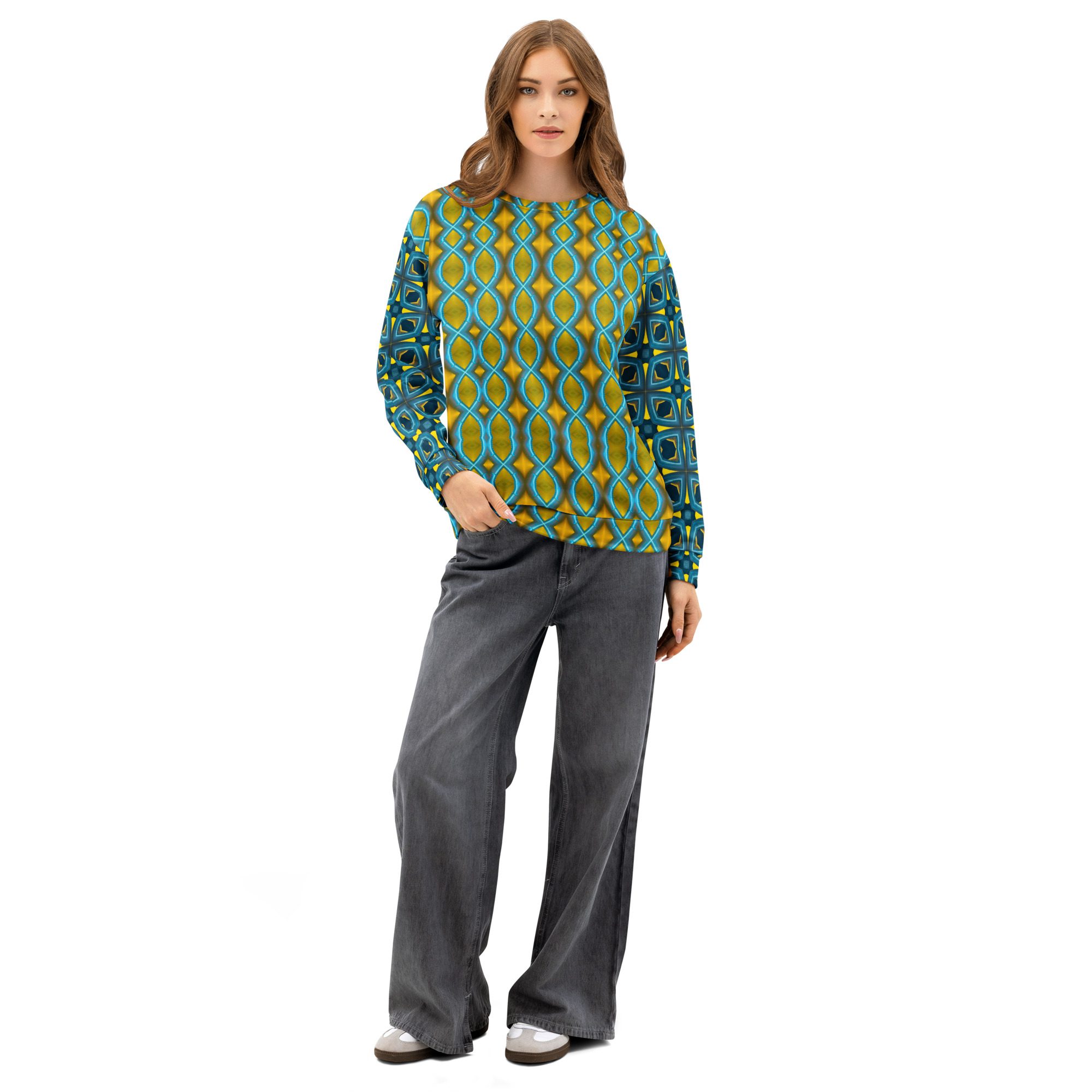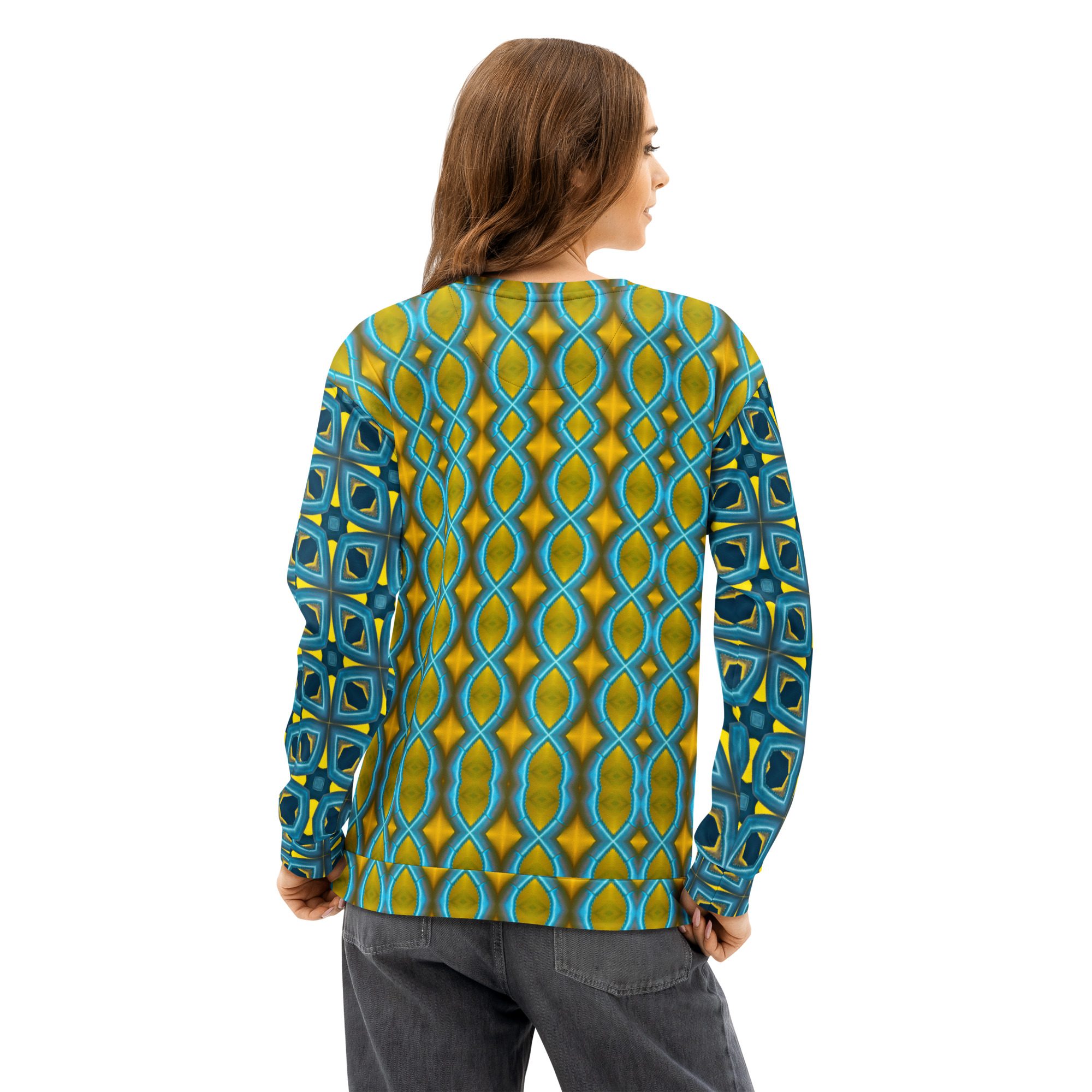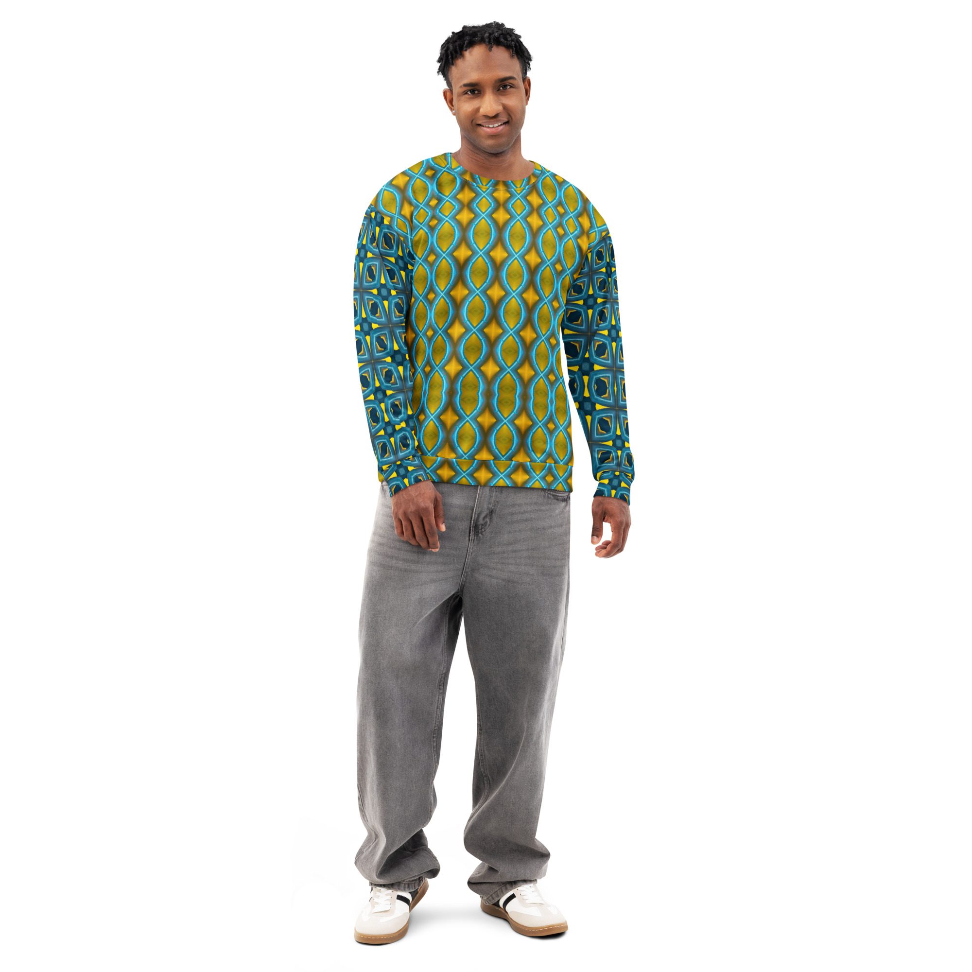 Bold, bright, and full of flowing motion, Solar Tide Wave brings abstract geometry and kinetic color to life in a striking wearable-art design. Created by artist Jaysen Mansfield, this recycled unisex cotton sweatshirt blends teal currents, golden sunlit tones, and mesmerizing symmetrical patterns into a fluid, modern aesthetic.
