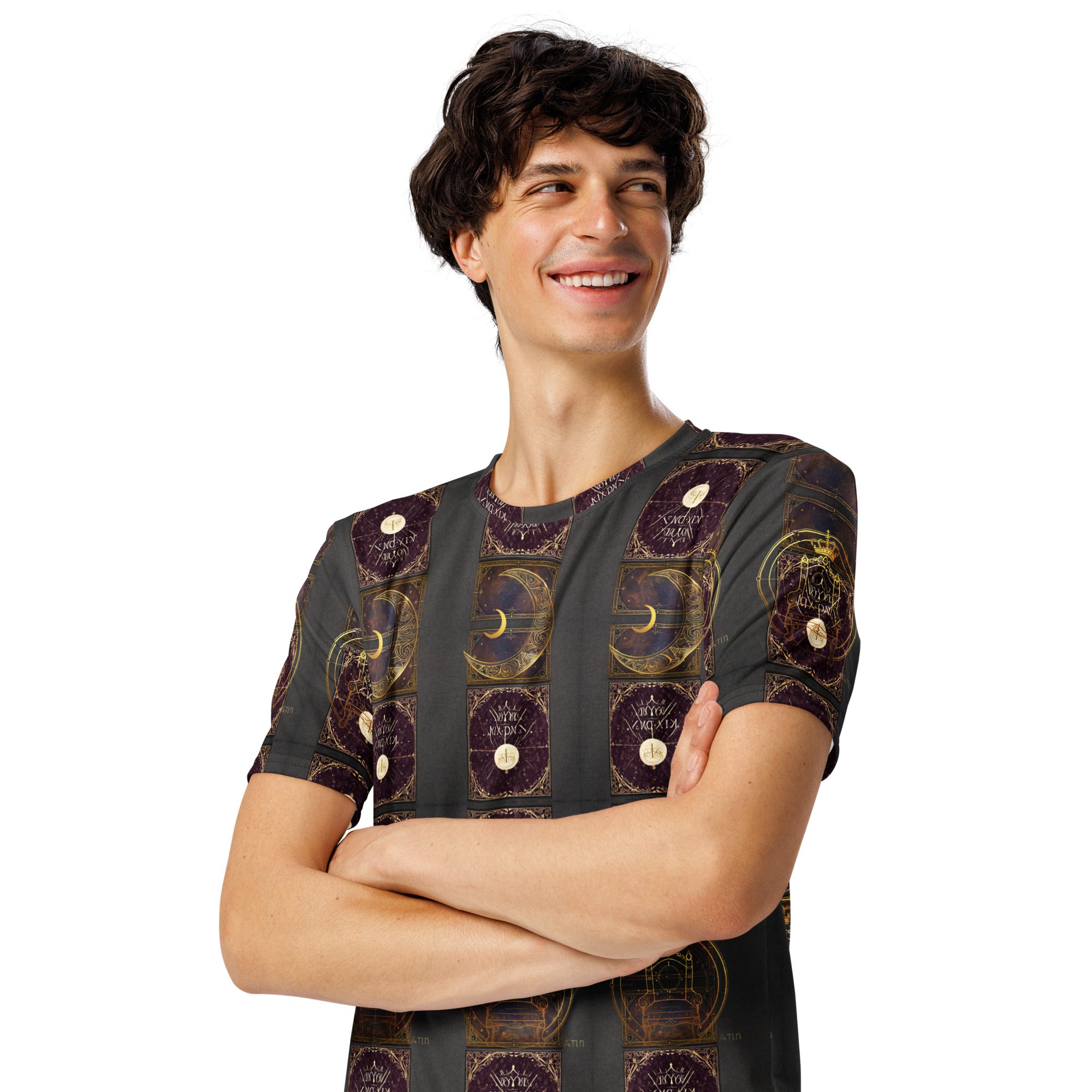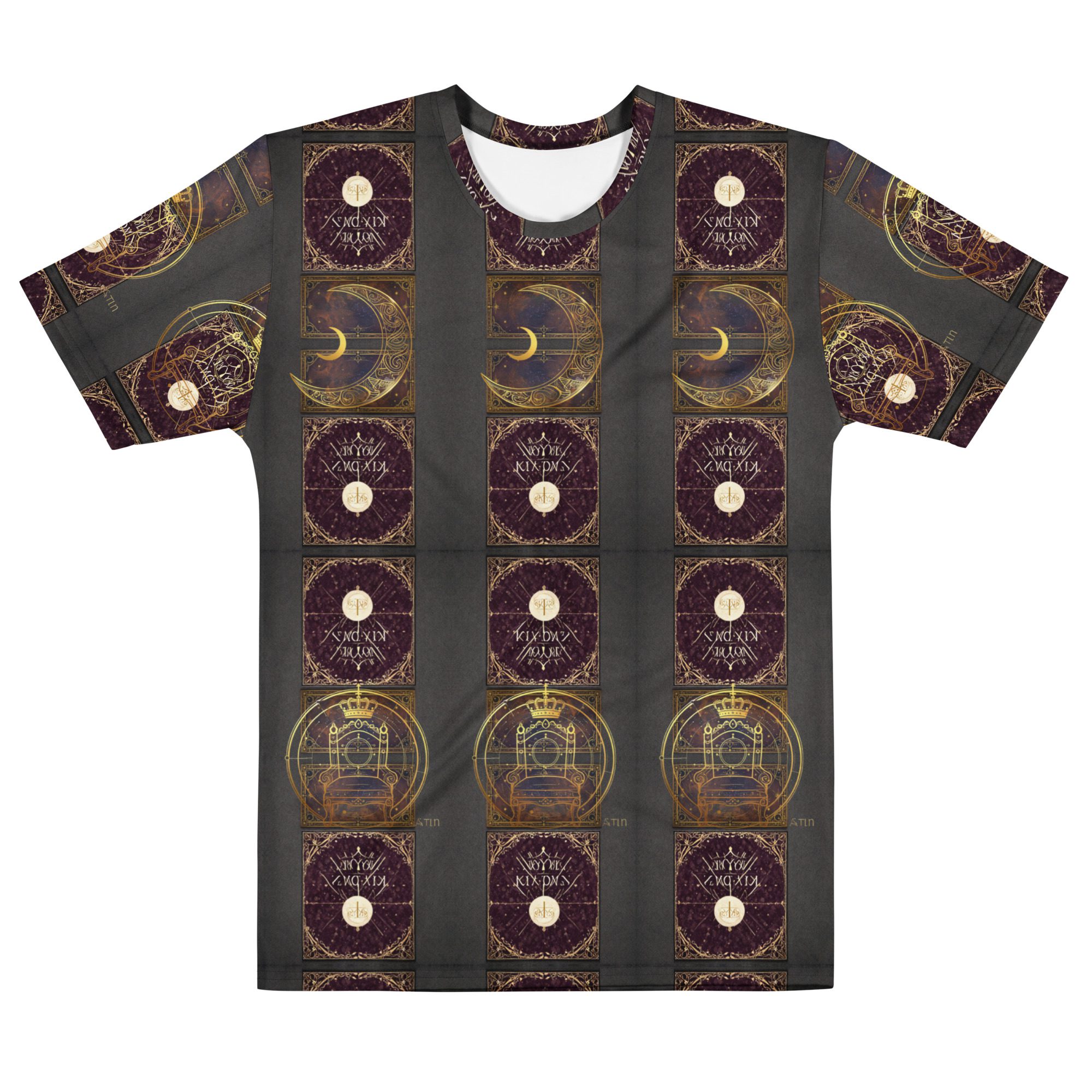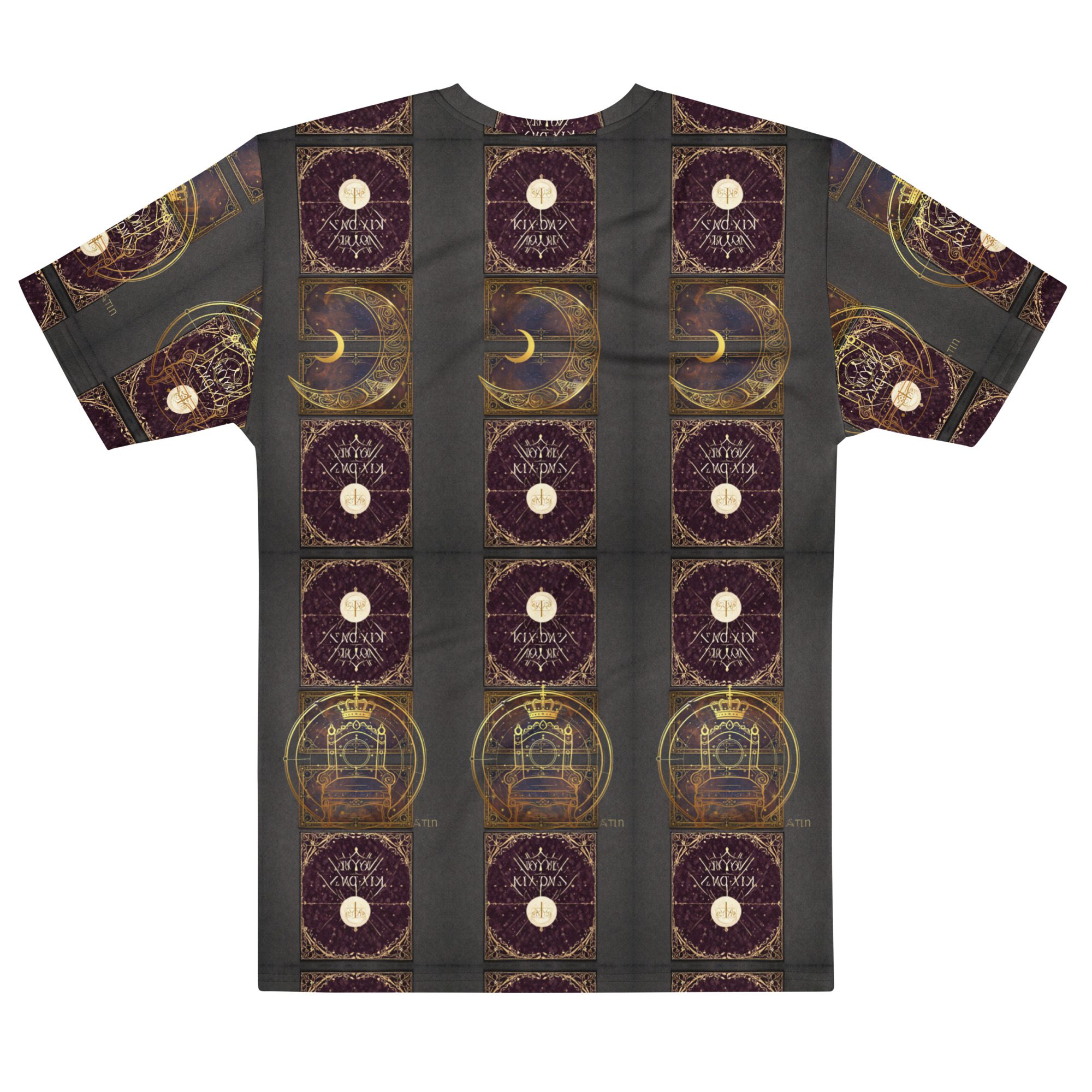 The repeating tarot-style panels create a striking celestial pattern across the shirt, blending rich burgundy tones with luminous golden sacred geometry and crescent moon symbolism. The design evokes antique astrology diagrams, mystical celestial maps, and the timeless human fascination with the universe and its hidden patterns. Every element feels intentional, creating a visual language that represents balance, intuition, and the power of self-mastery.