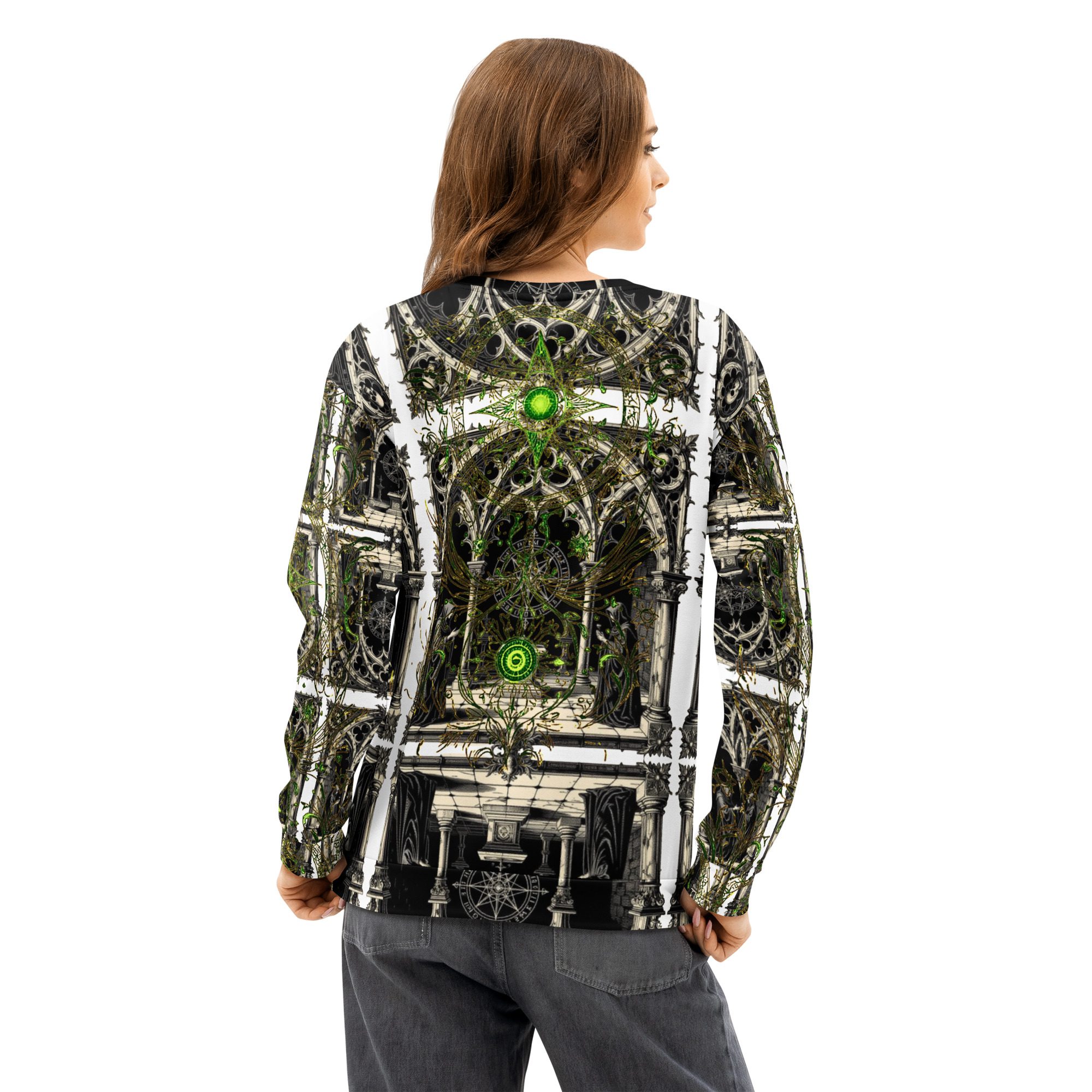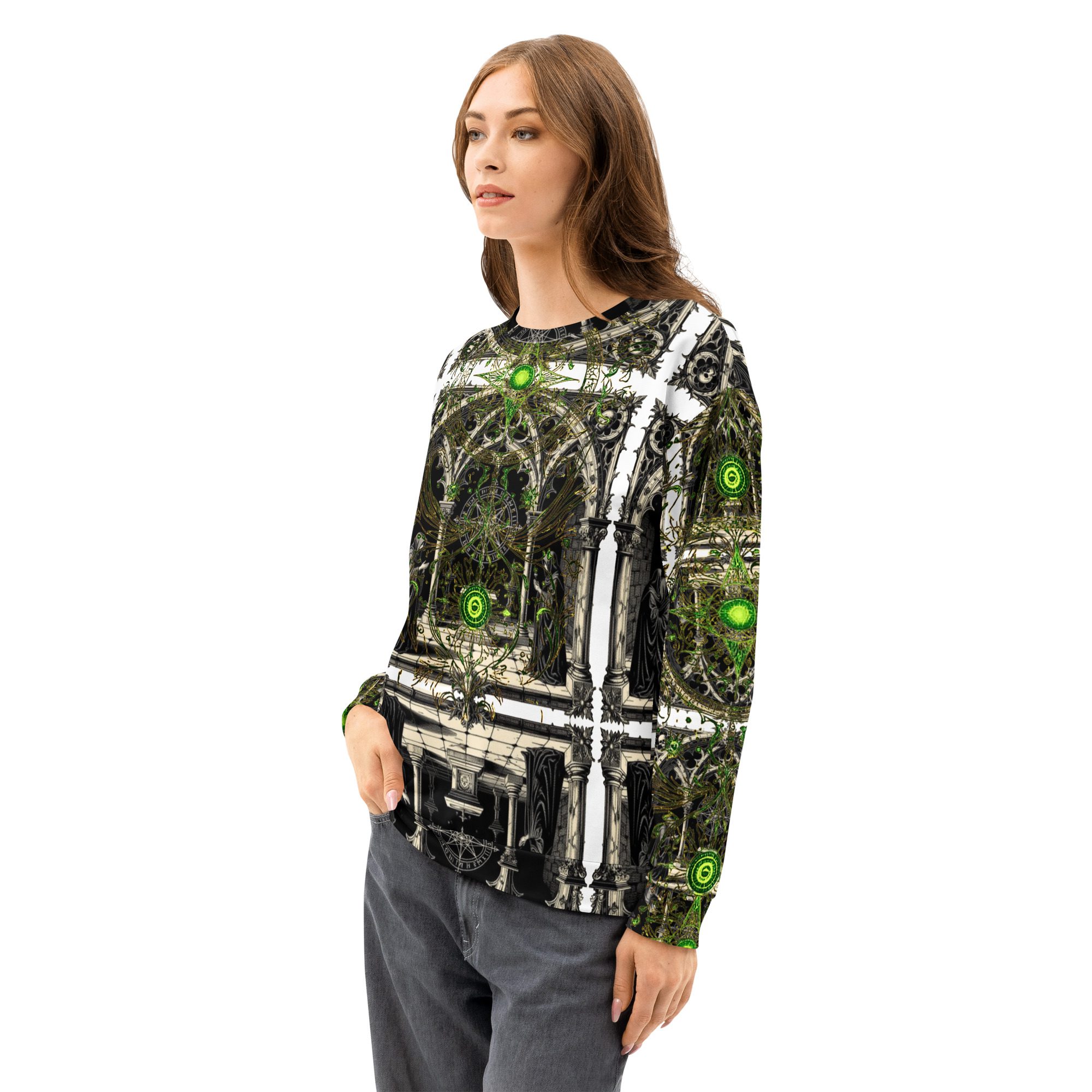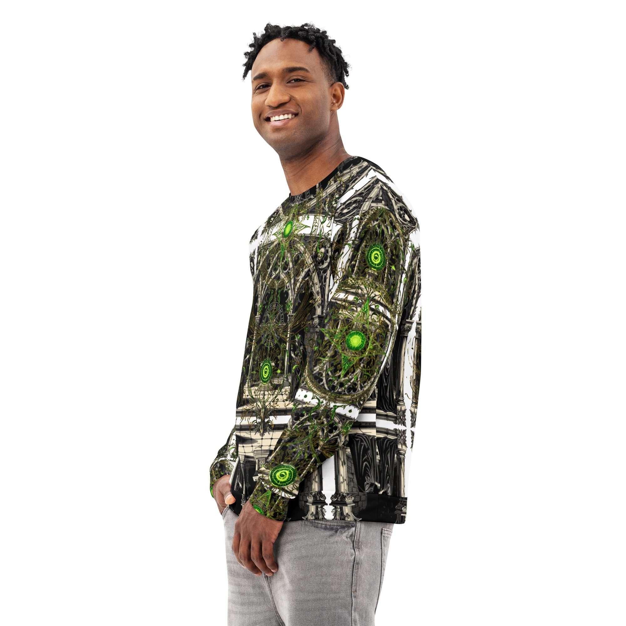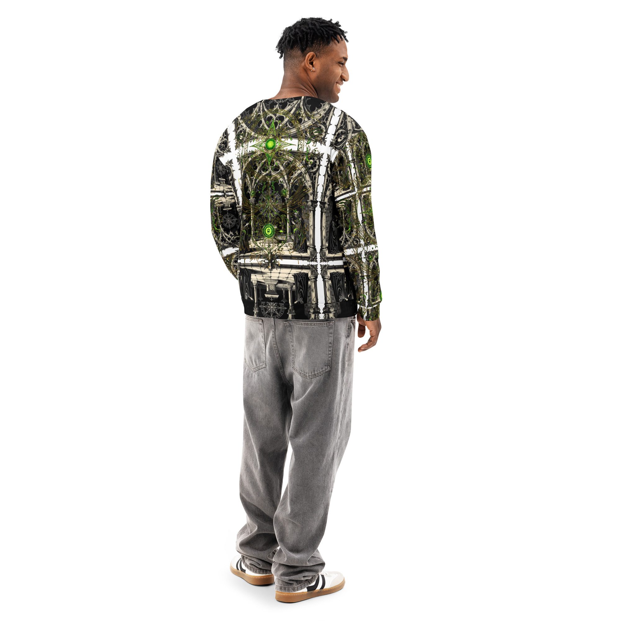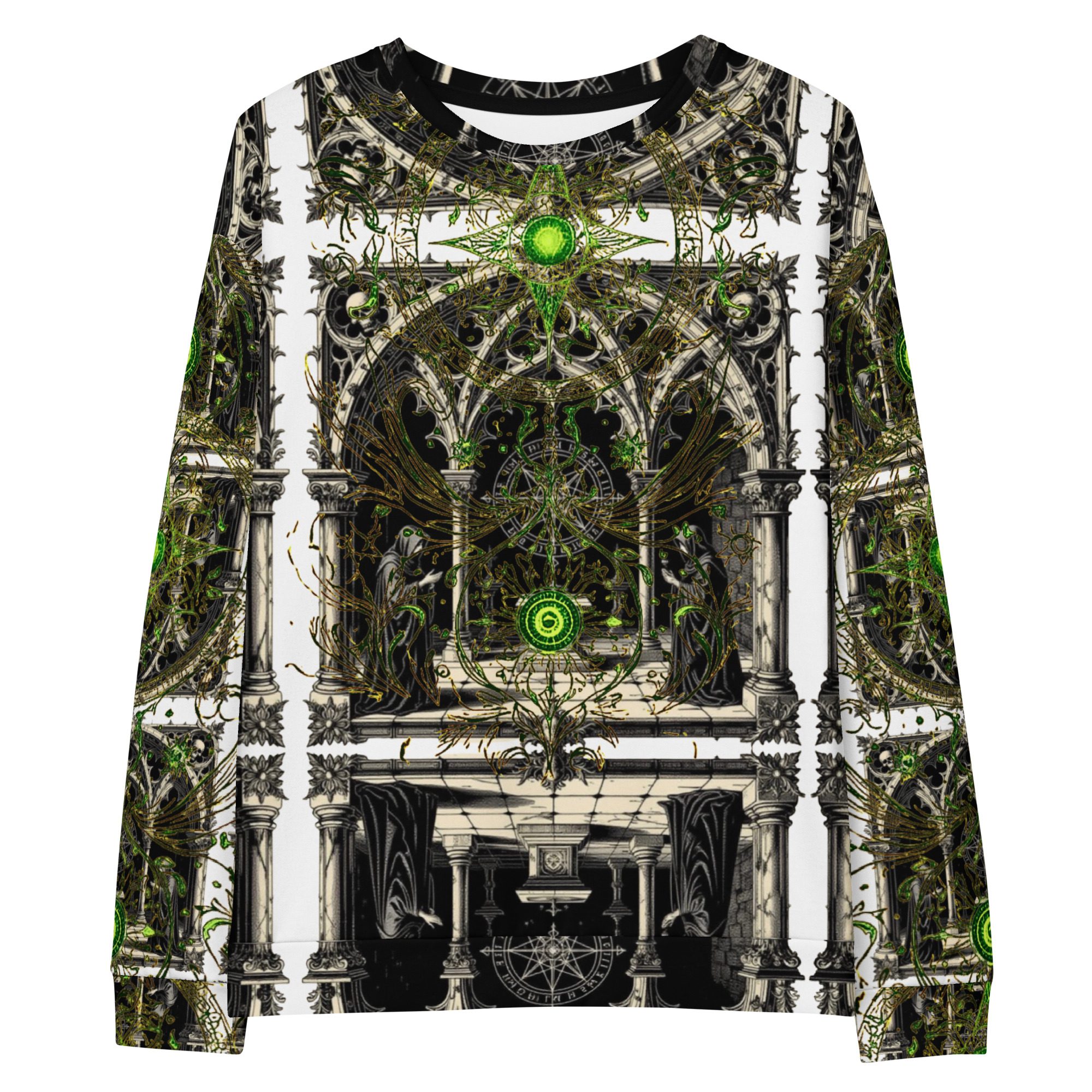 Inspired by dark academia aesthetics, gothic architecture, alchemical symbolism, and botanical sigils, this sweatshirt blends classical scholarly imagery with an almost living presence. The emerald focal points feel alive—like seals that respond only to those who recognize their meaning. It’s a visual language of old libraries, secret orders, illuminated manuscripts, and forgotten halls where knowledge was once guarded by ritual rather than locks.